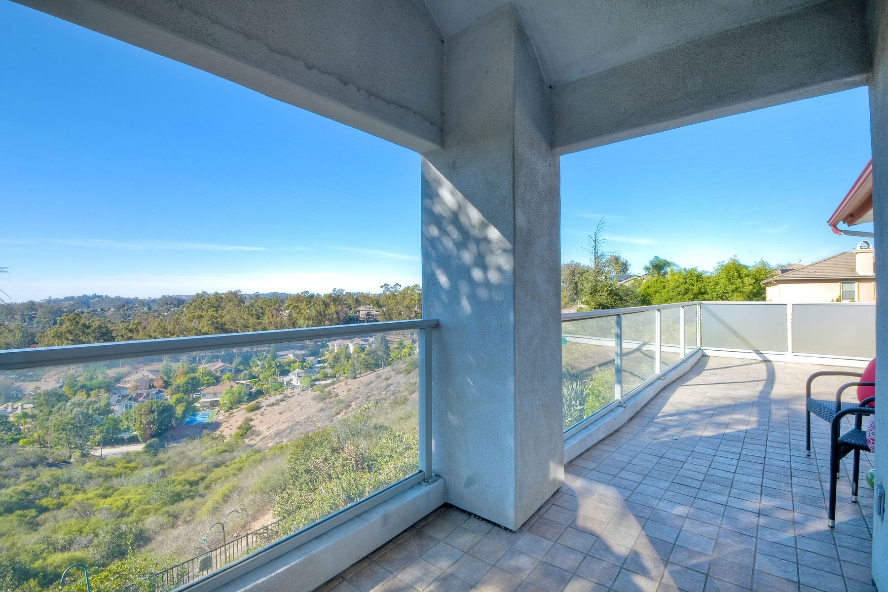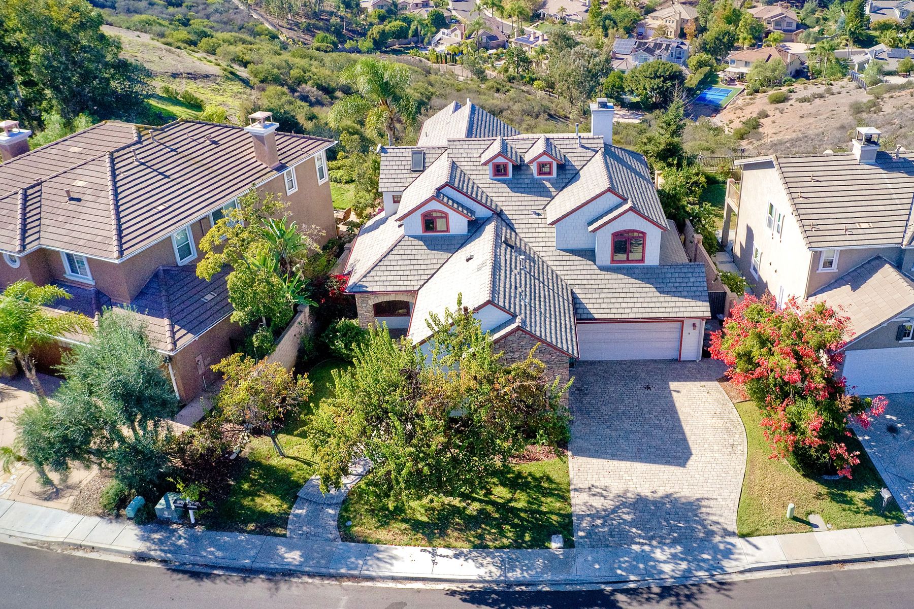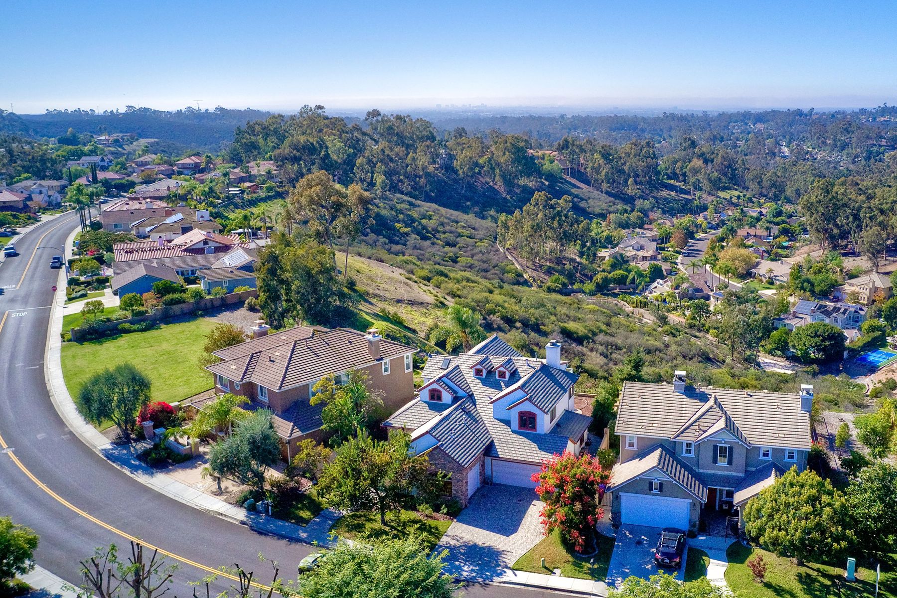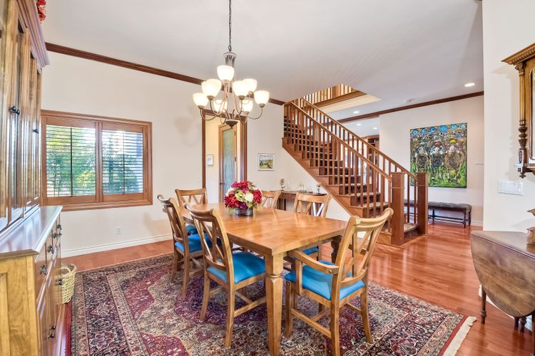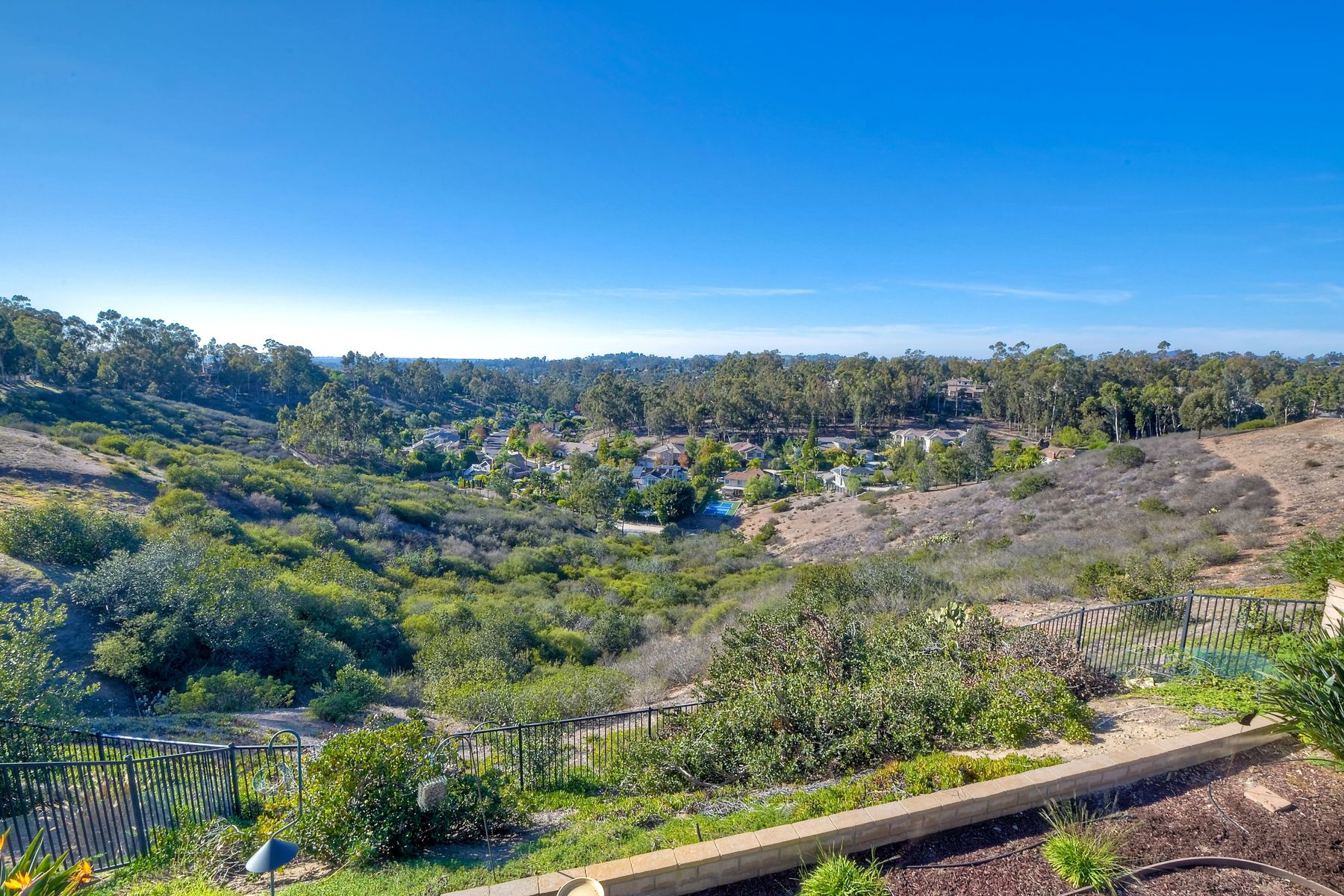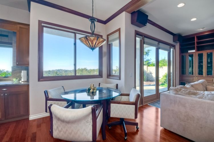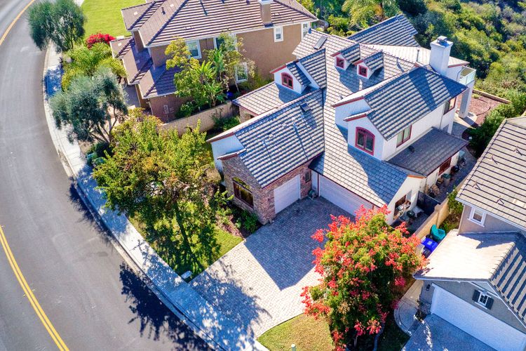 View! View! View! You are home in this custom beauty atop coveted & exclusive Scripps Ranch/South of Pomerado offering spectacular panoramic & coastal view! This custom home built in 2005 has been painstakingly planned & finished in every detail. The elegant, high-end Craftsman architecture offering clean lines & natural elements together with all of today’s modern conveniences is one of a kind – truly a masterpiece! 2 suites plus 2 optional rooms upstairs; 1 downstairs currently used as study, easily converted to additional bedrooms. Offering beautiful & charming curb appeal with exterior stone work, lush landscape & pavered entry & driveway you know you are in for something special. Community pool, tennis courts! Step in through striking double mahogany wood front doors to stunning foyer featuring custom inlayed entry medallion & Bolivian Santos mahogany floors throughout downstairs. The stately formal dining room on left offers entertaining on the grand or intimate scale with chandelier and plantation shutters. Be amazed by stunning family room featuring breathtaking elevated tree-line views through French doors, focal fireplace with marble surround, beautiful custom built-in entertainment center & bookcase with soft close, crown molding and wood cased windows & trim throughout. Gourmet kitchen features natural cherry cabinetry, slab granite countertop & backsplash with decorator tile back, appliances including Advantium/microwave, full oven & warming drawer, newer dishwasher, center island with veggie sink and extended counter; butler’s pantry/beverage center with wine refrigerator, walk-in pantry, built-in desk & media center as well as spacious eat-in area with forever view. Downstairs study is tucked away with luxurious solid mahogany double doors. Full bath includes Rainforest marble counter top, natural cherry cabinetry, shower/soaking tub and tile floors. Downstairs laundry room with built-in storage and utility sink. Grand craftsman staircase brings you to second floor in style! Spacious primary suite offers soaring cathedral ceiling with fan, sliding door to balcony with phenomenal view. Primary bath features double sinks, marble counter top, over-sized walk-in shower, tile floors and walk-in dream closet/dressing room with cathedral ceiling! 2 additional, large optional bedrooms upstairs currently used as offices. Full bath. Upstairs attic access. Beautiful backyard includes covered, pavered patio looking out to truly stunning view of lush green canyon and coastal views beyond – beautiful twinkling lights at night - Del Mar balloons by twilight! Sit back and enjoy the tranquil setting & nature that surrounds. Truly one of a kind! 3-car garage with storage. Some of the many extras include: solid wood interior doors, crown molding, wood trimmed windows throughout, Elevator shaft wired/ready; newer tankless water heaters, Martin garage doors, dual zone heating/AC units, extra roof tiles & exterior stone. Close to multiple parks, award winning schools, shopping and dining. Easy I-15 freeway access.