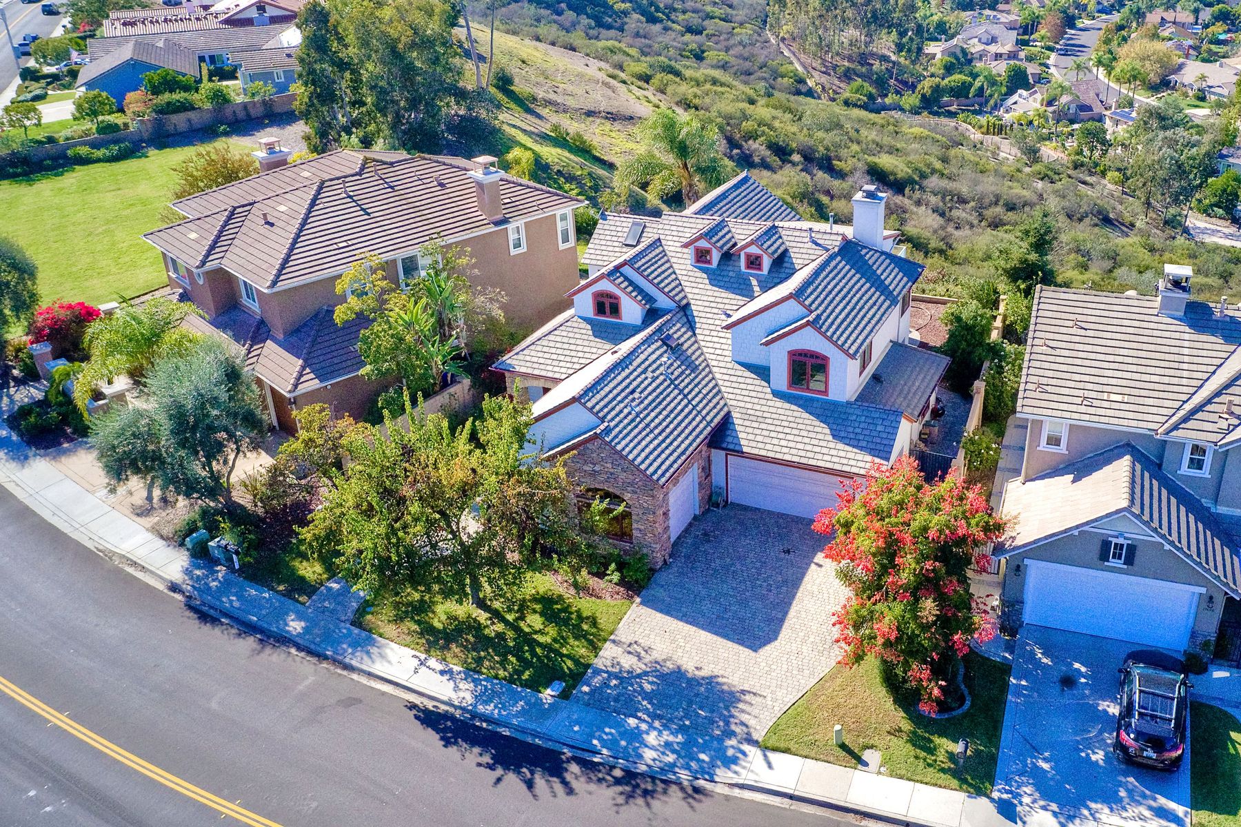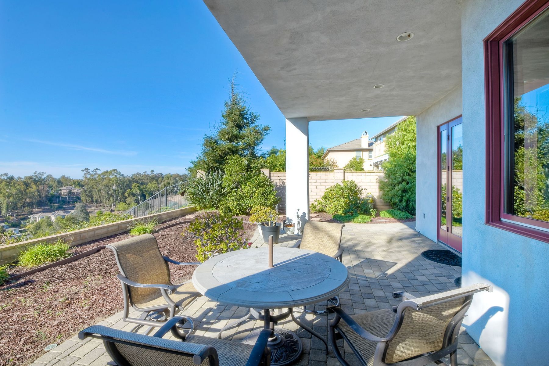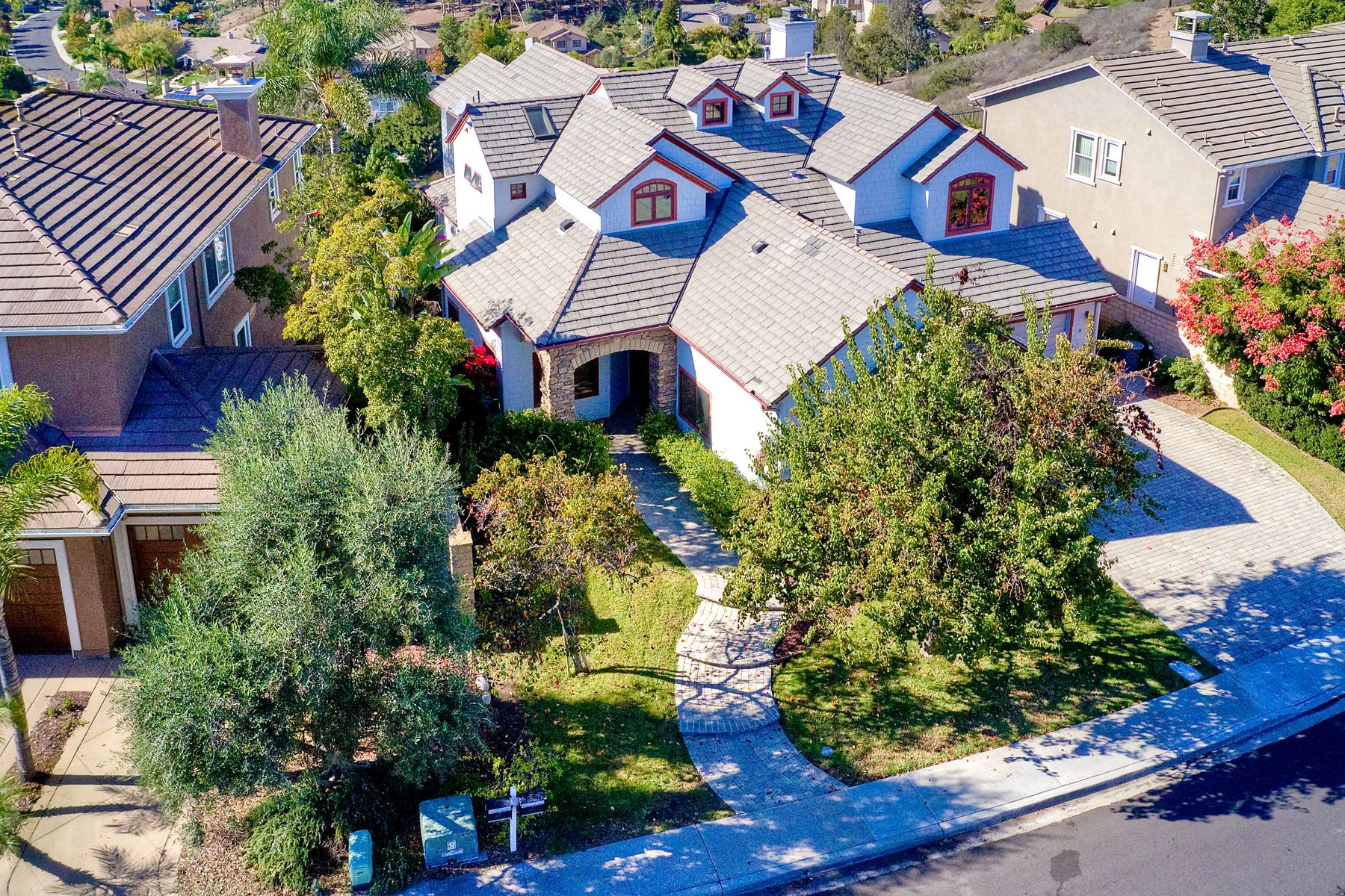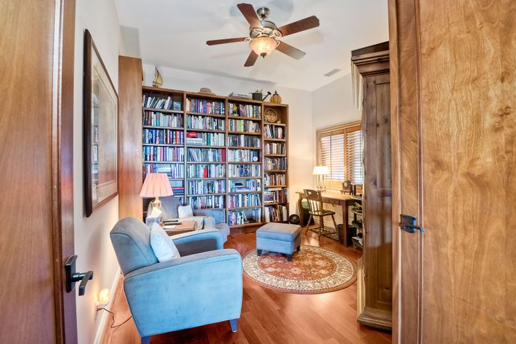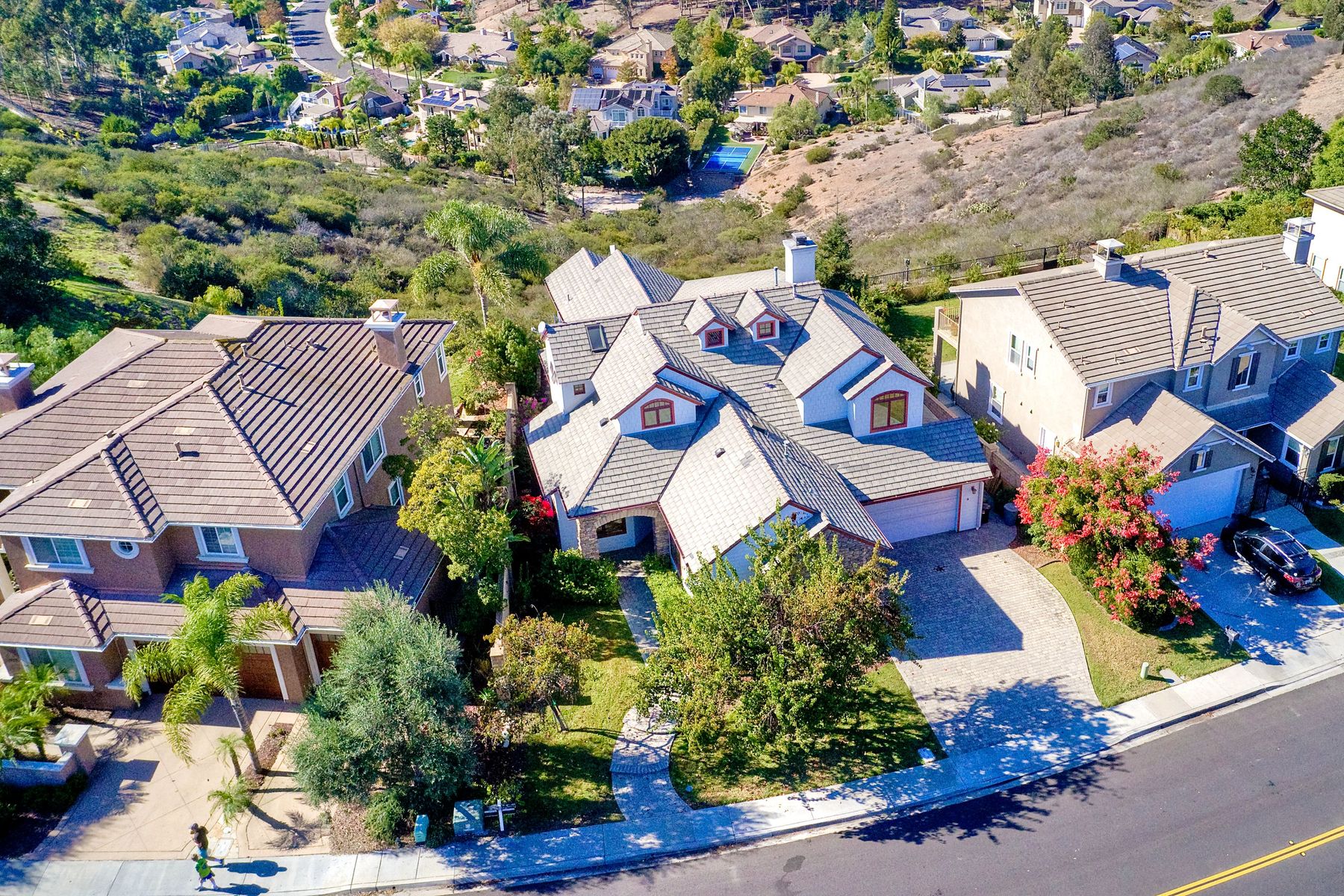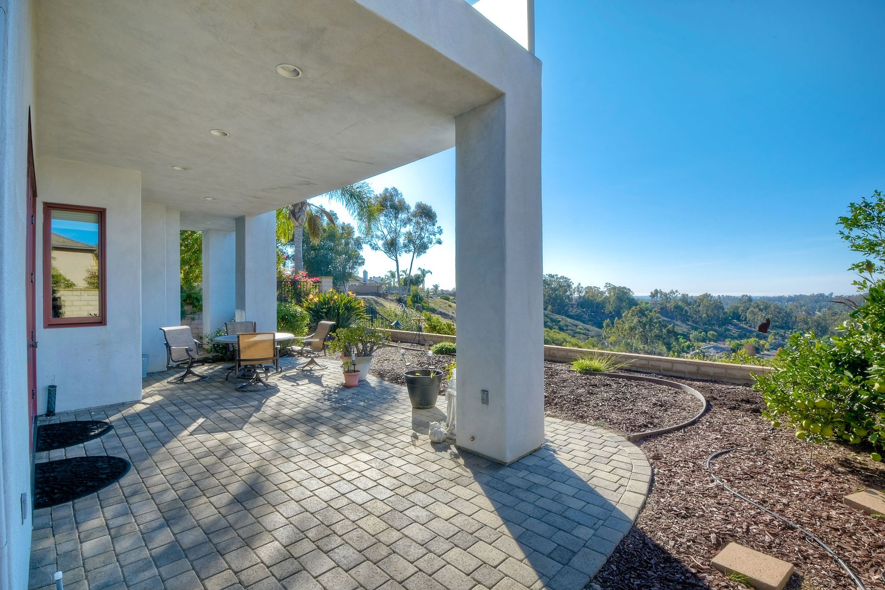 View! View! View! You are home in this custom beauty atop coveted & exclusive Scripps Ranch/South of Pomerado offering spectacular panoramic & coastal view! This custom home built in 2005 has been painstakingly planned & finished in every detail. The elegant, high-end Craftsman architecture offering clean lines & natural elements together with all of today’s modern conveniences is one of a kind – truly a masterpiece! 2 suites plus 2 optional rooms upstairs; 1 downstairs currently used as study, easily converted to additional bedrooms. Offering beautiful & charming curb appeal with exterior stone work, lush landscape & pavered entry & driveway you know you are in for something special. Community pool, tennis courts! Step in through striking double mahogany wood front doors to stunning foyer featuring custom inlayed entry medallion & Bolivian Santos mahogany floors throughout downstairs. The stately formal dining room on left offers entertaining on the grand or intimate scale with chandelier and plantation shutters. Be amazed by stunning family room featuring breathtaking elevated tree-line views through French doors, focal fireplace with marble surround, beautiful custom built-in entertainment center & bookcase with soft close, crown molding and wood cased windows & trim throughout. Gourmet kitchen features natural cherry cabinetry, slab granite countertop & backsplash with decorator tile back, appliances including Advantium/microwave, full oven & warming drawer, newer dishwasher, center island with veggie sink and extended counter; butler’s pantry/beverage center with wine refrigerator, walk-in pantry, built-in desk & media center as well as spacious eat-in area with forever view. Downstairs study is tucked away with luxurious solid mahogany double doors. Full bath includes Rainforest marble counter top, natural cherry cabinetry, shower/soaking tub and tile floors. Downstairs laundry room with built-in storage and utility sink. Grand craftsman staircase brings you to second floor in style! Spacious primary suite offers soaring cathedral ceiling with fan, sliding door to balcony with phenomenal view. Primary bath features double sinks, marble counter top, over-sized walk-in shower, tile floors and walk-in dream closet/dressing room with cathedral ceiling! 2 additional, large optional bedrooms upstairs currently used as offices. Full bath. Upstairs attic access. Beautiful backyard includes covered, pavered patio looking out to truly stunning view of lush green canyon and coastal views beyond – beautiful twinkling lights at night - Del Mar balloons by twilight! Sit back and enjoy the tranquil setting & nature that surrounds. Truly one of a kind! 3-car garage with storage. Some of the many extras include: solid wood interior doors, crown molding, wood trimmed windows throughout, Elevator shaft wired/ready; newer tankless water heaters, Martin garage doors, dual zone heating/AC units, extra roof tiles & exterior stone. Close to multiple parks, award winning schools, shopping and dining. Easy I-15 freeway access.