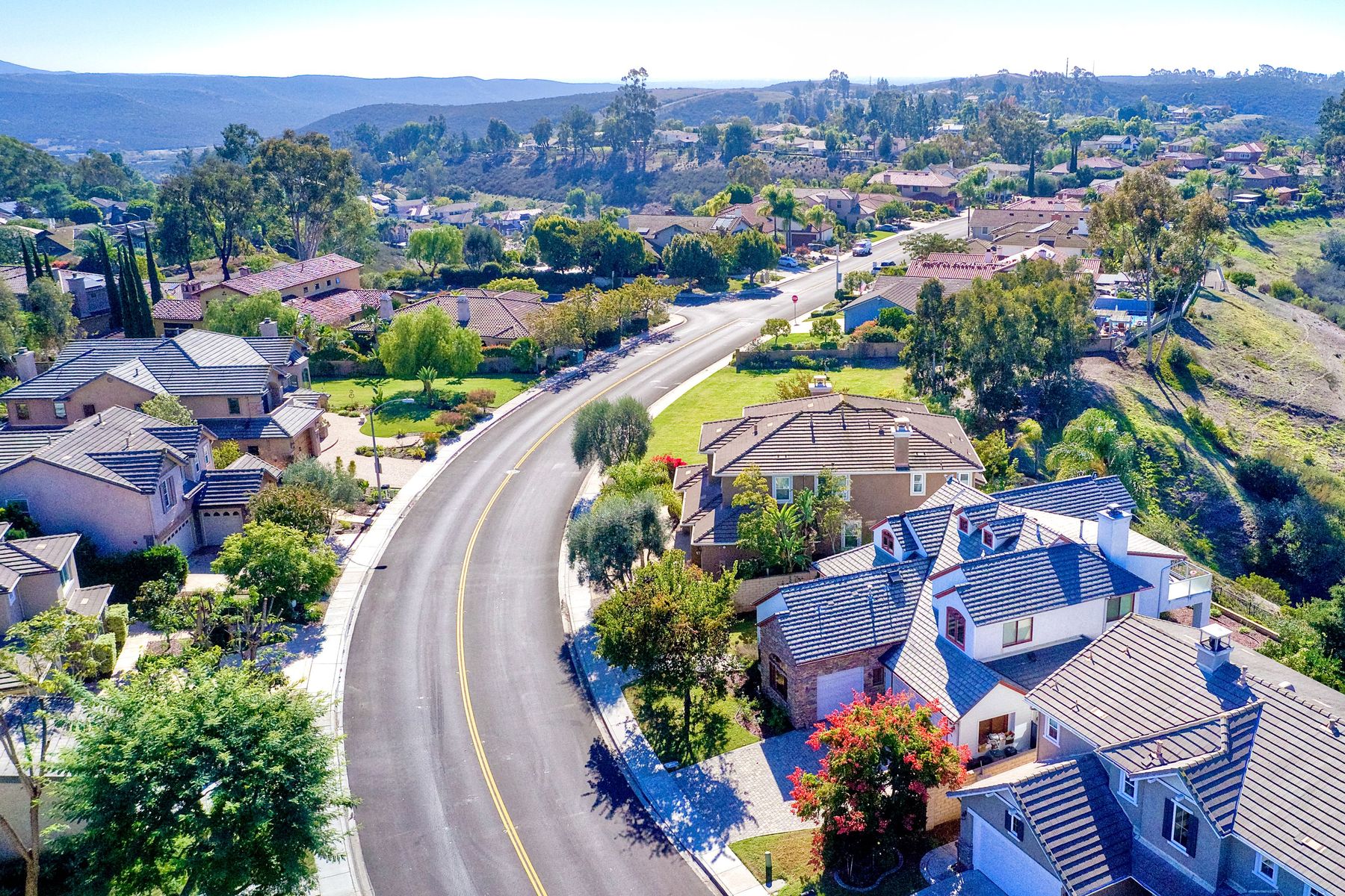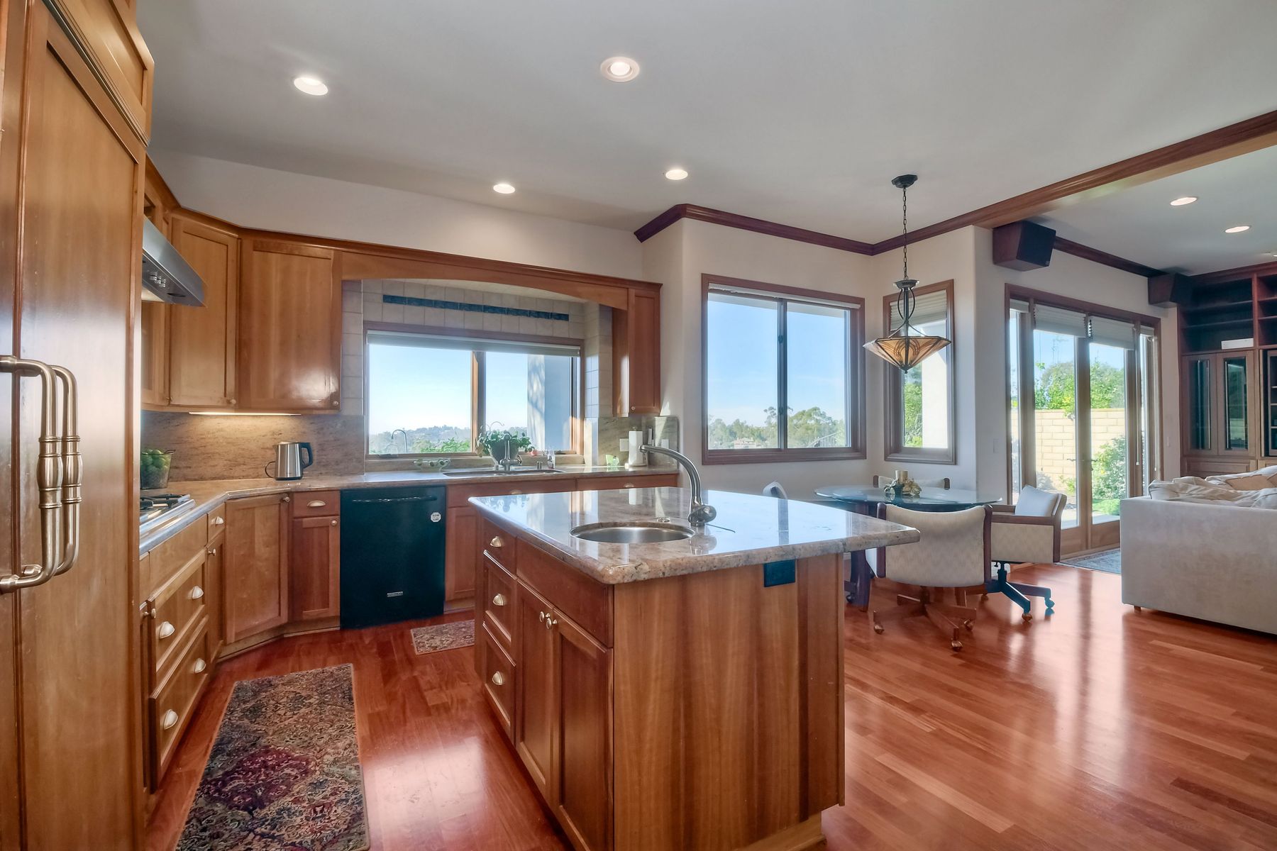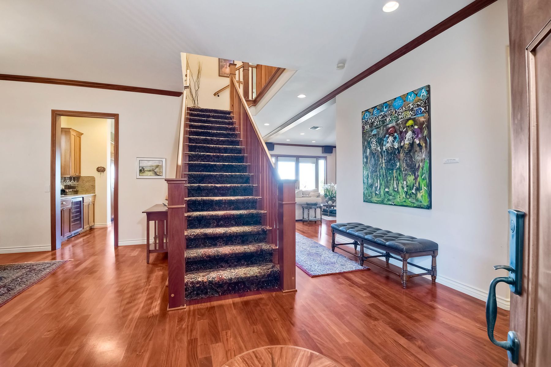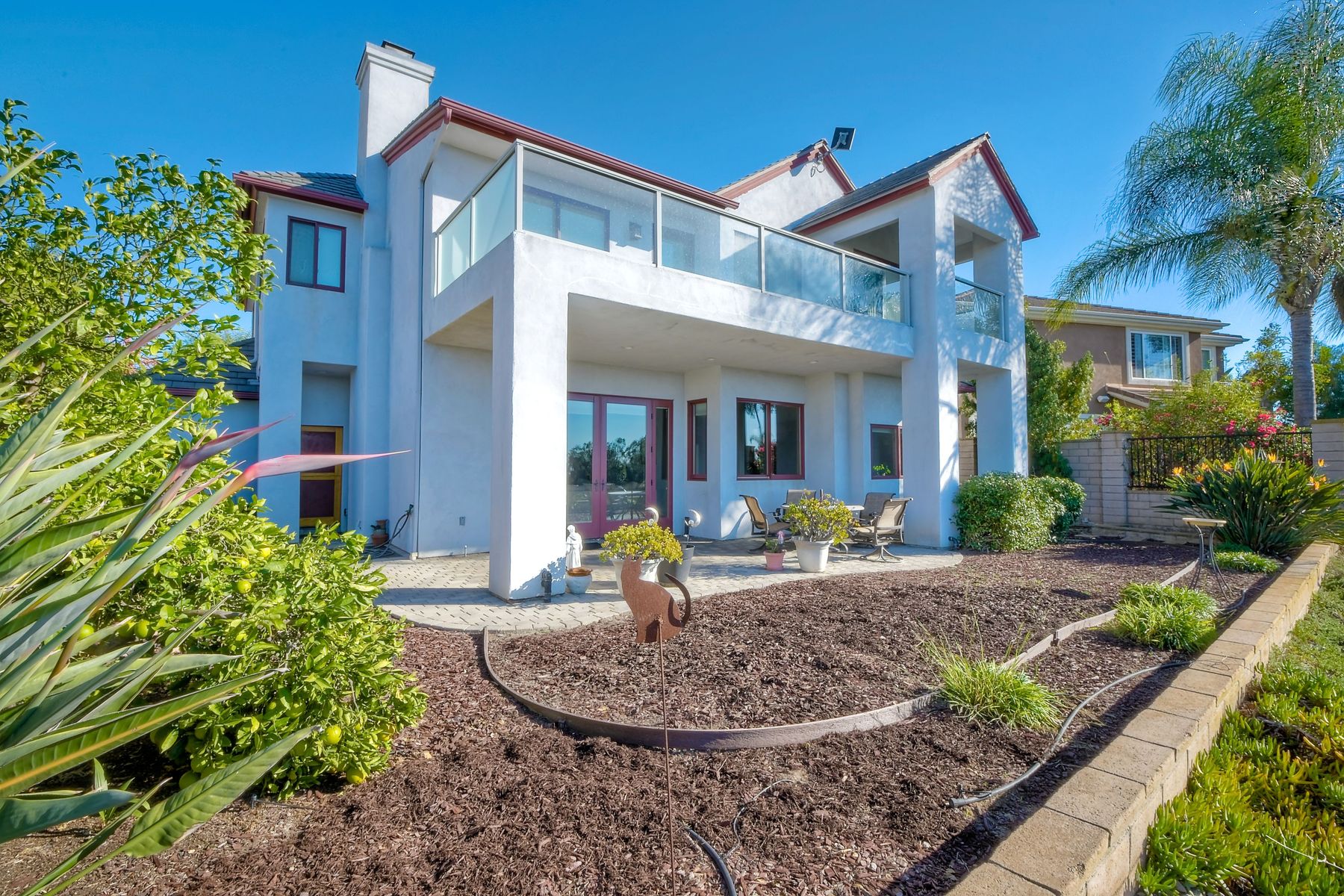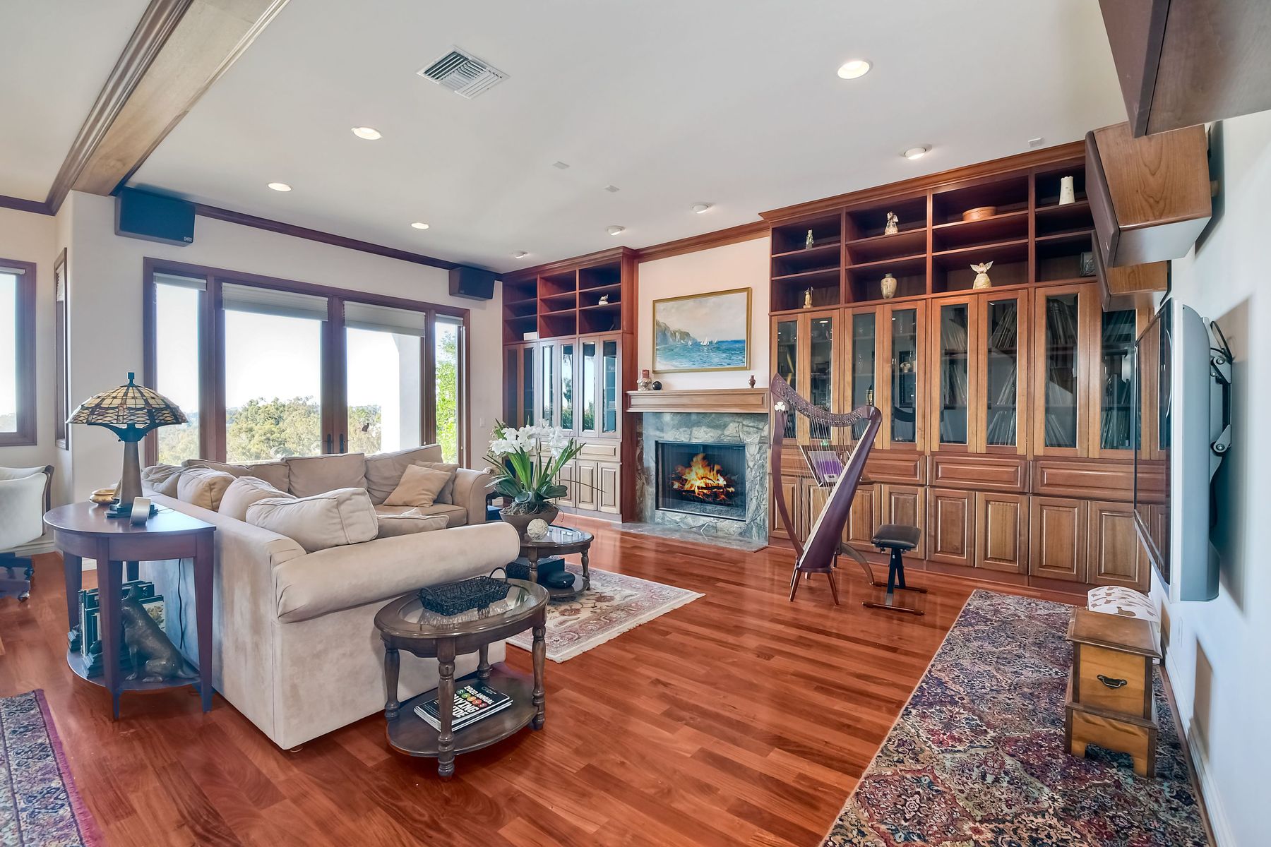 View! View! View! You are home in this custom beauty atop coveted & exclusive Scripps Ranch/South of Pomerado offering spectacular panoramic & coastal view! This custom home built in 2005 has been painstakingly planned & finished in every detail. The elegant, high-end Craftsman architecture offering clean lines & natural elements together with all of today’s modern conveniences is one of a kind – truly a masterpiece! 2 suites plus 2 optional rooms upstairs; 1 downstairs currently used as study, easily converted to additional bedrooms. Offering beautiful & charming curb appeal with exterior stone work, lush landscape & pavered entry & driveway you know you are in for something special. Community pool, tennis courts! Step in through striking double mahogany wood front doors to stunning foyer featuring custom inlayed entry medallion & Bolivian Santos mahogany floors throughout downstairs. The stately formal dining room on left offers entertaining on the grand or intimate scale with chandelier and plantation shutters. Be amazed by stunning family room featuring breathtaking elevated tree-line views through French doors, focal fireplace with marble surround, beautiful custom built-in entertainment center & bookcase with soft close, crown molding and wood cased windows & trim throughout. Gourmet kitchen features natural cherry cabinetry, slab granite countertop & backsplash with decorator tile back, appliances including Advantium/microwave, full oven & warming drawer, newer dishwasher, center island with veggie sink and extended counter; butler’s pantry/beverage center with wine refrigerator, walk-in pantry, built-in desk & media center as well as spacious eat-in area with forever view. Downstairs study is tucked away with luxurious solid mahogany double doors. Full bath includes Rainforest marble counter top, natural cherry cabinetry, shower/soaking tub and tile floors. Downstairs laundry room with built-in storage and utility sink. Grand craftsman staircase brings you to second floor in style! Spacious primary suite offers soaring cathedral ceiling with fan, sliding door to balcony with phenomenal view. Primary bath features double sinks, marble counter top, over-sized walk-in shower, tile floors and walk-in dream closet/dressing room with cathedral ceiling! 2 additional, large optional bedrooms upstairs currently used as offices. Full bath. Upstairs attic access. Beautiful backyard includes covered, pavered patio looking out to truly stunning view of lush green canyon and coastal views beyond – beautiful twinkling lights at night - Del Mar balloons by twilight! Sit back and enjoy the tranquil setting & nature that surrounds. Truly one of a kind! 3-car garage with storage. Some of the many extras include: solid wood interior doors, crown molding, wood trimmed windows throughout, Elevator shaft wired/ready; newer tankless water heaters, Martin garage doors, dual zone heating/AC units, extra roof tiles & exterior stone. Close to multiple parks, award winning schools, shopping and dining. Easy I-15 freeway access.