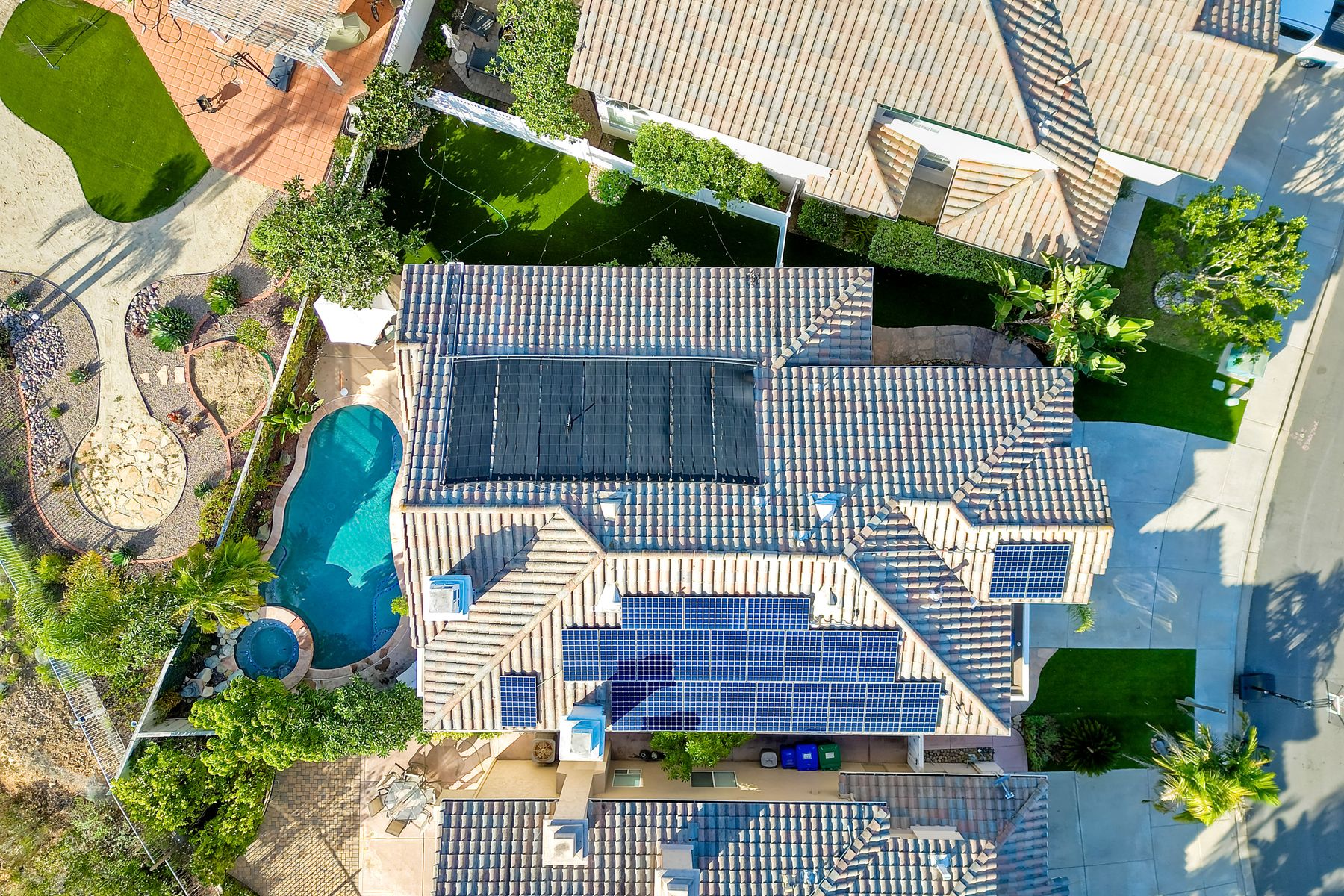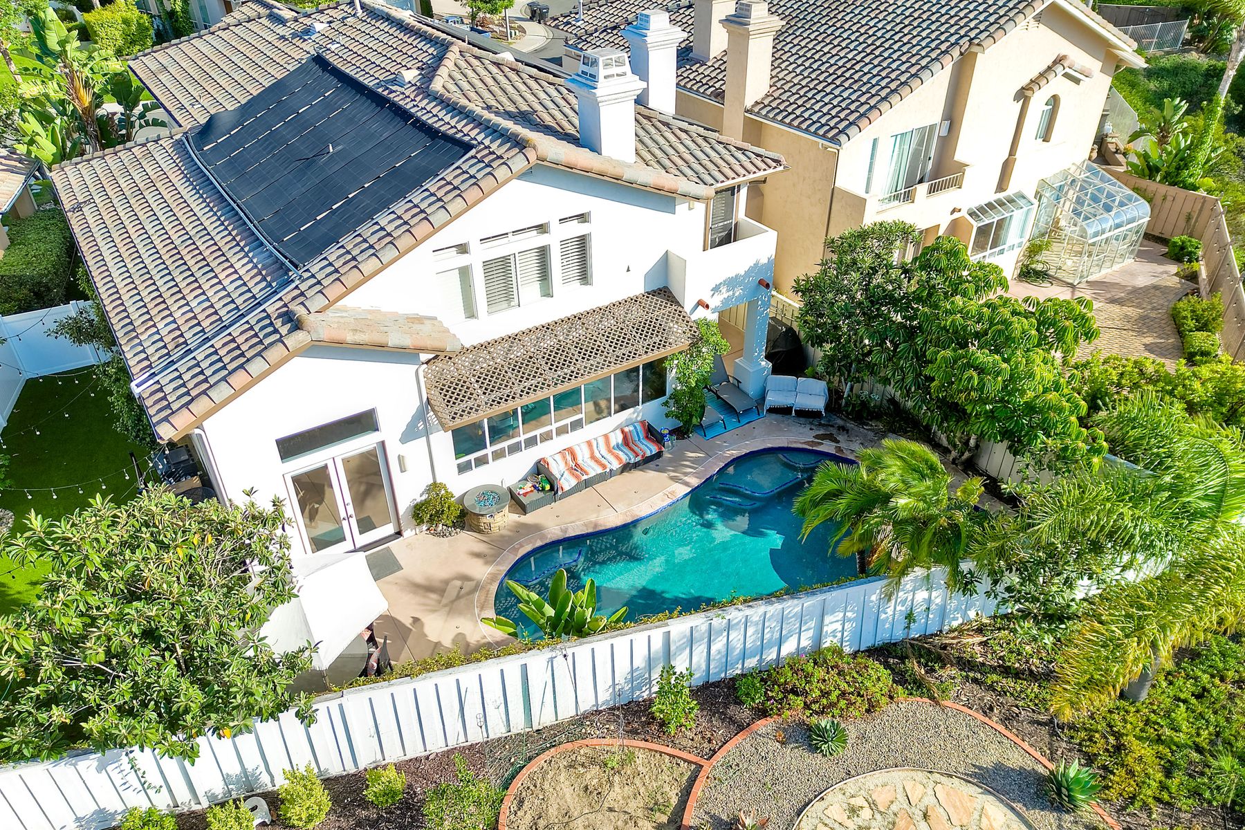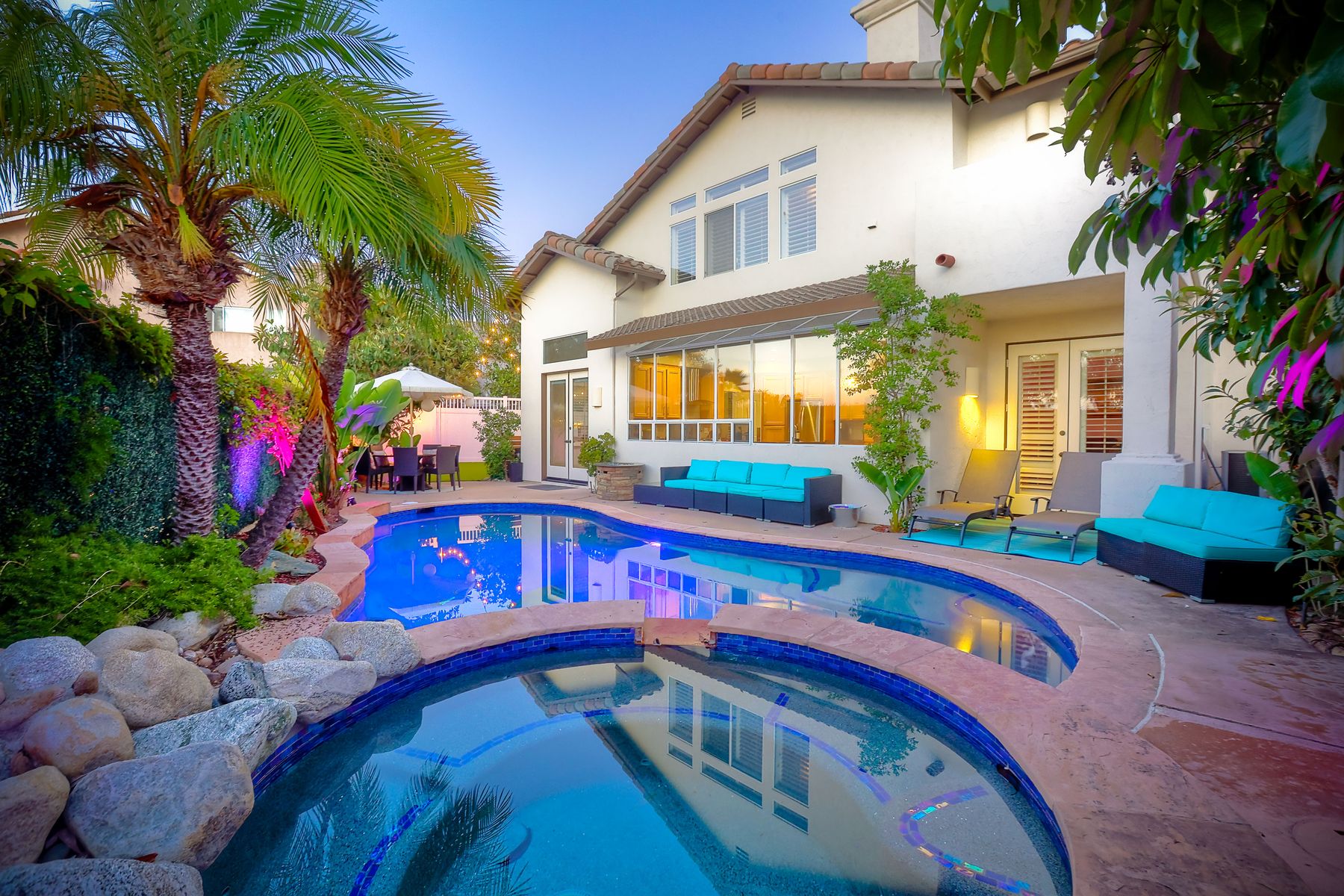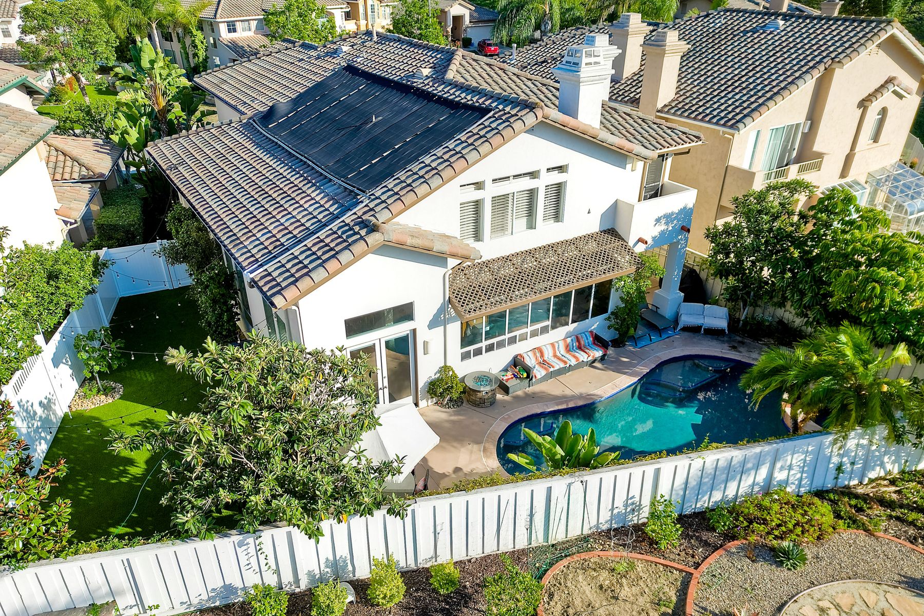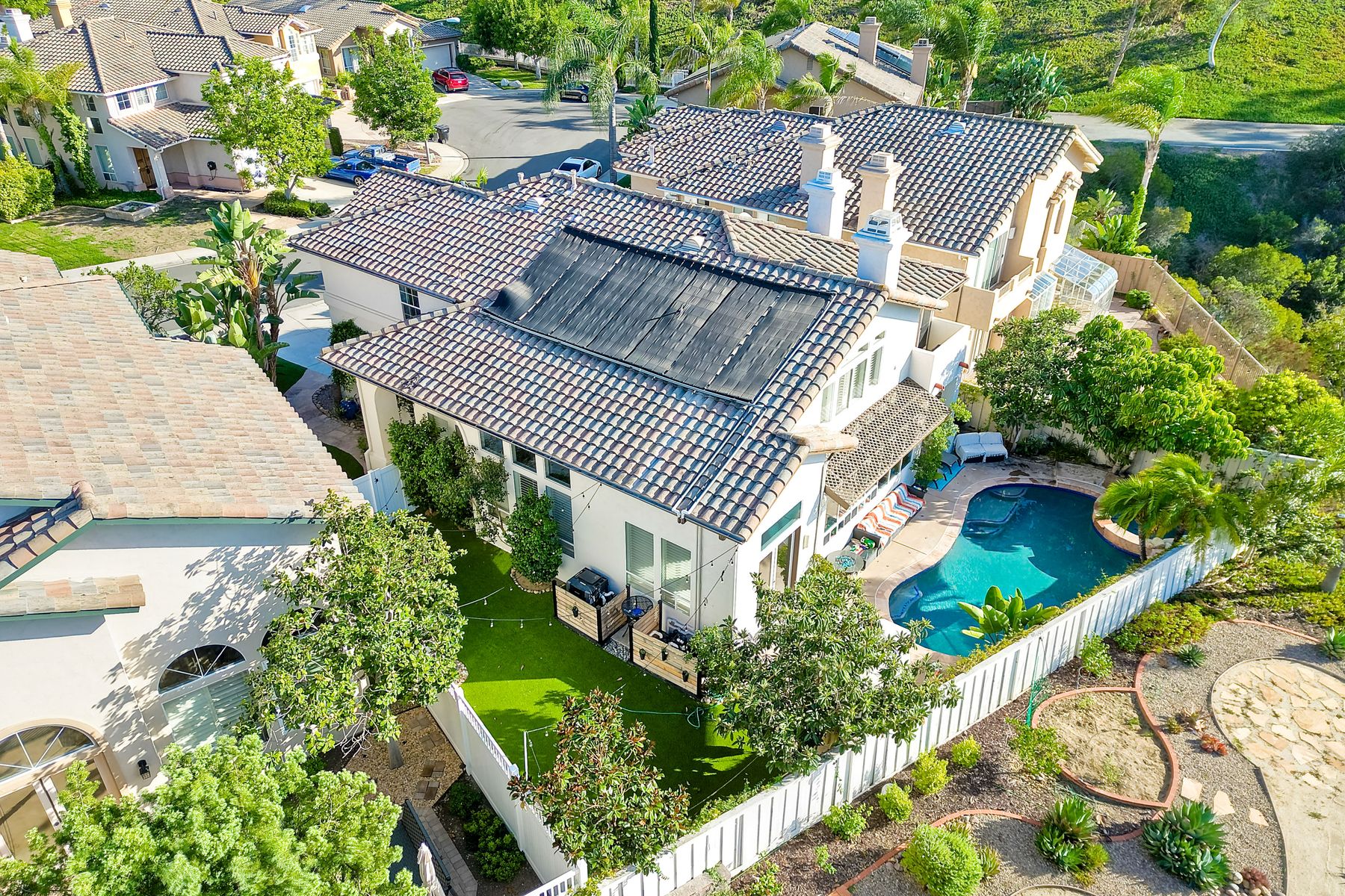 Incredible move-in ready and highly upgraded 4 bedroom (optional 5th bedroom) 3.5 bath Scripps Ranch home with owned 8.2KW solar system and a backyard paradise! Located in the highly desirable neighborhood of Scripps Legacy and on a double cul-de-sac, this homes sought-after layout features a downstairs bedroom and full bath with a private entrance, massive primary bedroom retreat with fireplace & balcony, and Children's wing thru double doors with 2 bedrooms and full bath. In addition, an amazing backyard with newly resurfaced pool, BBQ area, and huge side yard! Other features include: vaulted ceilings, designer paint, upgraded kitchen w/ granite counter/double oven, upgraded primary bath, newly painted exterior, new garage floor glass epoxy, new lighting fixtures throughout, new HVAC units, new solar pool heater, new artificial grass in both front and backyards, new low voltage landscape lighting, private balconies, and stunning sunrises and sunsets. In addition, an amazing backyard with newly resurfaced pool, BBQ area, and huge side yard! Other features include: vaulted ceilings, designer paint, upgraded kitchen w/ granite counter/double oven, upgraded primary bath, newly painted exterior, new garage floor glass epoxy, new lighting fixtures throughout, new HVAC units, new solar pool heater, new artificial grass in both front and backyards, new low voltage landscape lighting, new toilets, private balconies, and stunning sunrises and sunsets. Located close to restaurants, shopping, and highly rated schools!