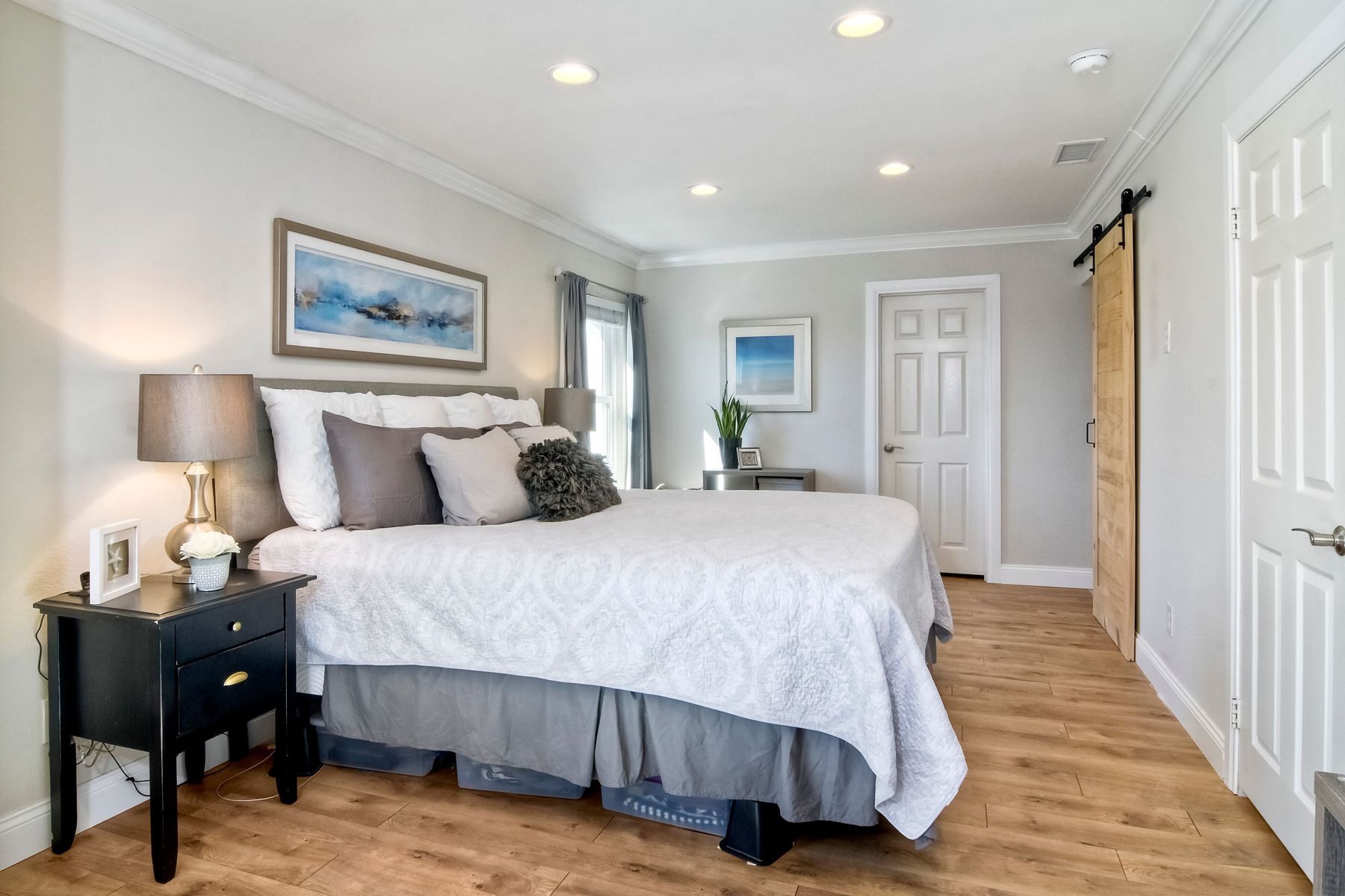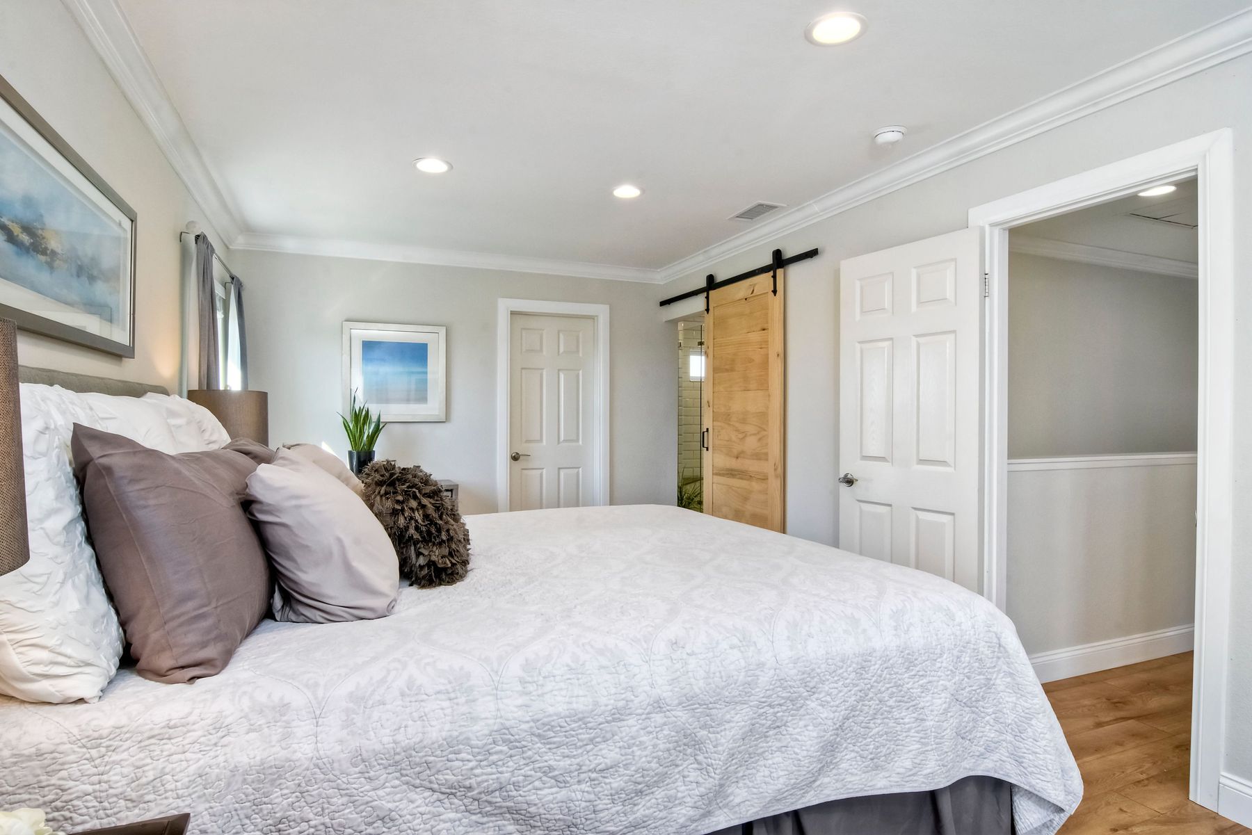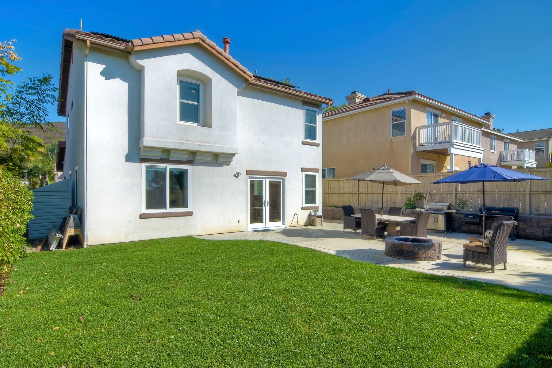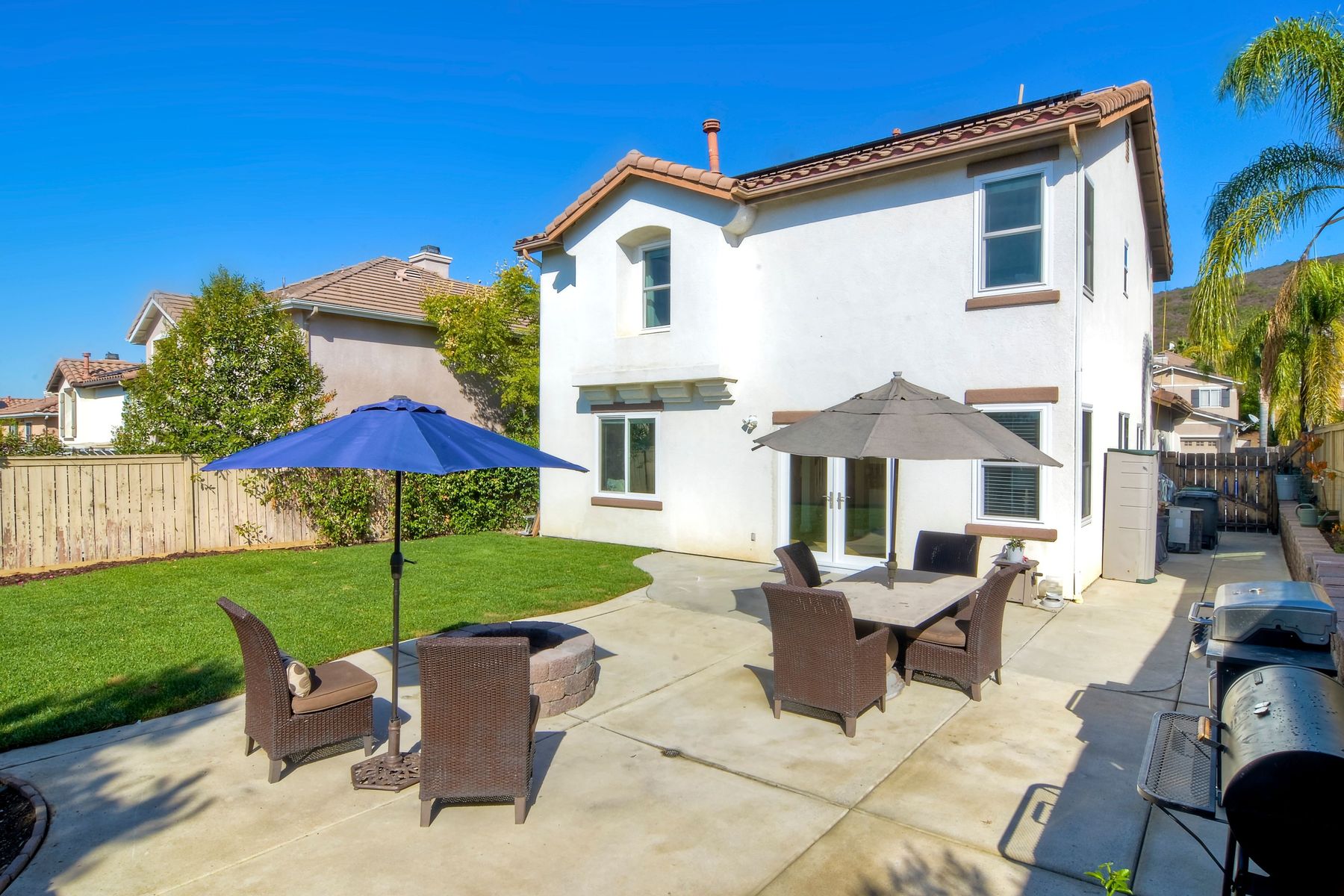 Gorgeous 3 bedroom/3 bath solar home with distant ocean and panoramic views. Beautiful custom details throughout with a large/pool size yard, perfect for entertaining and kids to play. Many of the upgrades include laminate wide plank wood flooring, new windows, crown molding, recessed lighting and beautiful designer colors throughout the home. The spacious bright kitchen opens to the dining area with new French doors to the back yard. All baths are tastefully upgraded. The Master Bedroom offers lots of natural light, a master retreat and an en-suite bath with a custom barn door entrance. The Master Bath features a large custom walk-in shower, rectangular floor tiles, tall glass shower panels and linen shelving. A 3-car driveway allows for plenty of parking. Save energy with your (owned) solar panel system. Santa Fe Hills is a unique neighborhood of approx. 1800 homes in N. San Marcos. Top rated schools, 9 community parks and mountain trails, multiple sports fields, pool, convenient to SD Beach towns, famous beaches, restaurants and shopping and nearby major freeways. Visit the community website at www.SantaFeHillsSanMarcos.com