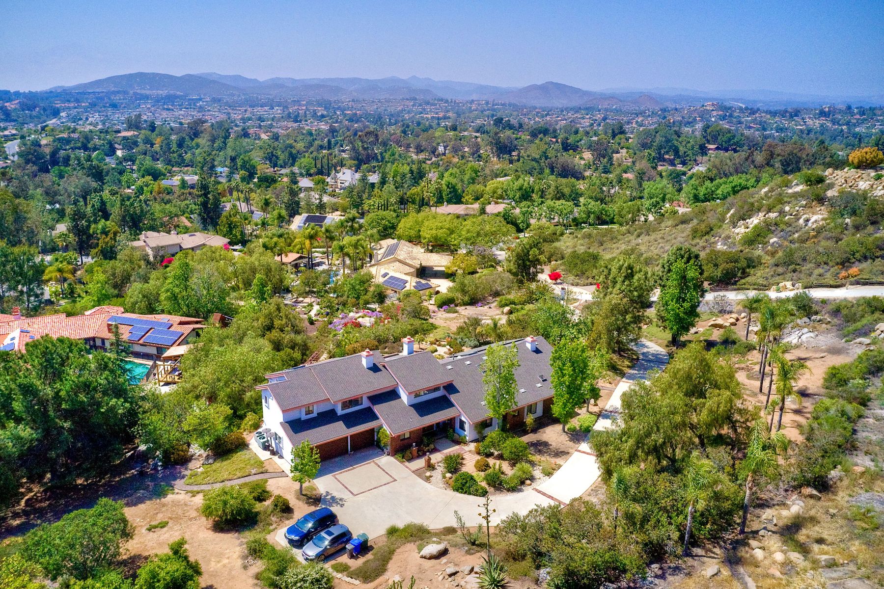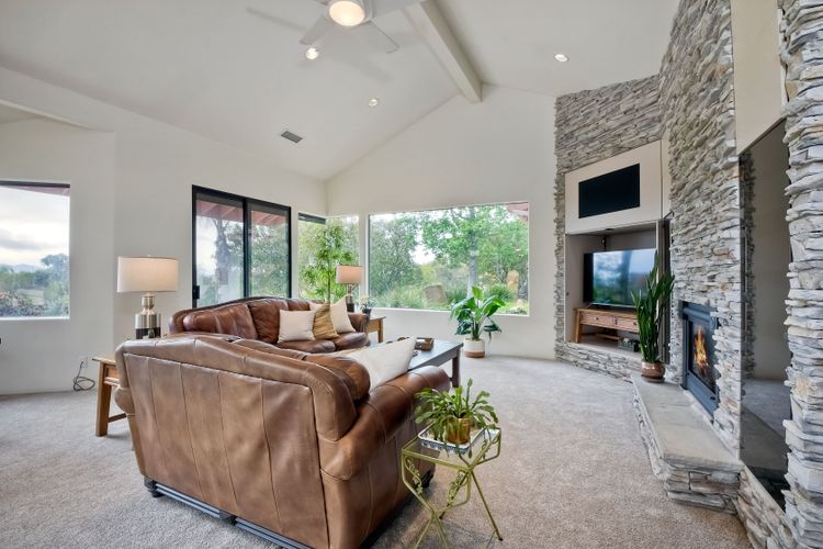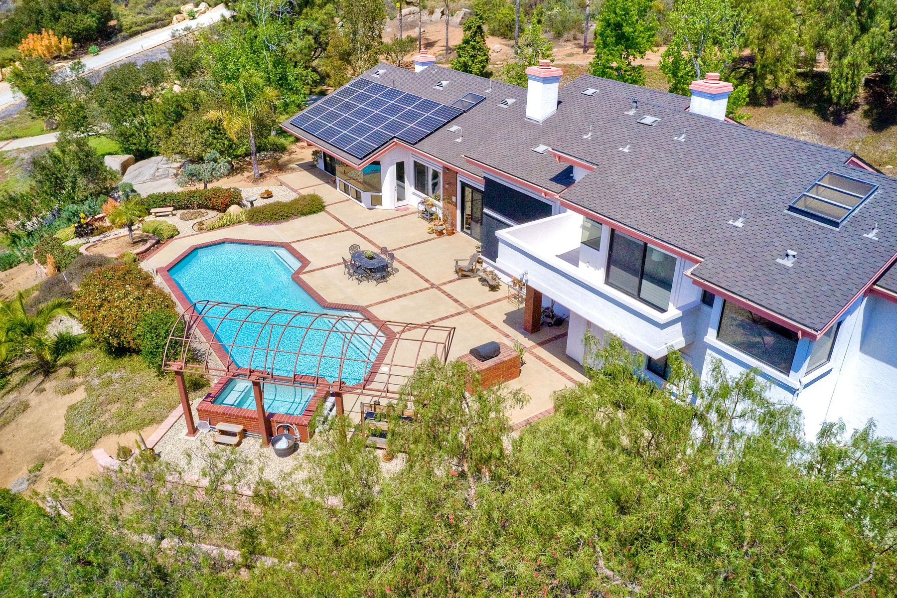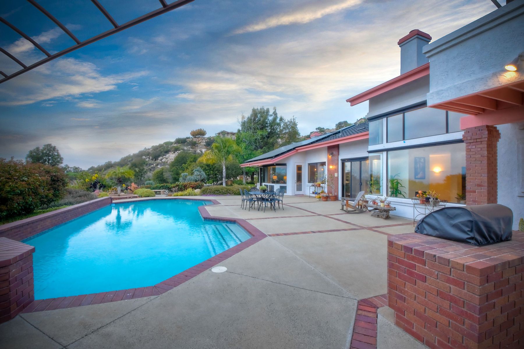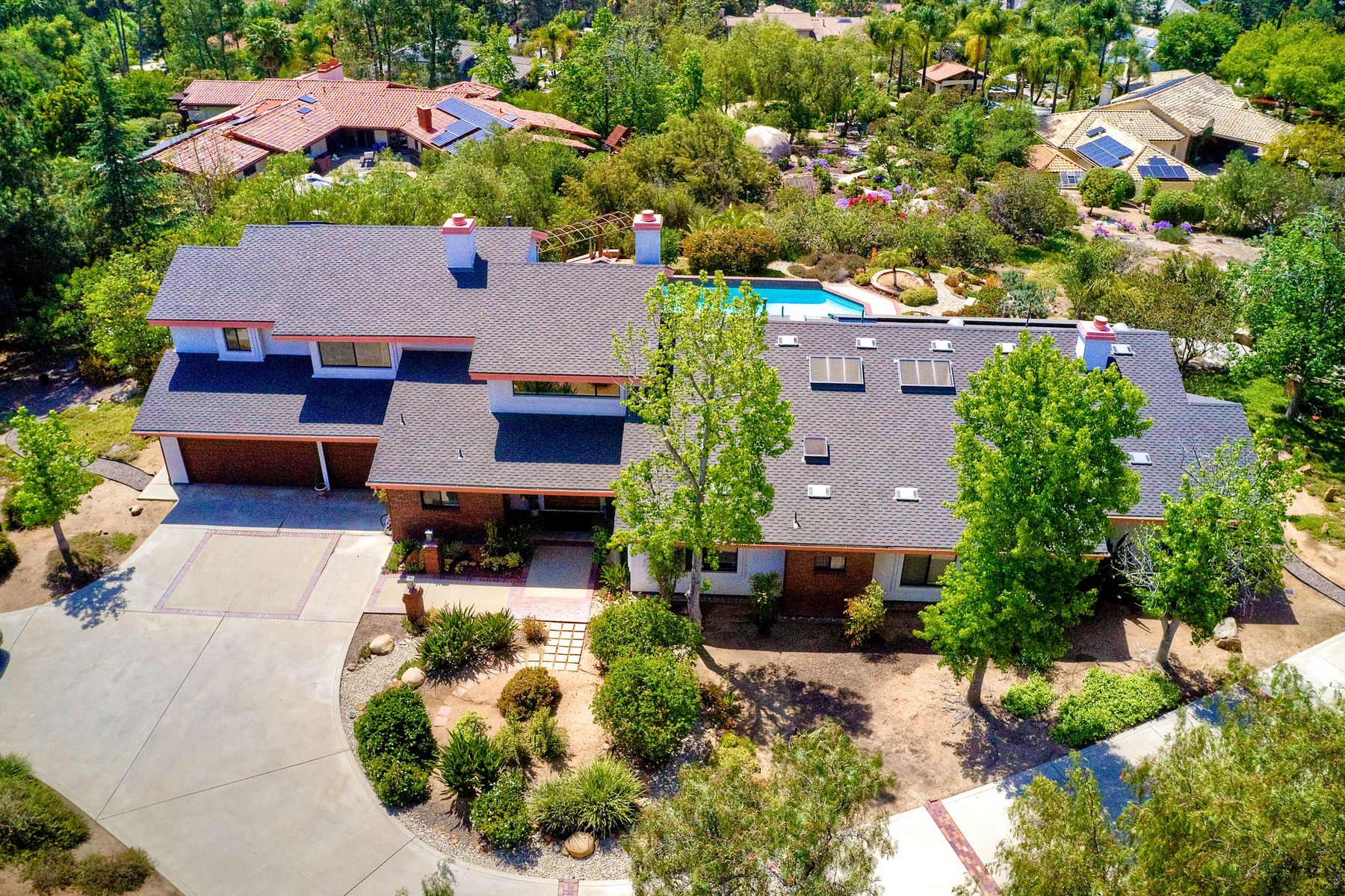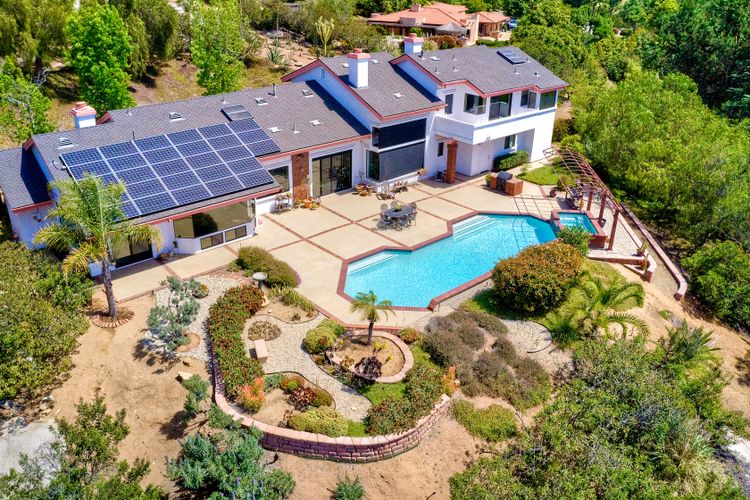 Welcome to an Exceptional Poway Home on a quiet cul-de-sac in the sought after community of Green Valley Knolls. The long driveway through inviting landscape takes you to this light, open 4 bedroom, 4 bath home on 1.48 acres. Moving through the double door entry you enter the stunning living room with two story ceilings, travertine tile floors, gas fireplace and massive windows that bring the light and amazing views in. The dining room is open to the living room and shares the fireplace, has amazing built-ins, tall french doors to the backyard patio and flows into the incredible kitchen. The kitchen is a chef's delight with stainless steel appliances . . . See Supplement The kitchen is a chef's delight with stainless steel appliances including double ovens, double dishwashers, Subzero fridge and a Viking gas stove with four burners, pancake grill plus steak grill. The European cabinets are light and the perfect contrast to the dark granite countertops. Tons of counter space including a large island with endless storage and a separate breakfast bar with seating for 2-3. A large skylight, rich tile flooring and an expansive window over the sink combines to provide the perfect workspace for entertaining or everyday living. The family room is open to the kitchen and is the heart of the home. A stacked stone feature wall includes a cozy fireplace, entertainment area and built ins. A wall of windows invite you in to enjoy the warm carpet, cooling fan and casual dining area. The first floor also includes two generous bedrooms joined by a Jack and Jill bath with beautiful tile work and a large glass tile shower. The optional 4th bedroom is being used as an office and has a walk in closet, tile flooring and built in double desks. A full hall bathroom also opens to the office/bedroom. This functional main floor includes a large laundry room with a sink, lots of shelving and counter space for folding, etc. Up the dramatic stairway you arrive at the master suite which dominates the entire second floor. This inviting oasis begins with the master bedrooms vaulted ceilings, gas fireplace, lovely built ins and wonderful sitting area next to a sliding glass door to the private balcony. The spa like master bath offers a large skylight, double vanity, deep soaking tub surrounded by windows, spacious walk in shower with glass tiles and walk in closet able to accommodate any wardrobe. The backyard is an entertainers dream offering the perfect space for indoor/outdoor living. The sparkling pool and raised jacuzzi are surrounded by a large patio with brick accents offering multiple areas for dining or conversation areas. There's a full bath off the patio. The new built in gas barbeque and low maintenance landscaping frame the yard but the star of this incredible space is the VIEW! The panoramic mountain views are amazing! Must be seen to really appreciate. Home also includes paid solar panels, central vac and 3 car garage with a workbench, sink, tons of cabinets, shelving and a separate walk in storage area. Located in the award winning Poway Unified School District. Close to Lake Poway, Blue Sky Ecological Reserve, Old Poway Park, Poway Center for the Performing Arts, golfing, wineries, restaurants, shopping and easy freeway access. No HOAs or Mello Roos.