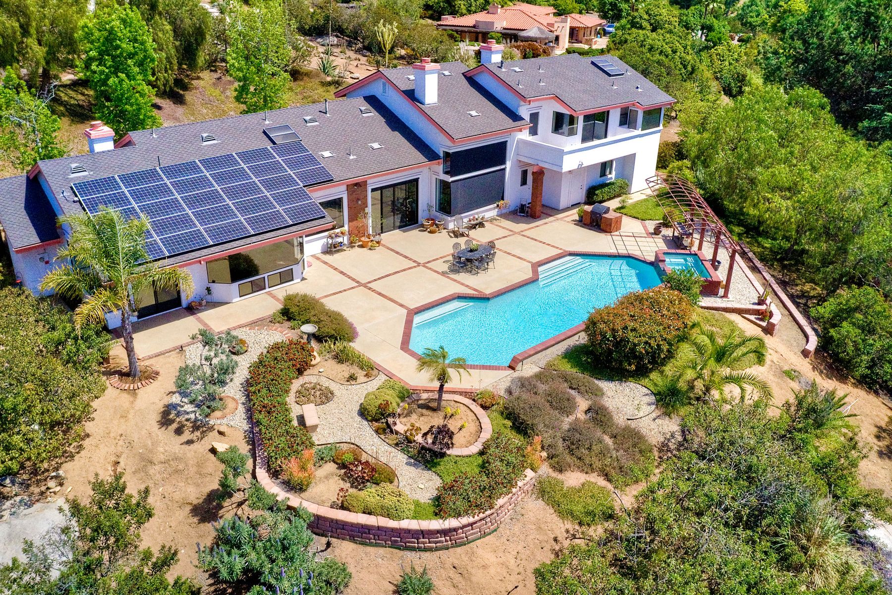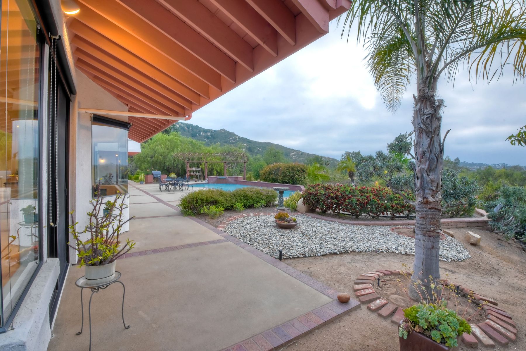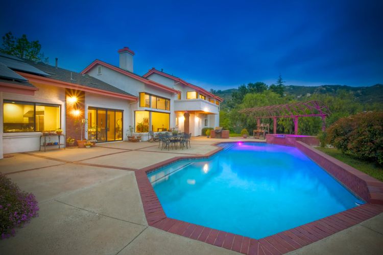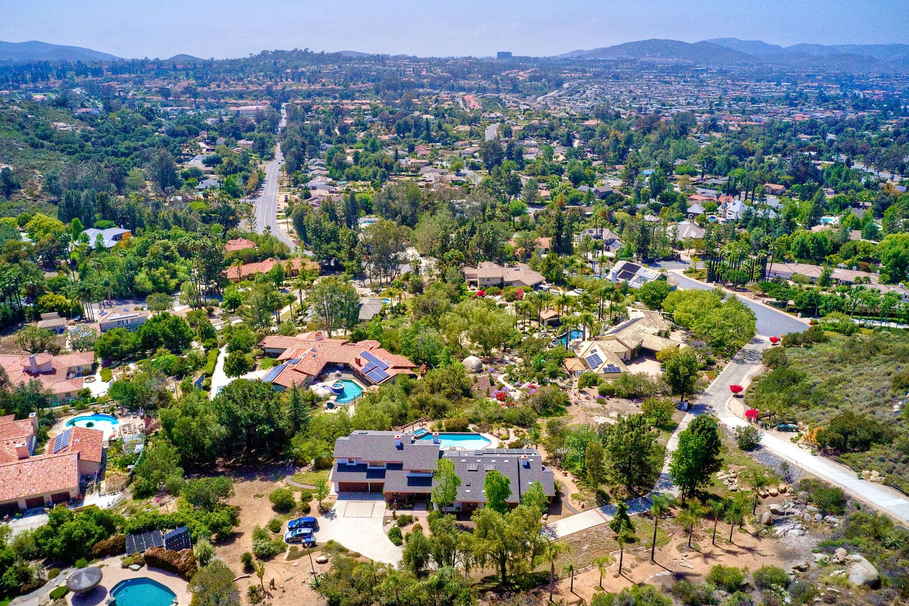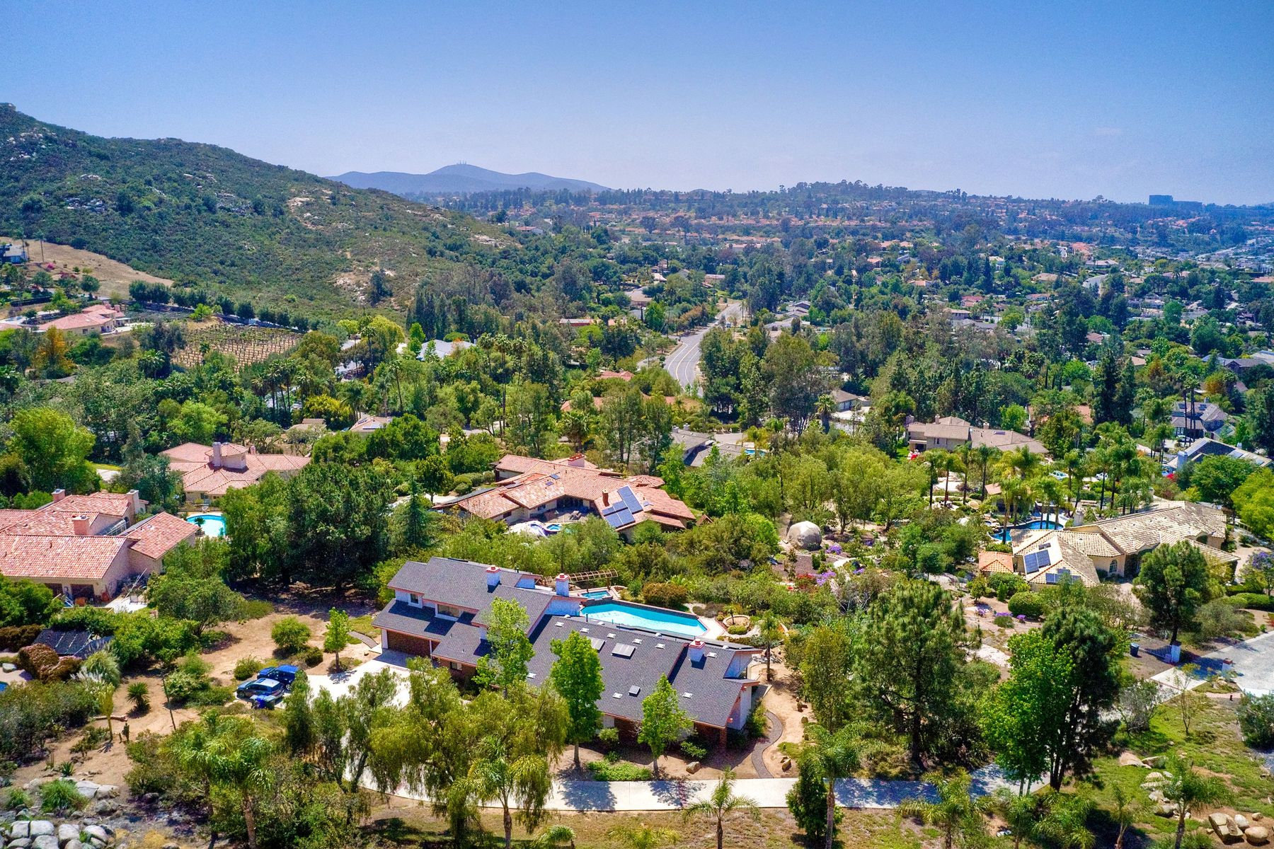 Welcome to an Exceptional Poway Home on a quiet cul-de-sac in the sought after community of Green Valley Knolls. The long driveway through inviting landscape takes you to this light, open 4 bedroom, 4 bath home on 1.48 acres. Moving through the double door entry you enter the stunning living room with two story ceilings, travertine tile floors, gas fireplace and massive windows that bring the light and amazing views in. The dining room is open to the living room and shares the fireplace, has amazing built-ins, tall french doors to the backyard patio and flows into the incredible kitchen. The kitchen is a chef's delight with stainless steel appliances . . . See Supplement The kitchen is a chef's delight with stainless steel appliances including double ovens, double dishwashers, Subzero fridge and a Viking gas stove with four burners, pancake grill plus steak grill. The European cabinets are light and the perfect contrast to the dark granite countertops. Tons of counter space including a large island with endless storage and a separate breakfast bar with seating for 2-3. A large skylight, rich tile flooring and an expansive window over the sink combines to provide the perfect workspace for entertaining or everyday living. The family room is open to the kitchen and is the heart of the home. A stacked stone feature wall includes a cozy fireplace, entertainment area and built ins. A wall of windows invite you in to enjoy the warm carpet, cooling fan and casual dining area. The first floor also includes two generous bedrooms joined by a Jack and Jill bath with beautiful tile work and a large glass tile shower. The optional 4th bedroom is being used as an office and has a walk in closet, tile flooring and built in double desks. A full hall bathroom also opens to the office/bedroom. This functional main floor includes a large laundry room with a sink, lots of shelving and counter space for folding, etc. Up the dramatic stairway you arrive at the master suite which dominates the entire second floor. This inviting oasis begins with the master bedrooms vaulted ceilings, gas fireplace, lovely built ins and wonderful sitting area next to a sliding glass door to the private balcony. The spa like master bath offers a large skylight, double vanity, deep soaking tub surrounded by windows, spacious walk in shower with glass tiles and walk in closet able to accommodate any wardrobe. The backyard is an entertainers dream offering the perfect space for indoor/outdoor living. The sparkling pool and raised jacuzzi are surrounded by a large patio with brick accents offering multiple areas for dining or conversation areas. There's a full bath off the patio. The new built in gas barbeque and low maintenance landscaping frame the yard but the star of this incredible space is the VIEW! The panoramic mountain views are amazing! Must be seen to really appreciate. Home also includes paid solar panels, central vac and 3 car garage with a workbench, sink, tons of cabinets, shelving and a separate walk in storage area. Located in the award winning Poway Unified School District. Close to Lake Poway, Blue Sky Ecological Reserve, Old Poway Park, Poway Center for the Performing Arts, golfing, wineries, restaurants, shopping and easy freeway access. No HOAs or Mello Roos.