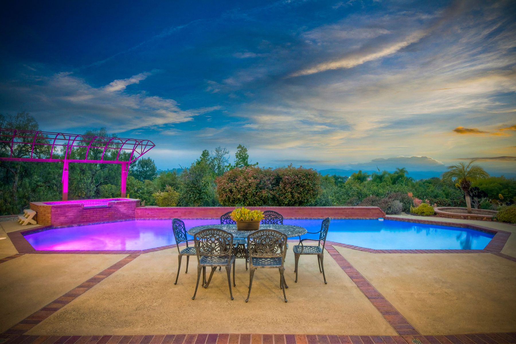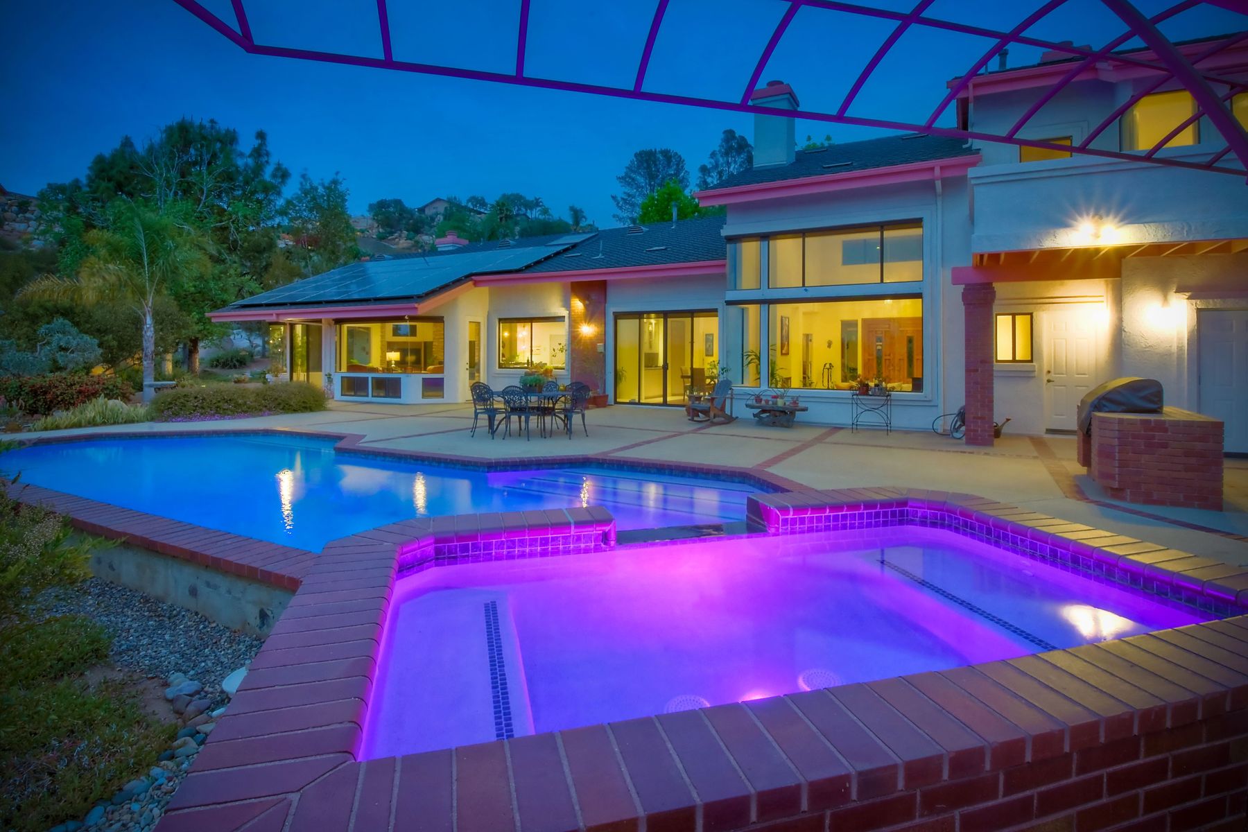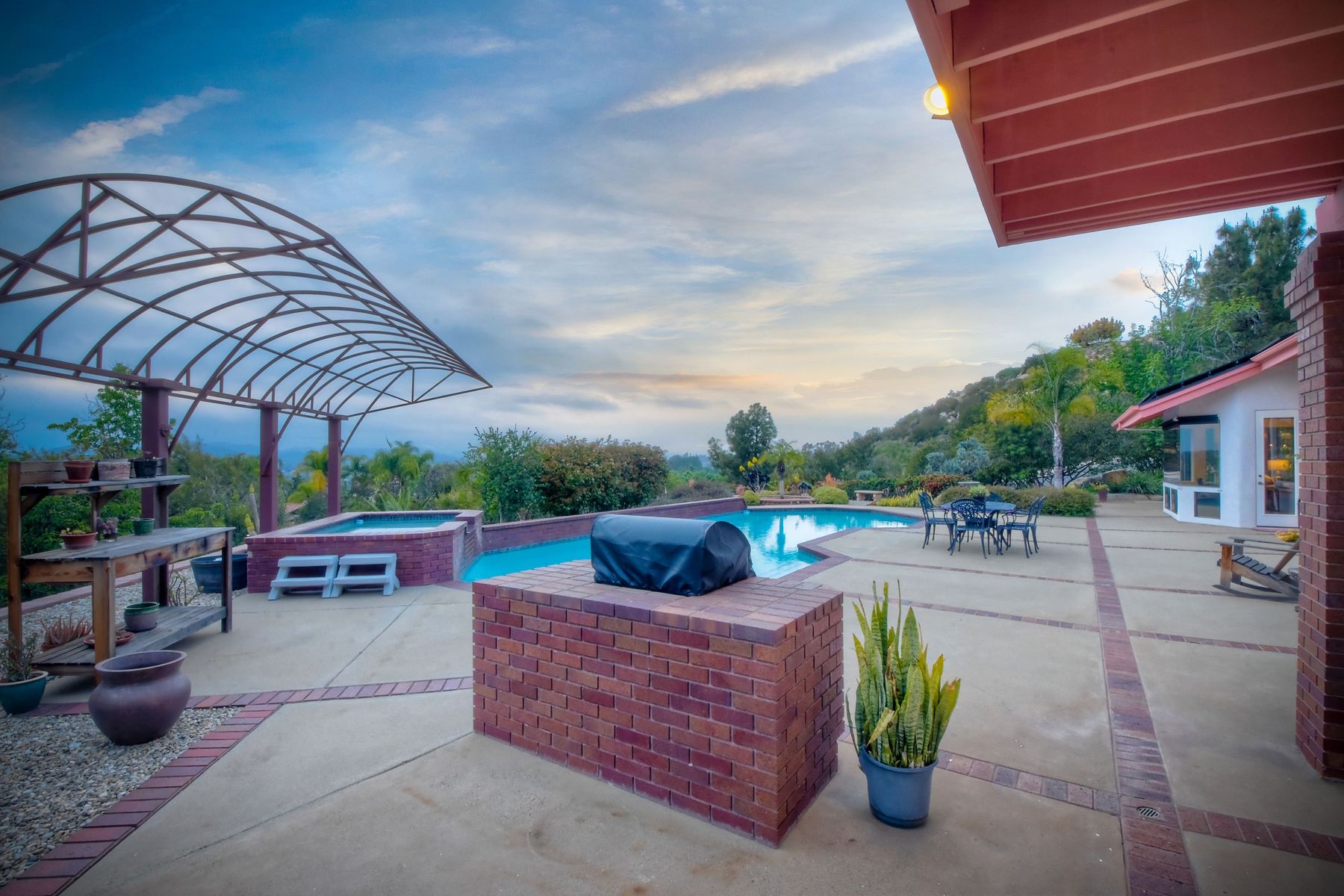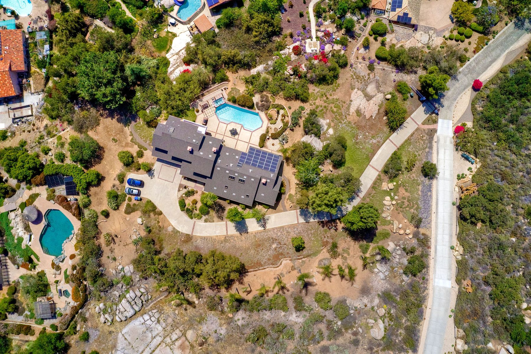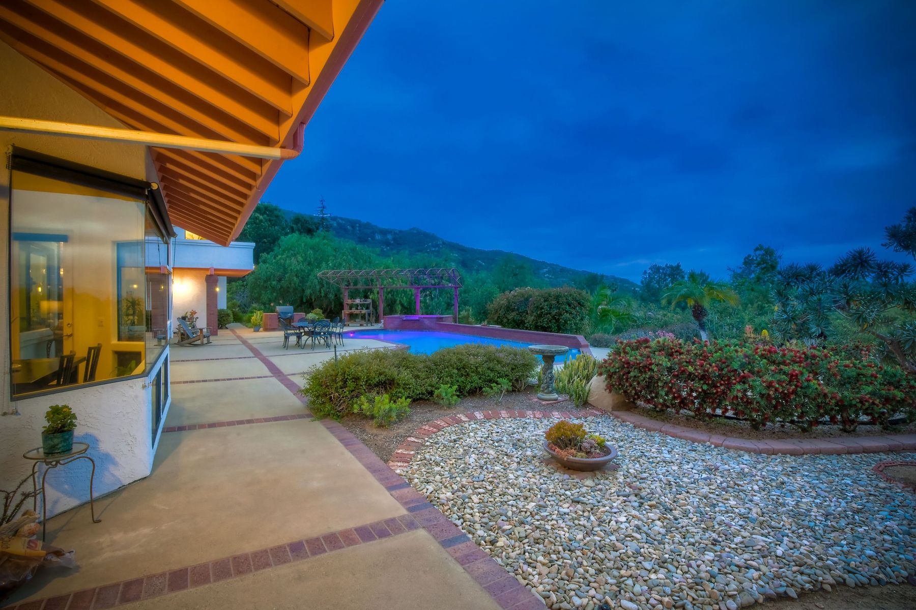 Welcome to an Exceptional Poway Home on a quiet cul-de-sac in the sought after community of Green Valley Knolls. The long driveway through inviting landscape takes you to this light, open 4 bedroom, 4 bath home on 1.48 acres. Moving through the double door entry you enter the stunning living room with two story ceilings, travertine tile floors, gas fireplace and massive windows that bring the light and amazing views in. The dining room is open to the living room and shares the fireplace, has amazing built-ins, tall french doors to the backyard patio and flows into the incredible kitchen. The kitchen is a chef's delight with stainless steel appliances . . . See Supplement The kitchen is a chef's delight with stainless steel appliances including double ovens, double dishwashers, Subzero fridge and a Viking gas stove with four burners, pancake grill plus steak grill. The European cabinets are light and the perfect contrast to the dark granite countertops. Tons of counter space including a large island with endless storage and a separate breakfast bar with seating for 2-3. A large skylight, rich tile flooring and an expansive window over the sink combines to provide the perfect workspace for entertaining or everyday living. The family room is open to the kitchen and is the heart of the home. A stacked stone feature wall includes a cozy fireplace, entertainment area and built ins. A wall of windows invite you in to enjoy the warm carpet, cooling fan and casual dining area. The first floor also includes two generous bedrooms joined by a Jack and Jill bath with beautiful tile work and a large glass tile shower. The optional 4th bedroom is being used as an office and has a walk in closet, tile flooring and built in double desks. A full hall bathroom also opens to the office/bedroom. This functional main floor includes a large laundry room with a sink, lots of shelving and counter space for folding, etc. Up the dramatic stairway you arrive at the master suite which dominates the entire second floor. This inviting oasis begins with the master bedrooms vaulted ceilings, gas fireplace, lovely built ins and wonderful sitting area next to a sliding glass door to the private balcony. The spa like master bath offers a large skylight, double vanity, deep soaking tub surrounded by windows, spacious walk in shower with glass tiles and walk in closet able to accommodate any wardrobe. The backyard is an entertainers dream offering the perfect space for indoor/outdoor living. The sparkling pool and raised jacuzzi are surrounded by a large patio with brick accents offering multiple areas for dining or conversation areas. There's a full bath off the patio. The new built in gas barbeque and low maintenance landscaping frame the yard but the star of this incredible space is the VIEW! The panoramic mountain views are amazing! Must be seen to really appreciate. Home also includes paid solar panels, central vac and 3 car garage with a workbench, sink, tons of cabinets, shelving and a separate walk in storage area. Located in the award winning Poway Unified School District. Close to Lake Poway, Blue Sky Ecological Reserve, Old Poway Park, Poway Center for the Performing Arts, golfing, wineries, restaurants, shopping and easy freeway access. No HOAs or Mello Roos.