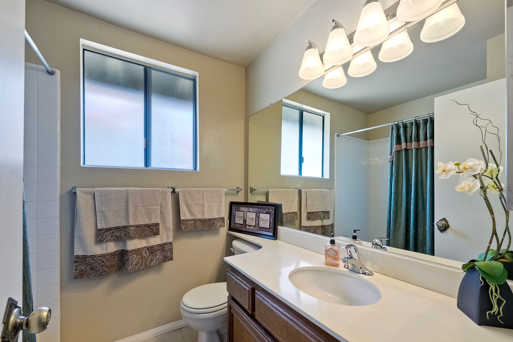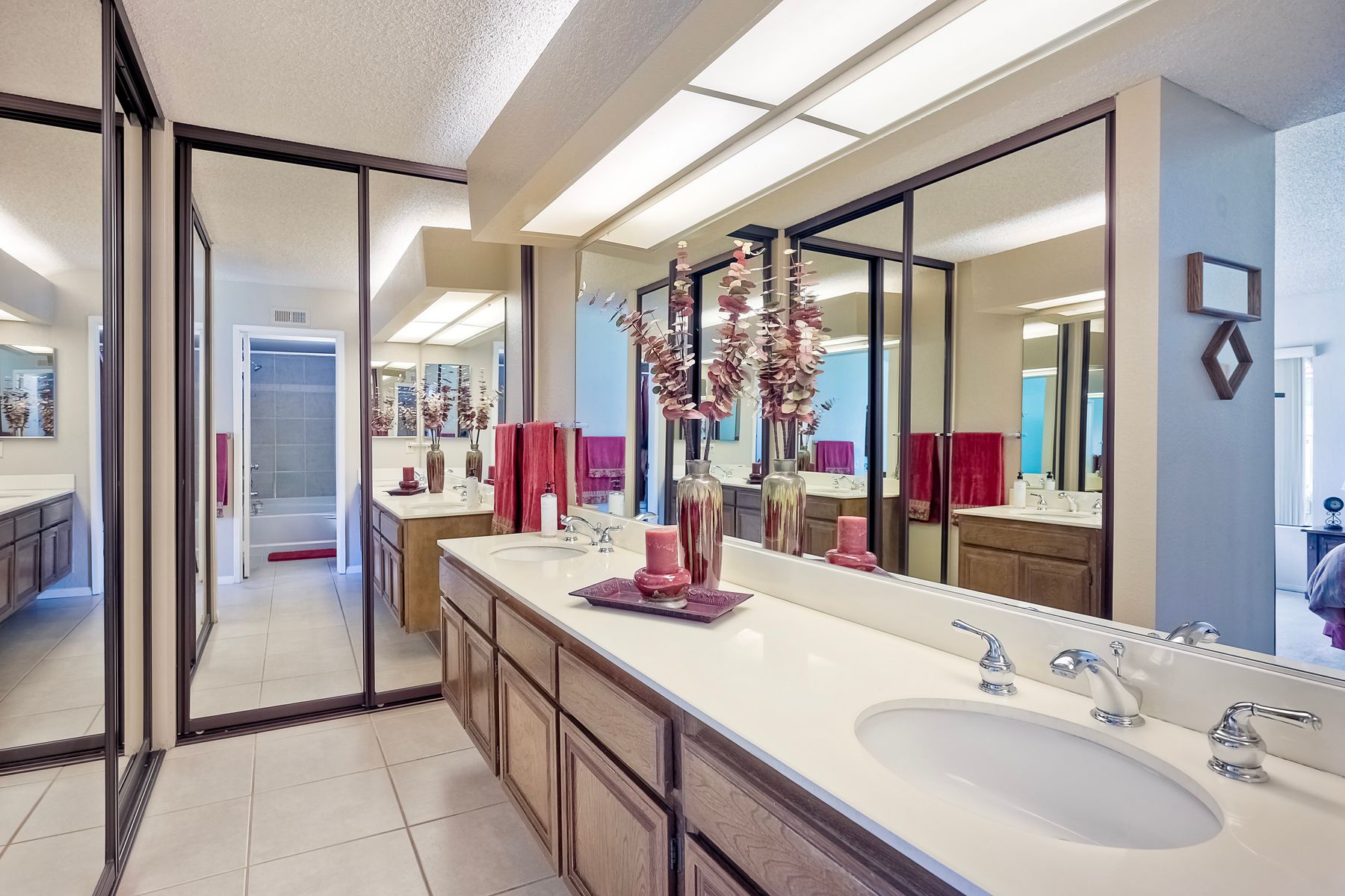 Double Sinks in Primary Bath, Privacy toilet door, Soaking Tub, Tile Counters, Shower, Shower in Tub, Bathtub, Closet in bathroom