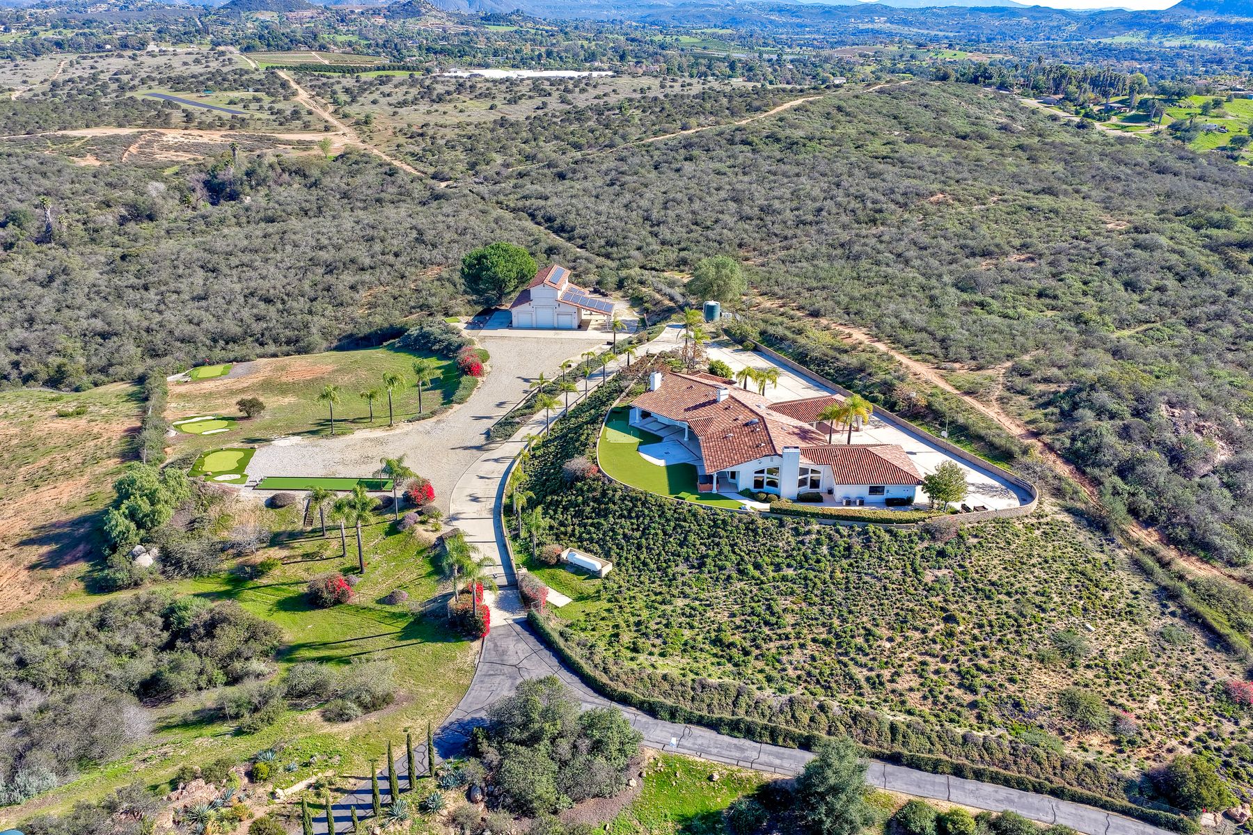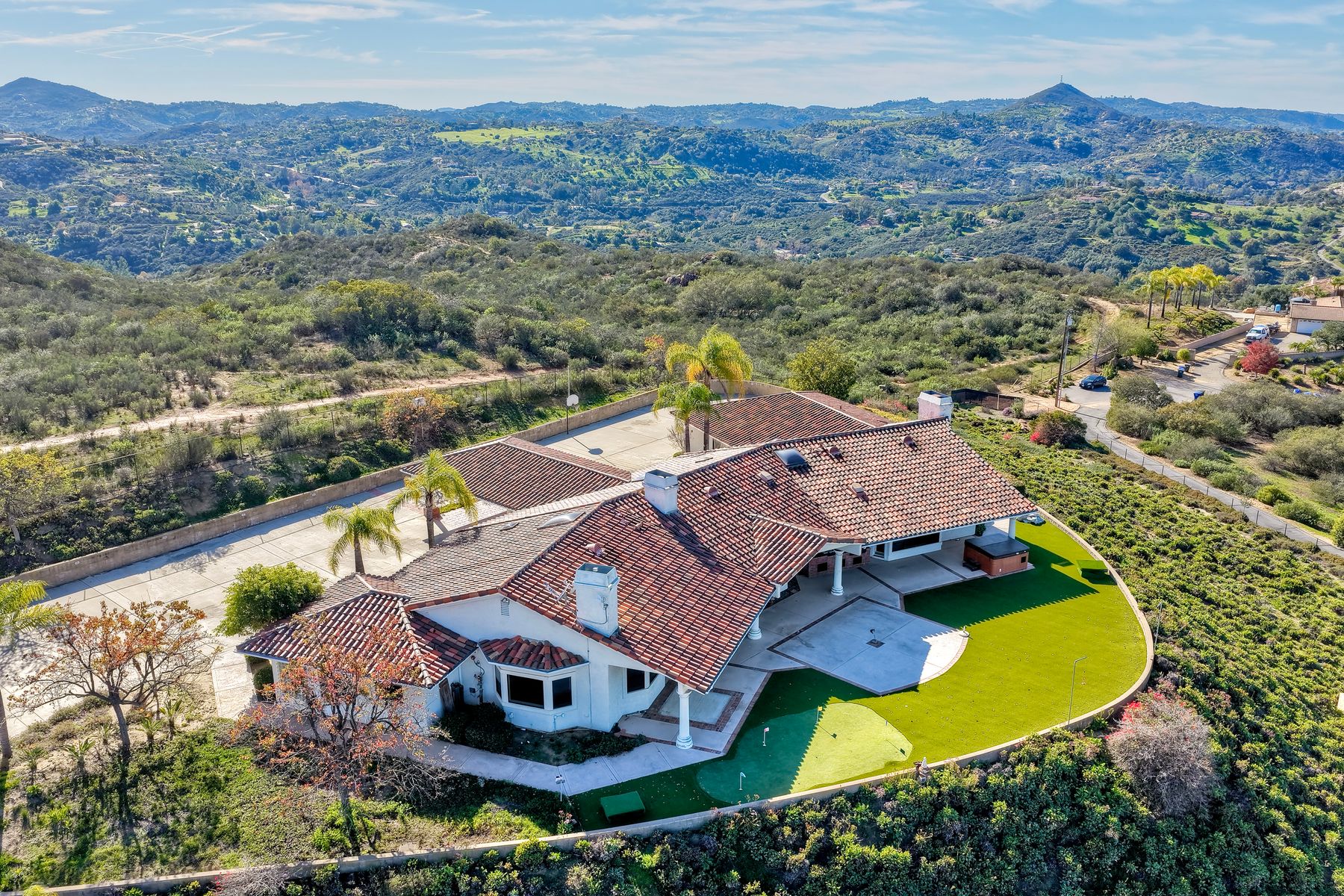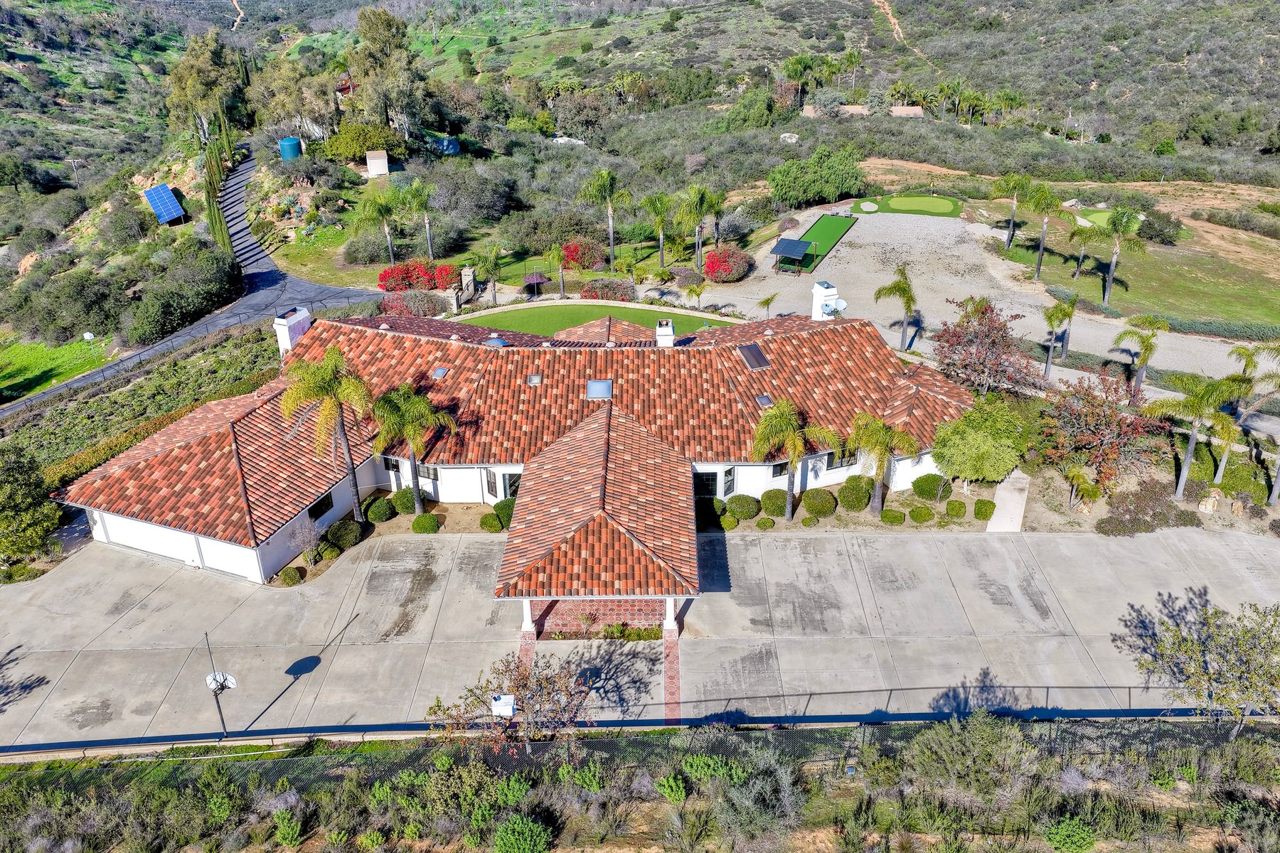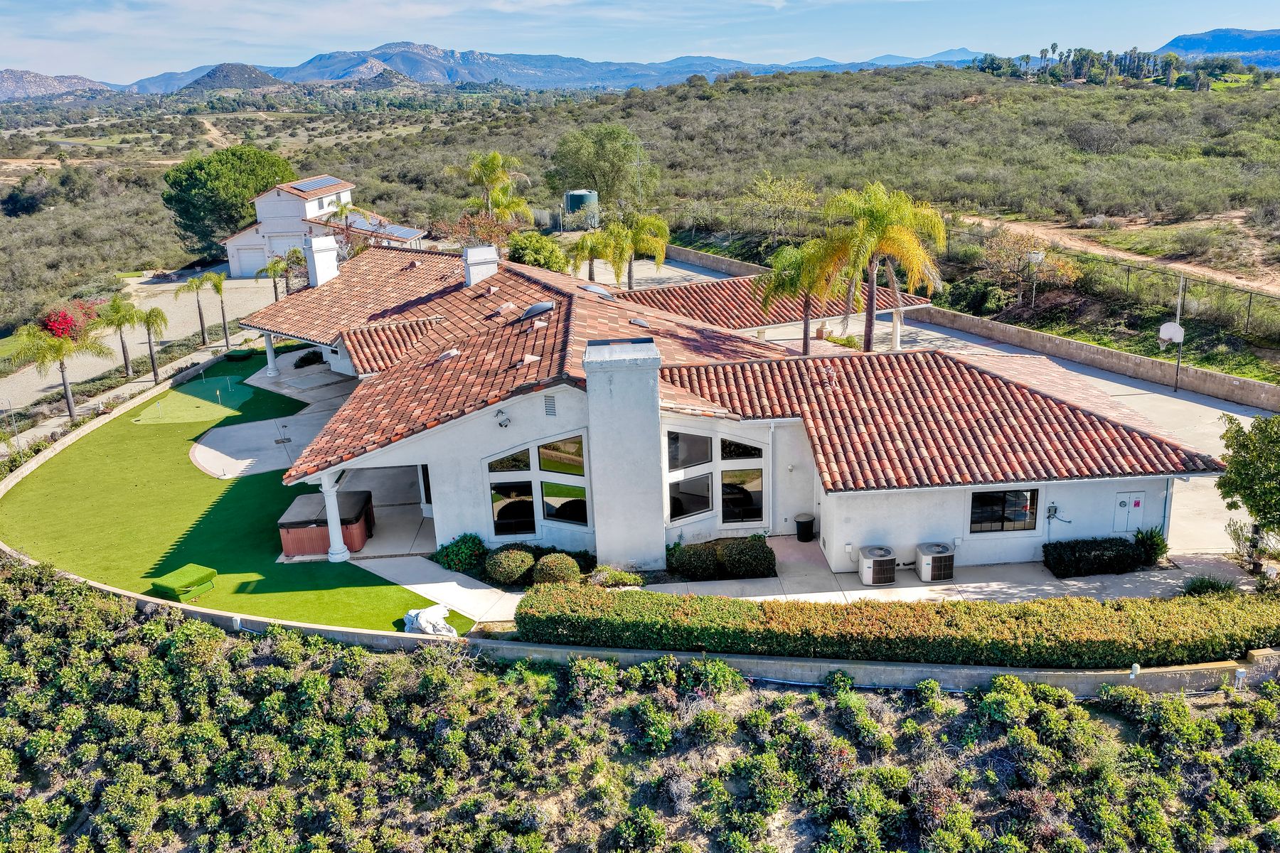 Custom single story Mediterranean estate perched atop your entire neighborhood with forever views! Do you prefer to awe in the beauty of Catalina Island pushing out from the Pacific, snowcapped mountains, or Palomar Mtn, as they're all options. Highly remodeled chef's kitchen with Viking/SubZero opens up to the great room with westerly view. Massive primary bedroom suite, and both secondary bedrooms have en-suite bathrooms. In addition to the powder room, there's a 4th full bathroom with a sauna and access to the outside for when entertaining. Impressive bar just like your favorite pub, and pool table conveys. Below the home, you'll find a 3 stall "barn" that can house a 45' RV in the center, and storage in attic is approx 1000 sqft. Aside the barn, there is a hydraulic car lift. Further below the property, you'll love the 3 golf holes.... bunkers & all....with 3 areas to tee off from, a putting green, as well as horseshoe pits & a bocce ball court. 50+ solar panels are owned/PIF. Lot is 4.04 acres, but below there's another parcel of 1.28 acres is INCLUDED with the sale! Space to grow a small vineyard or organic mini farm, or whatever your heart desires.