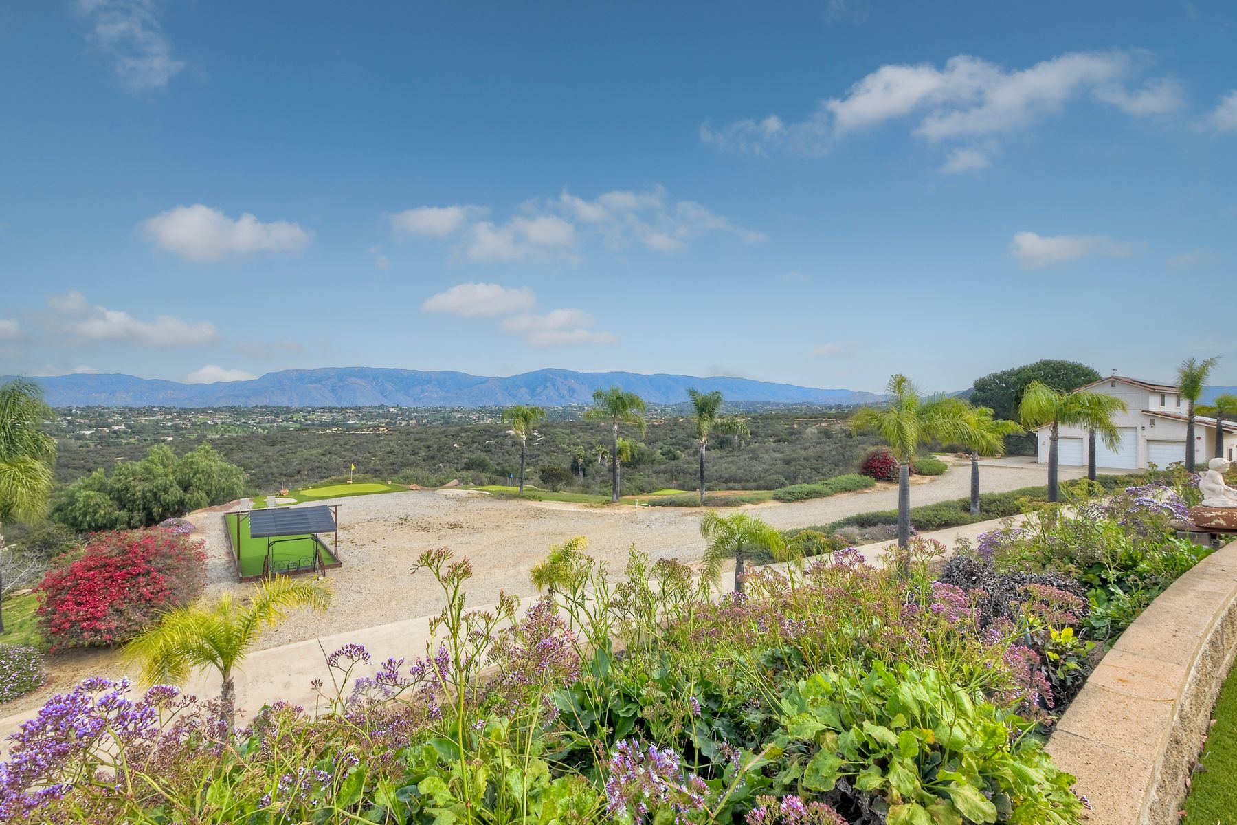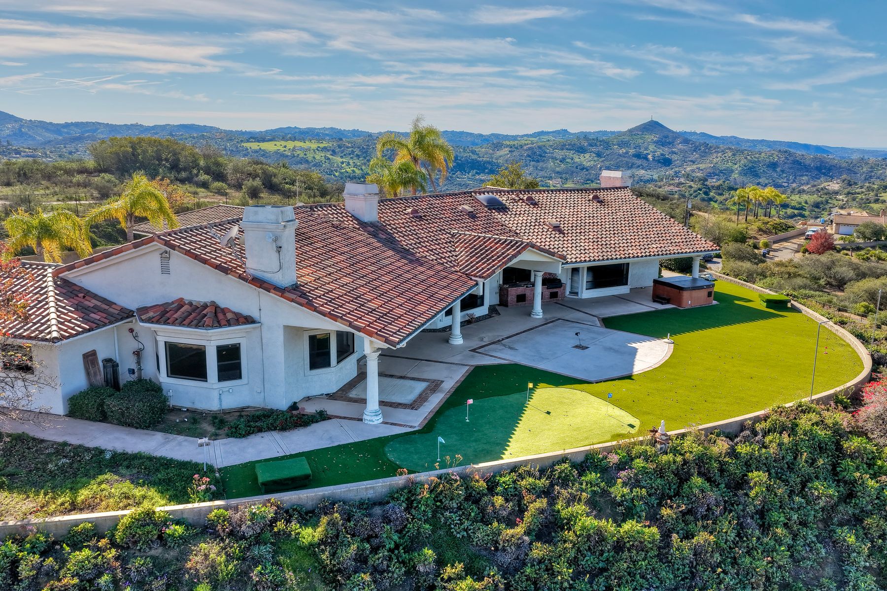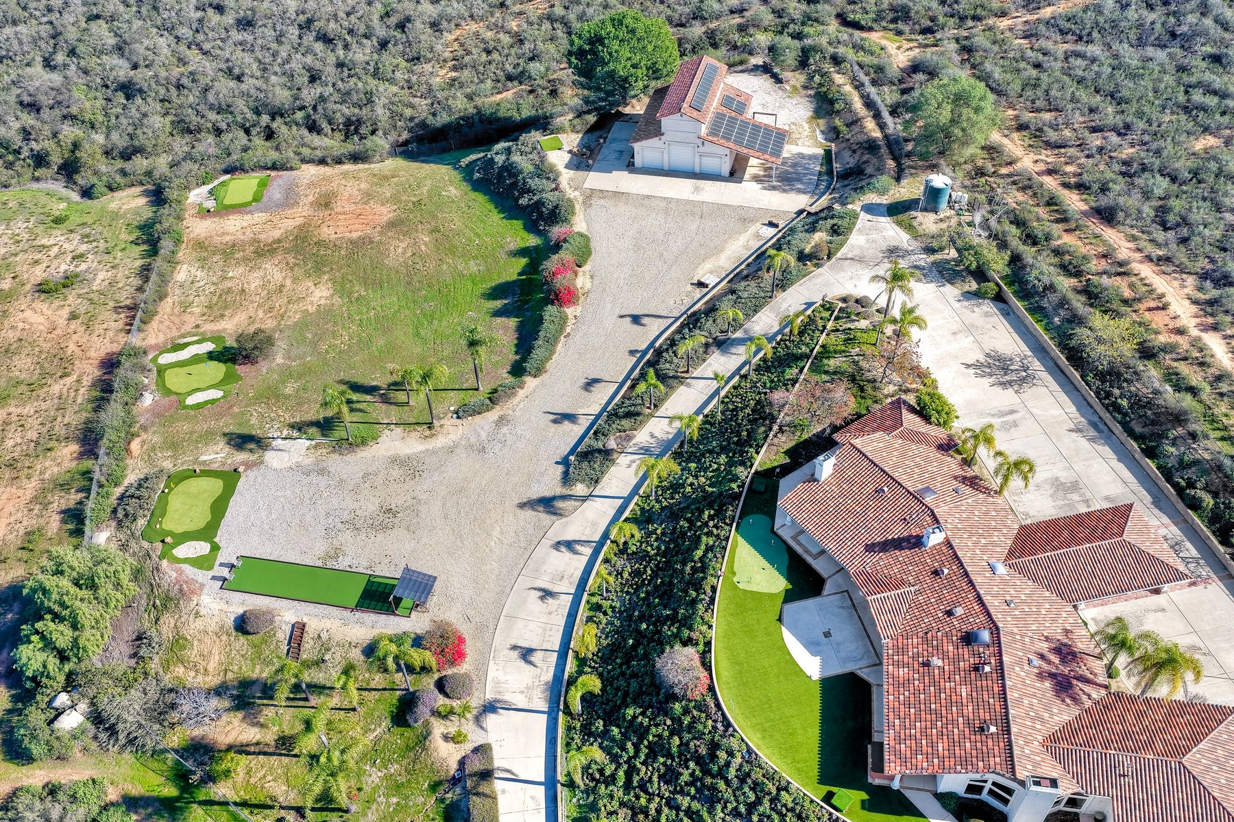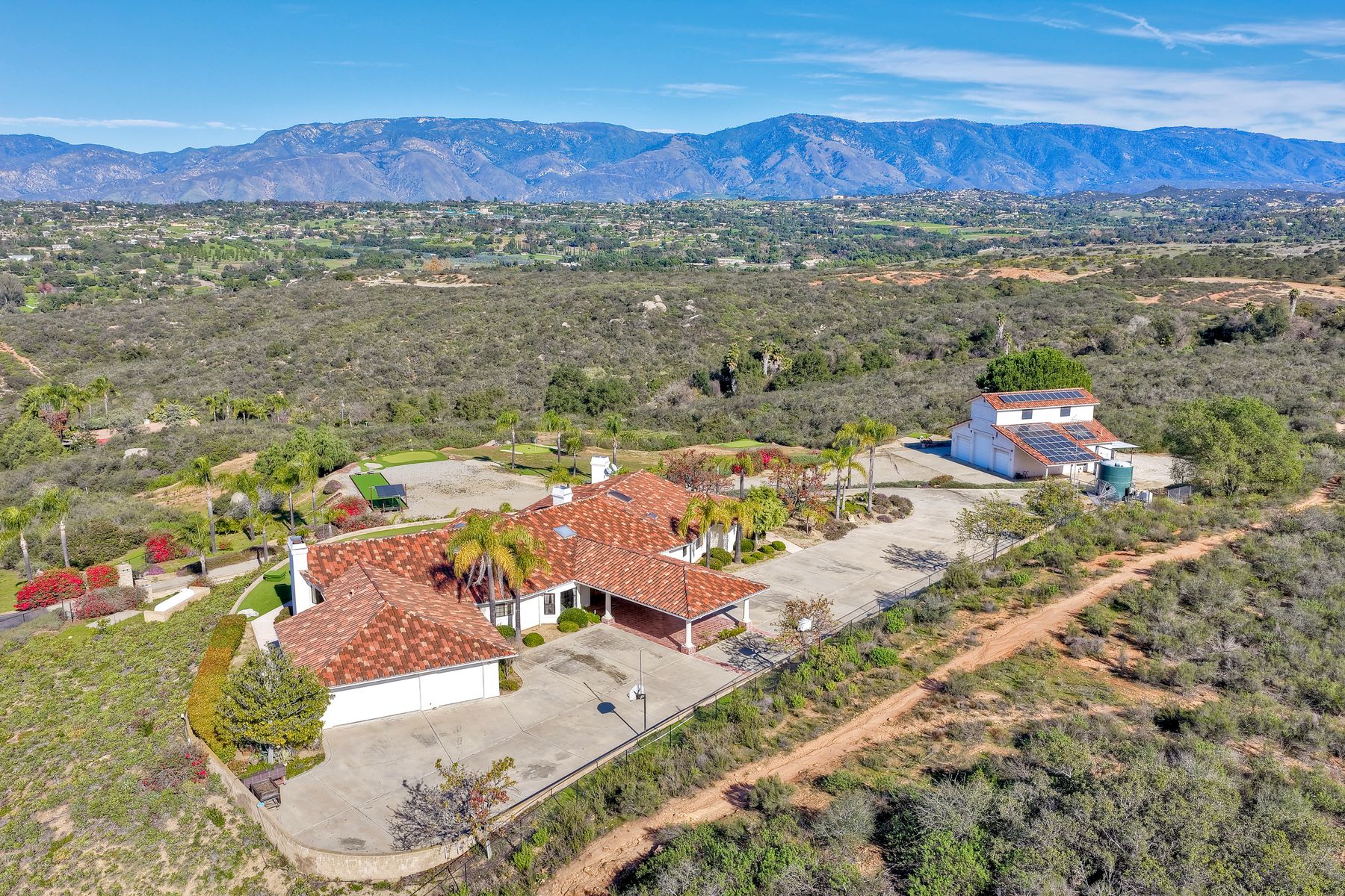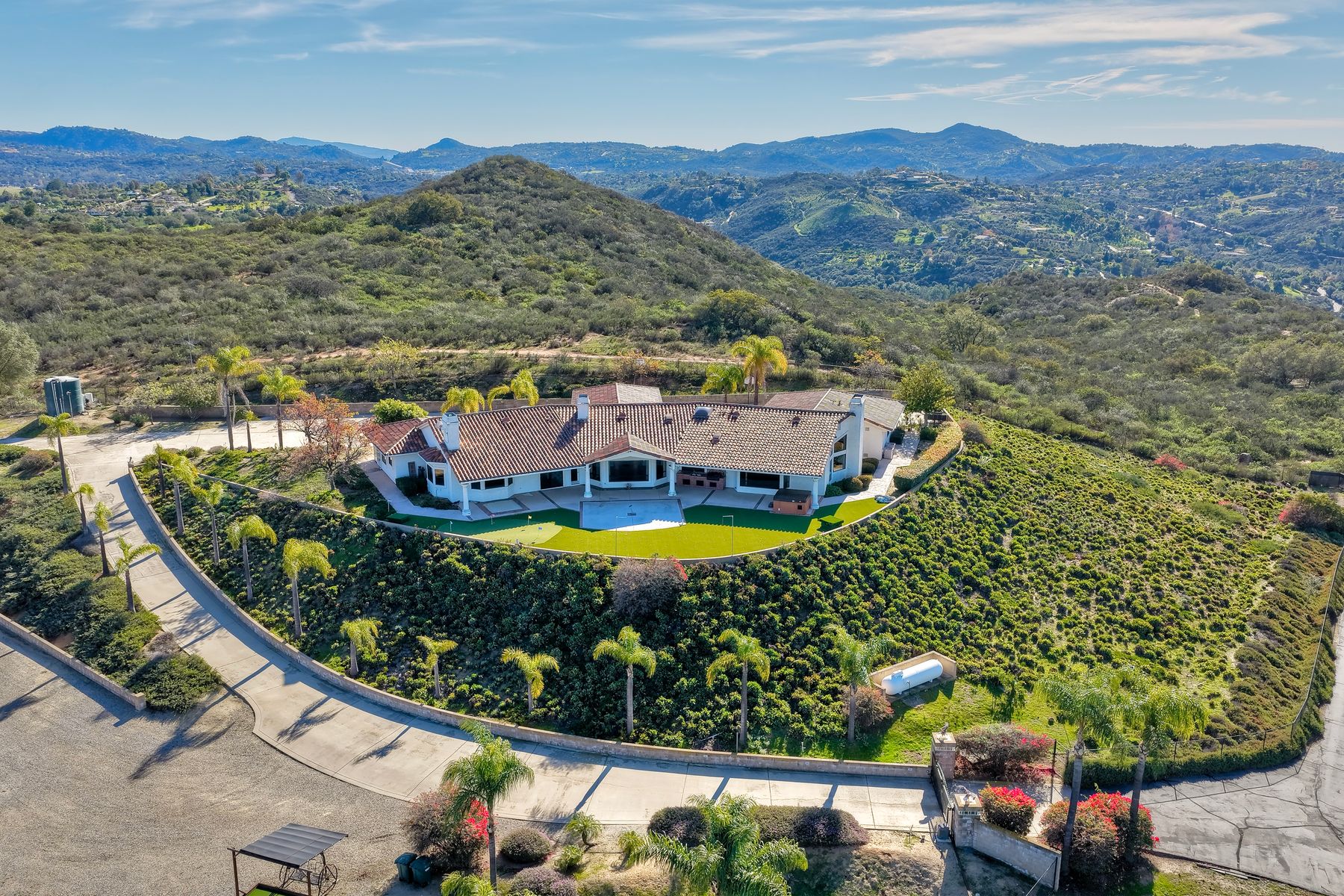 Custom single story Mediterranean estate perched atop your entire neighborhood with forever views! Do you prefer to awe in the beauty of Catalina Island pushing out from the Pacific, snowcapped mountains, or Palomar Mtn, as they're all options. Highly remodeled chef's kitchen with Viking/SubZero opens up to the great room with westerly view. Massive primary bedroom suite, and both secondary bedrooms have en-suite bathrooms. In addition to the powder room, there's a 4th full bathroom with a sauna and access to the outside for when entertaining. Impressive bar just like your favorite pub, and pool table conveys. Below the home, you'll find a 3 stall "barn" that can house a 45' RV in the center, and storage in attic is approx 1000 sqft. Aside the barn, there is a hydraulic car lift. Further below the property, you'll love the 3 golf holes.... bunkers & all....with 3 areas to tee off from, a putting green, as well as horseshoe pits & a bocce ball court. 50+ solar panels are owned/PIF. Lot is 4.04 acres, but below there's another parcel of 1.28 acres is INCLUDED with the sale! Space to grow a small vineyard or organic mini farm, or whatever your heart desires.