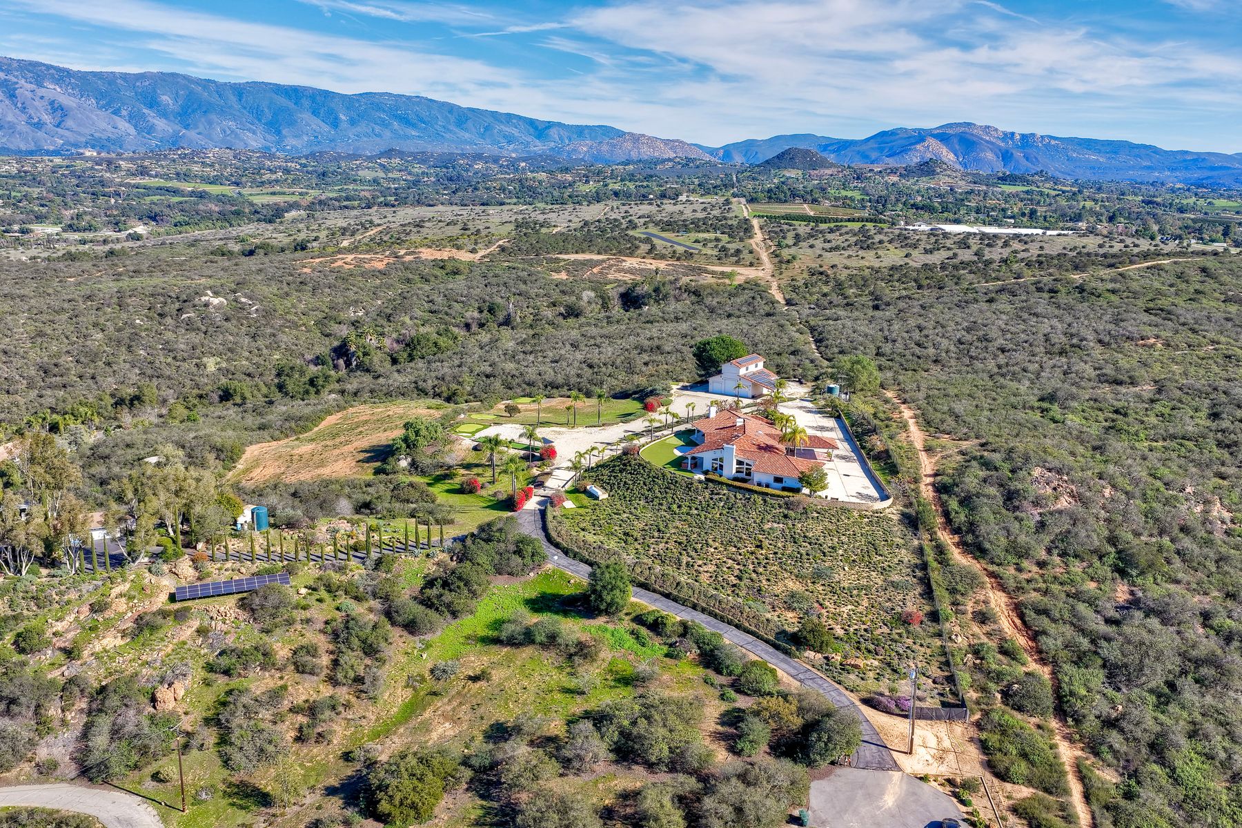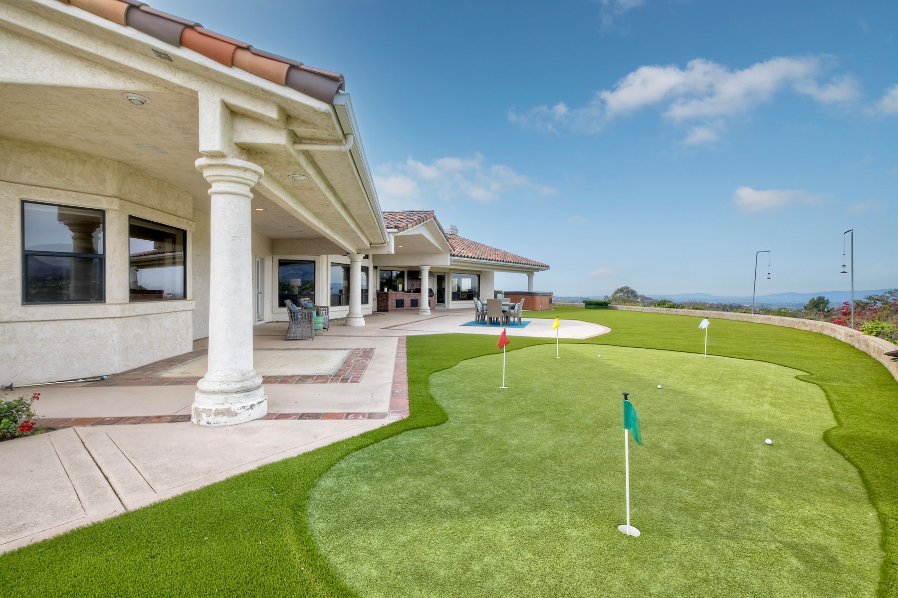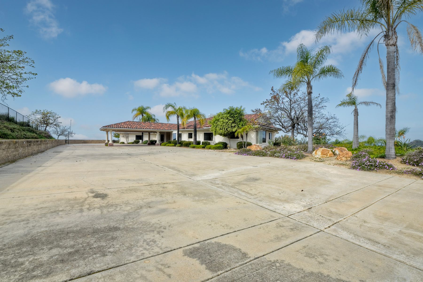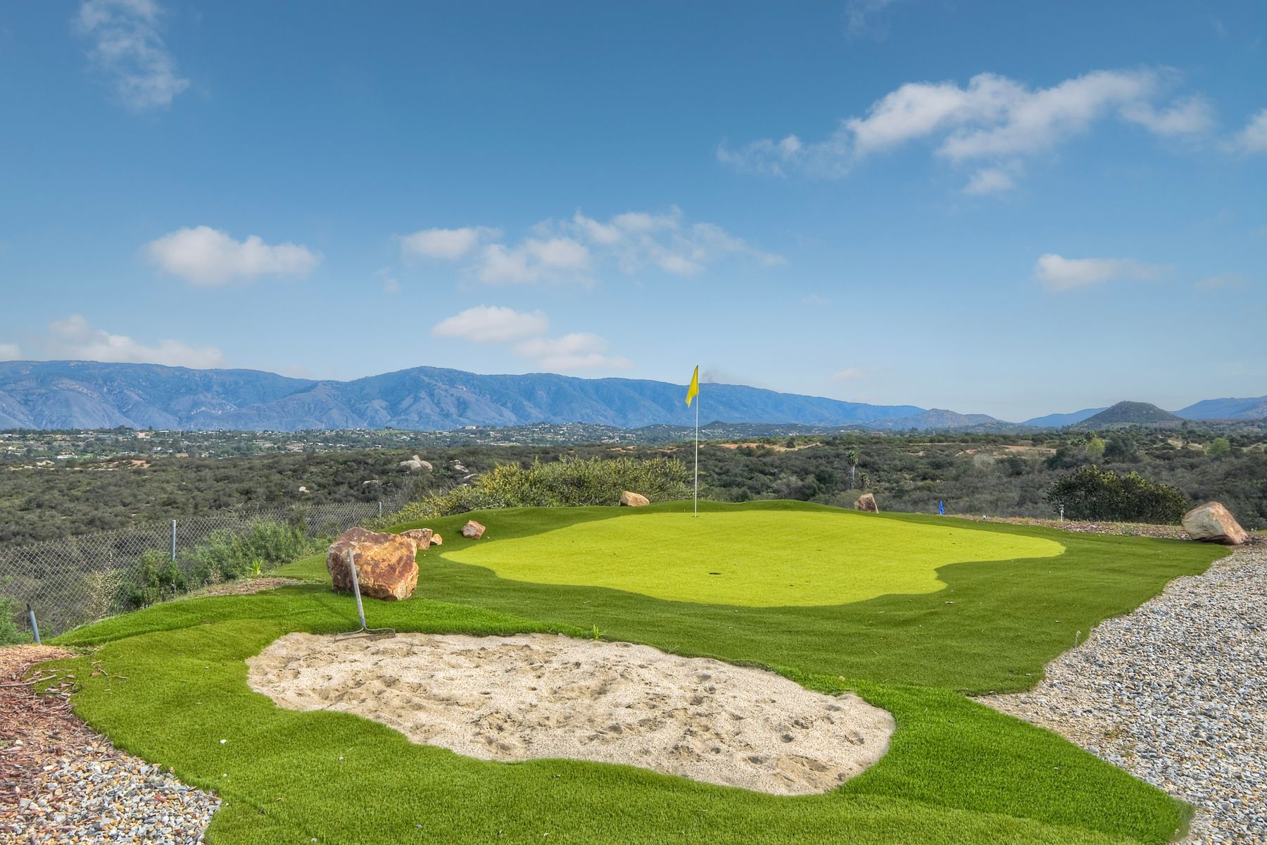 Custom single story Mediterranean estate perched atop your entire neighborhood with forever views! Do you prefer to awe in the beauty of Catalina Island pushing out from the Pacific, snowcapped mountains, or Palomar Mtn, as they're all options. Highly remodeled chef's kitchen with Viking/SubZero opens up to the great room with westerly view. Massive primary bedroom suite, and both secondary bedrooms have en-suite bathrooms. In addition to the powder room, there's a 4th full bathroom with a sauna and access to the outside for when entertaining. Impressive bar just like your favorite pub, and pool table conveys. Below the home, you'll find a 3 stall "barn" that can house a 45' RV in the center, and storage in attic is approx 1000 sqft. Aside the barn, there is a hydraulic car lift. Further below the property, you'll love the 3 golf holes.... bunkers & all....with 3 areas to tee off from, a putting green, as well as horseshoe pits & a bocce ball court. 50+ solar panels are owned/PIF. Lot is 4.04 acres, but below there's another parcel of 1.28 acres is INCLUDED with the sale! Space to grow a small vineyard or organic mini farm, or whatever your heart desires.