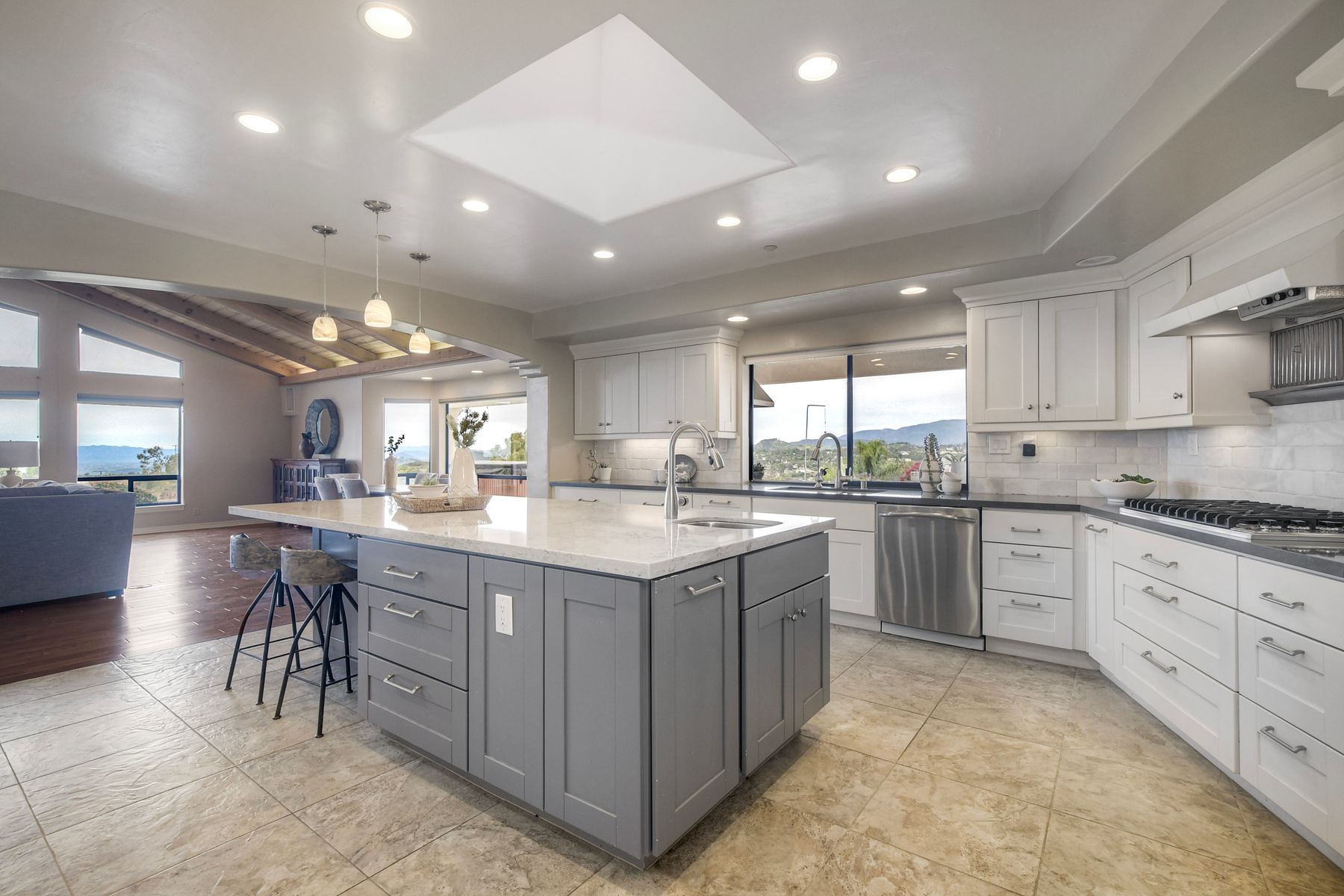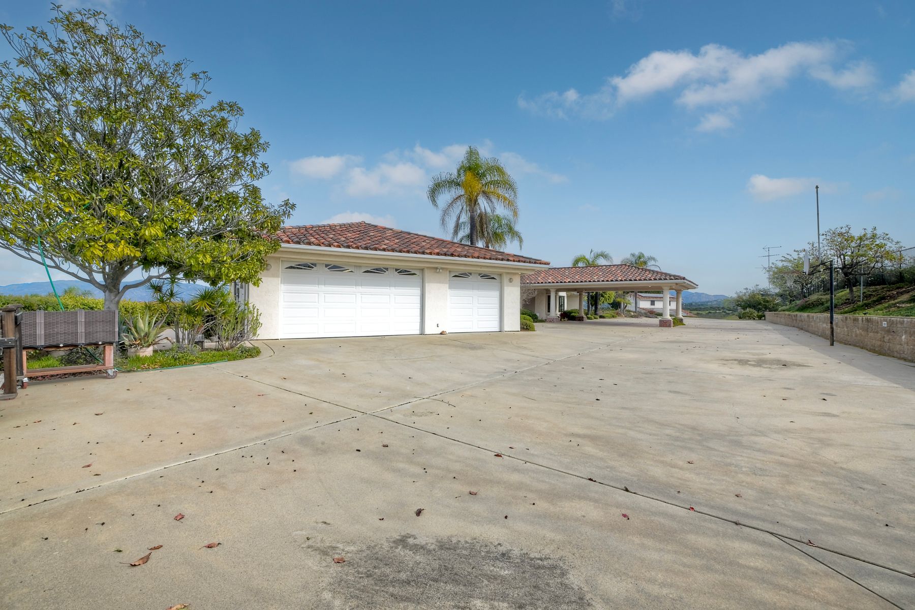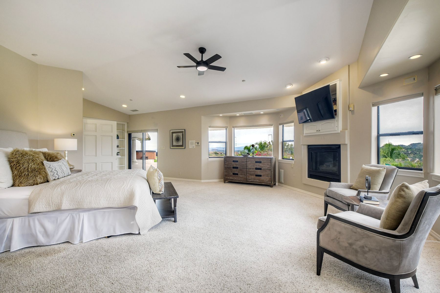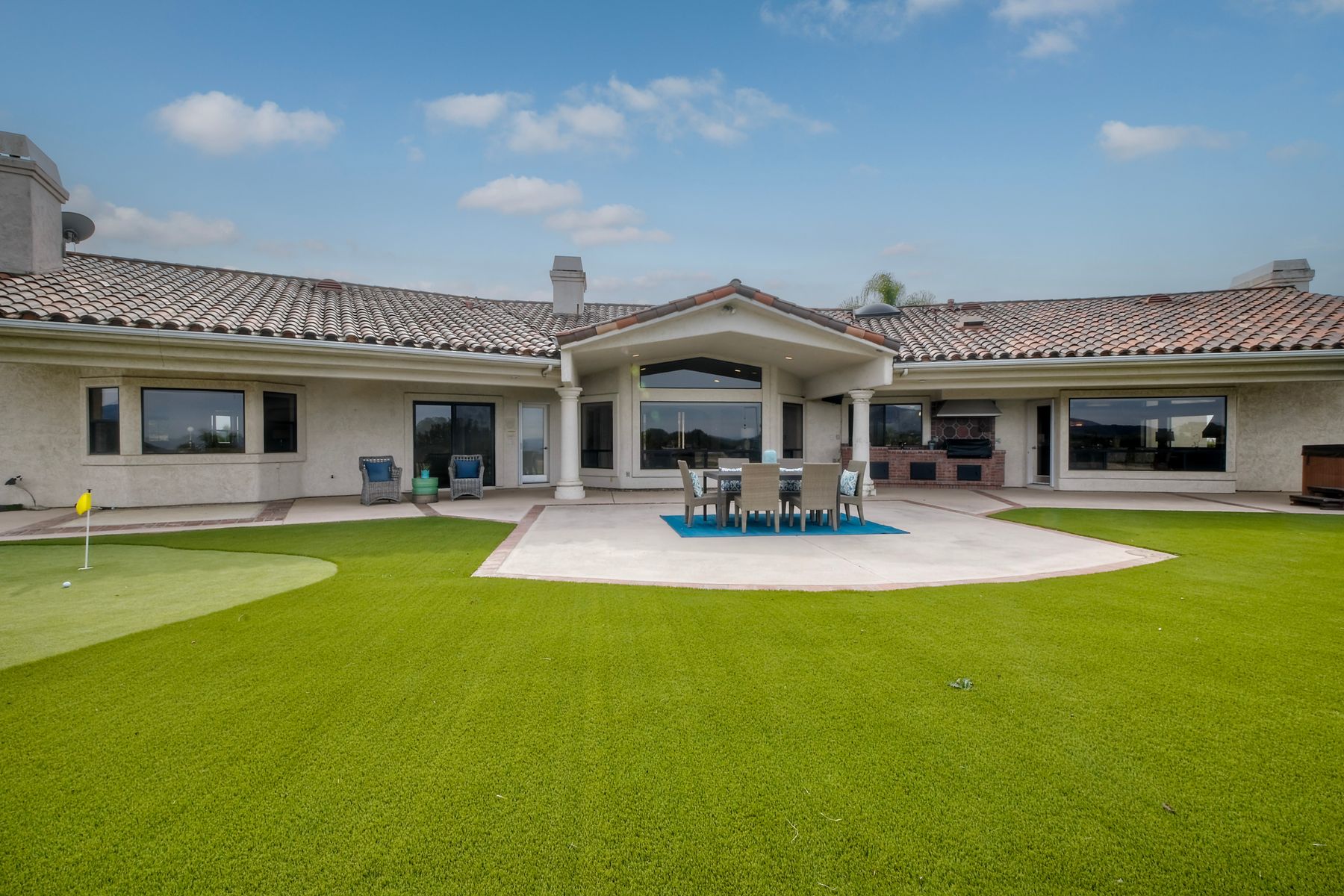 Custom single story Mediterranean estate perched atop your entire neighborhood with forever views! Do you prefer to awe in the beauty of Catalina Island pushing out from the Pacific, snowcapped mountains, or Palomar Mtn, as they're all options. Highly remodeled chef's kitchen with Viking/SubZero opens up to the great room with westerly view. Massive primary bedroom suite, and both secondary bedrooms have en-suite bathrooms. In addition to the powder room, there's a 4th full bathroom with a sauna and access to the outside for when entertaining. Impressive bar just like your favorite pub, and pool table conveys. Below the home, you'll find a 3 stall "barn" that can house a 45' RV in the center, and storage in attic is approx 1000 sqft. Aside the barn, there is a hydraulic car lift. Further below the property, you'll love the 3 golf holes.... bunkers & all....with 3 areas to tee off from, a putting green, as well as horseshoe pits & a bocce ball court. 50+ solar panels are owned/PIF. Lot is 4.04 acres, but below there's another parcel of 1.28 acres is INCLUDED with the sale! Space to grow a small vineyard or organic mini farm, or whatever your heart desires.