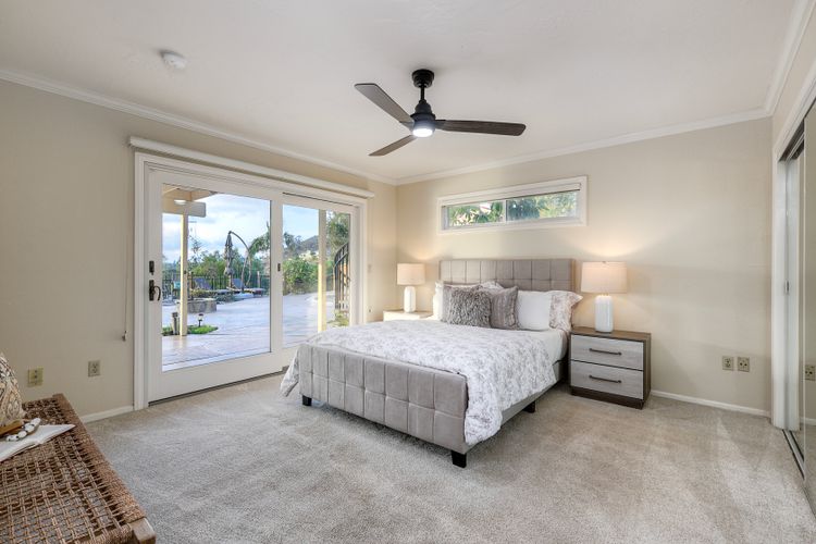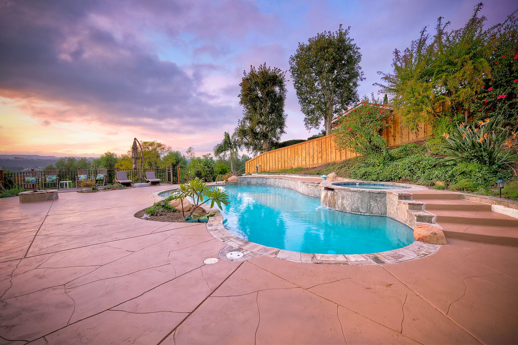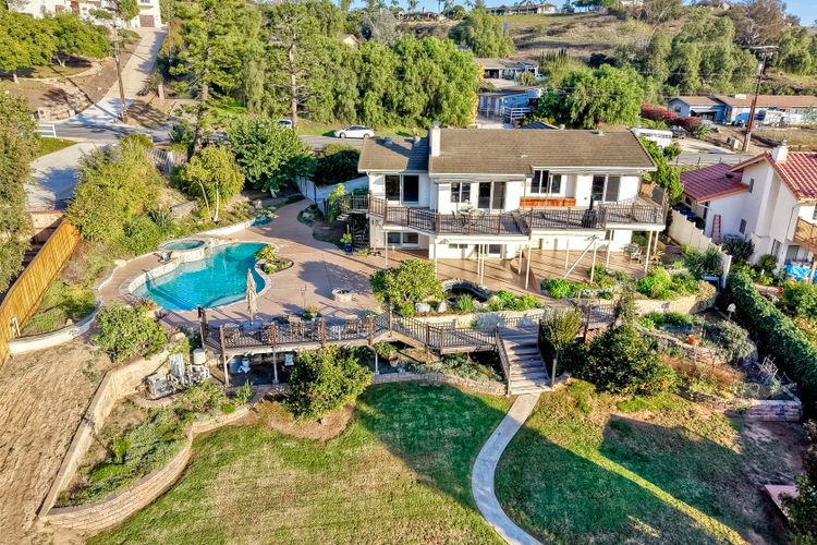 Quintessential Poway Living - the home in the City in the Country. Custom-built-home features everything Poway offers - updated, sizeable living spaces oriented to incredible expansive views plus a half acre of land, fruit trees, gardens, Horse trails are right in front of the home and the farmers market and Old Poway are walkable. Most rooms are oriented to the westerly views. The saltwater pool and spa were just resurfaced, and the rear patio was resurfaced as well. The massive wrap-around upper deck is if Ipe wood - incredibly hard, durable and fire resistant. Inside you'll enter to see dynamic views to the sunset, canyons, city lights and distant mountains. Find a custom designed gourmet kitchen with SubZero refrigerator, a 6-burner gas range, stainless steel sink and oven, granite countertops and custom cherry cabinetry. Breakfast bar, buffet and breakfast nook with a view. Upstairs features an office or bedroom with deck access and a full bath, living room and dining. The family room features a gas fireplace, built-ins and the primary suite is on the lower level with walk-out access to the pool and patio and a view of the cute pond. Don't miss the "speakeasy" wine room that includes vast storage, room for a wine fridge and a bar sink. Laundry room and other bedrooms are also on the walkout level. See supplement.... there's so much more! On a half-acre lot, there's room for kids to play, for gardens, for livestock for games. Lots of room to entertain and to soak in all of nature's gifts. Mature citrus trees are producing tangerines and oranges. A shed holds all the gardening tools you'll need. This home was lovingly updated and maintained and is ready for owners who will enjoy all of the land and home. High quality Milgard windows and sliders, custom Craftsman-style front door and exterior lighting. Custom cabinetry and builtins, mortared tile counters in bathrooms and in the massive primary shower. Lighted entry closet, extra pantry storage, cook's desk. So many thoughtful details and fine finishes throughout this unique and beautiful home! It's a must see! Welcome to Poway!