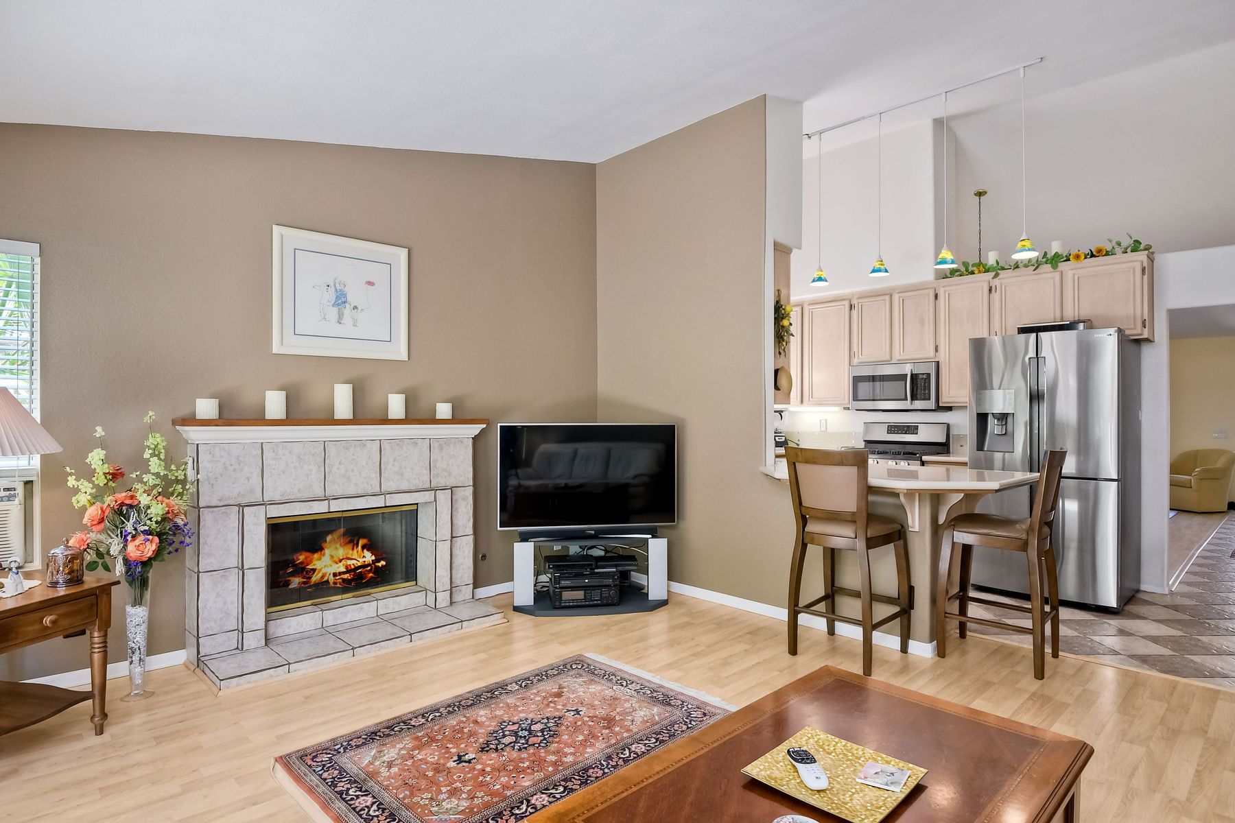This fabulous home is bright, open & spacious with vaulted ceilings & high windows that let the light flow in. The family room opens to the remodeled kitchen w/quartz counters & has a welcoming cozy tiled fireplace. View outside to the private tropical backyard. Remodeled 2nd bath, wood laminate flooring & tile accents abound in this pride of ownership home. The master bedroom is a retreat & includes a large walk in closet. This home has been lovingly maintained & will be a joy for the the new owners. Pride of ownership abounds in this lovely upgraded Rancho Del Oro single level home located on a cul-de-sac! Recently remodeled kitchen featuring Samsung Stainless Steel appliances, gorgeous quartz counters with extra breakfast bar & pendant lights! Wood Laminate Flooring spans the majority of the home with custom tile accents on the floor in the main walkway, baths and cozy fireplace. Bathroom remodeled w/new marble topped vanity & more! Master bath has new shower door & rain shower head. Backyard is a tropical paradise with swaying palms, beautiful roses and giant pine trees. Three family fruit as well! Close to schools, the YMCA and parks.. Neighborhoods: Rancho Del Oro - Village II Equipment: Garage Door Opener, Range/Oven Other Fees: 0 Sewer: Sewer Connected Topography: LL,SSLP