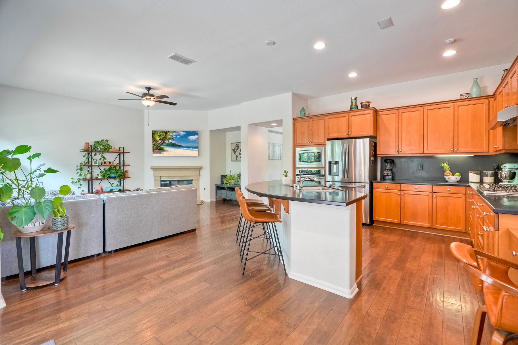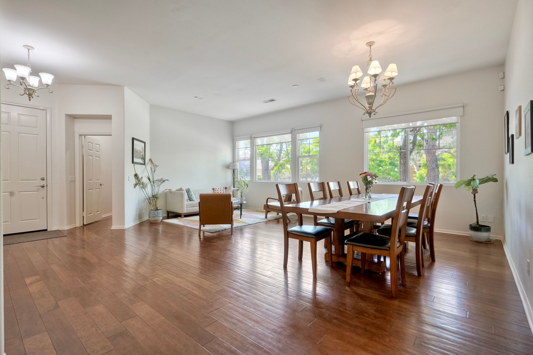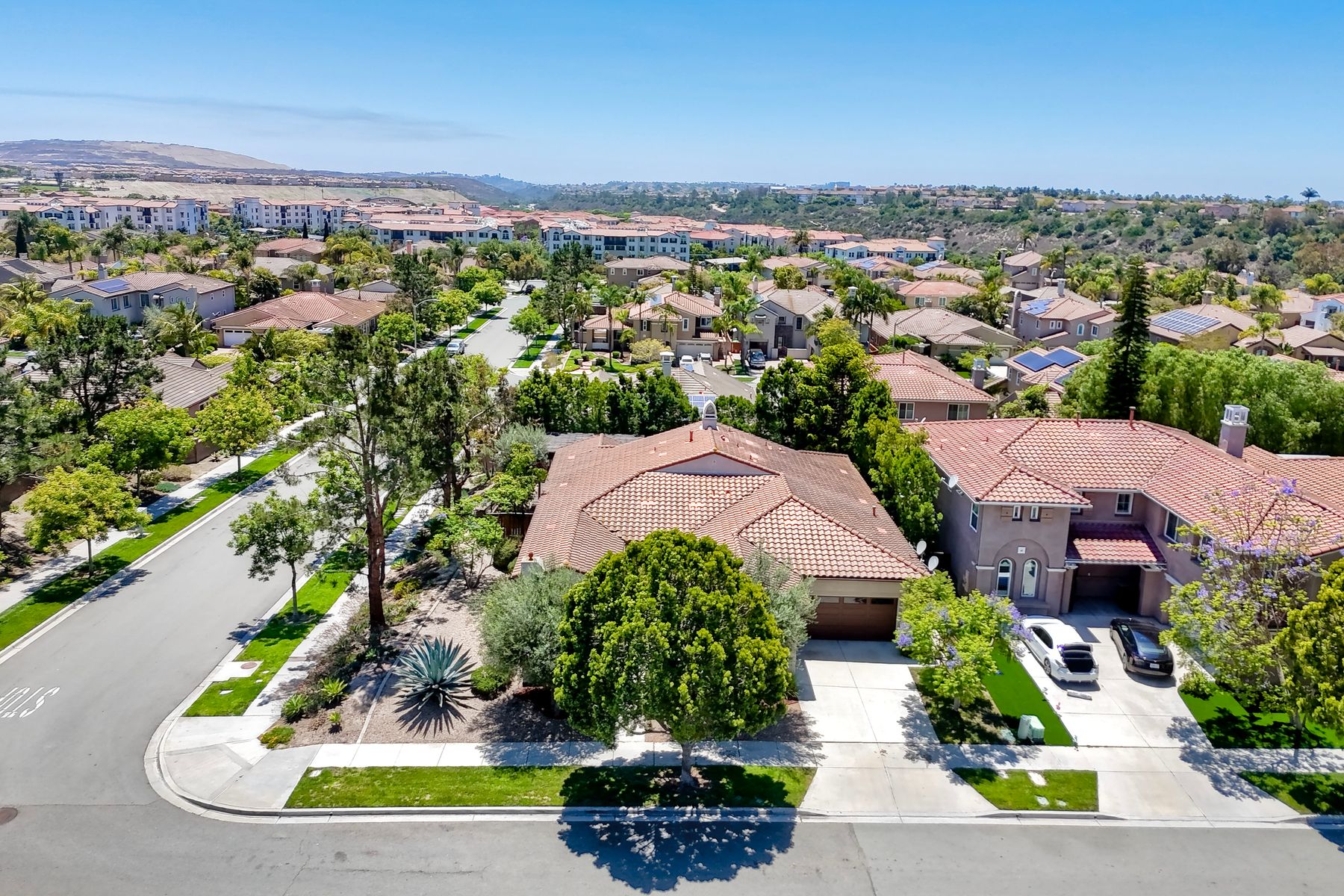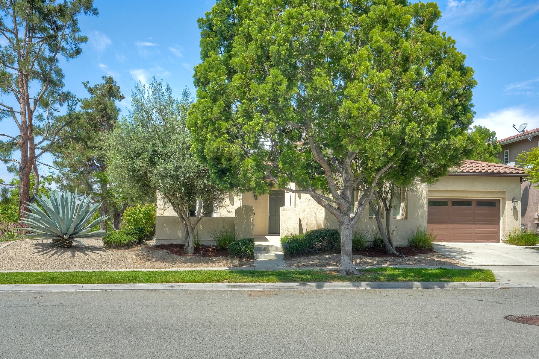 Welcome to this rarely available single-level hacienda-style home, ideally situated on a premium corner lot in the prestigious McMillin Lomas Verdes. Offering 4 generously sized bedrooms and 3 full bathrooms across 2,717 square feet, this residence blends timeless elegance with modern comfort. The inviting entryway—framed by striking agave plants—leads to a charming courtyard-style patio with French doors opening to a versatile secondary room, ideal for guests or a home office. With an open floor plan with soaring ceilings and abundant natural light throughout. Formal living and dining areas, along with a cozy family room complete with fireplace, provide ideal spaces for both entertaining and everyday living. The home is adorned with high-end wood plank and natural stone flooring, creating a seamless and sophisticated aesthetic. The gourmet kitchen showcases premium stainless steel appliances, custom cabinetry, and elegant countertops. Retreat to the luxurious primary suite, featuring an oversized walk-in closet and a spa-inspired bathroom with a soaking tub and spacious walk-in shower. Three additional guest bedrooms offer comfort, privacy, and ample storage.