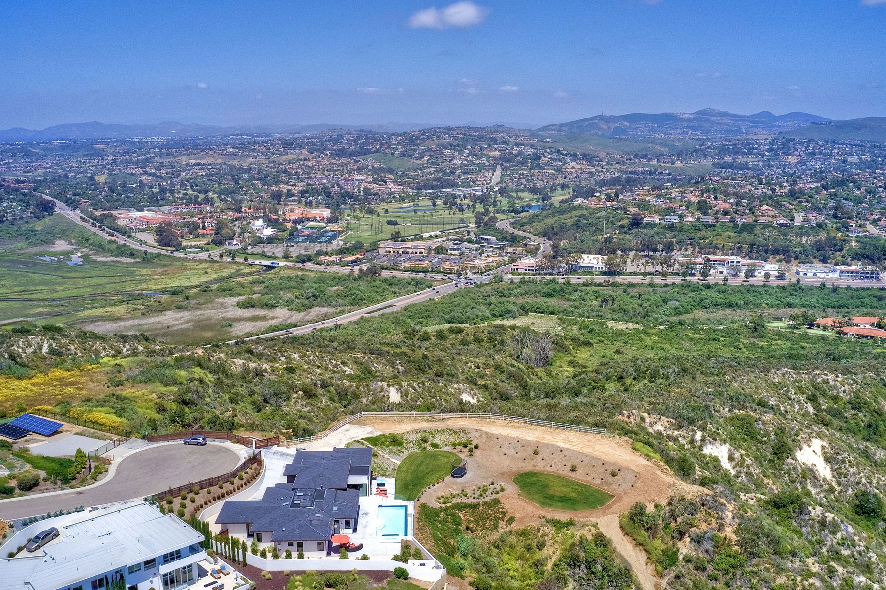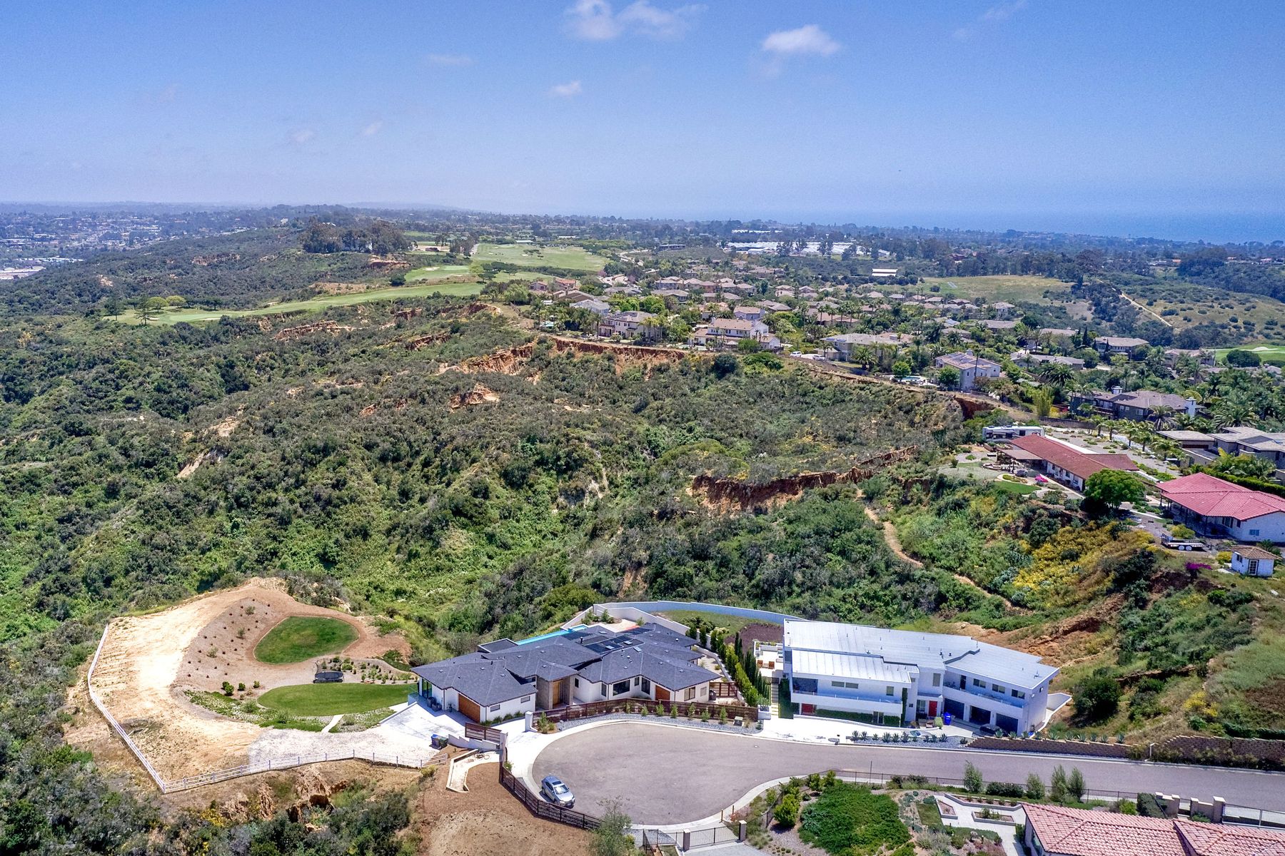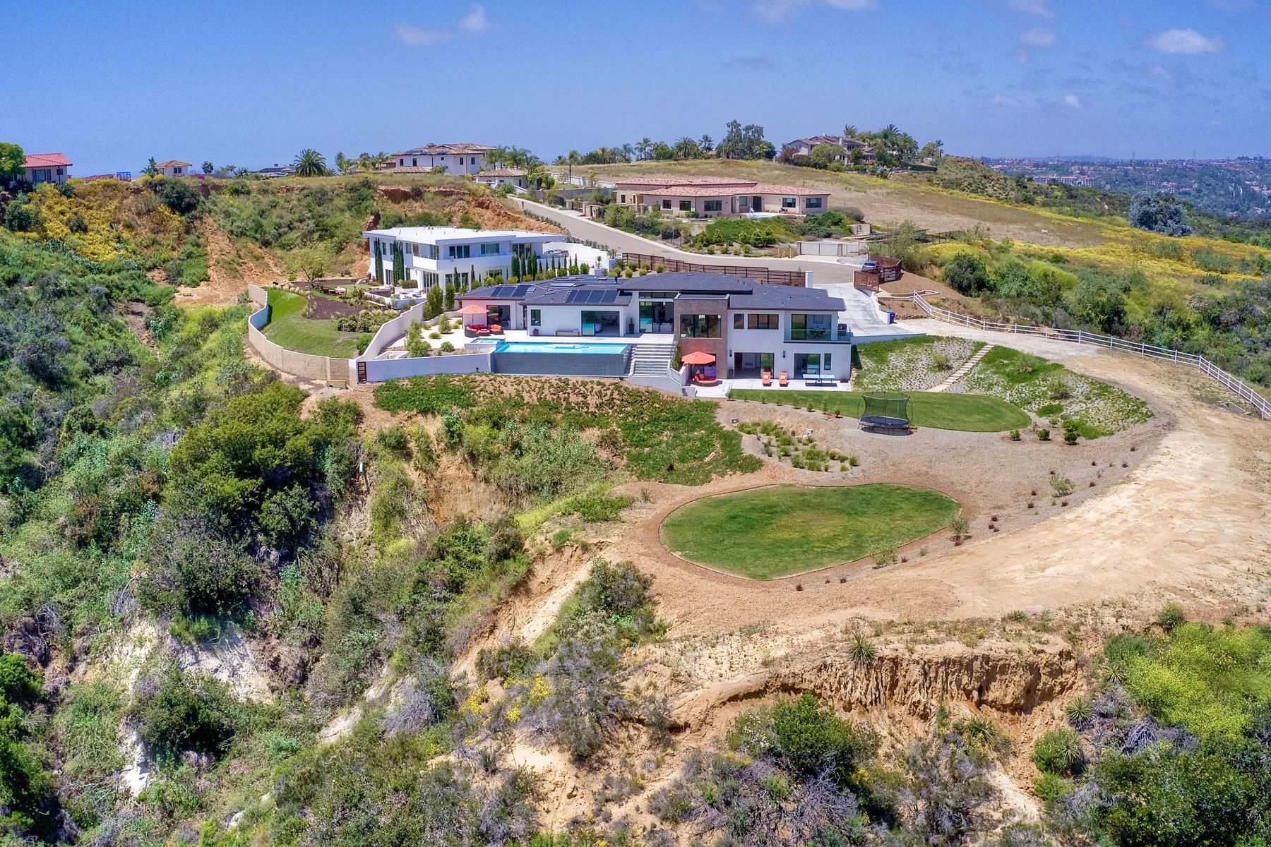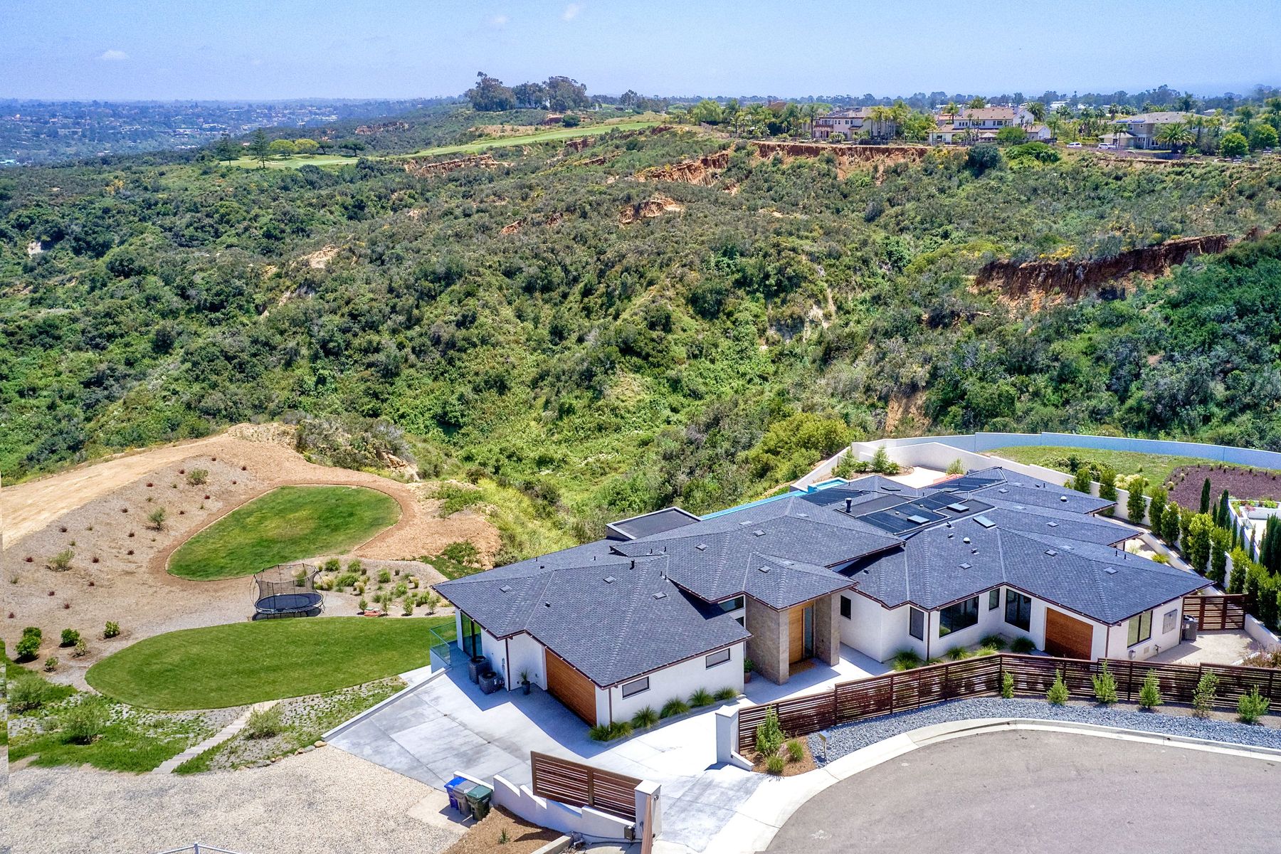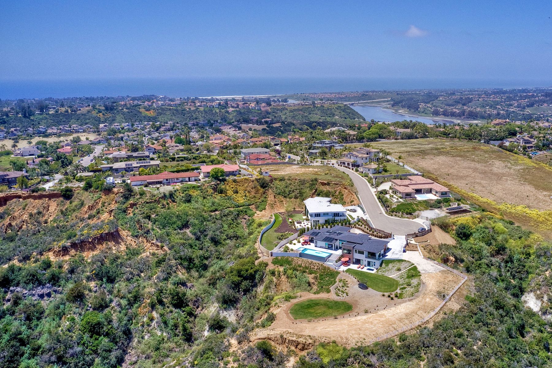 **** TOP OF THE HILL NEW MODERN HOME WITH COMPLETE PRIVACY*** Located on 6.39 acres with Panoramic canyon, mountain, golf course and city lights view in this "One of a Kind" newly constructed custom home! Best location in Encinitas with close proximity to beach, shopping, restaurants and Fwy. On a private street at the end of the cul-de-sac! Stunning modern design home with all main living rooms on one level with most rooms accessing the outside expansive patio and infinity pool! Video on YouTube!