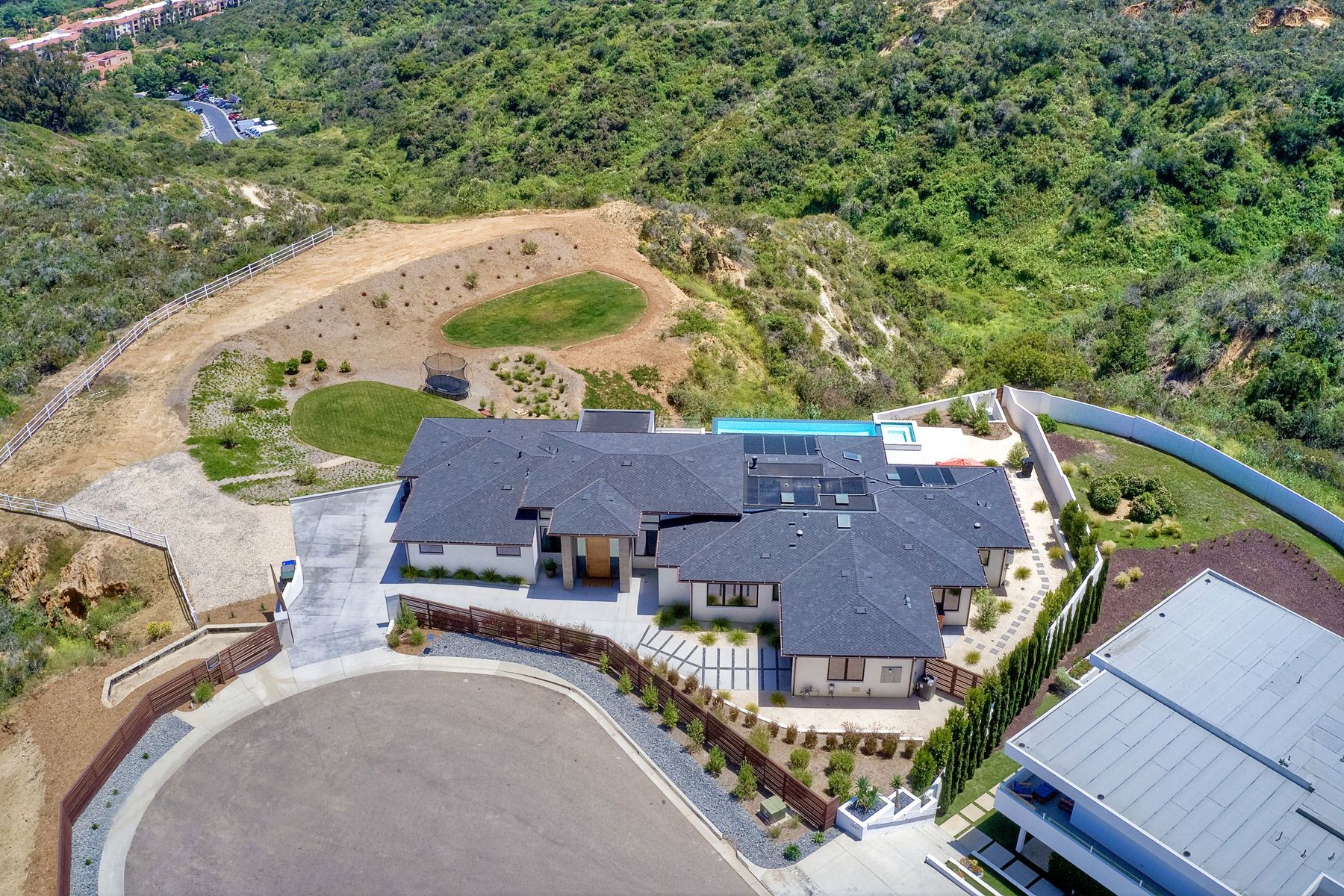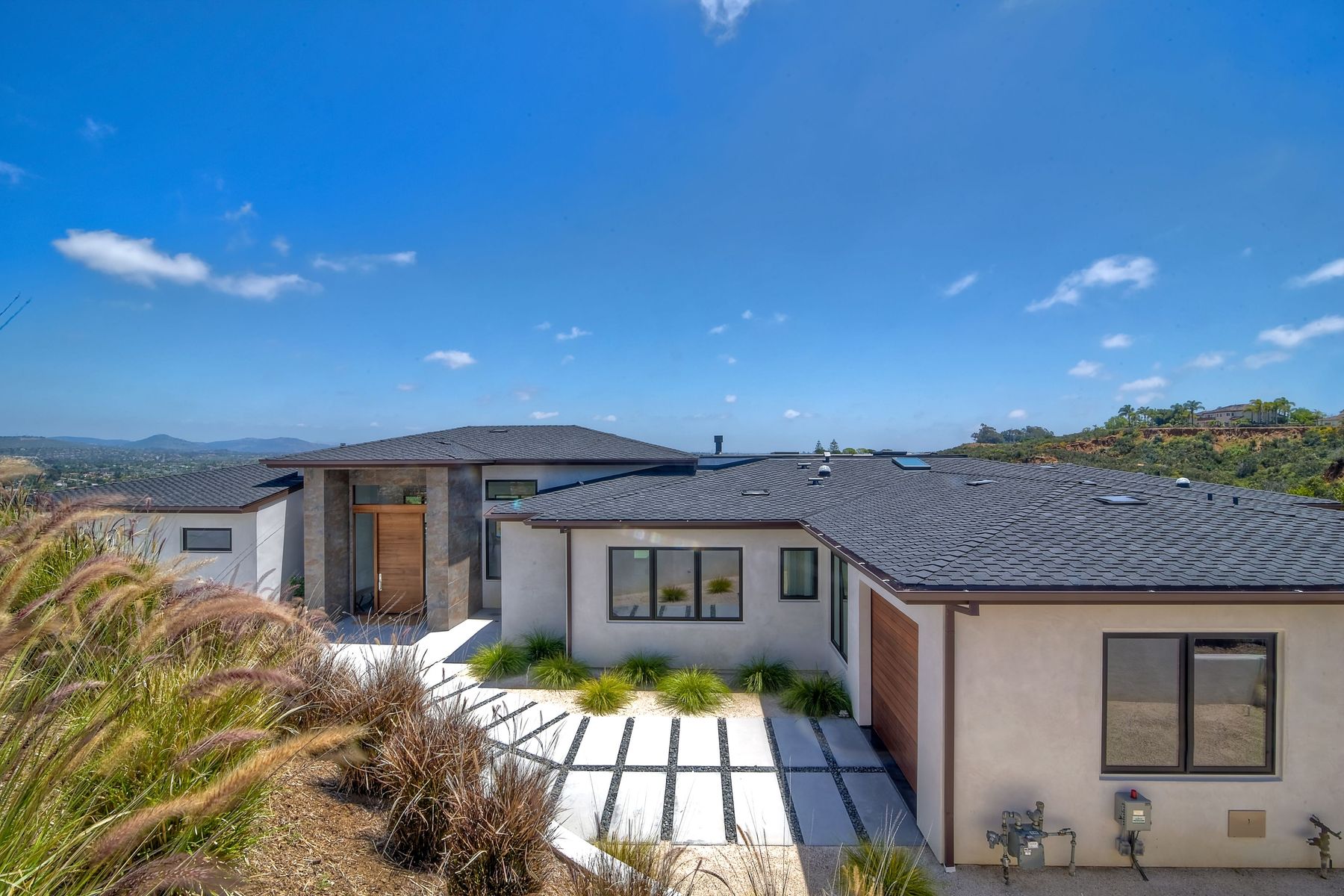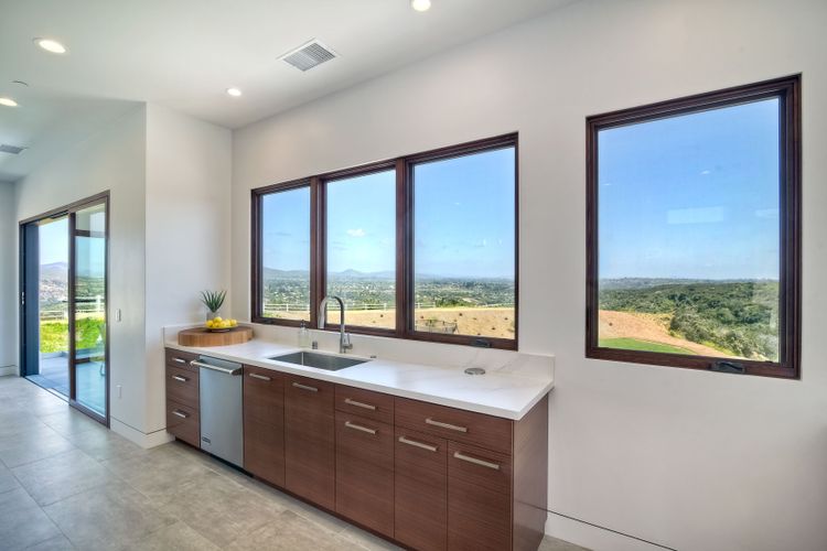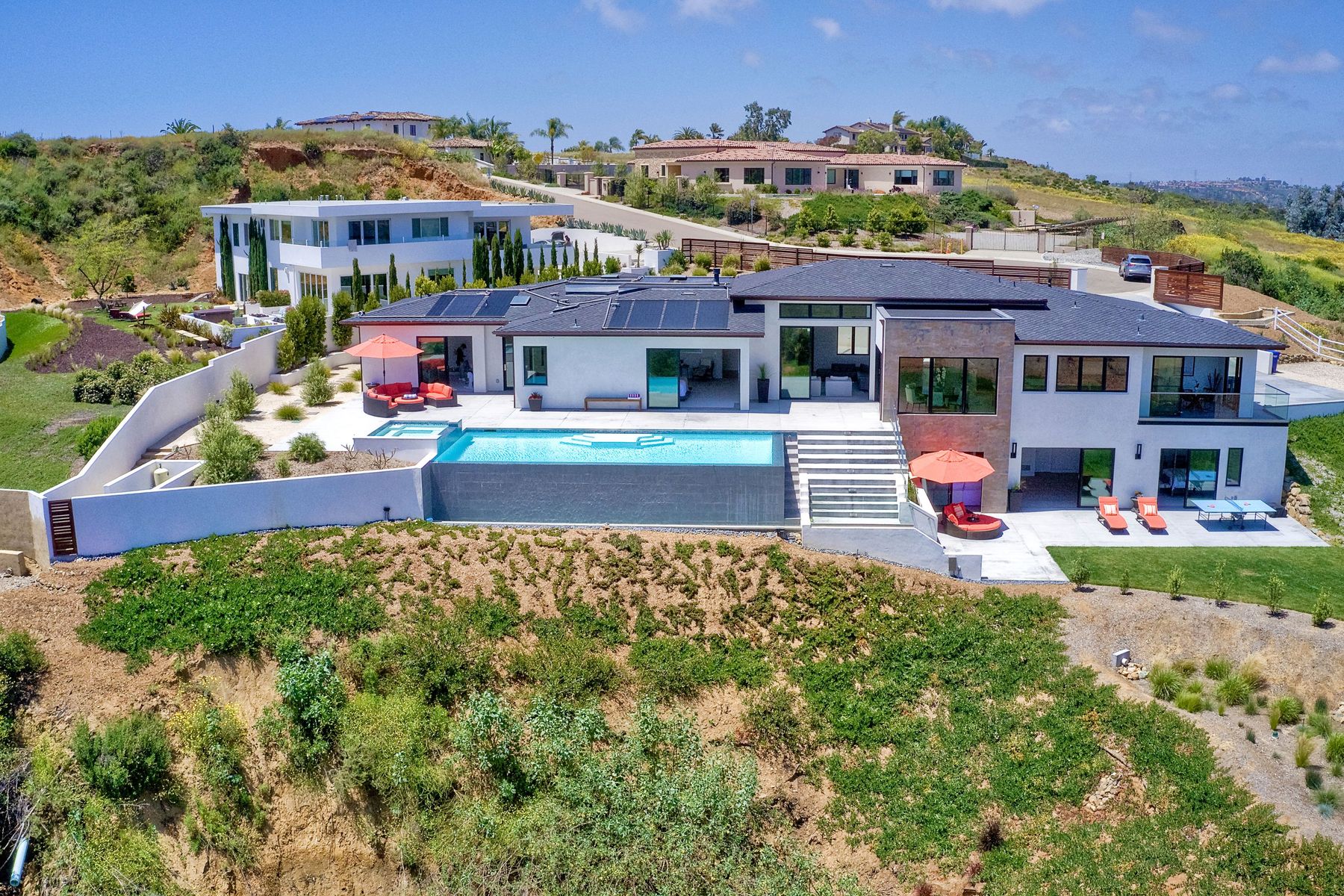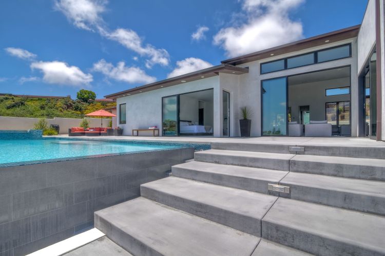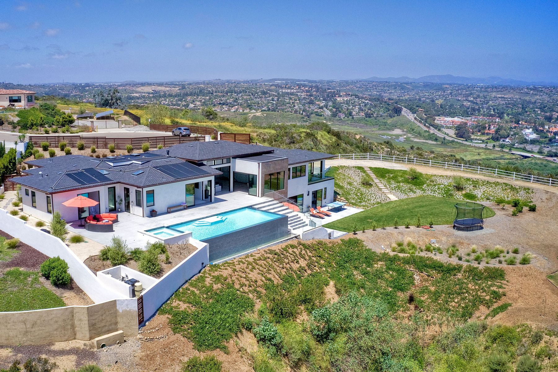 **** TOP OF THE HILL NEW MODERN HOME WITH COMPLETE PRIVACY*** Located on 6.39 acres with Panoramic canyon, mountain, golf course and city lights view in this "One of a Kind" newly constructed custom home! Best location in Encinitas with close proximity to beach, shopping, restaurants and Fwy. On a private street at the end of the cul-de-sac! Stunning modern design home with all main living rooms on one level with most rooms accessing the outside expansive patio and infinity pool! Video on YouTube!