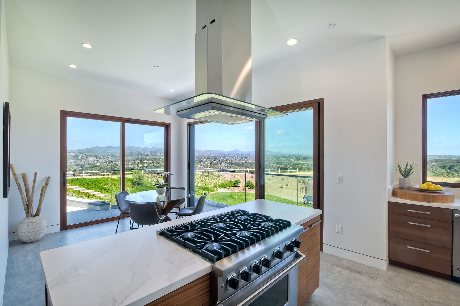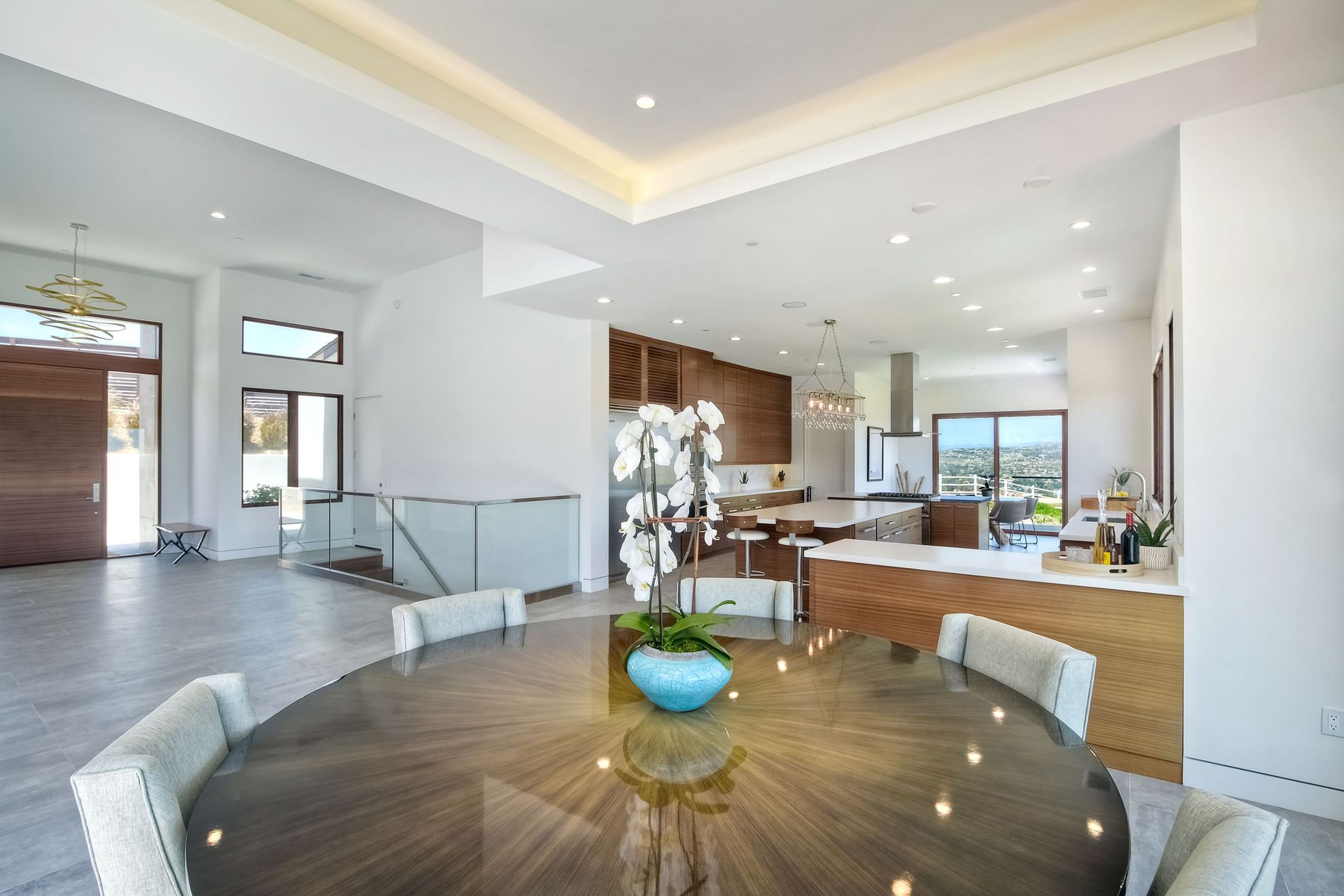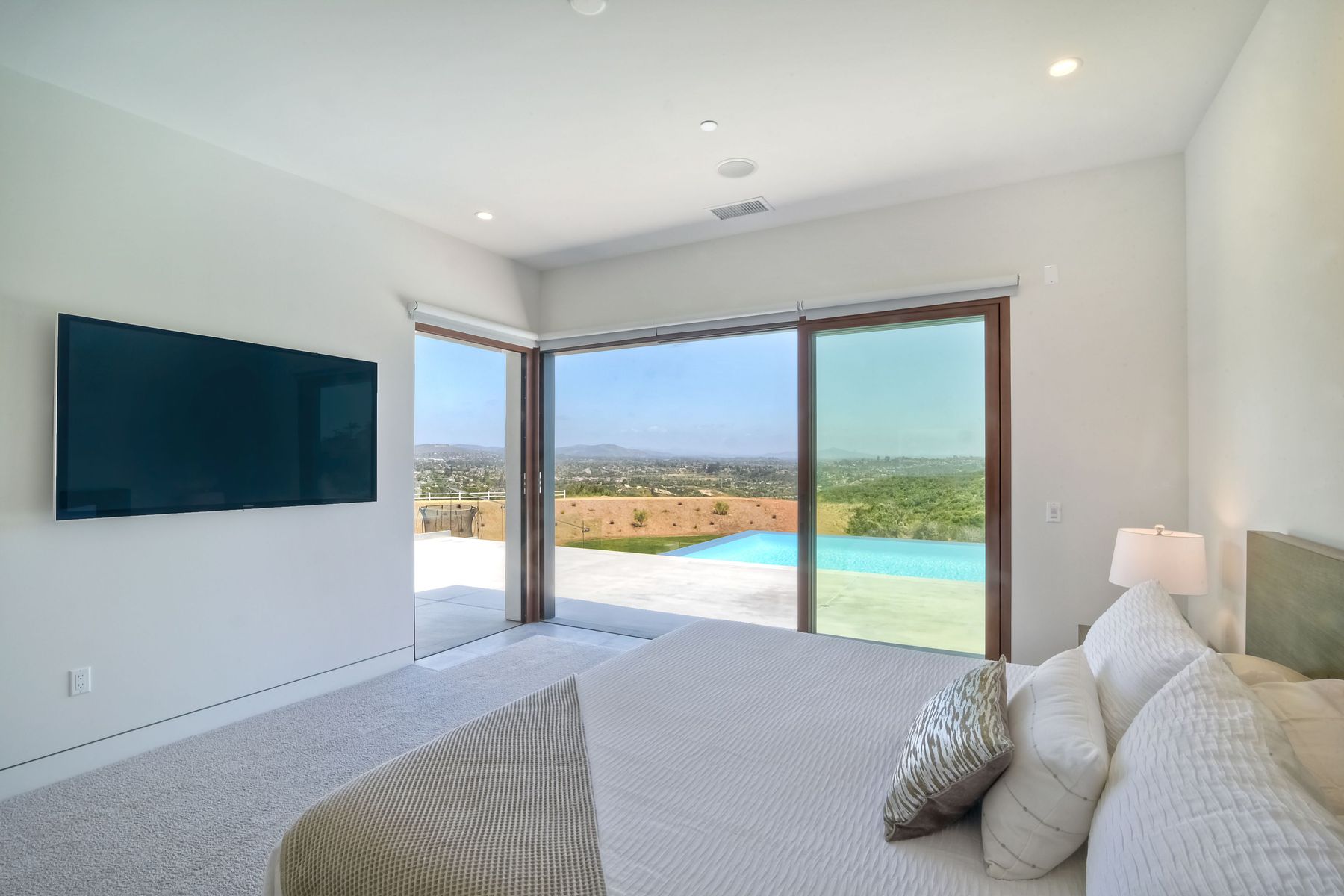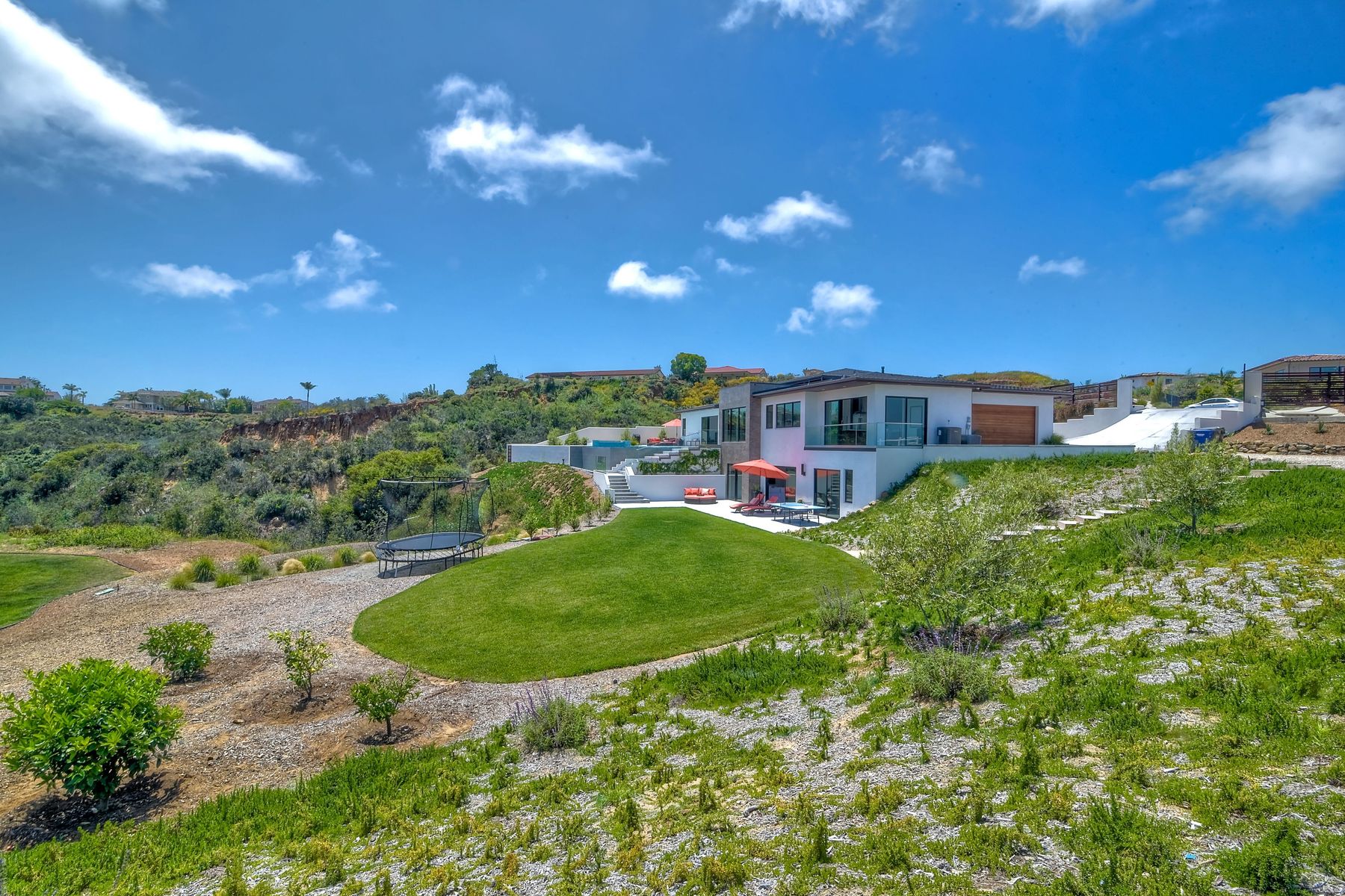 **** TOP OF THE HILL NEW MODERN HOME WITH COMPLETE PRIVACY*** Located on 6.39 acres with Panoramic canyon, mountain, golf course and city lights view in this "One of a Kind" newly constructed custom home! Best location in Encinitas with close proximity to beach, shopping, restaurants and Fwy. On a private street at the end of the cul-de-sac! Stunning modern design home with all main living rooms on one level with most rooms accessing the outside expansive patio and infinity pool! Video on YouTube!