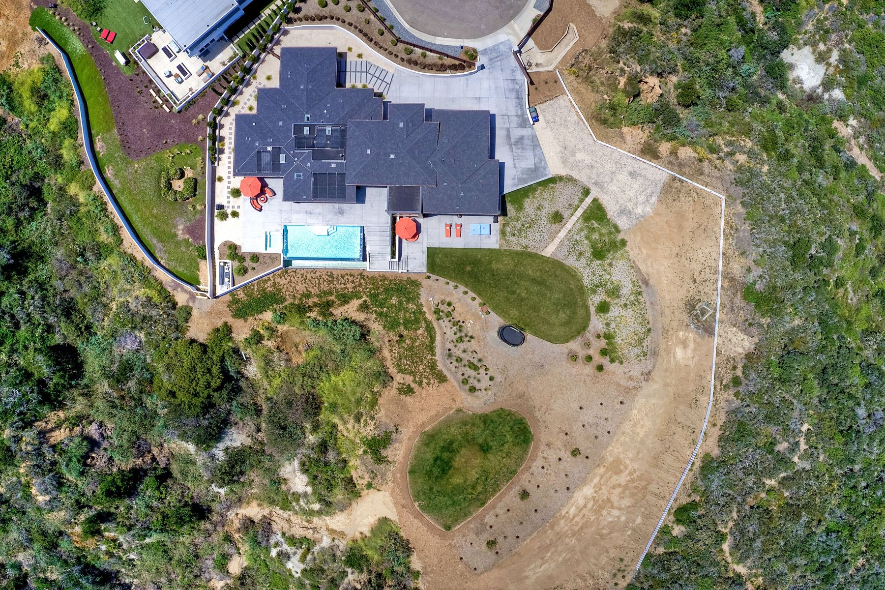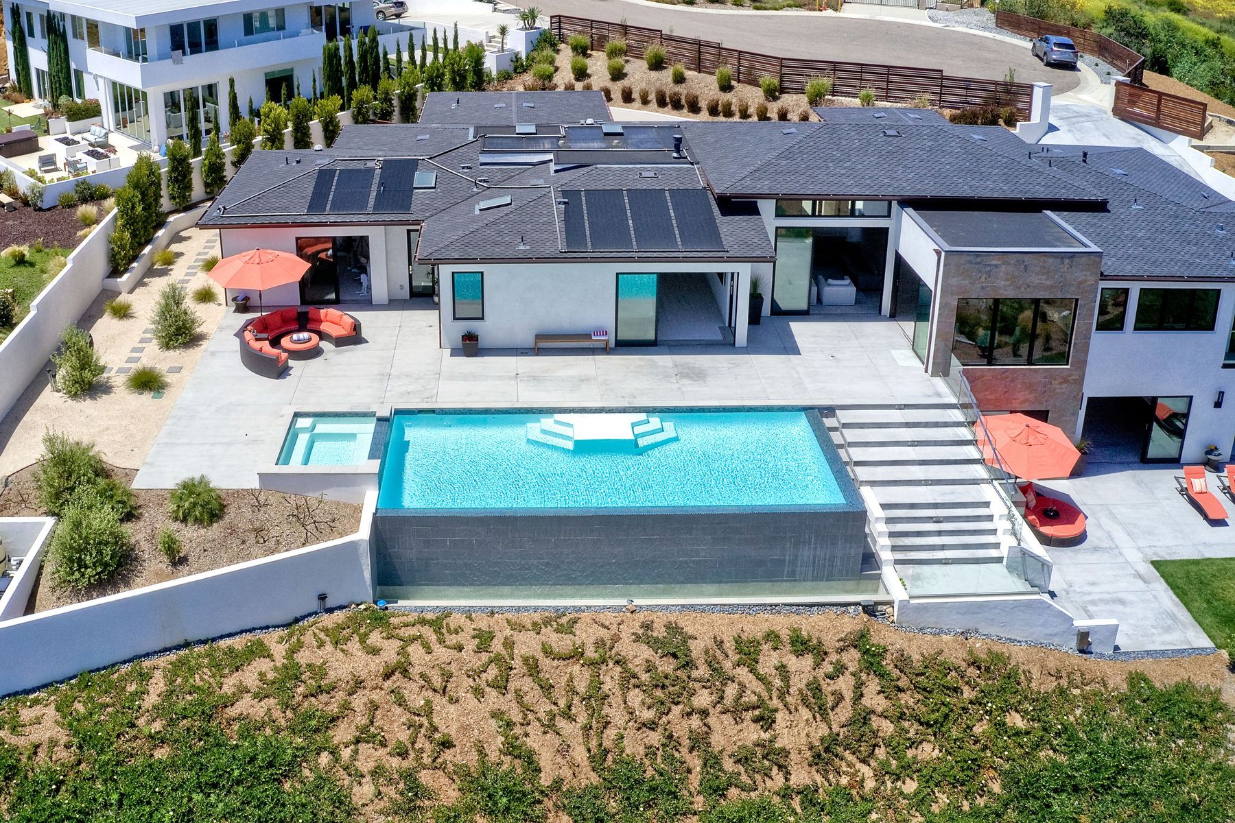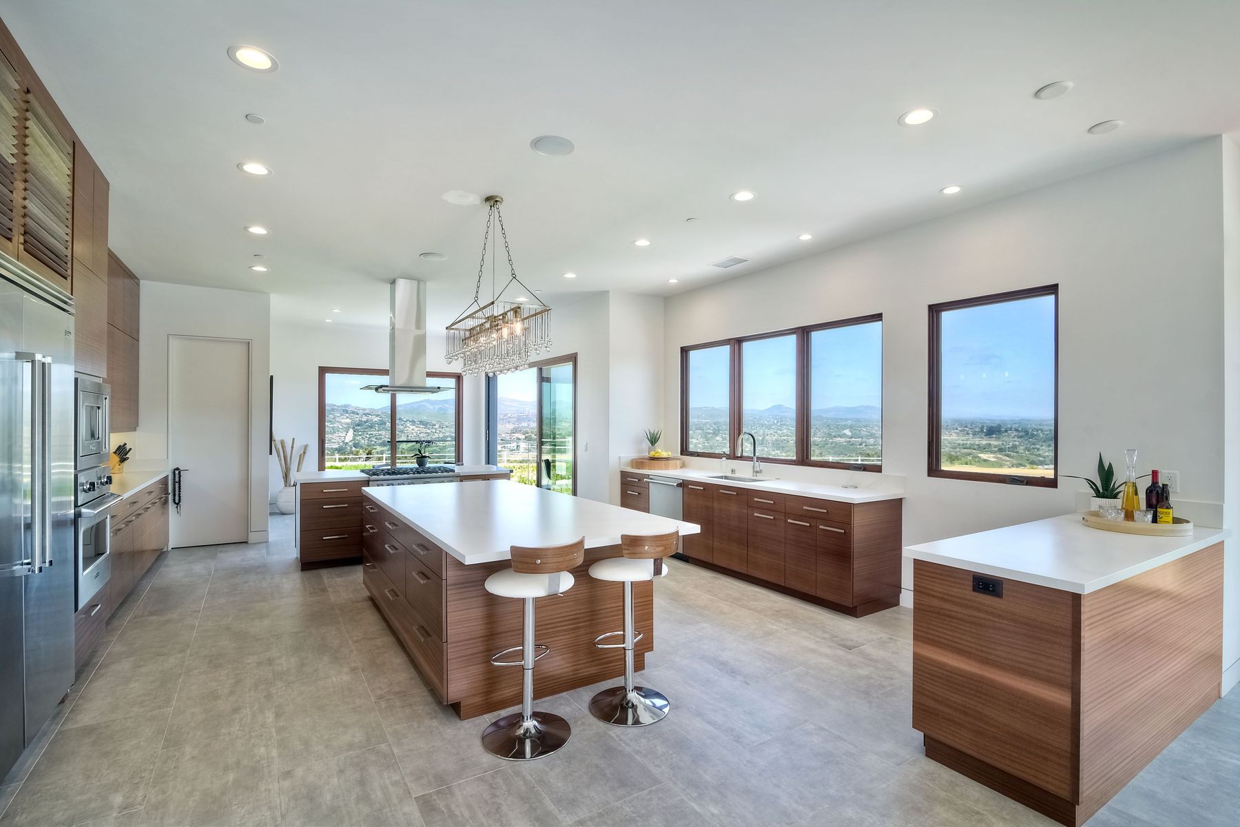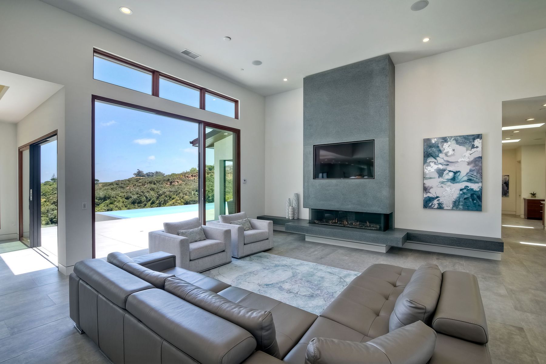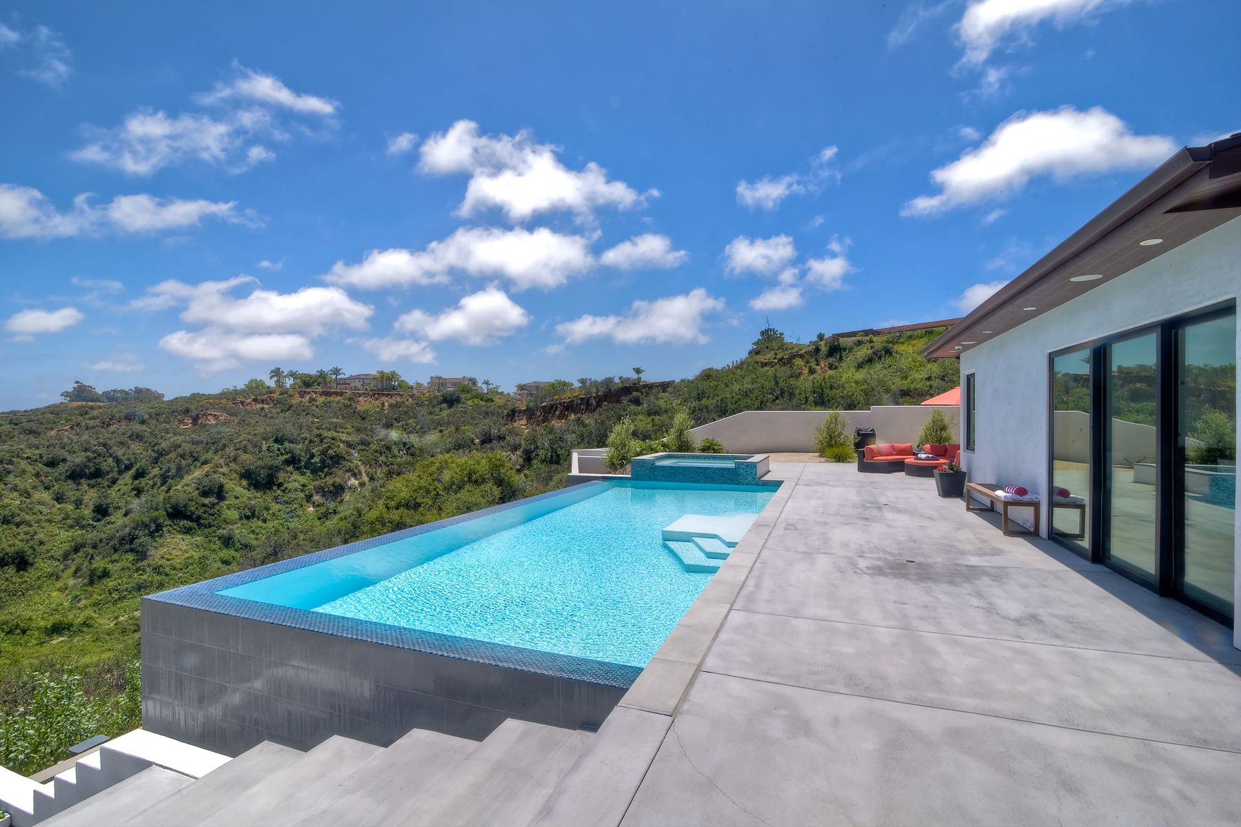 **** TOP OF THE HILL NEW MODERN HOME WITH COMPLETE PRIVACY*** Located on 6.39 acres with Panoramic canyon, mountain, golf course and city lights view in this "One of a Kind" newly constructed custom home! Best location in Encinitas with close proximity to beach, shopping, restaurants and Fwy. On a private street at the end of the cul-de-sac! Stunning modern design home with all main living rooms on one level with most rooms accessing the outside expansive patio and infinity pool! Video on YouTube!