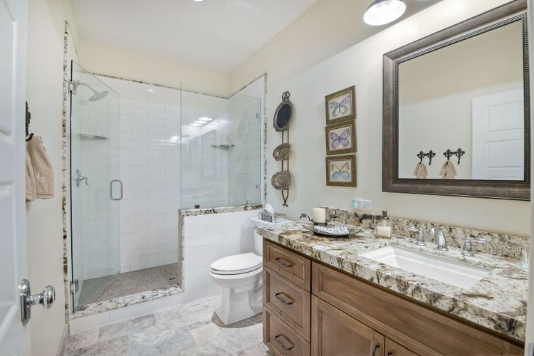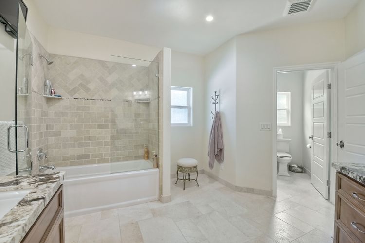 Double Sinks In Master Bath, Exhaust fan(s), Granite Counters, Privacy toilet door, Stone Counters, Shower in Tub, Bathtub