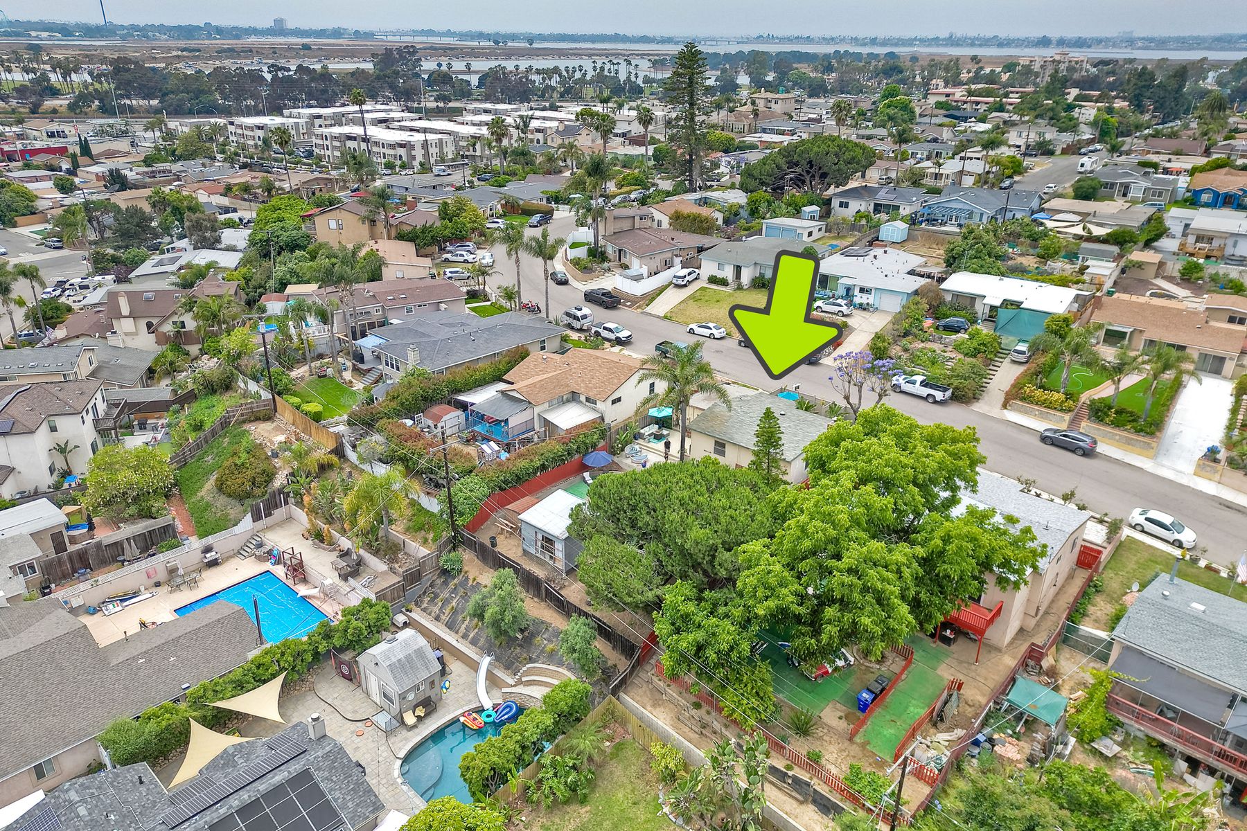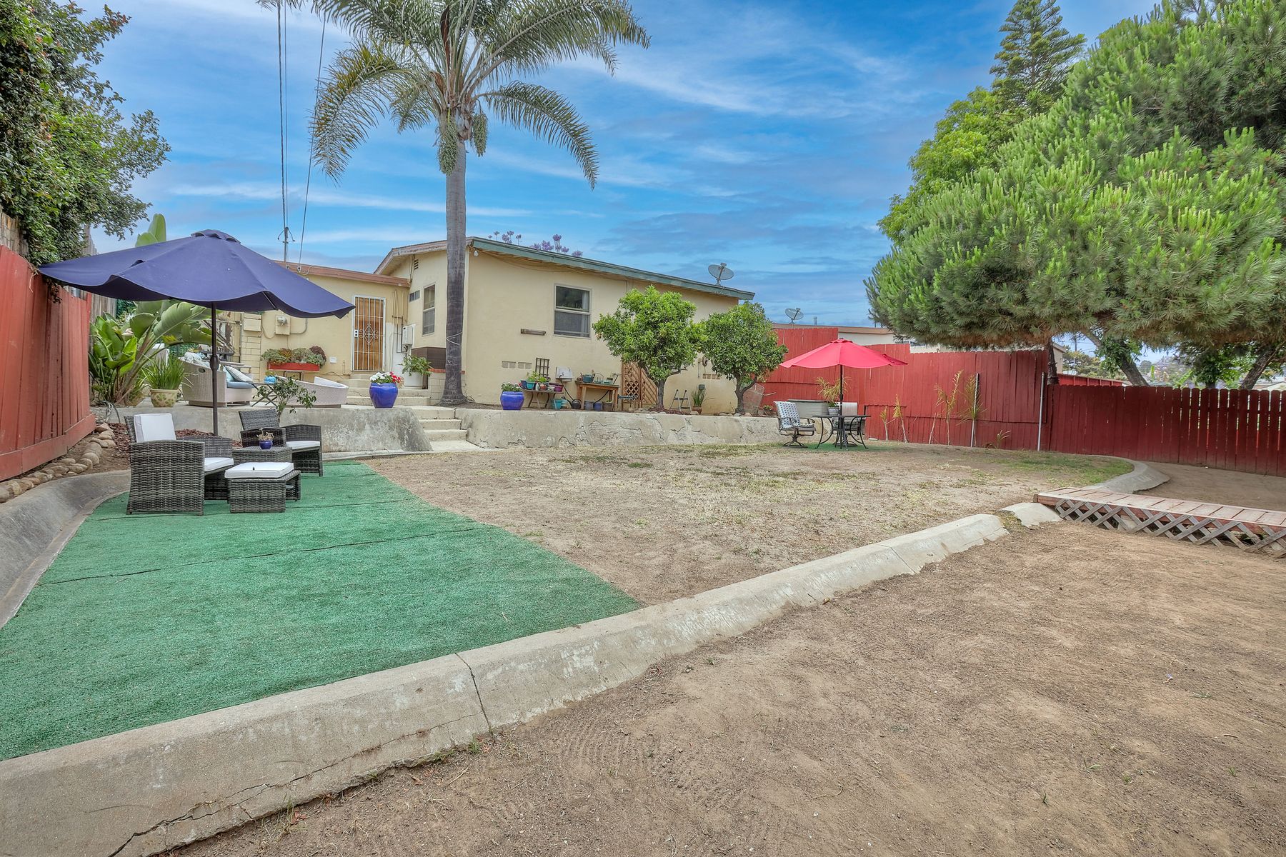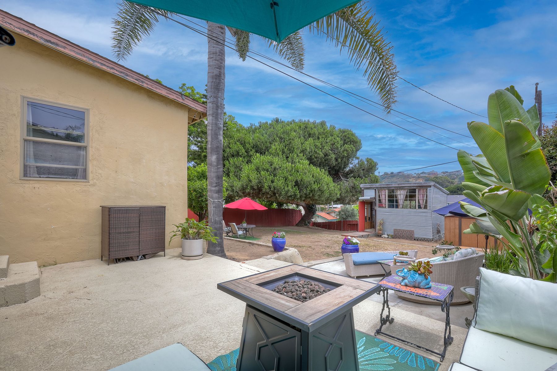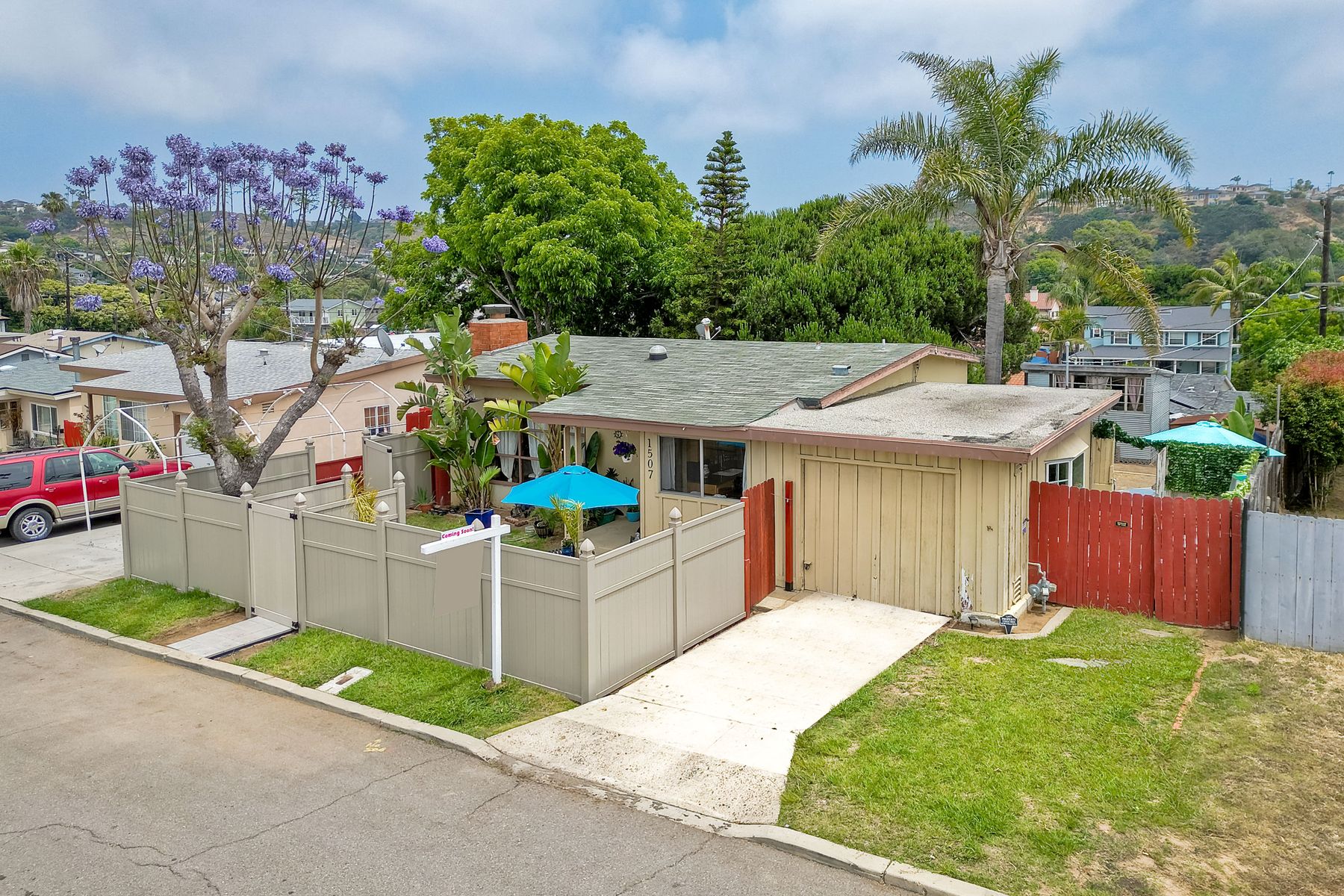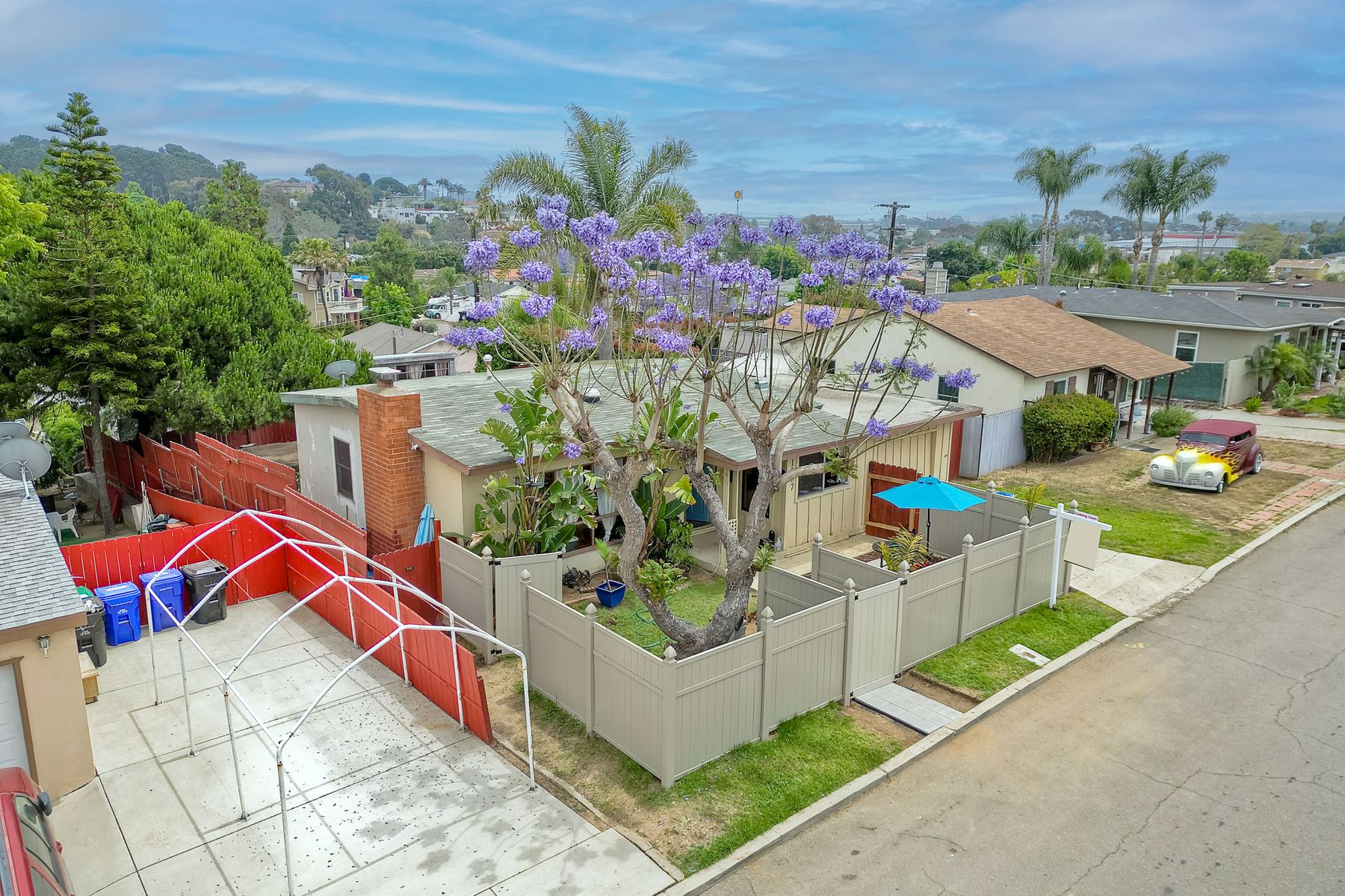Fantastic opportunity to own this charming beach home in the highly desired area of Bay Park. Featuring vaulted ceilings, beautiful original hardwood floors throughout, brick fireplace and an Additional 12x14 DETACHED unit -currently used as a home gym but can be an office or multipurpose room. Plenty of space in this amazing backyard to add an ADU & Jr ADU, a pool and enjoy the view! 891 sq ft does NOT include the 3rd bedroom. The 3rd bedroom is currently the converted 1 car garage (not permitted). It can be used as an office or den and total sq ft would be approx 1100 sq ft . Additional features are the recently remodeled kitchen and brand New fenced front yard with pavers for more inviting outdoor private living. Close to the Mission Bay, Sea World, Old Town all shopping and easy freeway access. Build up or add on!