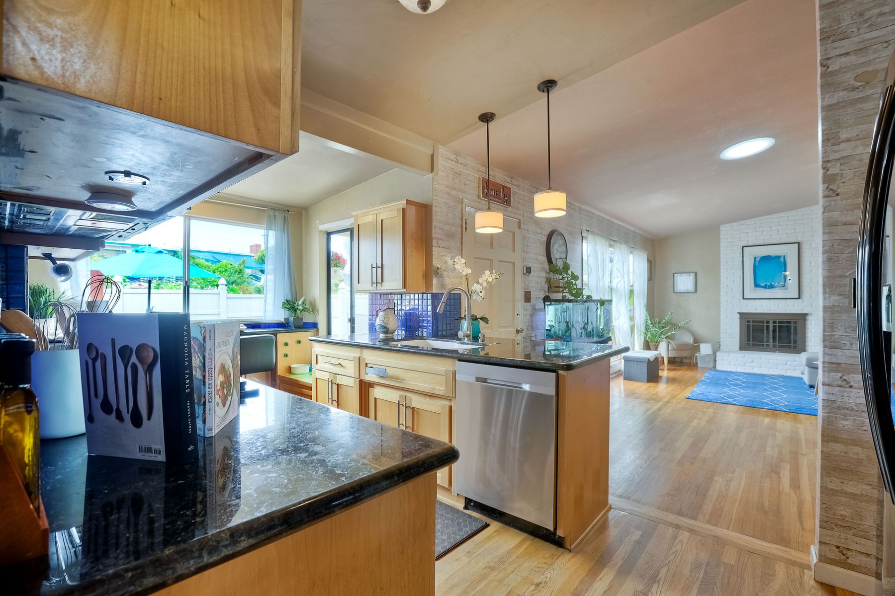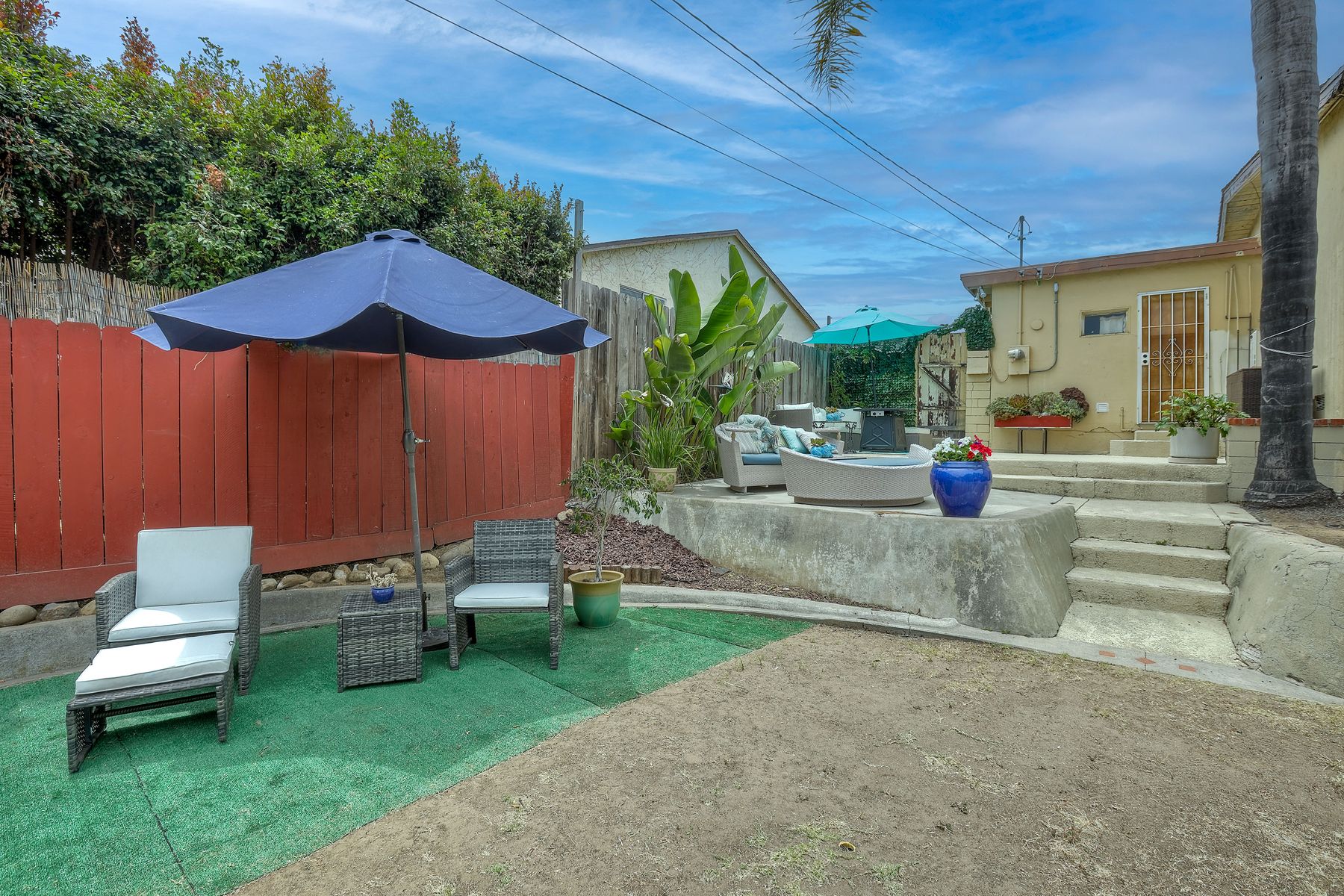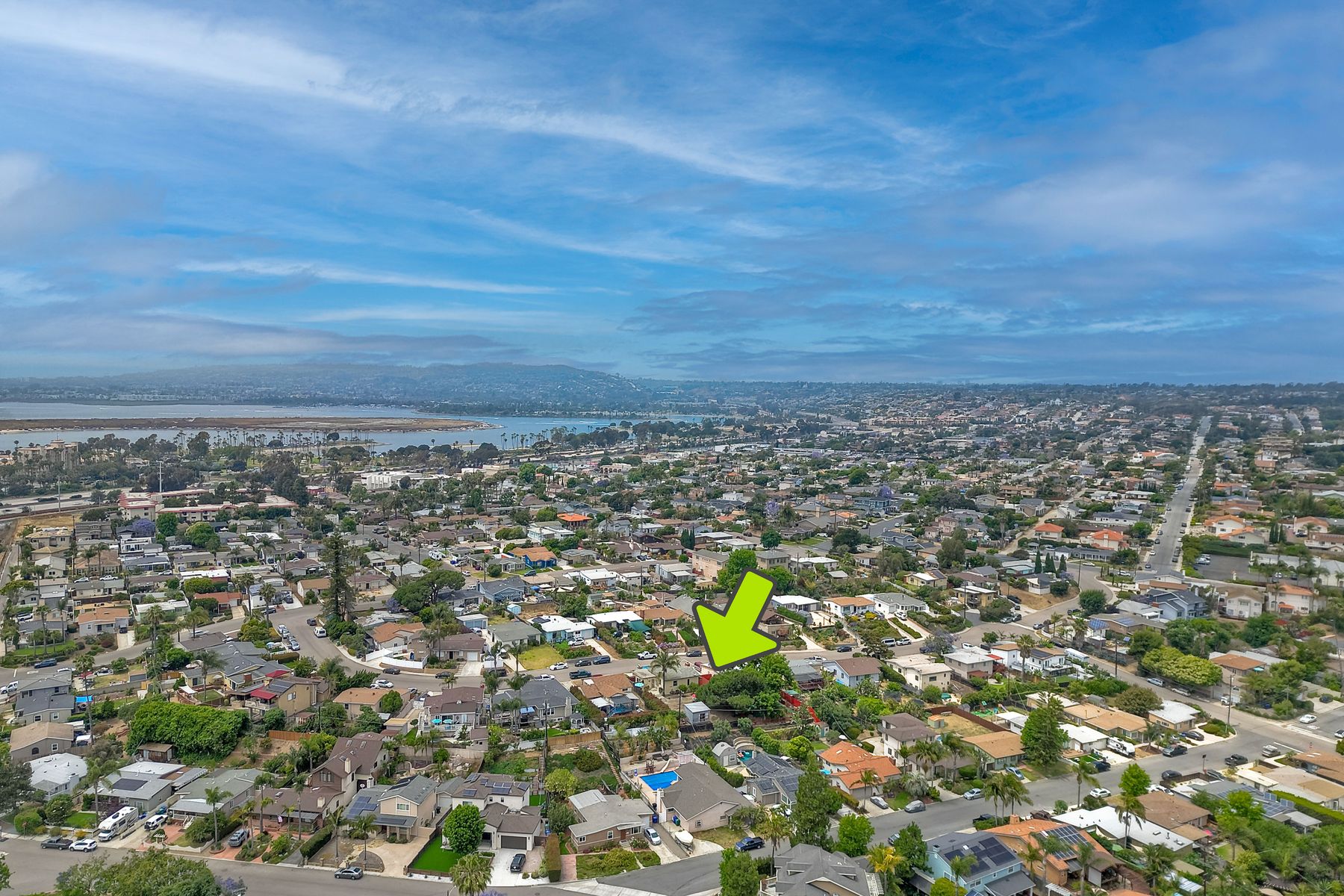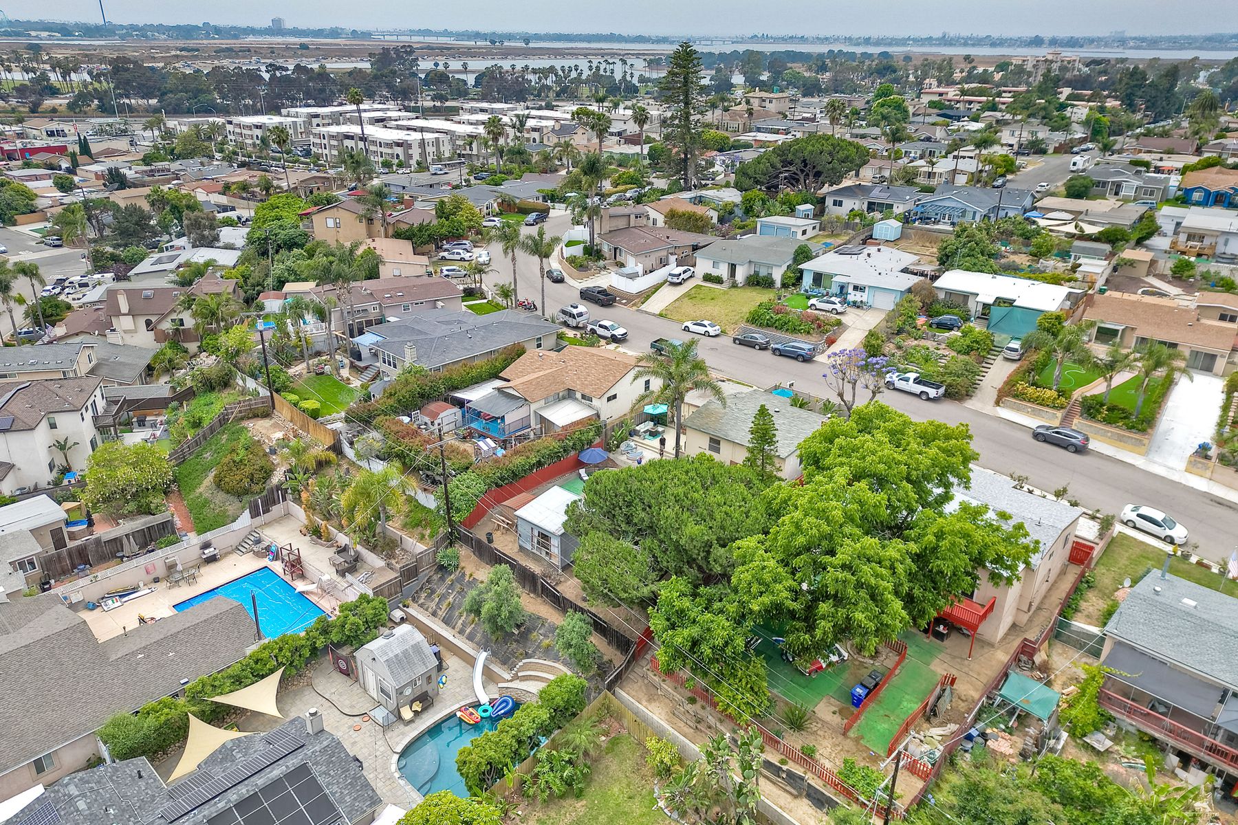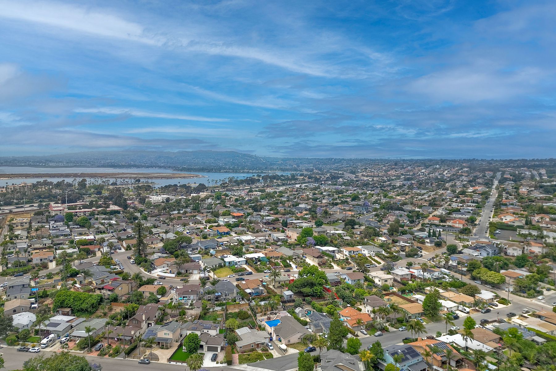 Fantastic opportunity to own this charming beach home in the highly desired area of Bay Park. Featuring vaulted ceilings, beautiful original hardwood floors throughout, brick fireplace and an Additional 12x14 DETACHED unit -currently used as a home gym but can be an office or multipurpose room. Plenty of space in this amazing backyard to add an ADU & Jr ADU, a pool and enjoy the view! 891 sq ft does NOT include the 3rd bedroom. The 3rd bedroom is currently the converted 1 car garage (not permitted). It can be used as an office or den and total sq ft would be approx 1100 sq ft . Additional features are the recently remodeled kitchen and brand New fenced front yard with pavers for more inviting outdoor private living. Close to the Mission Bay, Sea World, Old Town all shopping and easy freeway access. Build up or add on!