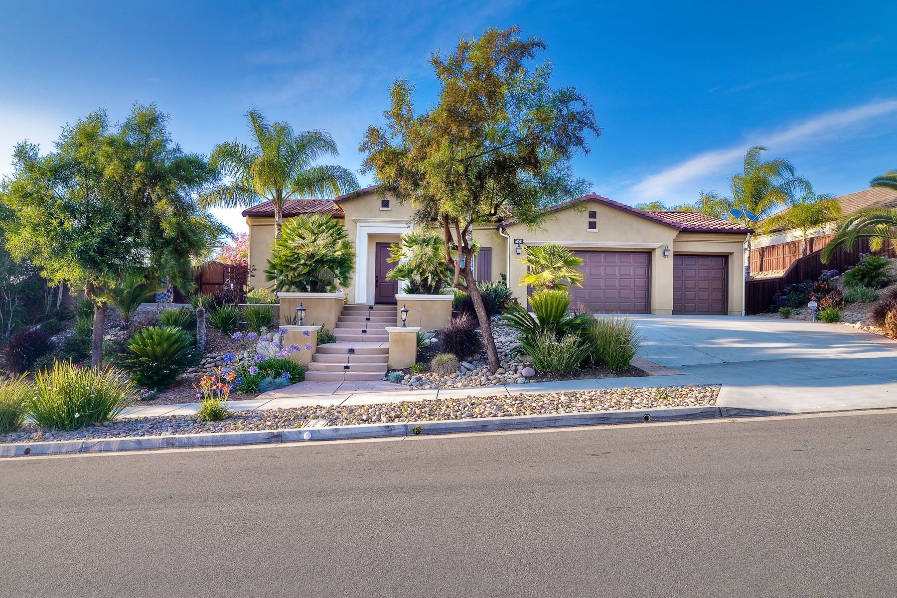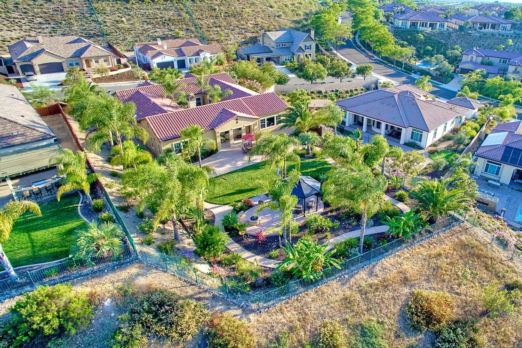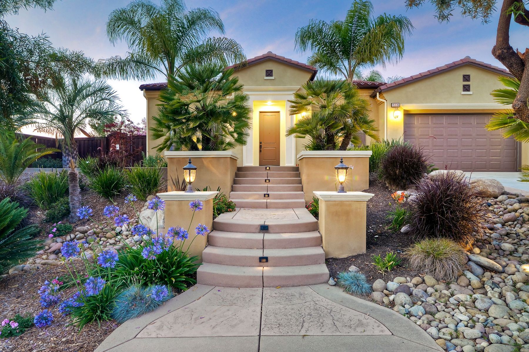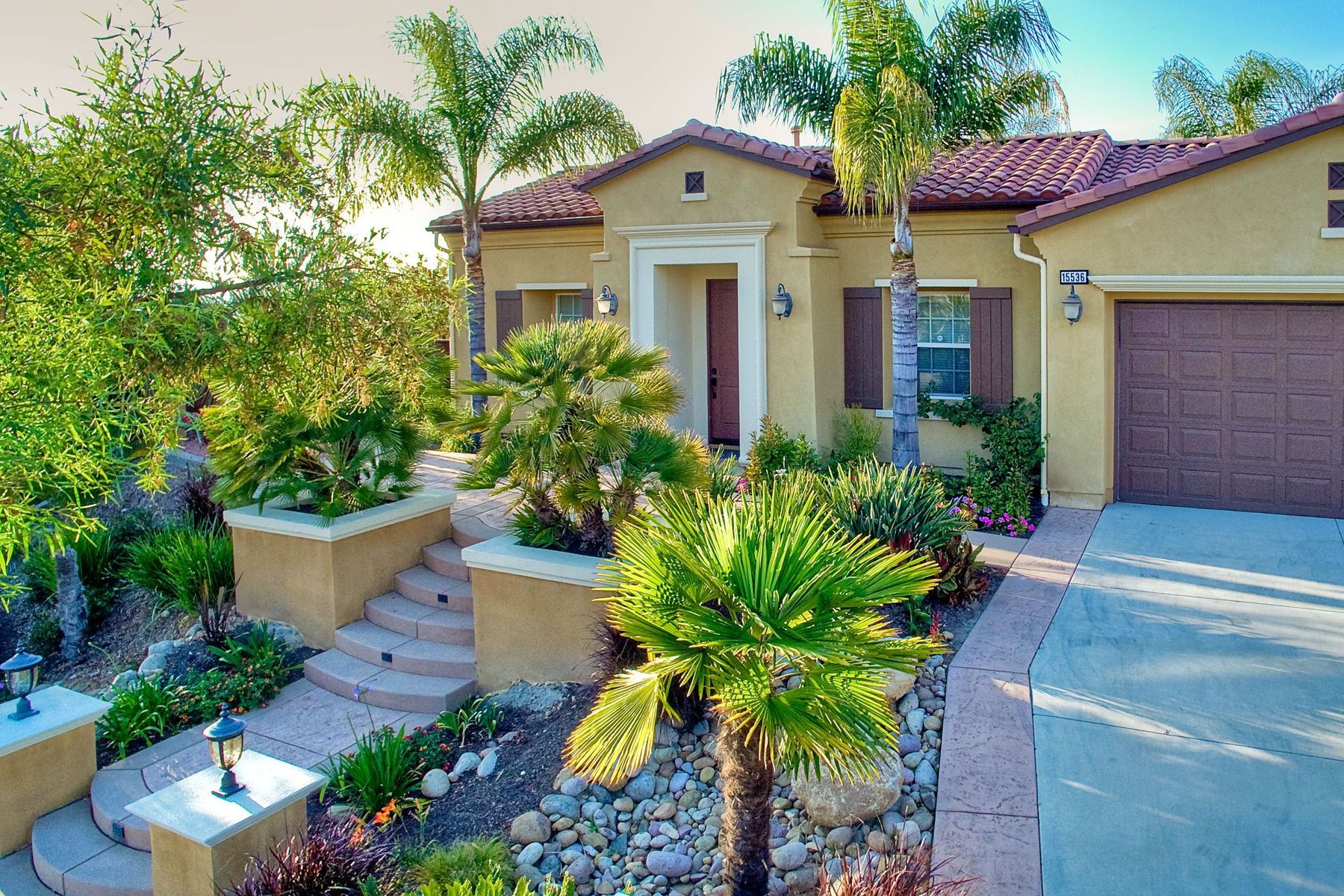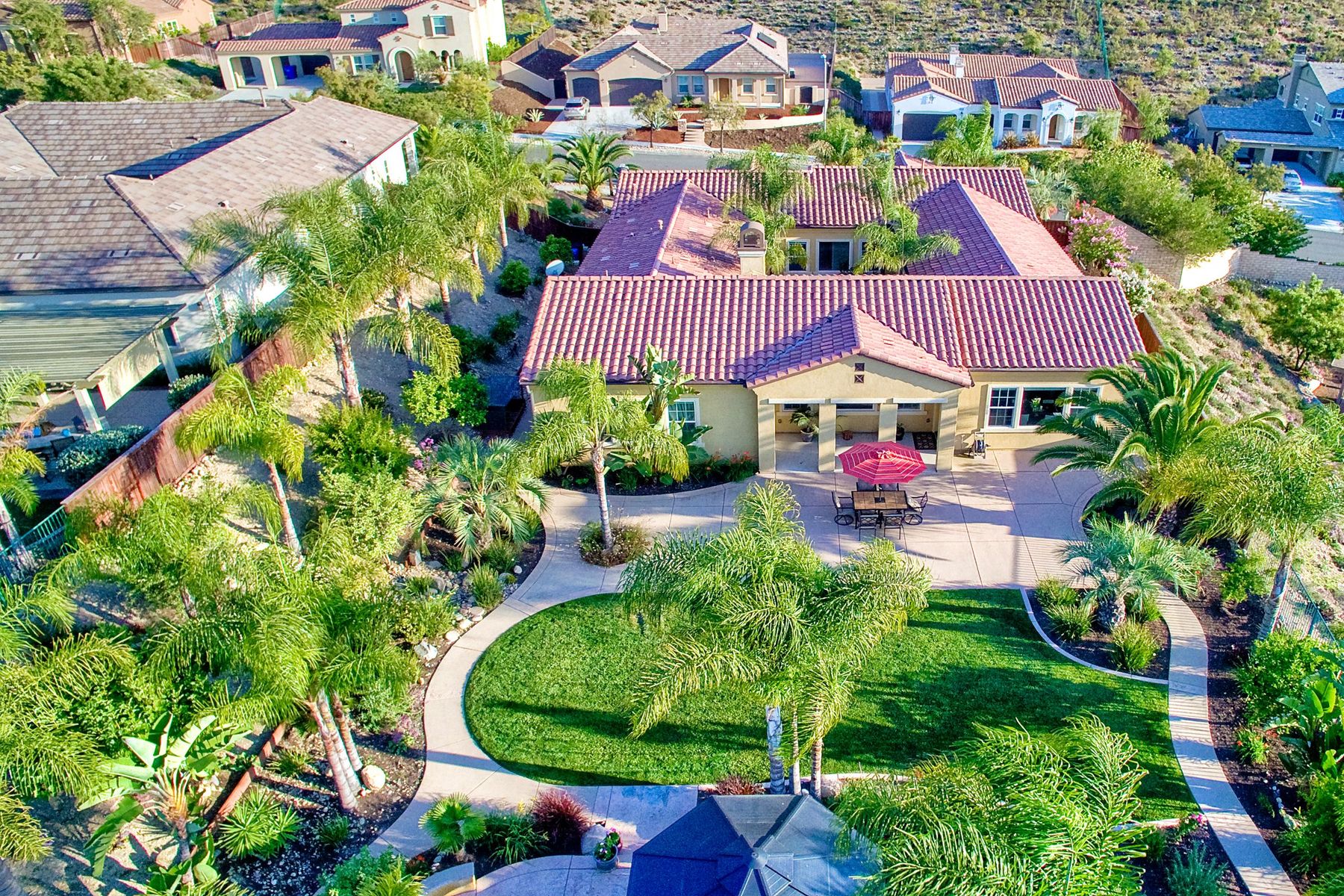 Absolutely gorgeous! Single Level, courtyard floor plan with premium, elevated, panoramic view lot! What more needs to be said? Lots more! You are home, in this stunning Tuscan-inspired single level beauty surrounded by a tropical oasis. Truly a one of a kind property! Highly upgraded, spacious living spaces throughout with large master suite and 3 additional en suite bedrooms and baths. Exceptional tropical landscaped backyard is truly paradise! Nothing left to do but move in! Single level at its best. This beautiful home is impeccable in every way. Amazing curb appeal. The rich Tuscan-inspired exterior color palette, impressive portico front door, stamped concrete steps with lighting and lush tropical landscape with dry riverbed provide an inkling of what’s to come. Step in to the dramatic rotunda entry and sprawling hallway featuring rich hardwood floors to open and bright, spacious living/dining areas. The entire property surrounds a beautiful exterior courtyard featuring mature rose bushes and patio. Perfect for a focal fountain or garden, bringing the outside in. The expansive, highly upgraded gourmet kitchen comes fully equipped with high-end stainless steel appliances (Wolf 6-burner professional stove top, oven and microwave; Sub Zero refrigerator and wine fridge), extra-large center island with plenty of room for pull up seating, gorgeous slab granite counter tops accompanied by designer metallic-finished tile backsplash, built-in desk, butler’s pantry, walk-in pantry, large eat-in area, pendant lighting, lots of cabinetry storage and entertainment wet bar with stainless sink and glassed cabinetry. This impressive kitchen looks out to one of the most beautiful tropical backyards; exceptionally planned, planted and cared for. Oversized family room appointed with built-in entertainment center, raised hearth fire place with Tuscan surround and ceiling fan looks out to courtyard and backyard with French doors to both. Large master suite looks out to its own tropical sanctuary. French door to backyard. When opened wonderful breezes come in to this serene and soothing retreat. Plenty of room for a sitting area, ceiling fan and upgraded carpet. Sparkling master bath features designer tiled, oversized shower, large tub surround, counter tops and floor. Separate double sink areas, vanity with large walk-in closet. Storage. Storage. Storage. This home has lots of it! Large, tucked away laundry room with sink, extensive cabinetry, easy access to all bedrooms and tile floors. Spectacular backyard is an understatement. The tropical paradise features over 30 palms and panoramic views all around with tranquil riverbed water feature. You feel like you are on top of the world! Exceptionally planted, mature growth and extremely lush and private. A true sanctuary with gazebo focal point, large, partially covered patio with overhead lighting; wired for outdoor ceiling fans and raised patio, hardscaped curved pathways surrounding lush lawn area and gorgeous green and flowering plantings, DG curved path on side as well as large additional side yard featuring ½ dozen mature fruit trees and raised vegetable garden. The seller is a “green thumb” and it shows. Enjoy this stunning garden and tropical paradise! 3-car garage. Award winning Poway Schools.