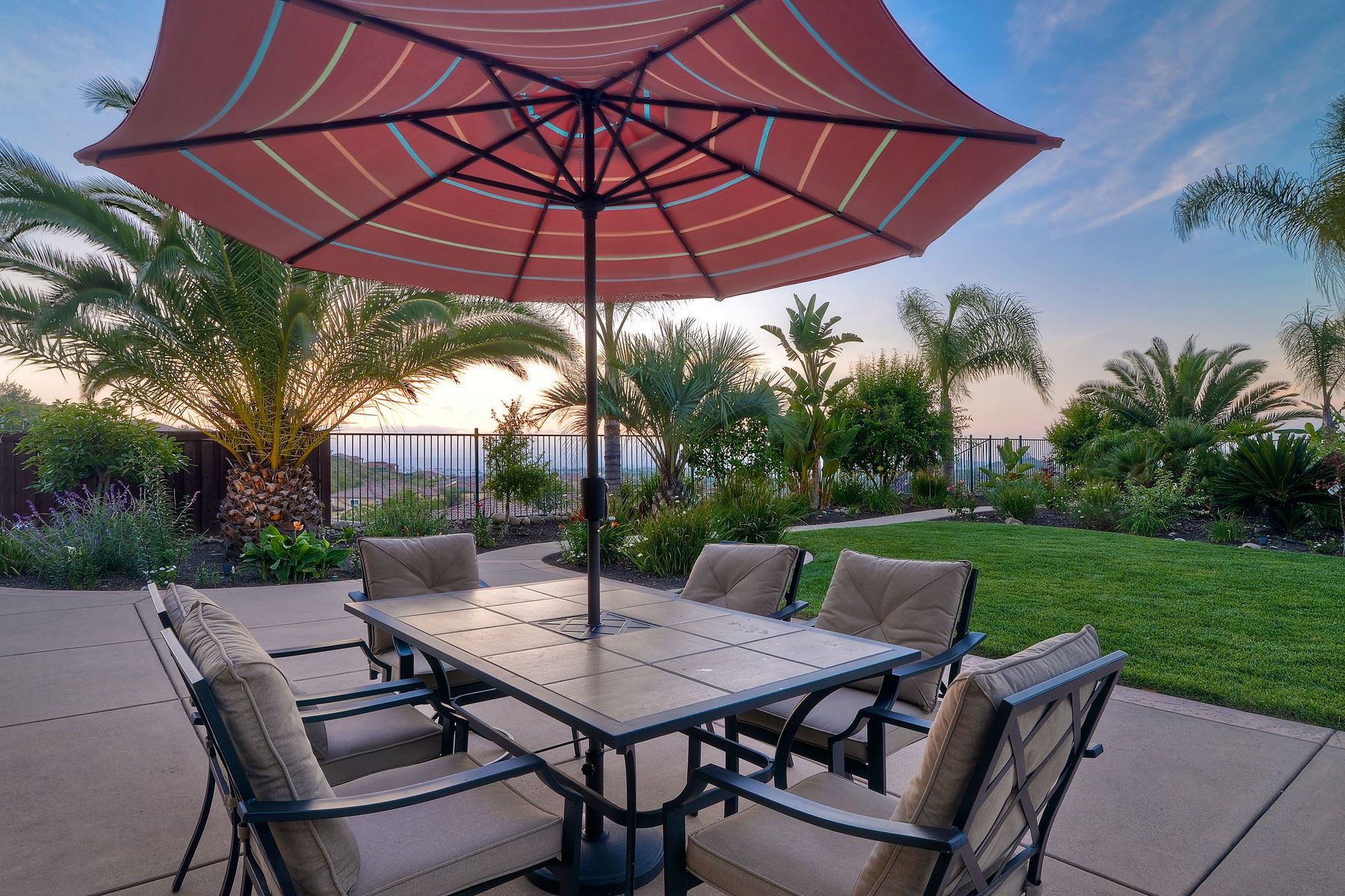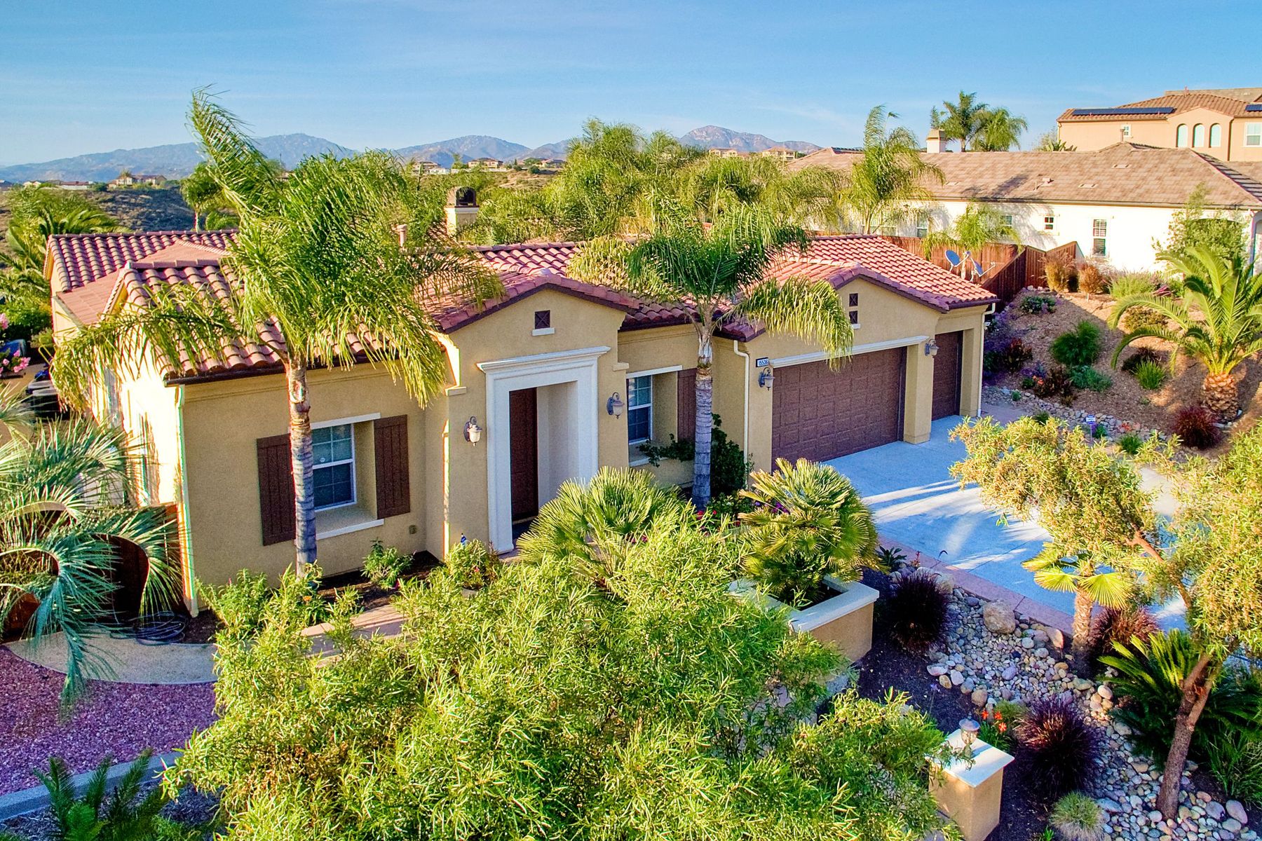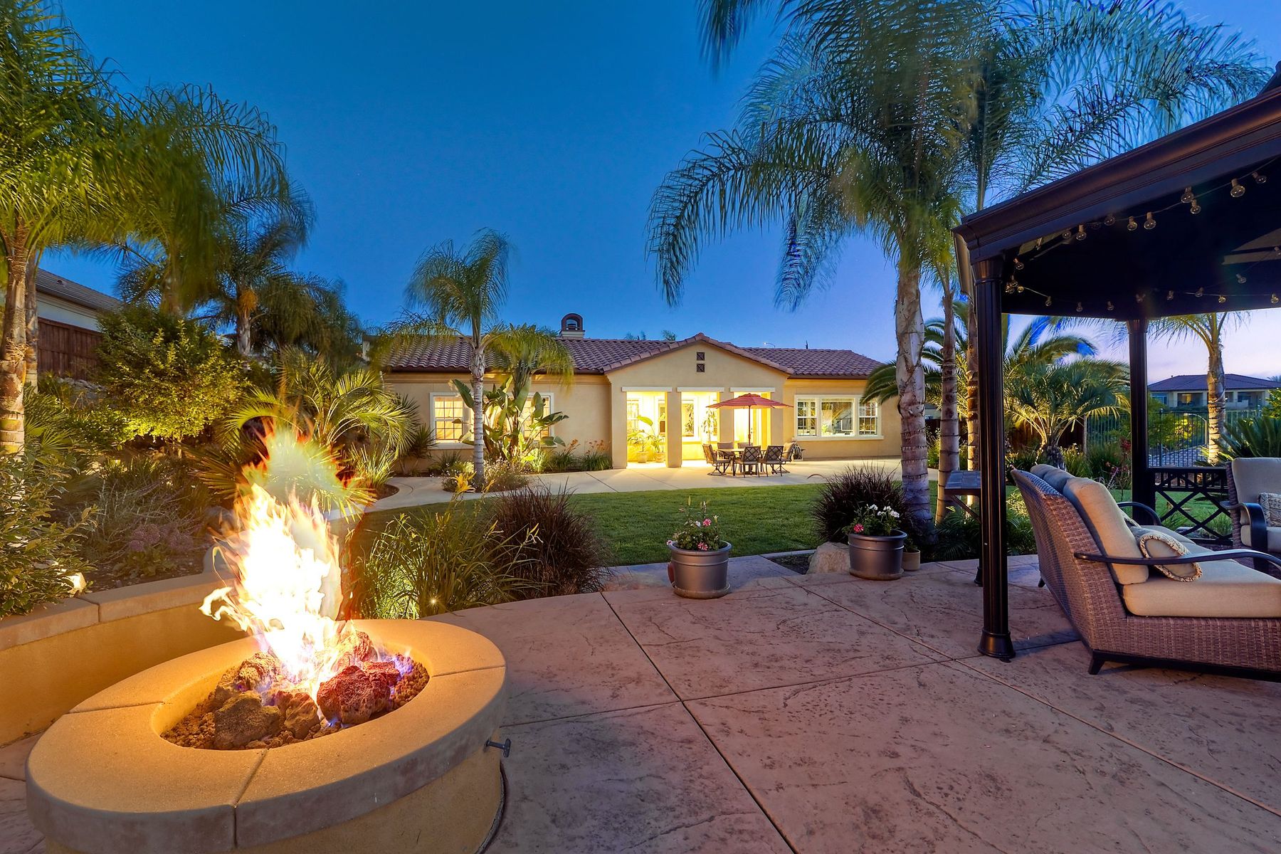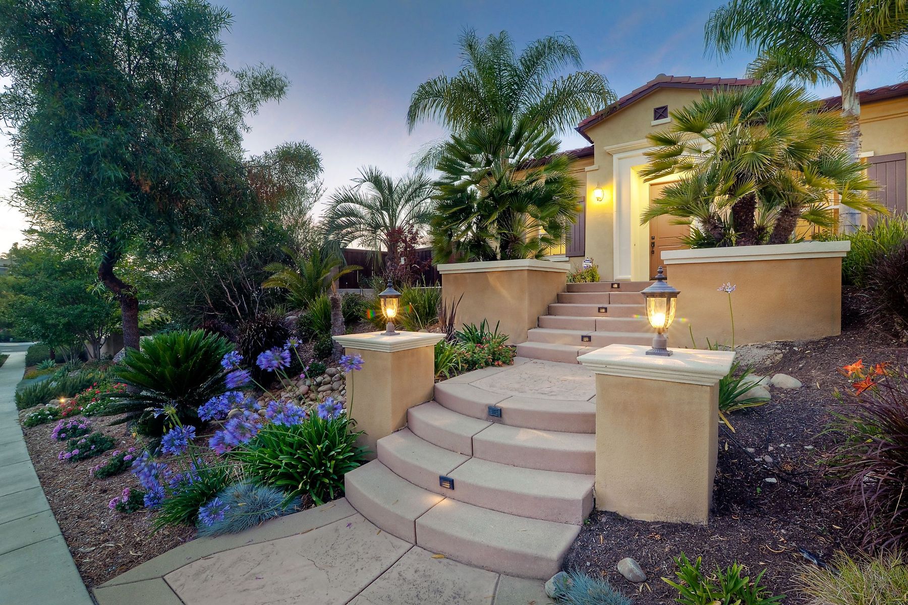 Absolutely gorgeous! Single Level, courtyard floor plan with premium, elevated, panoramic view lot! What more needs to be said? Lots more! You are home, in this stunning Tuscan-inspired single level beauty surrounded by a tropical oasis. Truly a one of a kind property! Highly upgraded, spacious living spaces throughout with large master suite and 3 additional en suite bedrooms and baths. Exceptional tropical landscaped backyard is truly paradise! Nothing left to do but move in! Single level at its best. This beautiful home is impeccable in every way. Amazing curb appeal. The rich Tuscan-inspired exterior color palette, impressive portico front door, stamped concrete steps with lighting and lush tropical landscape with dry riverbed provide an inkling of what’s to come. Step in to the dramatic rotunda entry and sprawling hallway featuring rich hardwood floors to open and bright, spacious living/dining areas. The entire property surrounds a beautiful exterior courtyard featuring mature rose bushes and patio. Perfect for a focal fountain or garden, bringing the outside in. The expansive, highly upgraded gourmet kitchen comes fully equipped with high-end stainless steel appliances (Wolf 6-burner professional stove top, oven and microwave; Sub Zero refrigerator and wine fridge), extra-large center island with plenty of room for pull up seating, gorgeous slab granite counter tops accompanied by designer metallic-finished tile backsplash, built-in desk, butler’s pantry, walk-in pantry, large eat-in area, pendant lighting, lots of cabinetry storage and entertainment wet bar with stainless sink and glassed cabinetry. This impressive kitchen looks out to one of the most beautiful tropical backyards; exceptionally planned, planted and cared for. Oversized family room appointed with built-in entertainment center, raised hearth fire place with Tuscan surround and ceiling fan looks out to courtyard and backyard with French doors to both. Large master suite looks out to its own tropical sanctuary. French door to backyard. When opened wonderful breezes come in to this serene and soothing retreat. Plenty of room for a sitting area, ceiling fan and upgraded carpet. Sparkling master bath features designer tiled, oversized shower, large tub surround, counter tops and floor. Separate double sink areas, vanity with large walk-in closet. Storage. Storage. Storage. This home has lots of it! Large, tucked away laundry room with sink, extensive cabinetry, easy access to all bedrooms and tile floors. Spectacular backyard is an understatement. The tropical paradise features over 30 palms and panoramic views all around with tranquil riverbed water feature. You feel like you are on top of the world! Exceptionally planted, mature growth and extremely lush and private. A true sanctuary with gazebo focal point, large, partially covered patio with overhead lighting; wired for outdoor ceiling fans and raised patio, hardscaped curved pathways surrounding lush lawn area and gorgeous green and flowering plantings, DG curved path on side as well as large additional side yard featuring ½ dozen mature fruit trees and raised vegetable garden. The seller is a “green thumb” and it shows. Enjoy this stunning garden and tropical paradise! 3-car garage. Award winning Poway Schools.