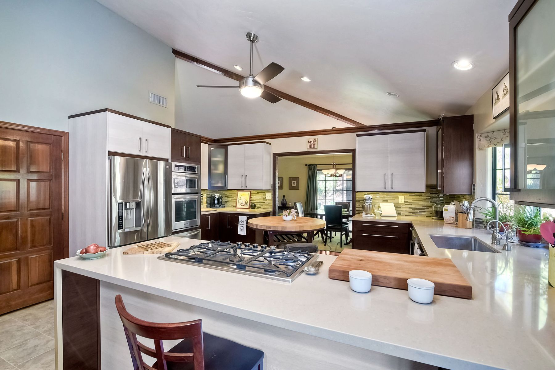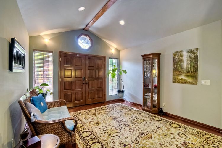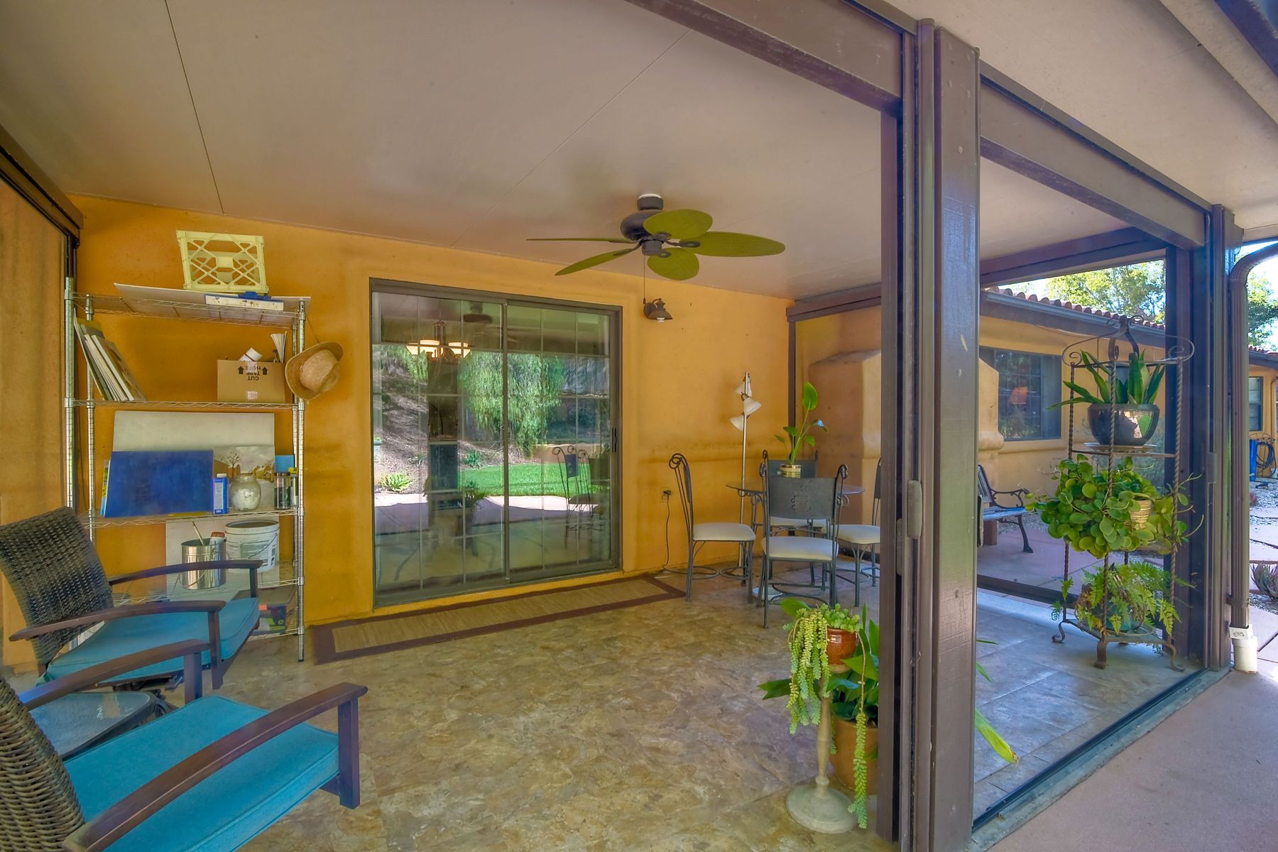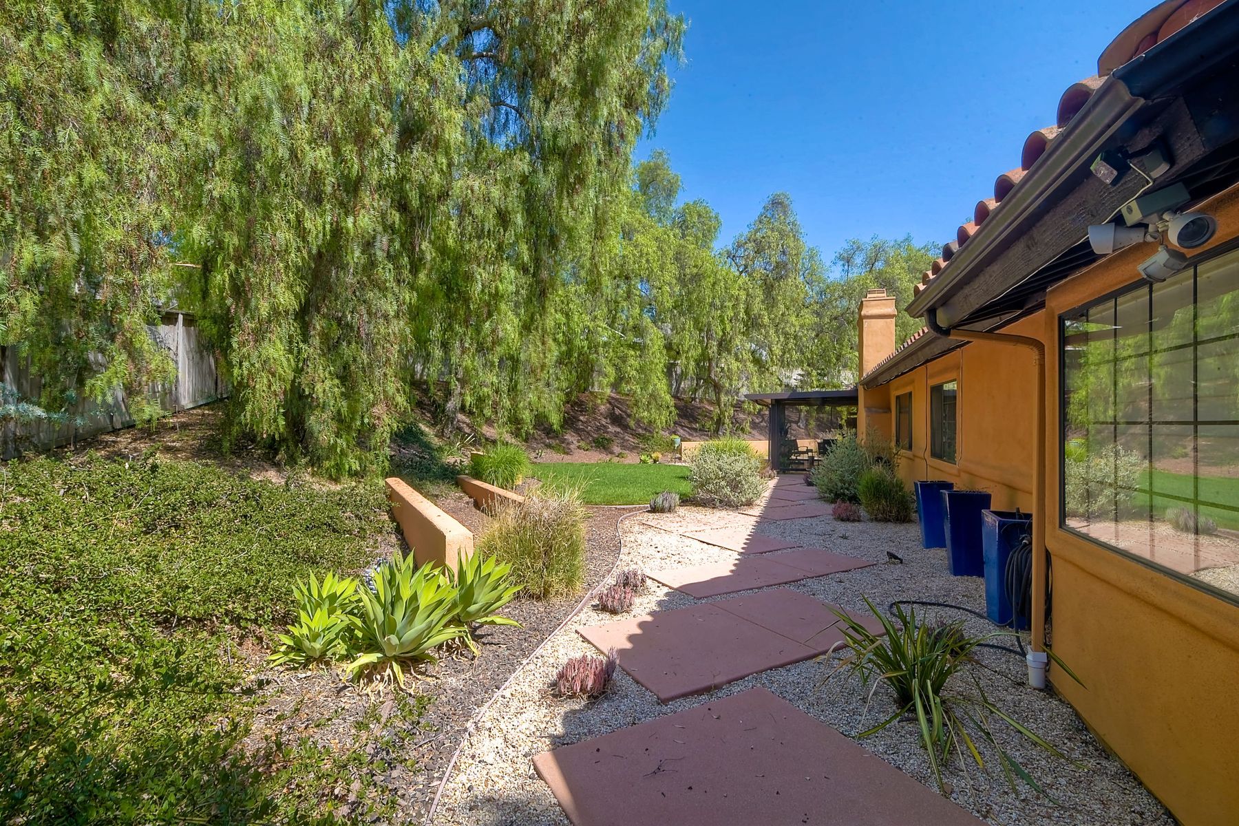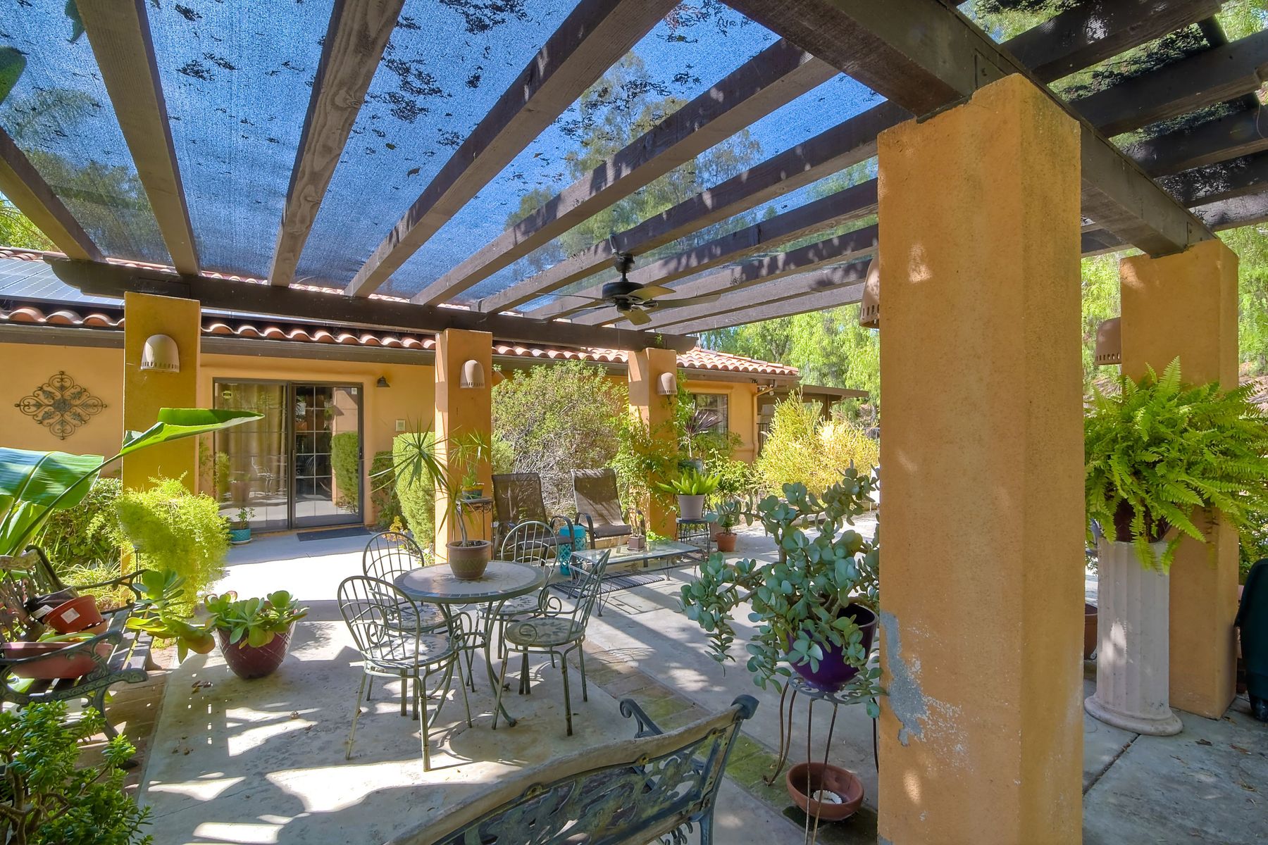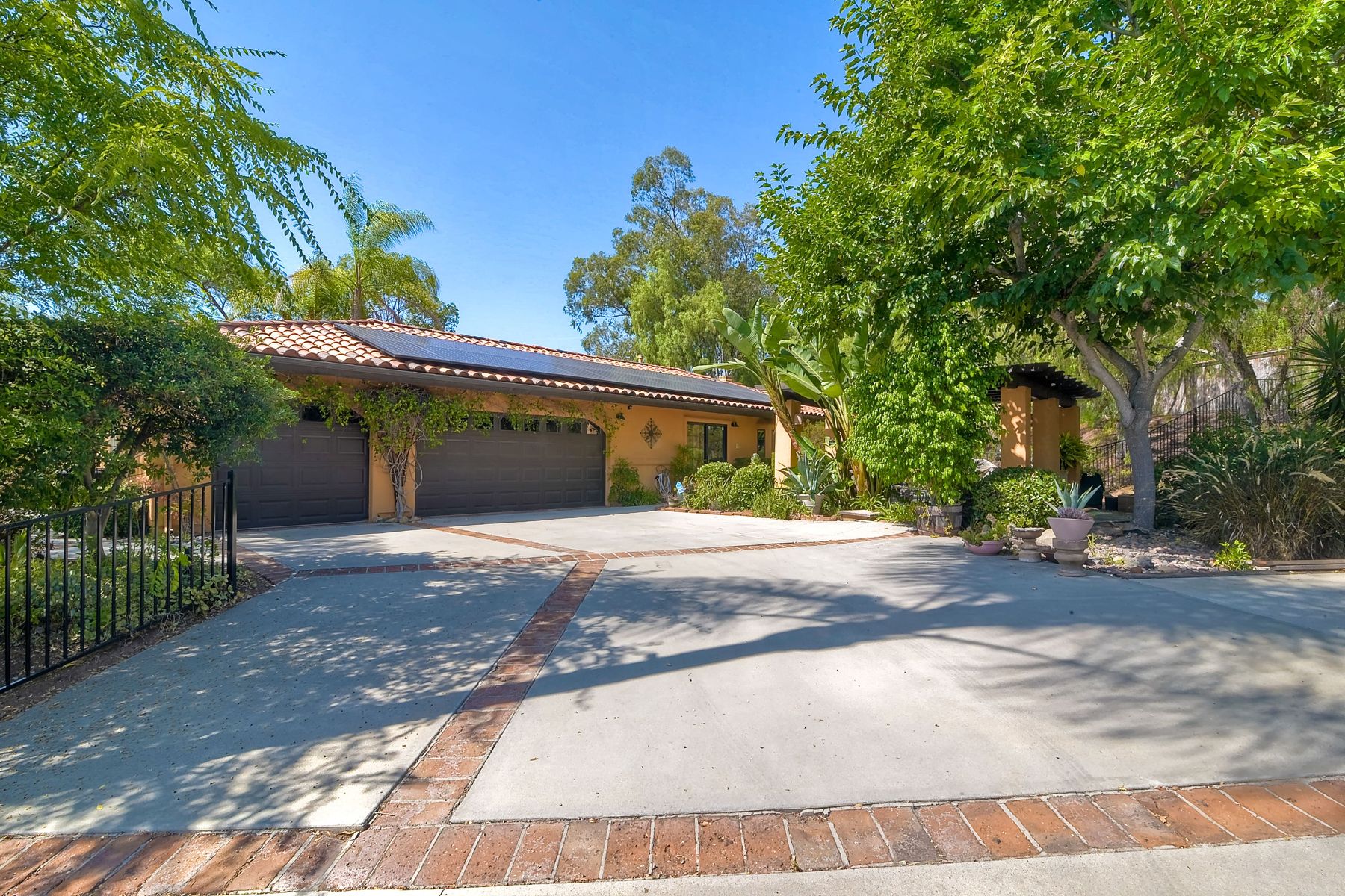 Hidden in the Vista foothills this single story home offers 2874 sf. 3 bedrooms, 3 baths, 3 car att. garage, and PAID Solar! Extra room off garage w it’s own outside entrance perfect for home office, crafts, workout area etc. Please see supplement Wrap around courtyards create a feeling of old world charm yet modern living. The front courtyard entry has beautiful double doors that open to an expansive foyer where the wings of the home lead to various living areas. One wing leads to the large family room and newly remodeled kitchen. A large walk-in pantry and expansive counter top, designer cabinets and stainless appliances make ease of work. The formal dining area off the kitchen has vaulted ceiling and sliding doors to the outside where a beautiful screened atrium is located. Screens designed to “pop out”. The formal living room features recessed lighting, beautiful fireplace and walk-in wet bar area. Home has a reverse osmosis system. This area is perfect for formal entertaining while either the atrium or pergola off kitchen is great for casual dining. The two auxiliary bedrooms are ample size - one of which is used as a den/office complete with pull-down Murphy bed. The expansive main suite and bath features an on-suite area, large vanity with double sinks, roman tub, walk-in shower and private commode area. The generous walk-in closet is anyone’s dream! Pull out drawers and oodles of hanging space. Boasting an abundance of natural light the home has vaulted ceiling, skylights and ceiling fans in most rooms. Plenty of room for RV. This hidden treasure is close to services/amenities uniquely designed and inviting.