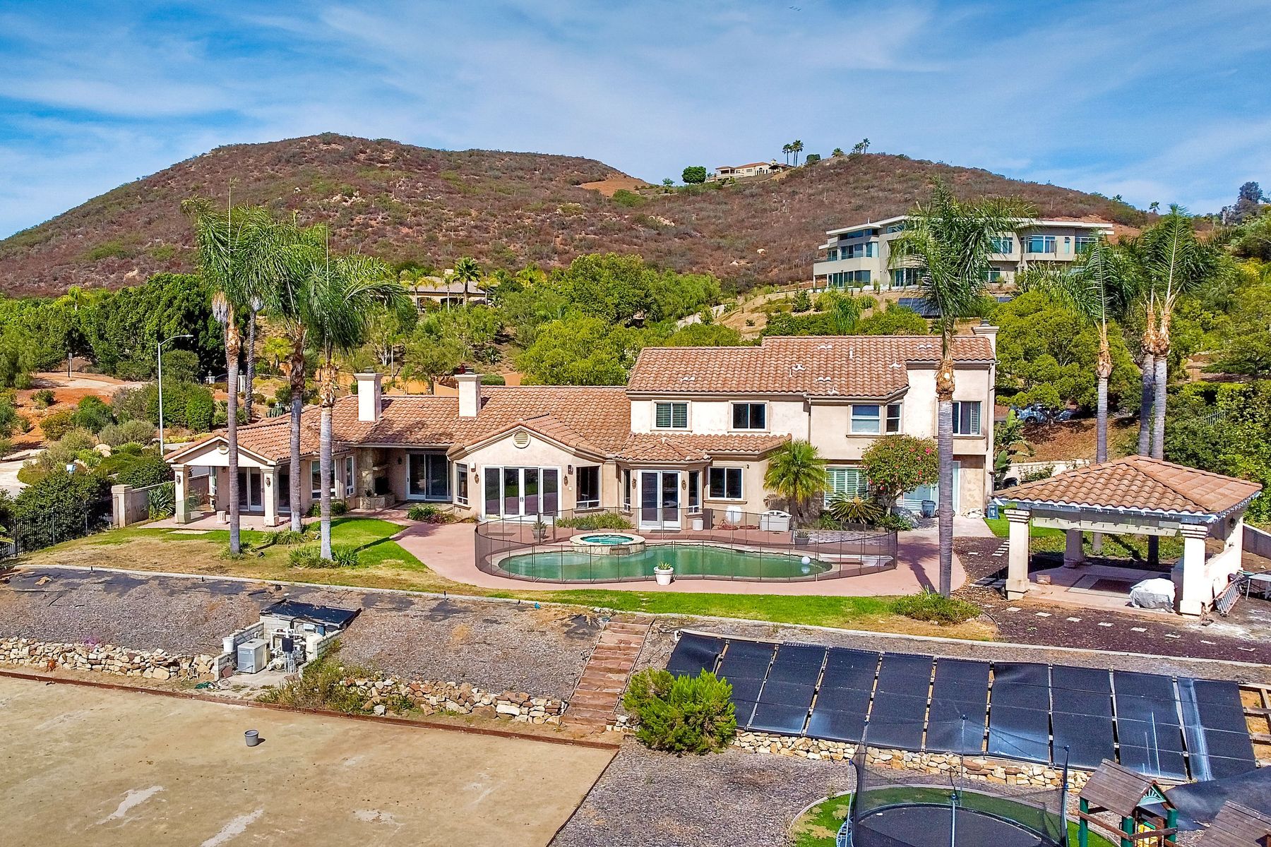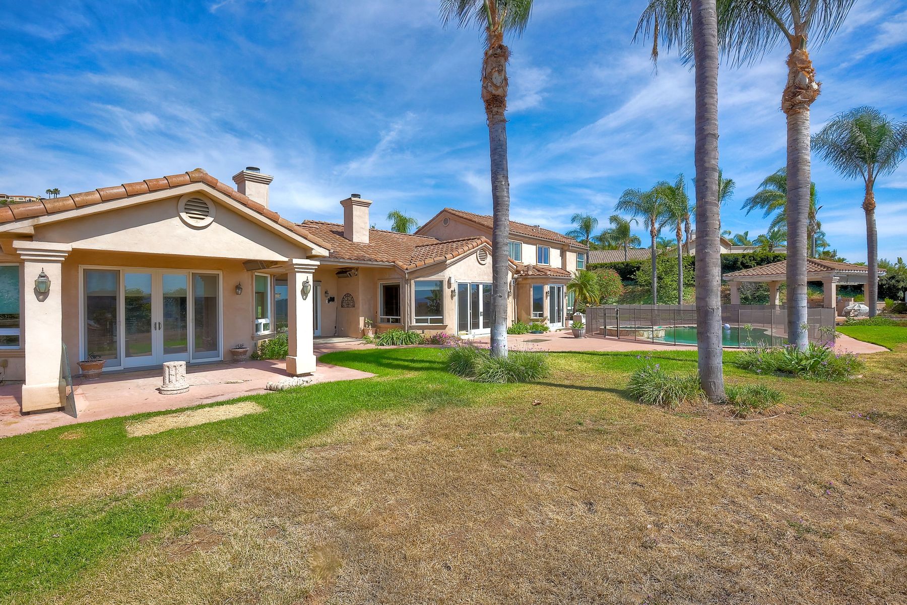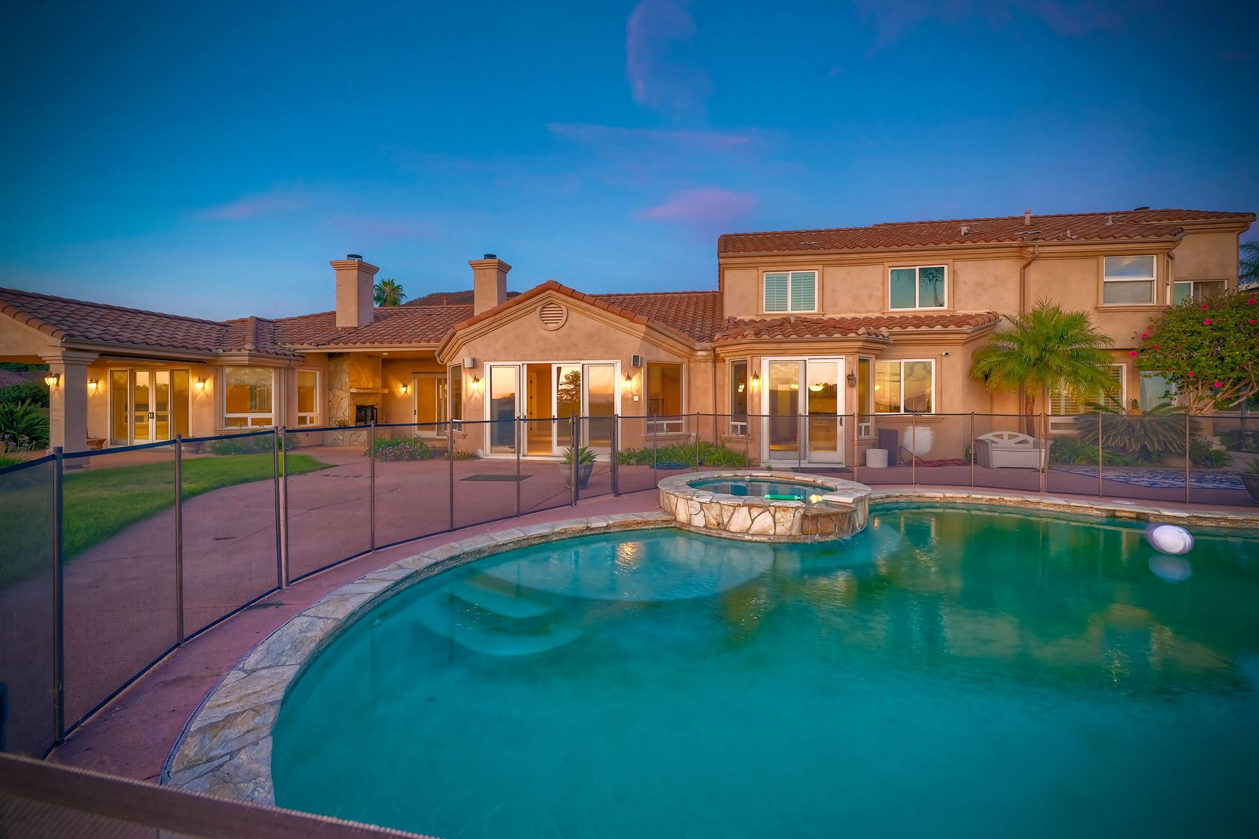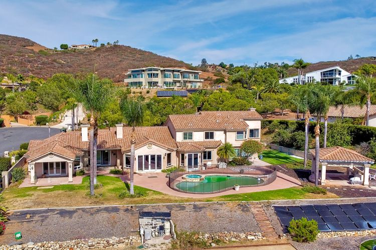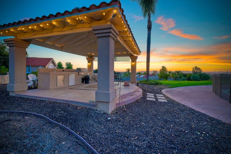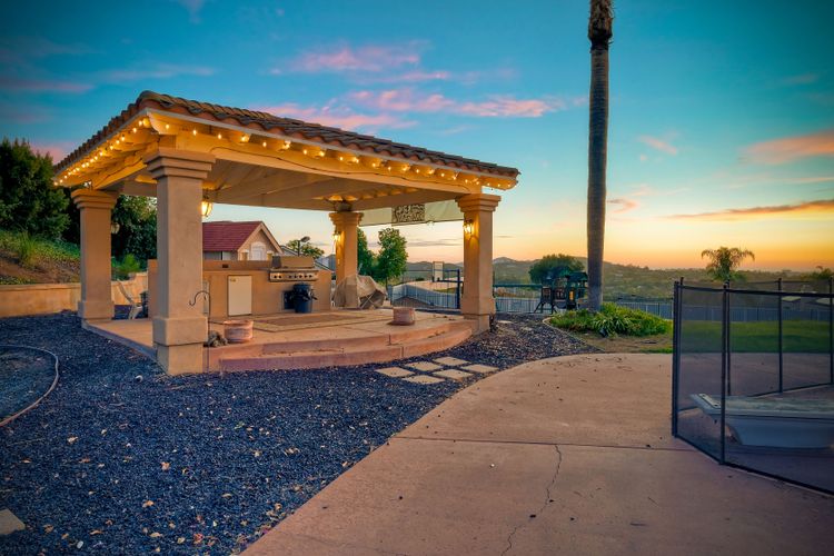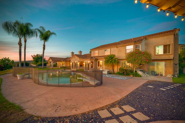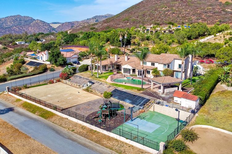 Luxury home with outstanding sunset views. Lovely neighborhood of Bridlewood Lakeside. Over 40,000 sq ft lot, includes basketball court, soccer field, play area with built in ground level trampoline and play swing set. Swimming pool with jacuzzi protected by security fencing. Relax in the oversized backyard patio with BBQ grill, fridge, sink with plenty of counter space. Guest home has it's own private entrance, along with full kitchen, dining area, laundry rm, one bedroom and it's own living room with french doors and private covered patio. Long private driveway, with grand entrance through the custom glass with iron double doors. Formal living with fire place and custom built cabinetry. Formal dining room has view of the lovely backyard with sitting areas. Downstairs office has custom built cabinets and desk. Large living room has bar area with fridge along with built in cabinets for your oversized TV. Shutters and crown molding throughout. All this and a highly rated Poway Unified school district