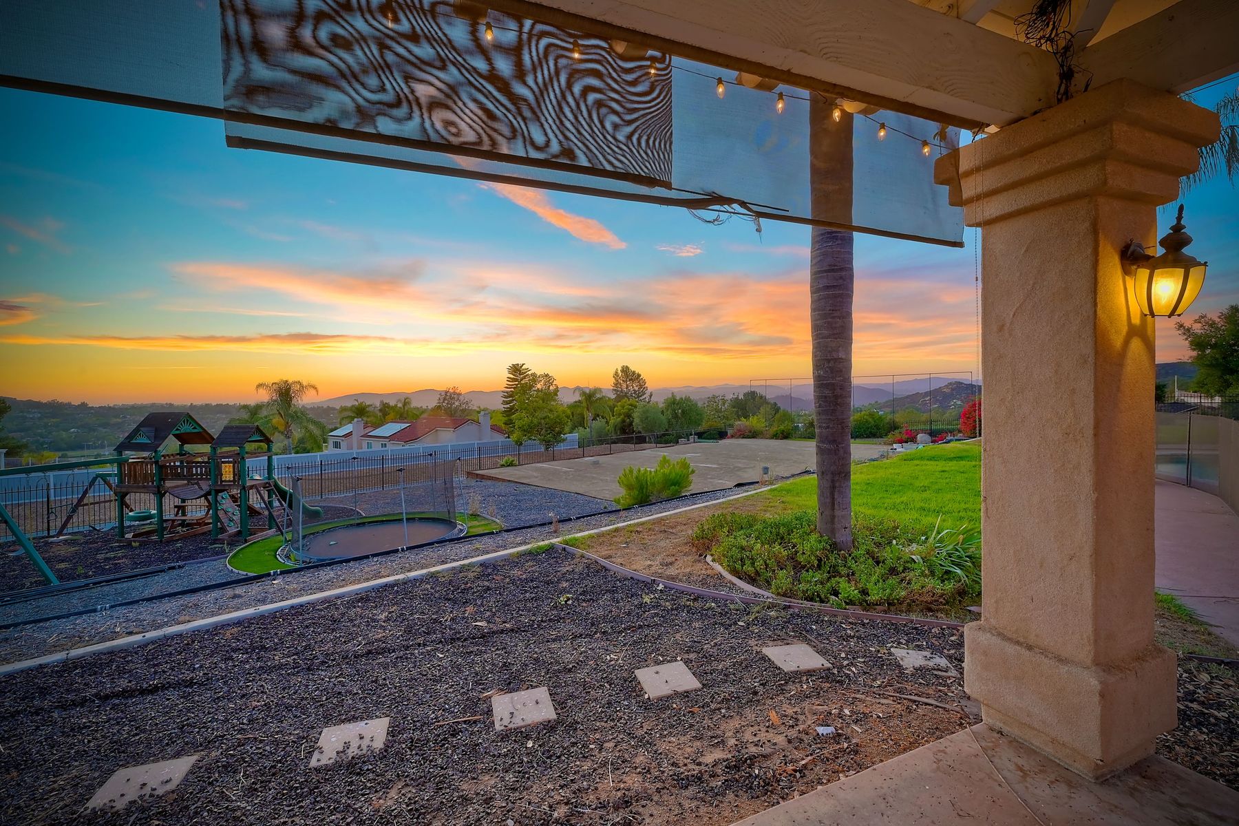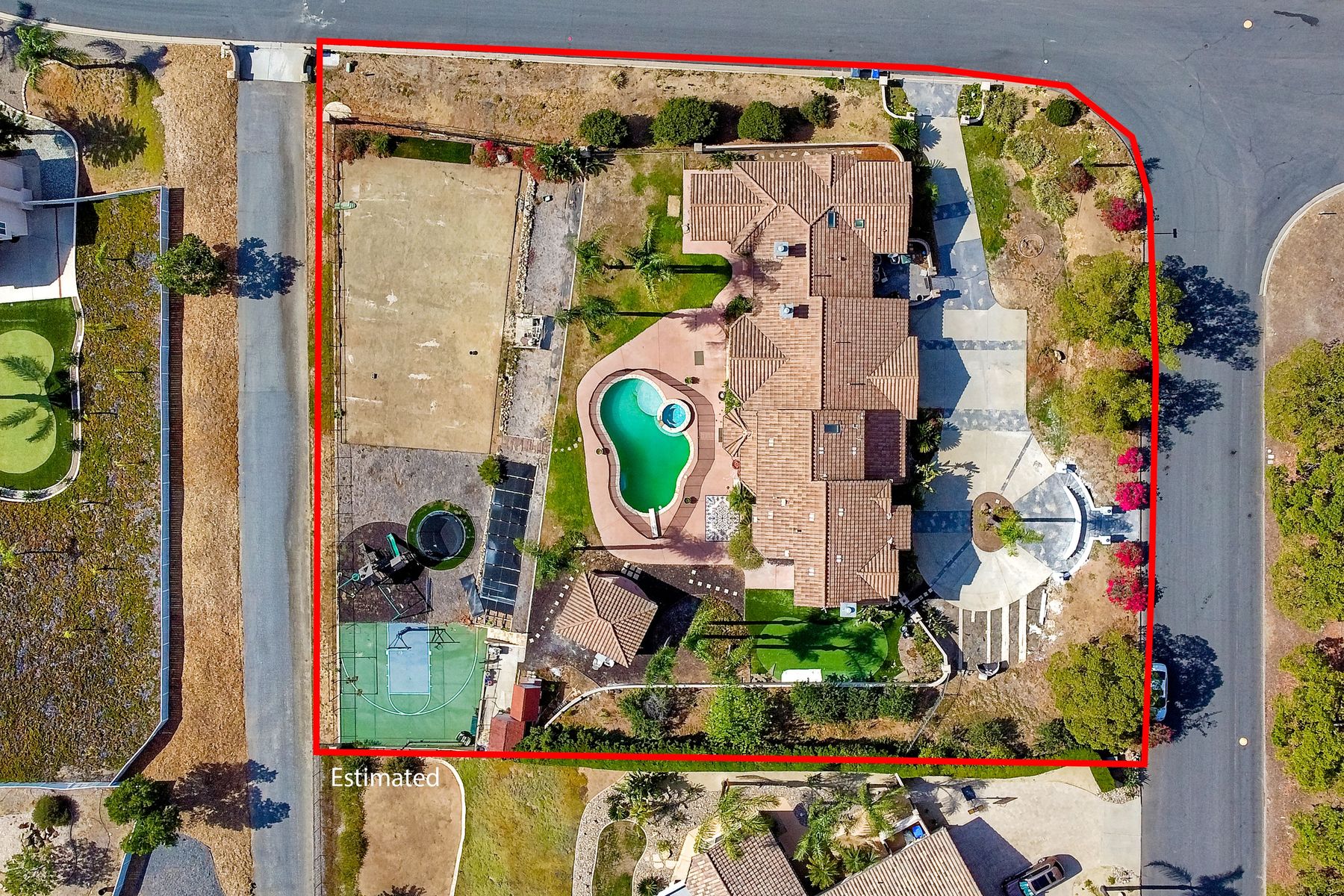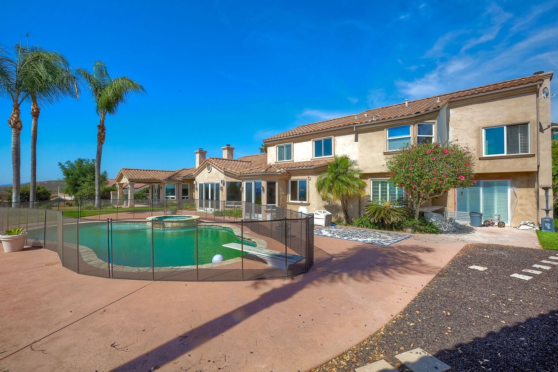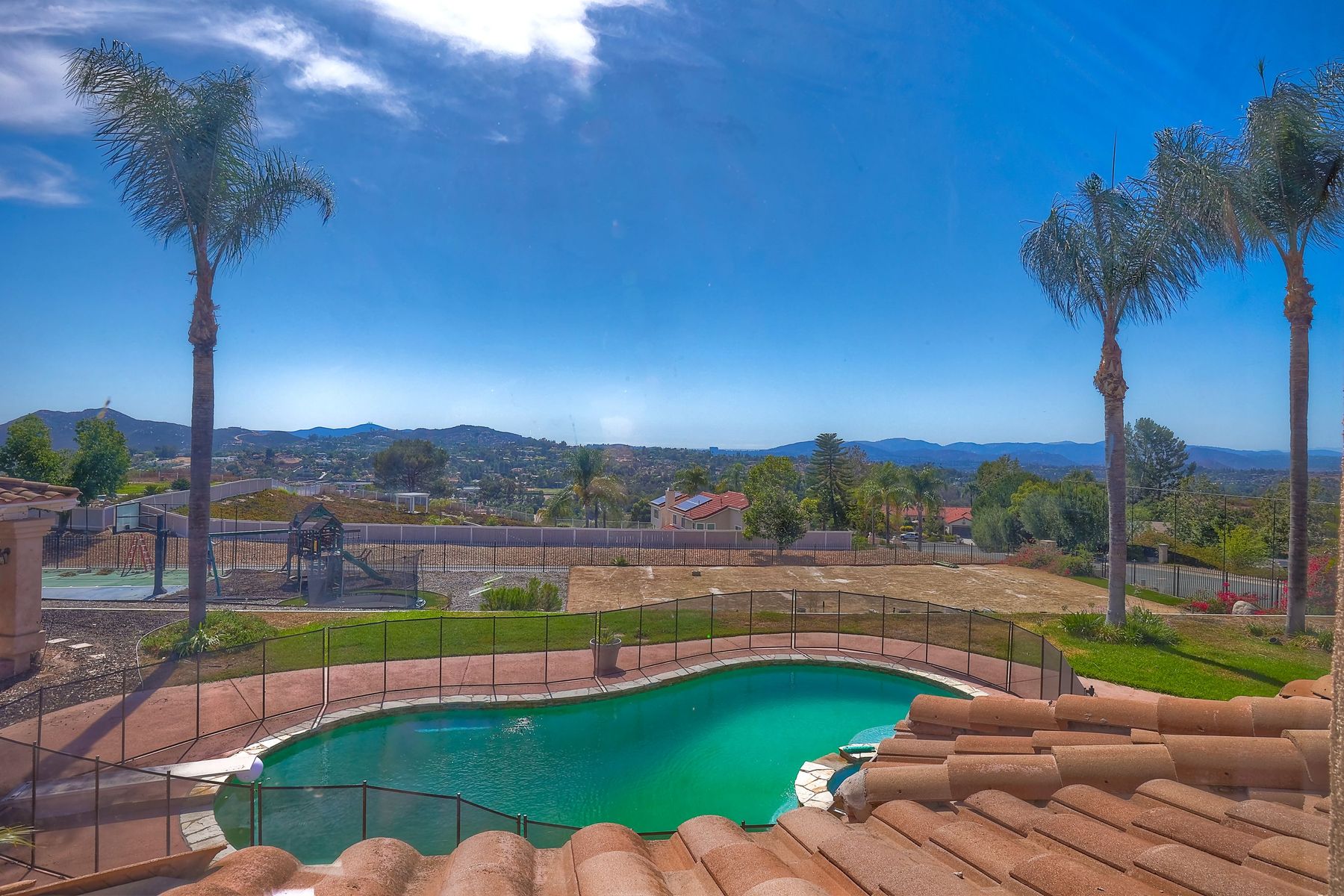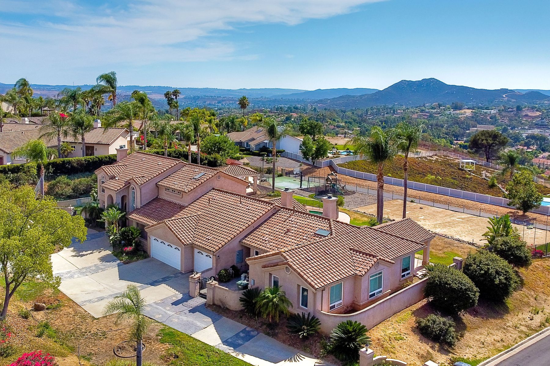 Luxury home with outstanding sunset views. Lovely neighborhood of Bridlewood Lakeside. Over 40,000 sq ft lot, includes basketball court, soccer field, play area with built in ground level trampoline and play swing set. Swimming pool with jacuzzi protected by security fencing. Relax in the oversized backyard patio with BBQ grill, fridge, sink with plenty of counter space. Guest home has it's own private entrance, along with full kitchen, dining area, laundry rm, one bedroom and it's own living room with french doors and private covered patio. Long private driveway, with grand entrance through the custom glass with iron double doors. Formal living with fire place and custom built cabinetry. Formal dining room has view of the lovely backyard with sitting areas. Downstairs office has custom built cabinets and desk. Large living room has bar area with fridge along with built in cabinets for your oversized TV. Shutters and crown molding throughout. All this and a highly rated Poway Unified school district