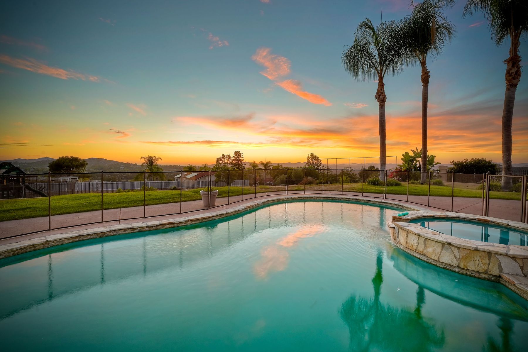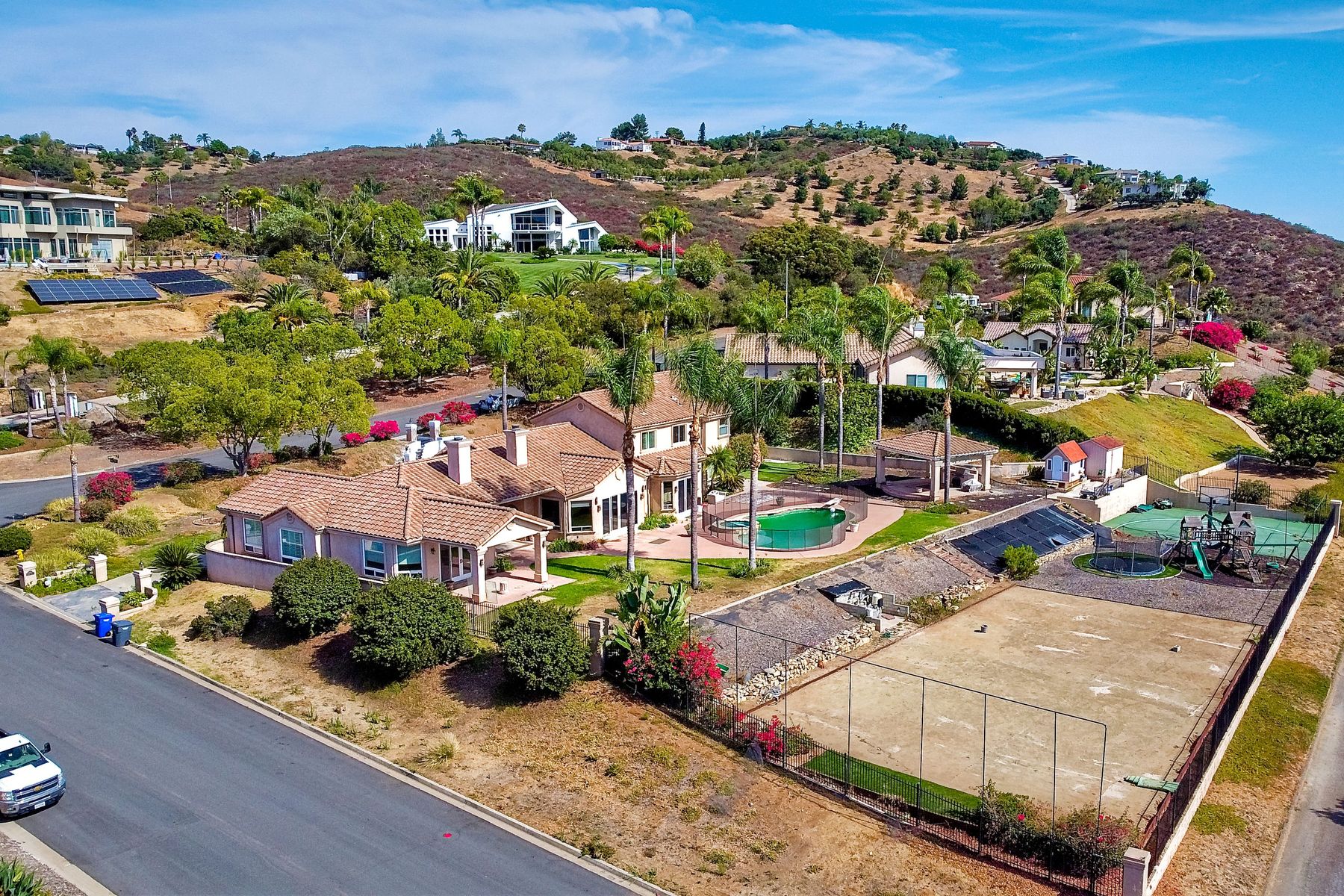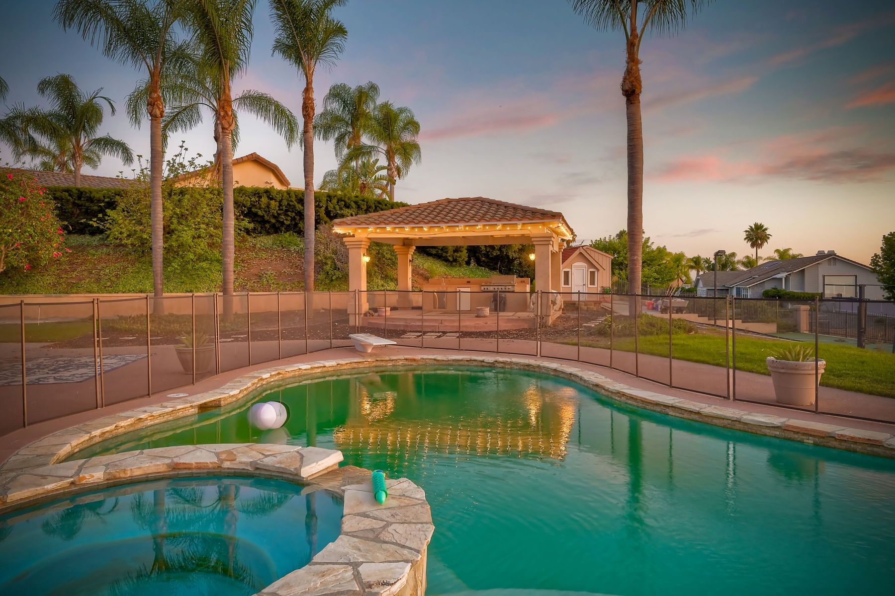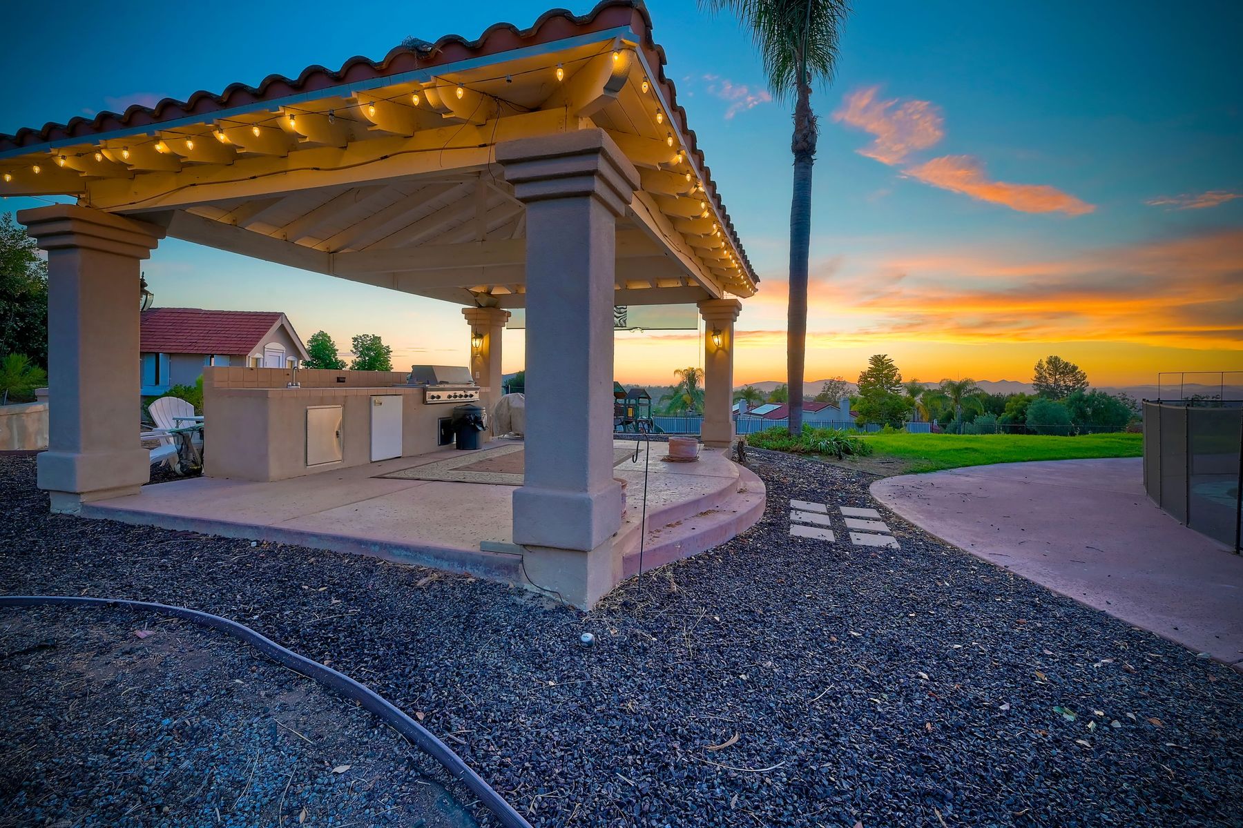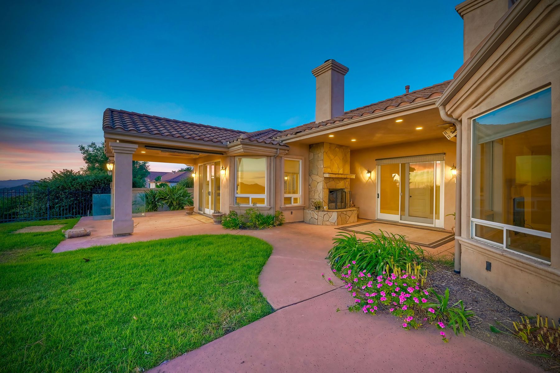 Luxury home with outstanding sunset views. Lovely neighborhood of Bridlewood Lakeside. Over 40,000 sq ft lot, includes basketball court, soccer field, play area with built in ground level trampoline and play swing set. Swimming pool with jacuzzi protected by security fencing. Relax in the oversized backyard patio with BBQ grill, fridge, sink with plenty of counter space. Guest home has it's own private entrance, along with full kitchen, dining area, laundry rm, one bedroom and it's own living room with french doors and private covered patio. Long private driveway, with grand entrance through the custom glass with iron double doors. Formal living with fire place and custom built cabinetry. Formal dining room has view of the lovely backyard with sitting areas. Downstairs office has custom built cabinets and desk. Large living room has bar area with fridge along with built in cabinets for your oversized TV. Shutters and crown molding throughout. All this and a highly rated Poway Unified school district