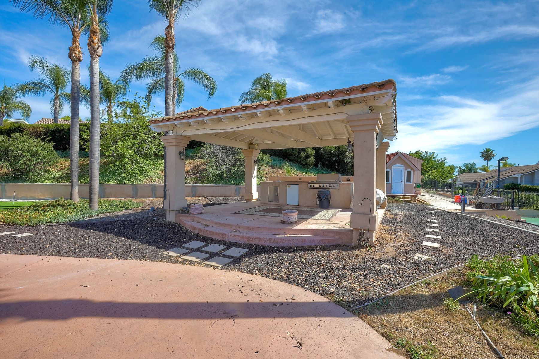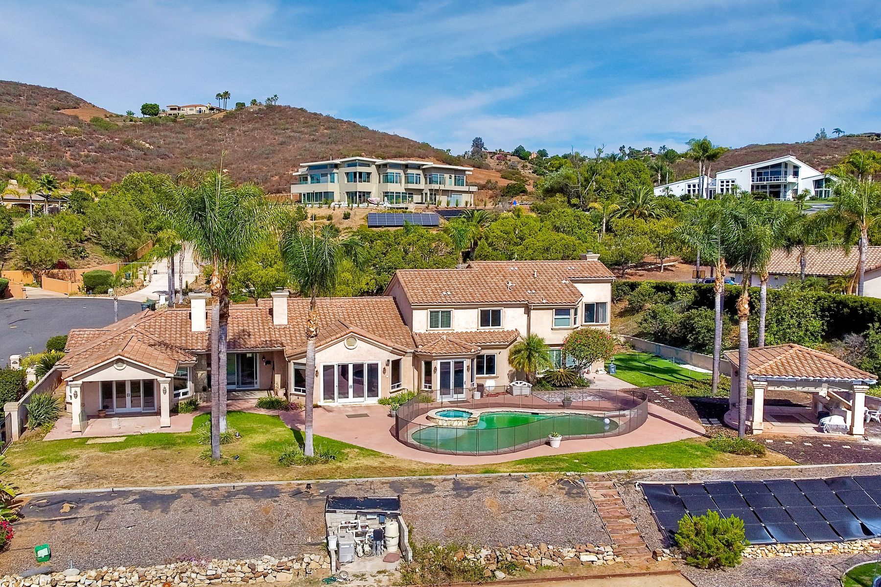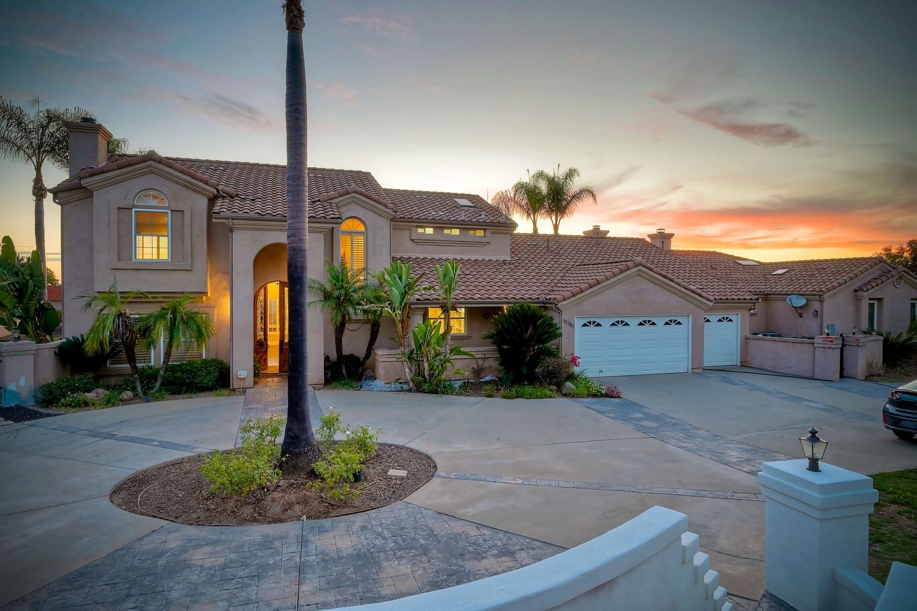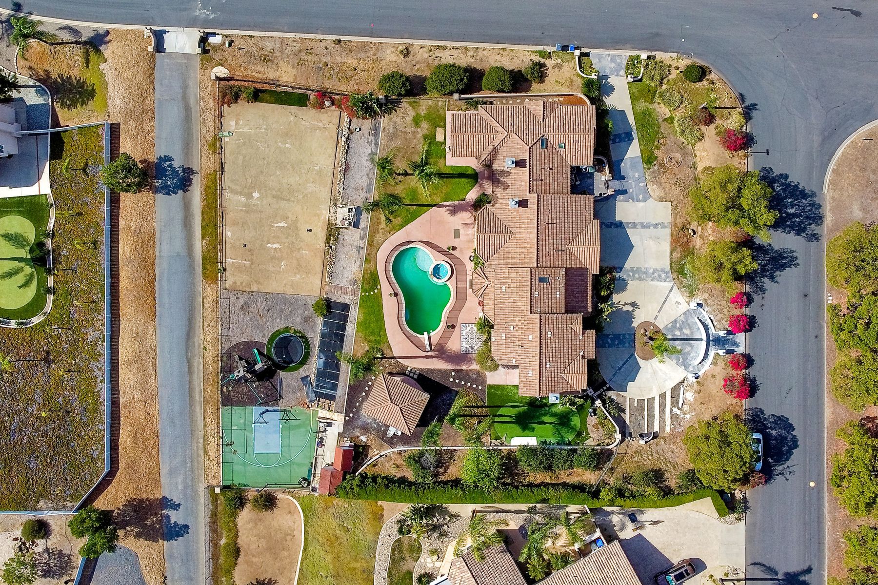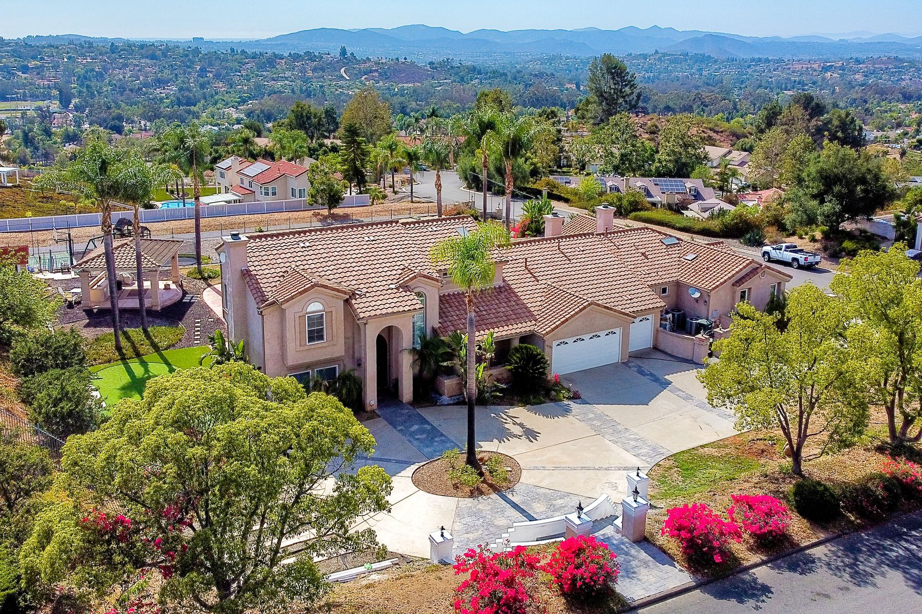 Luxury home with outstanding sunset views. Lovely neighborhood of Bridlewood Lakeside. Over 40,000 sq ft lot, includes basketball court, soccer field, play area with built in ground level trampoline and play swing set. Swimming pool with jacuzzi protected by security fencing. Relax in the oversized backyard patio with BBQ grill, fridge, sink with plenty of counter space. Guest home has it's own private entrance, along with full kitchen, dining area, laundry rm, one bedroom and it's own living room with french doors and private covered patio. Long private driveway, with grand entrance through the custom glass with iron double doors. Formal living with fire place and custom built cabinetry. Formal dining room has view of the lovely backyard with sitting areas. Downstairs office has custom built cabinets and desk. Large living room has bar area with fridge along with built in cabinets for your oversized TV. Shutters and crown molding throughout. All this and a highly rated Poway Unified school district