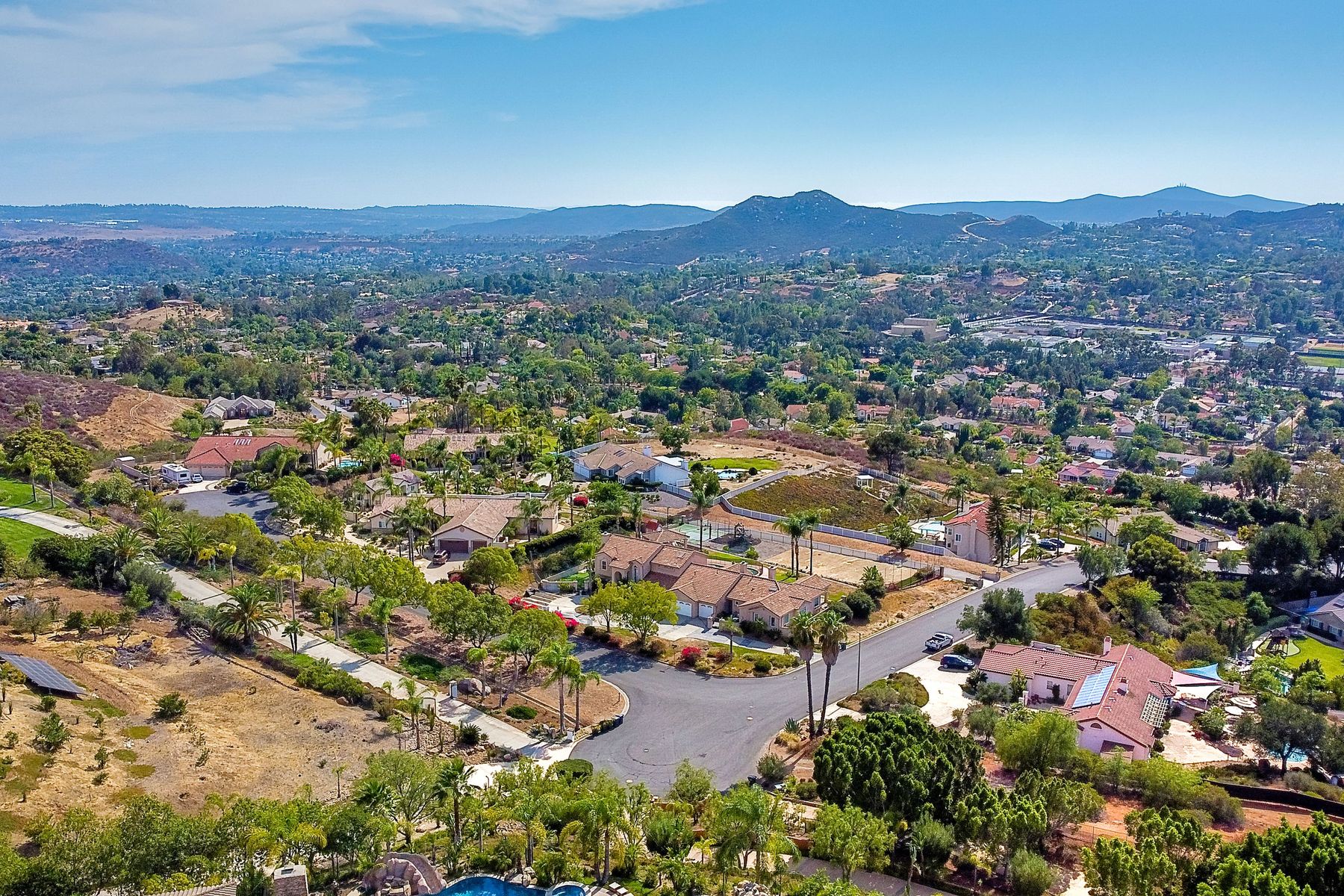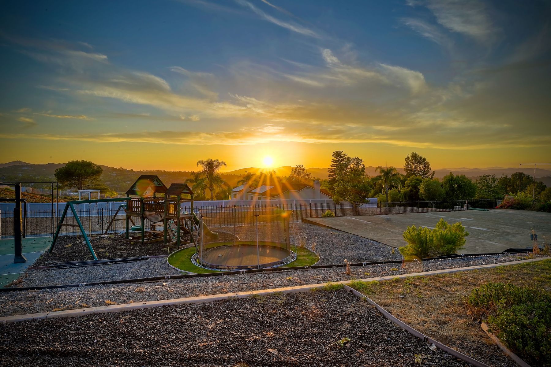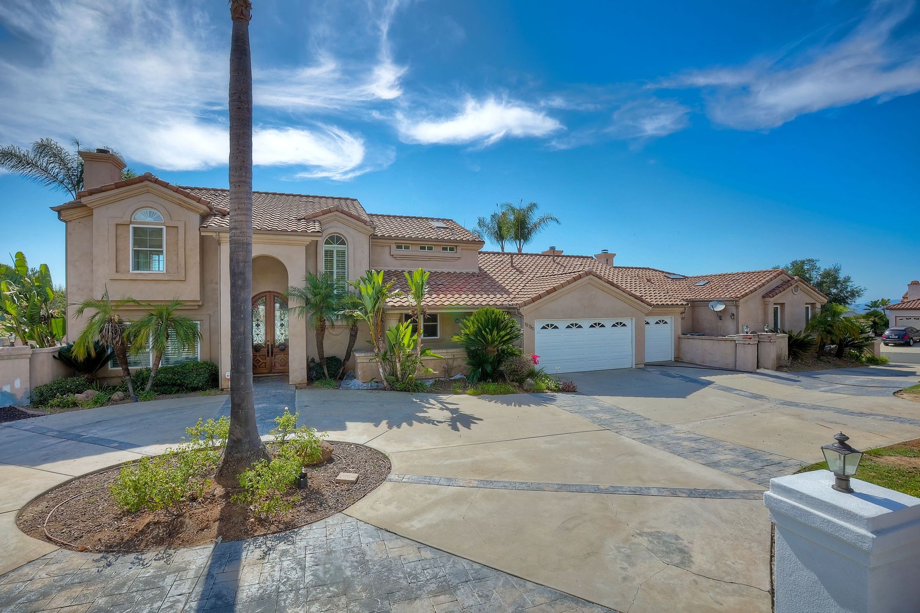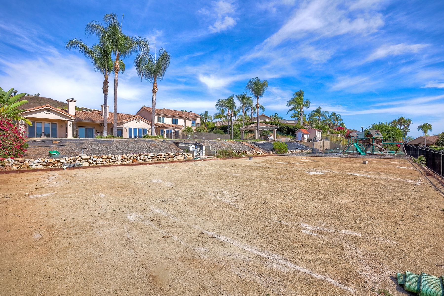 Luxury home with outstanding sunset views. Lovely neighborhood of Bridlewood Lakeside. Over 40,000 sq ft lot, includes basketball court, soccer field, play area with built in ground level trampoline and play swing set. Swimming pool with jacuzzi protected by security fencing. Relax in the oversized backyard patio with BBQ grill, fridge, sink with plenty of counter space. Guest home has it's own private entrance, along with full kitchen, dining area, laundry rm, one bedroom and it's own living room with french doors and private covered patio. Long private driveway, with grand entrance through the custom glass with iron double doors. Formal living with fire place and custom built cabinetry. Formal dining room has view of the lovely backyard with sitting areas. Downstairs office has custom built cabinets and desk. Large living room has bar area with fridge along with built in cabinets for your oversized TV. Shutters and crown molding throughout. All this and a highly rated Poway Unified school district