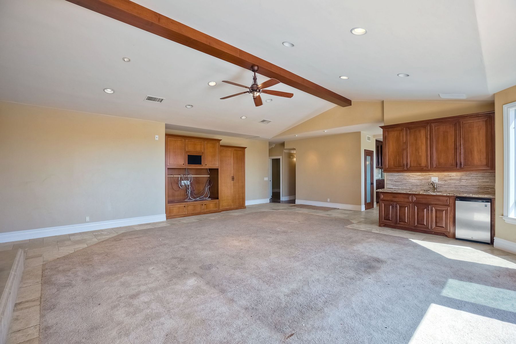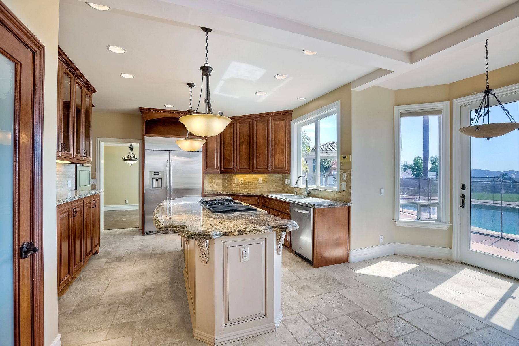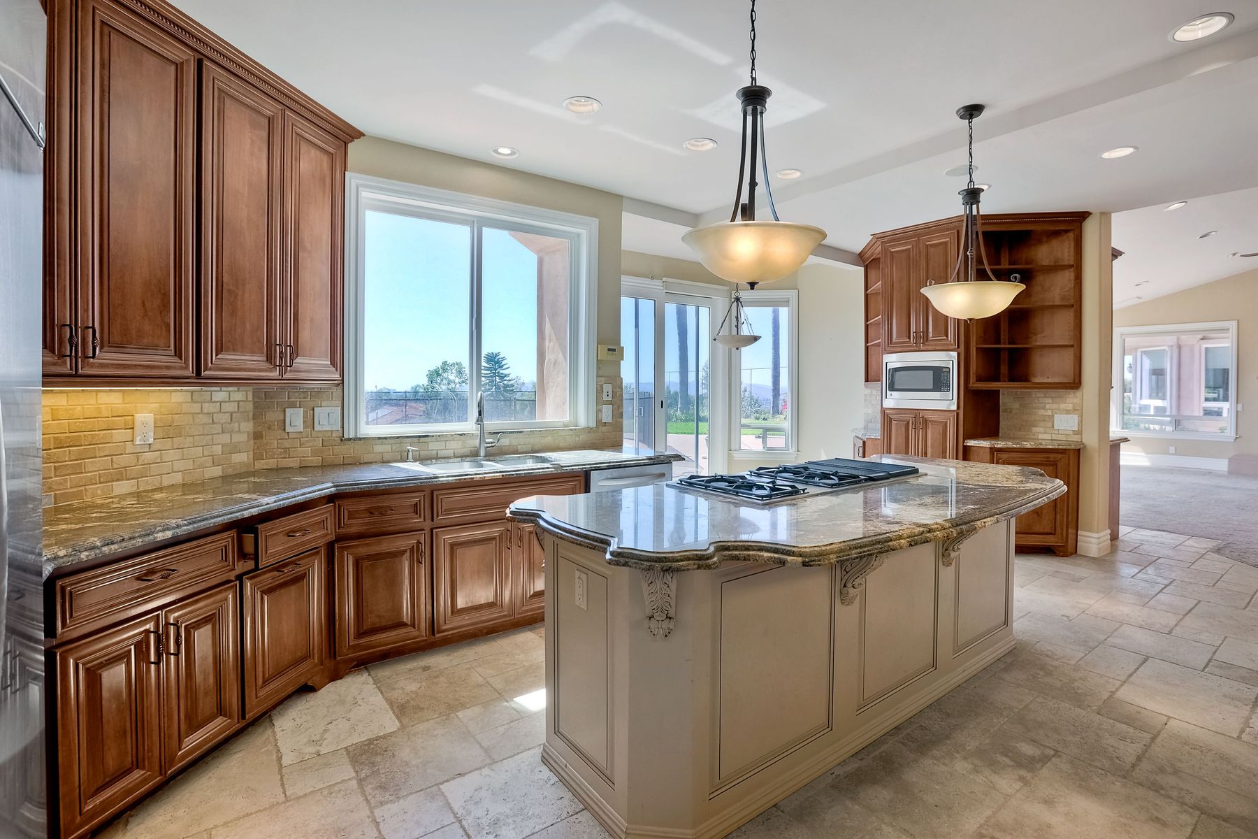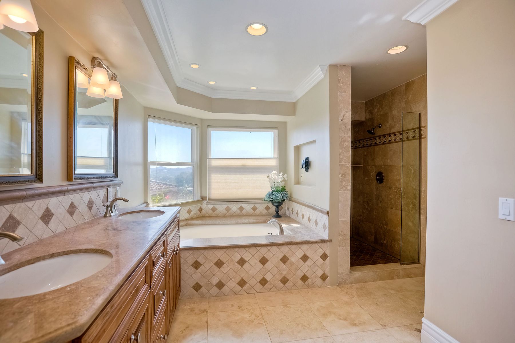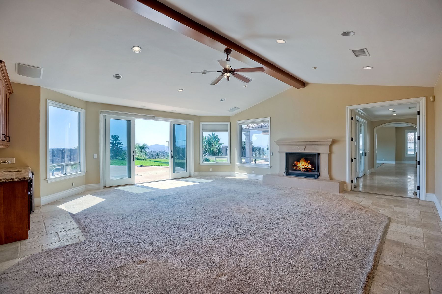 Luxury home with outstanding sunset views. Lovely neighborhood of Bridlewood Lakeside. Over 40,000 sq ft lot, includes basketball court, soccer field, play area with built in ground level trampoline and play swing set. Swimming pool with jacuzzi protected by security fencing. Relax in the oversized backyard patio with BBQ grill, fridge, sink with plenty of counter space. Guest home has it's own private entrance, along with full kitchen, dining area, laundry rm, one bedroom and it's own living room with french doors and private covered patio. Long private driveway, with grand entrance through the custom glass with iron double doors. Formal living with fire place and custom built cabinetry. Formal dining room has view of the lovely backyard with sitting areas. Downstairs office has custom built cabinets and desk. Large living room has bar area with fridge along with built in cabinets for your oversized TV. Shutters and crown molding throughout. All this and a highly rated Poway Unified school district