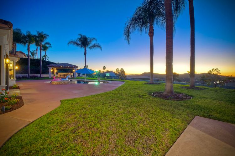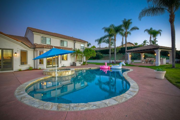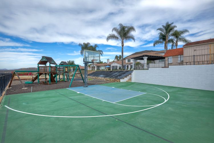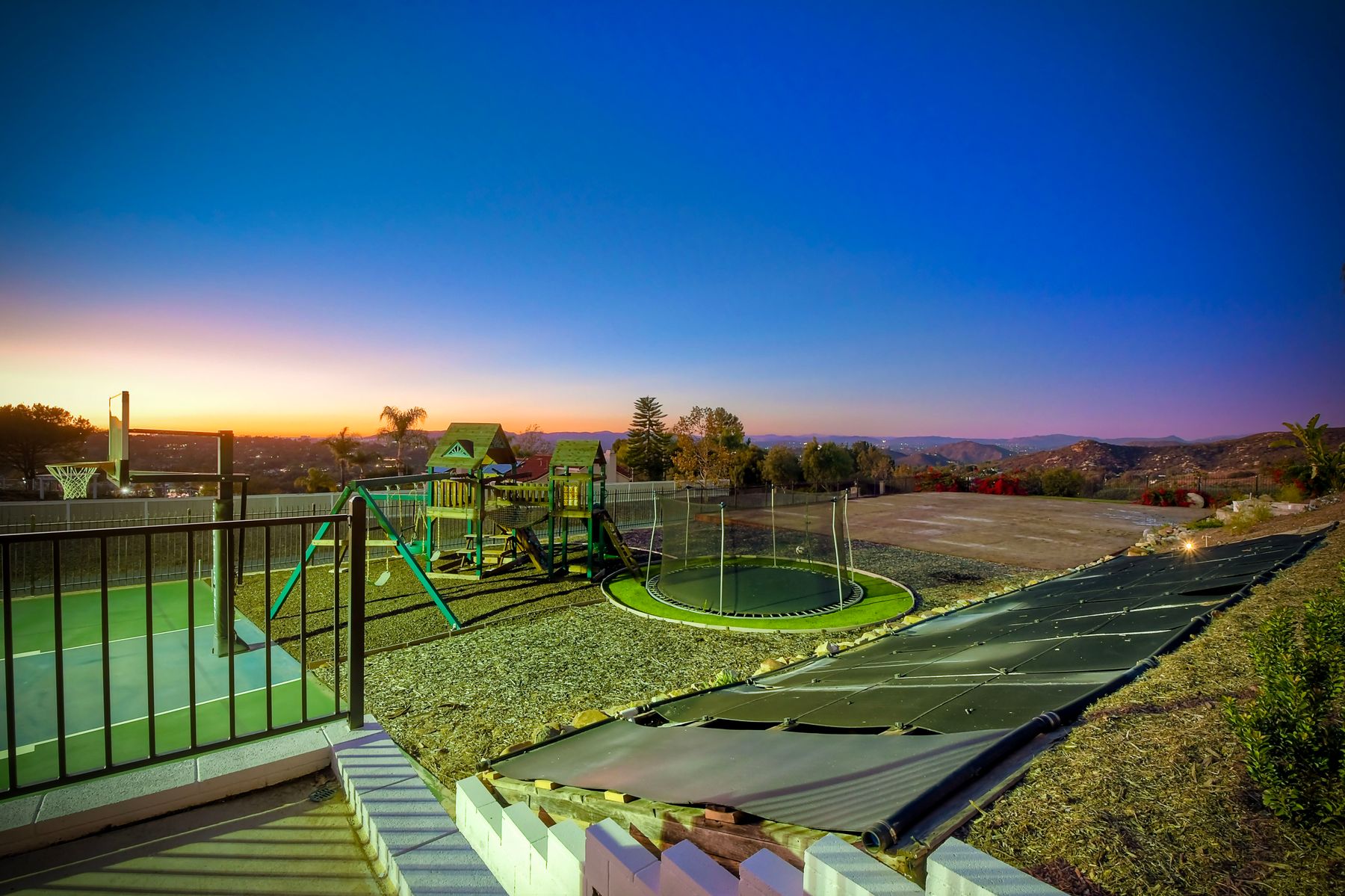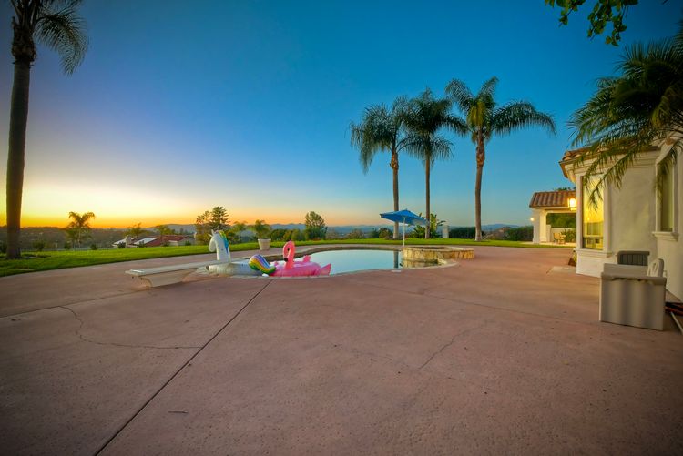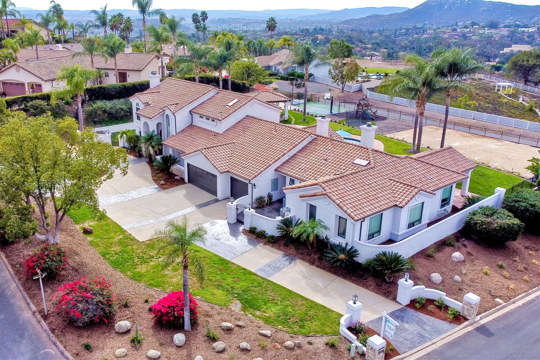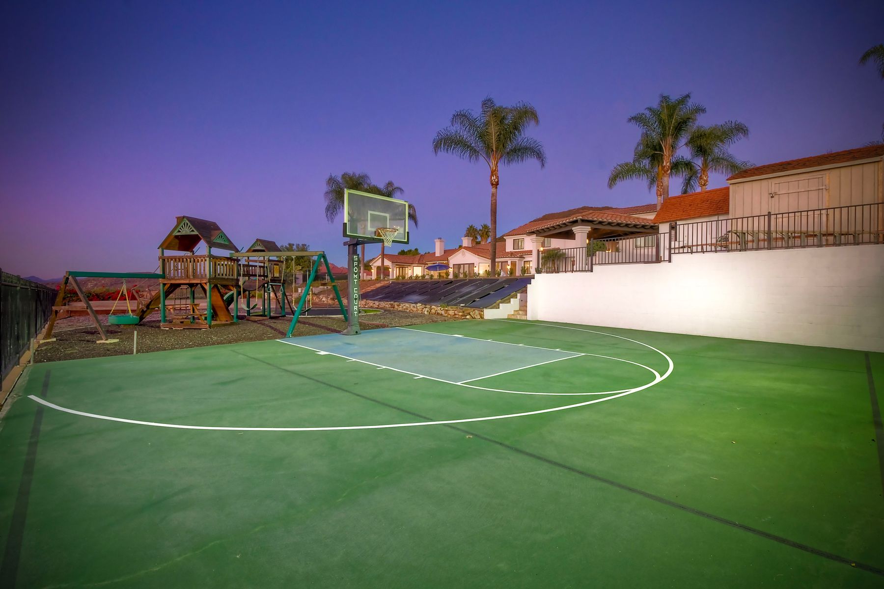 Luxury, re-modeled home with outstanding sunset views! Lovely neighborhood of Bridlewood Lakeside. Over 40,000 sq ft lot, includes basketball court, play area with built in ground level trampoline and play swing set. Swimming pool with jacuzzi. Relax in the oversized backyard patio with BBQ grill, fridge, sink and plenty of counter space. Long private driveway. Grand entrance through the iron double doors with custom glass. Formal living with fireplace. Formal dining room has view of the beautiful, serene backyard with multiple sitting areas. Downstairs office has custom built cabinets and desk. Shutters and crown molding throughout. GUEST HOME has its own private entrance, along with full kitchen, dining area, laundry room, one bedroom and its own living room with French doors and private covered patio. RECENT IMPROVEMENTS INCLUDE: EXTERIOR: The front and back yards have been professionally designed and landscaped! Sealed and stained the stamped concrete in the driveway. NEW Marathon grass installed. Upgraded irrigation system to include 36 NEW automatic sprinkler valves and NEW electronic sprinkler control panel. Installed 29 NEW exterior lights-10 column and 19 wall mounts. Pressure washed the roof and replaced or repaired all roof tiles which were damaged. Had the roof inspected by a roofing contractor. POOL: Installed a NEW glass pebble finish in the pool and installed two NEW LED lights in the pool and spa. Installed NEW mastic around the pools edge. In the PAVILLION: Installed a NEW 48 inch Bull BBQ and NEW designer tile countertop and backsplash!. Installed NEW cafe lighting. NEW refrigerator (on order). INTERIOR: Professionally painted interior and exterior! NEW top of the line wood flooring installed throughout the home! NEW designer paint colors throughout. NEW granite countertop on the island in the kitchen. NEW designer wallpaper in the dining room and powder room. NEW mirrored closet doors in a bedroom and NEW closet shelving in two bedrooms. NEW faucets installed in the kitchen, master bedroom, ADU bathroom and guest bathroom. NEW ceiling fans installed in all 4 bedrooms, plus family room and office! NEW lighting in the dining room, kitchen and bathrooms. One NEW 50 gallon water heater with an additional 5 year warranty purchased. A/C units and heaters were professional serviced and inspected by licensed contractor. Installed three NEW Nest Thermostats and filters. 78 new LED trim lighting installed in all recess cans. All this and a highly rated Poway Unified school district! Please see the attached Improvement list(s) for all upgrades and improvements made to the property within the past few months!