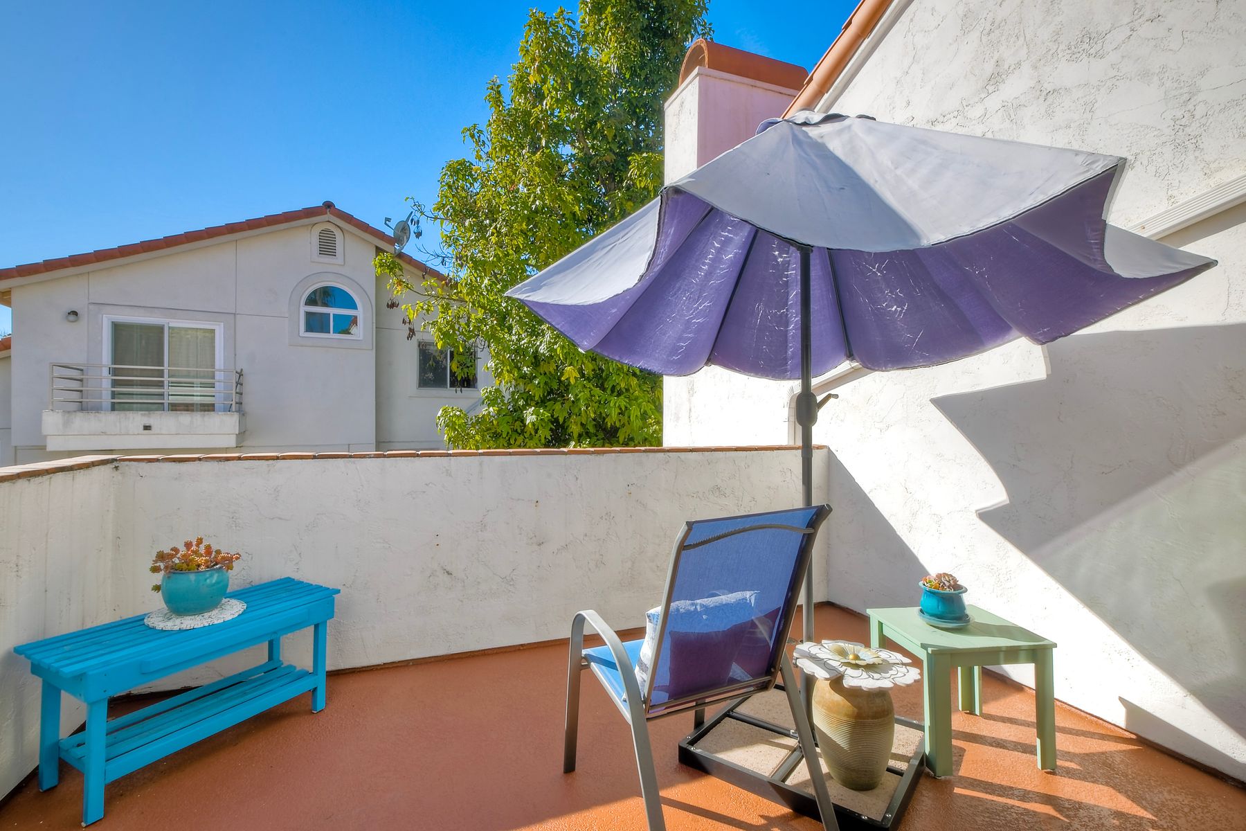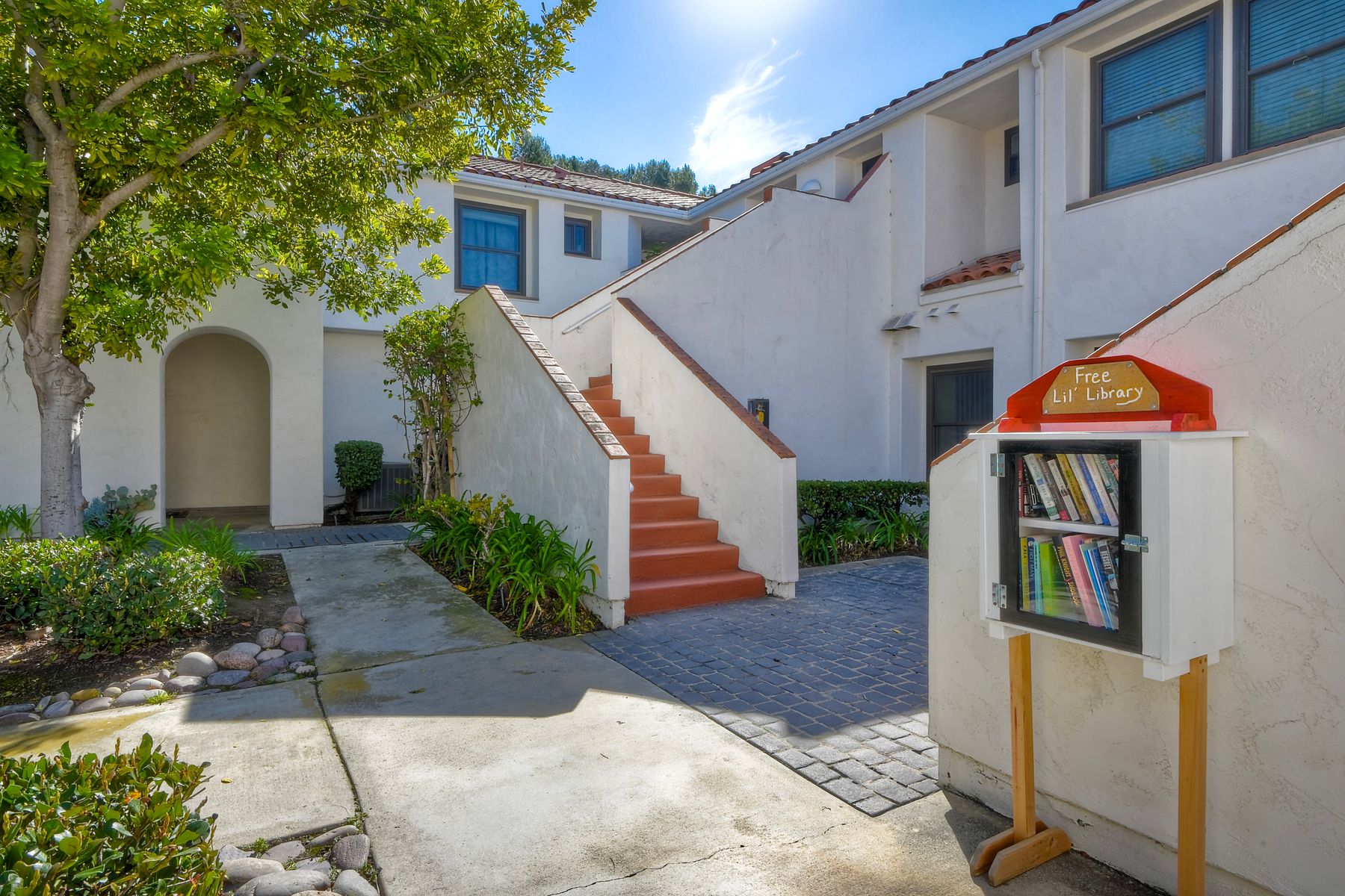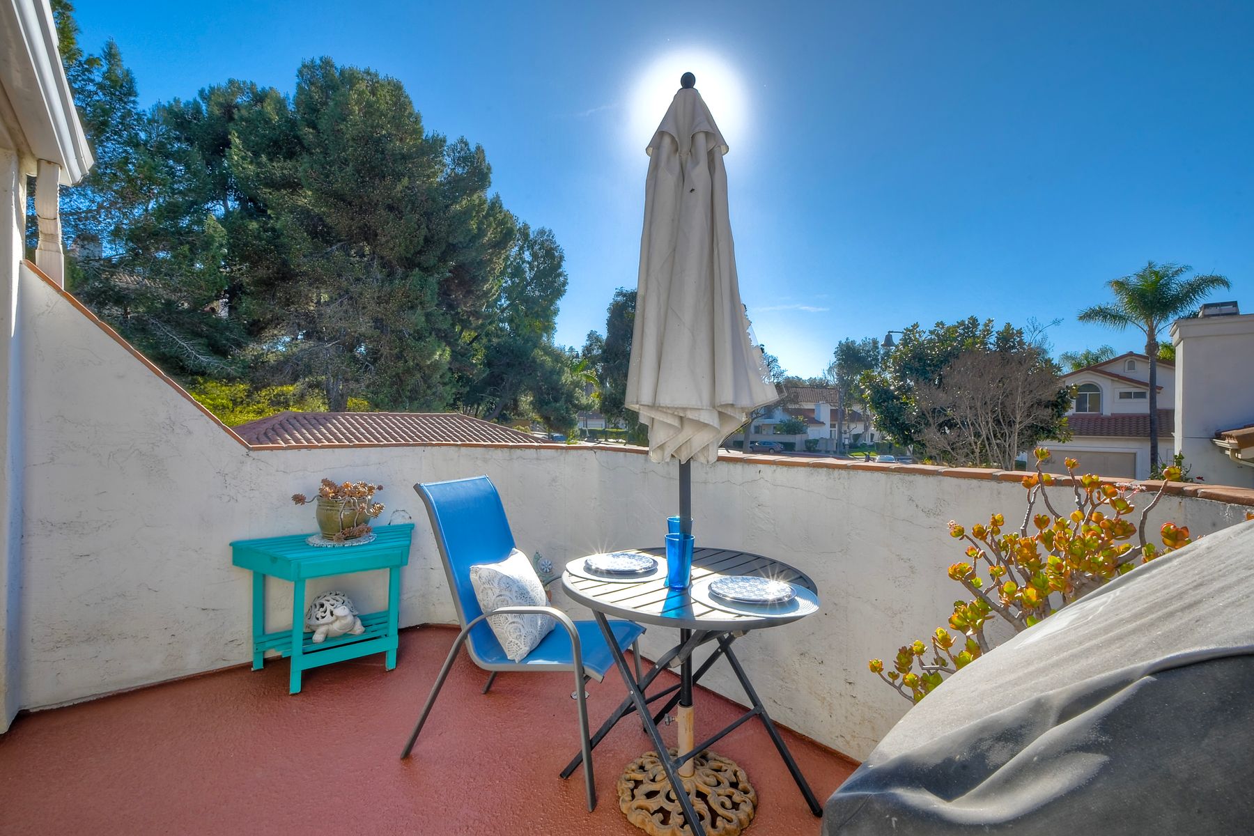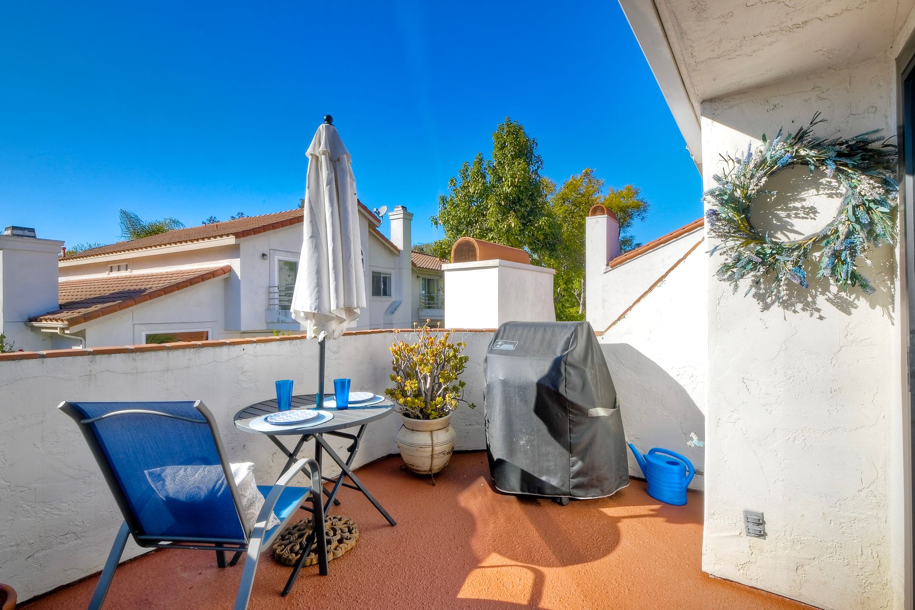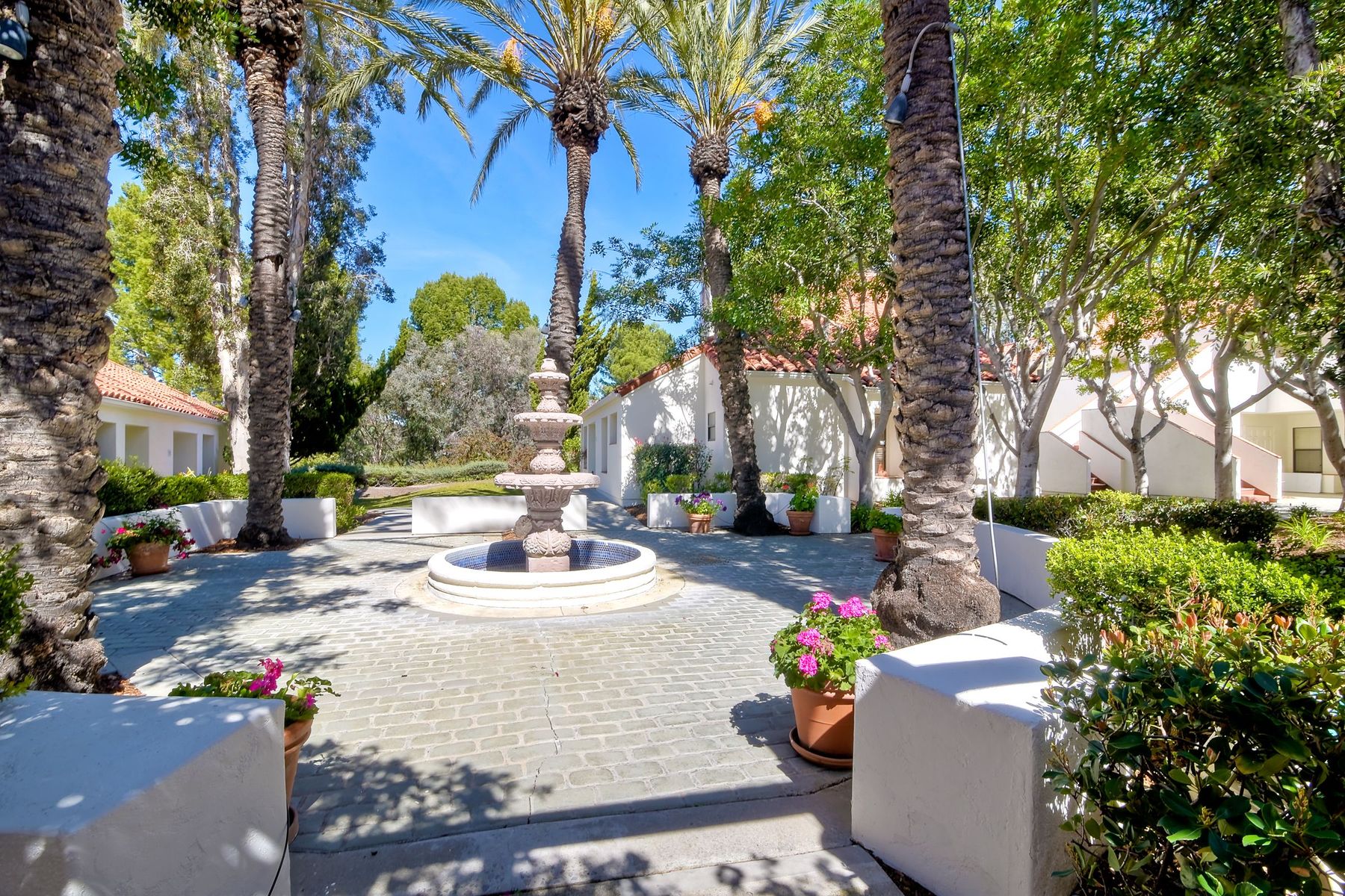 Stunning 3 bedroom, 2.5 bath condo in the coveted Rancho Bernardo gated community of Palazzo Bernardo. Walking past the fountain in the beautifully landscaped courtyard, up the private stairway to this corner unit, you reach the entry of this fabulously updated home. Entering the living room, you experience the light, open floor plan. The living rooms vaulted ceiling, vinyl plank flooring, large windows, statement tiled gas fireplace and easy flow to the dining room create a welcoming gathering place. The kitchen combines the vaulted ceiling, recessed lighting, stainless steel appliances, custom white cabinets, expansive back splash, peninsula seating for 4, pendant lighting and open shelving to compliment the dramatic Quartzite counter tops. The generous eat in area offers a beverage fridge, open shelving and sliding glass door to a private balcony. Walking through the double doors of the primary retreat you appreciate the calming colors, vinyl plank flooring, chandelier and sliding glass doors to another private balcony. The lovely bathroom has separate vanities complimented by framed mirrors, a walk in closet and exquisitely tiled shower. A list of amenities is attached so you can appreciate the scope of upgrades to this lovely home. HOA fee includes the communities private pool/jacuzzi and the Bernardo Heights Recreation Club with its incredible amenities. Includes fire and exterior insurance, gate, water, trash, insurance, common area and exterior building maintenance.