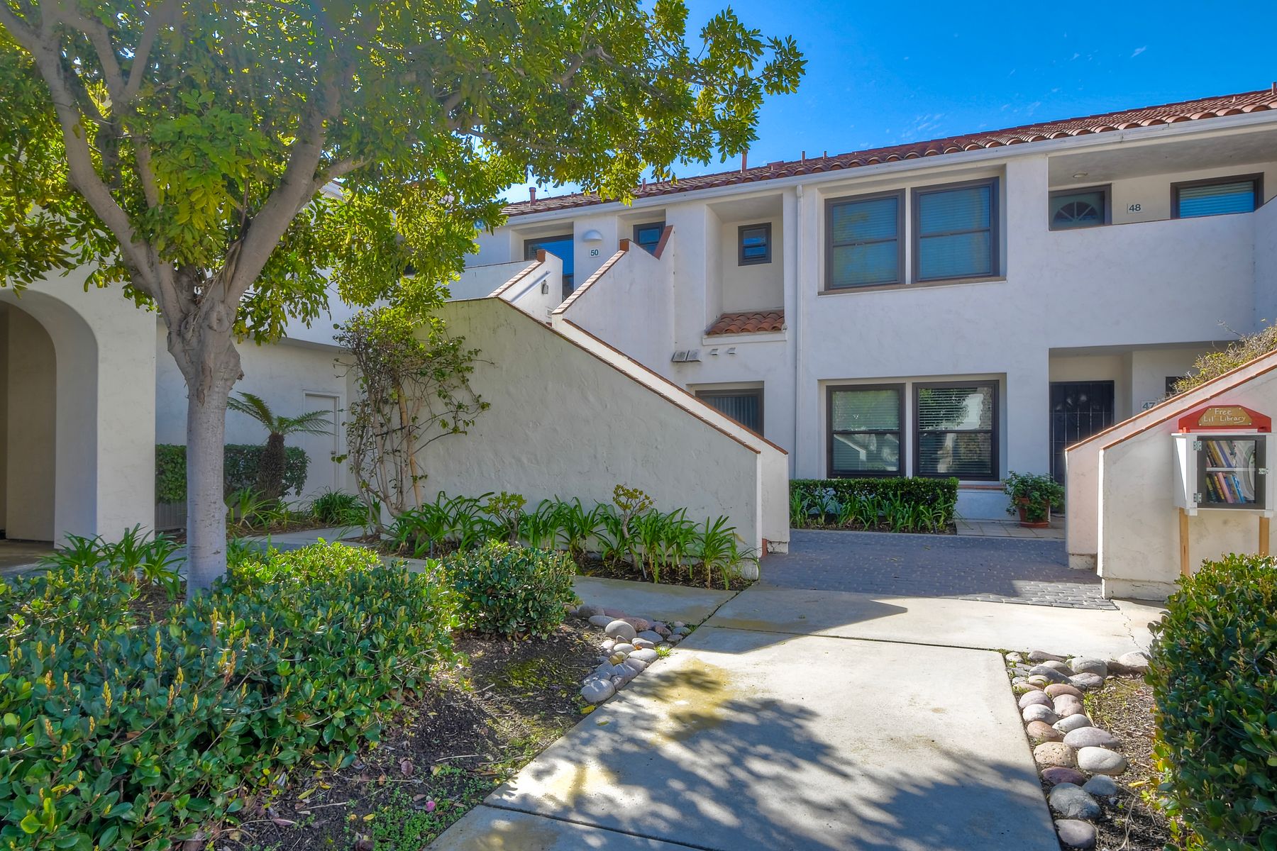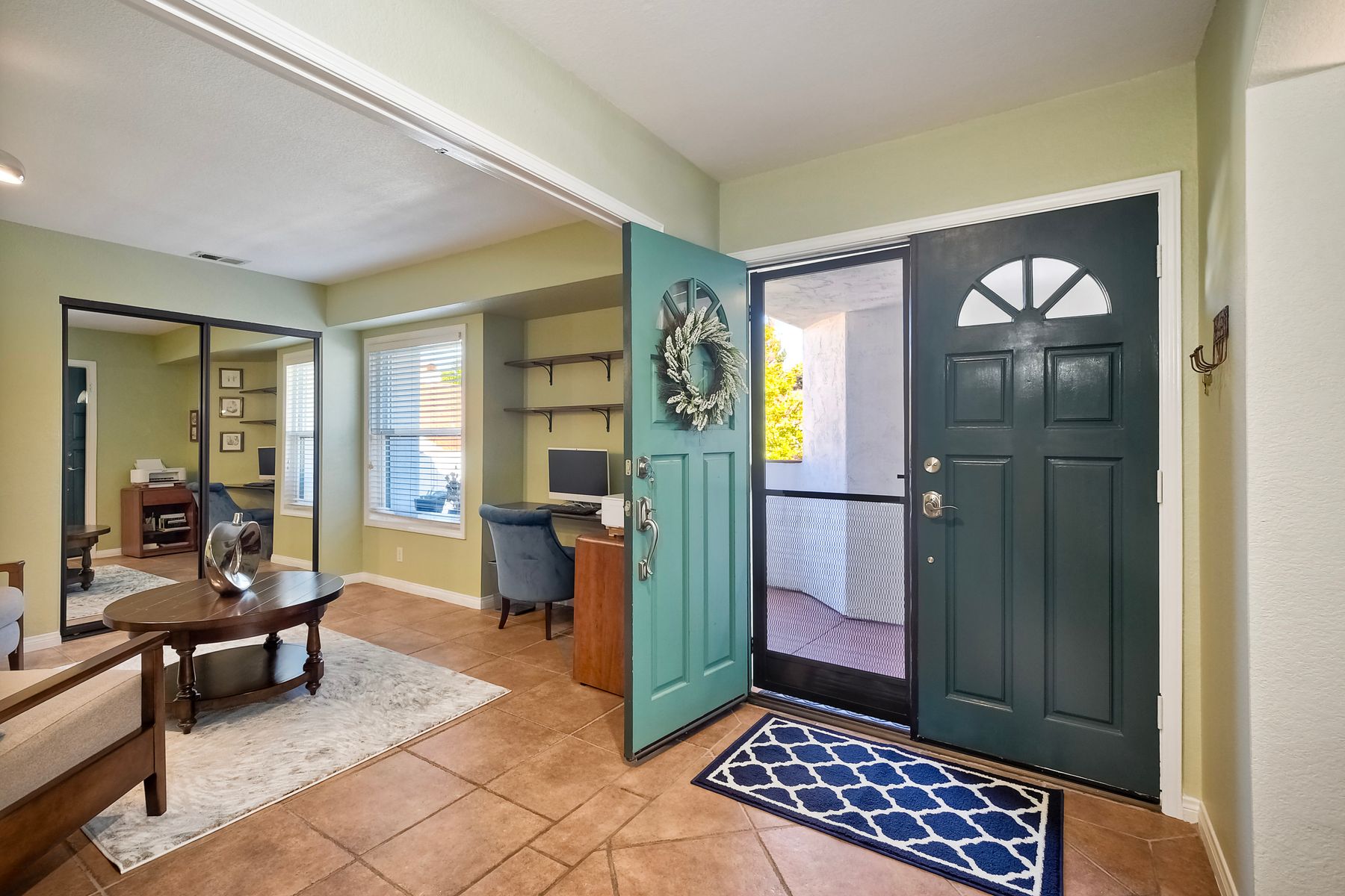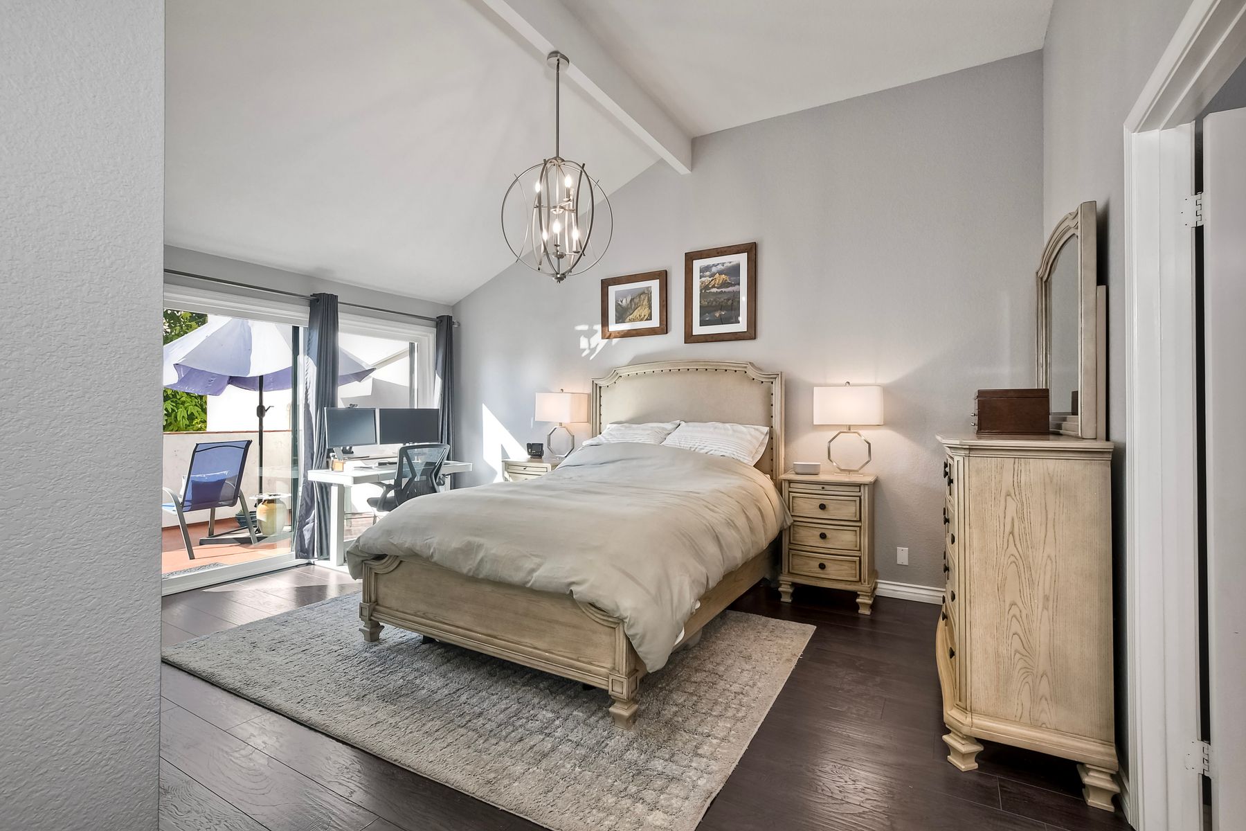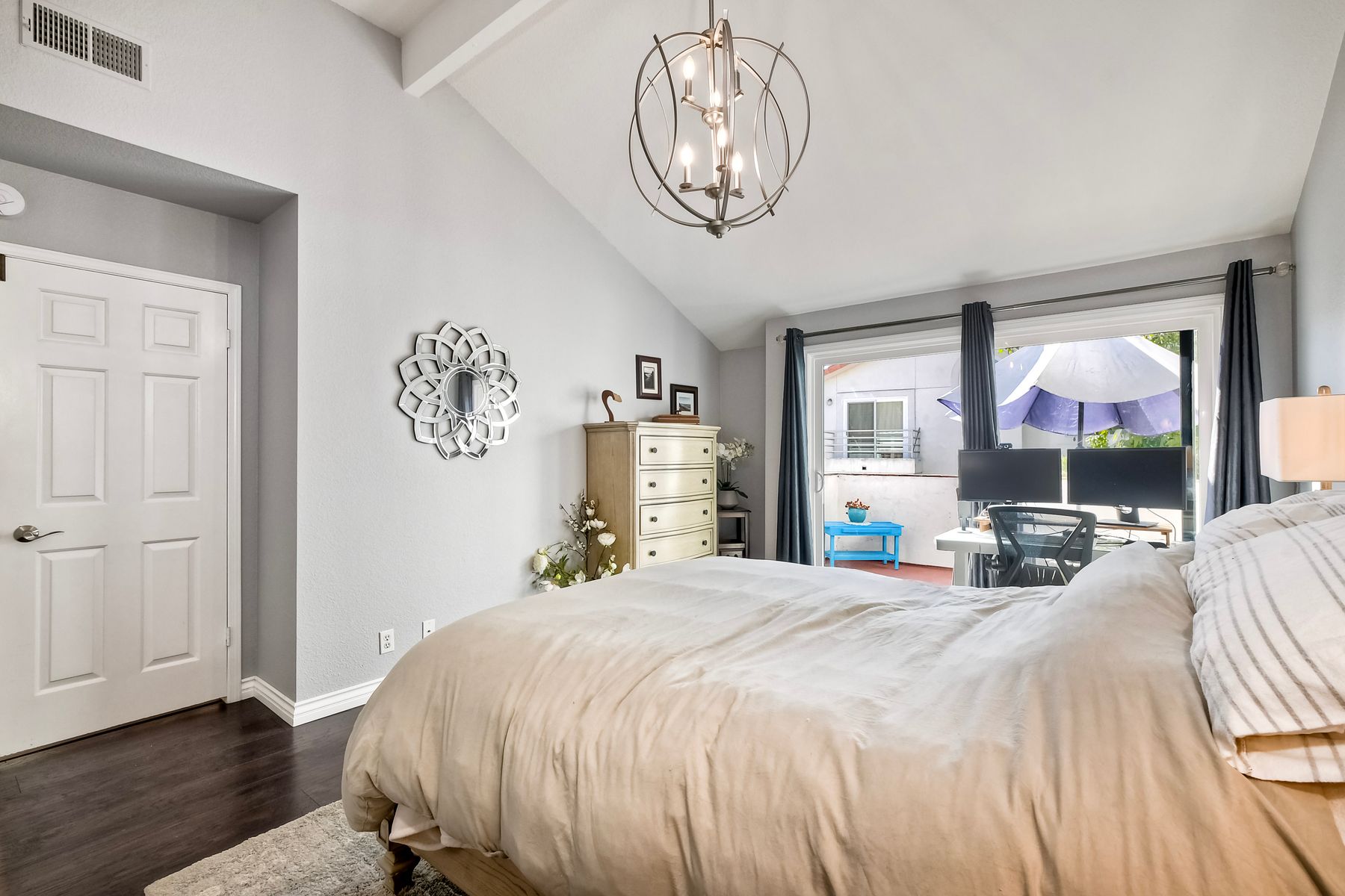 Stunning 3 bedroom, 2.5 bath condo in the coveted Rancho Bernardo gated community of Palazzo Bernardo. Walking past the fountain in the beautifully landscaped courtyard, up the private stairway to this corner unit, you reach the entry of this fabulously updated home. Entering the living room, you experience the light, open floor plan. The living rooms vaulted ceiling, vinyl plank flooring, large windows, statement tiled gas fireplace and easy flow to the dining room create a welcoming gathering place. The kitchen combines the vaulted ceiling, recessed lighting, stainless steel appliances, custom white cabinets, expansive back splash, peninsula seating for 4, pendant lighting and open shelving to compliment the dramatic Quartzite counter tops. The generous eat in area offers a beverage fridge, open shelving and sliding glass door to a private balcony. Walking through the double doors of the primary retreat you appreciate the calming colors, vinyl plank flooring, chandelier and sliding glass doors to another private balcony. The lovely bathroom has separate vanities complimented by framed mirrors, a walk in closet and exquisitely tiled shower. A list of amenities is attached so you can appreciate the scope of upgrades to this lovely home. HOA fee includes the communities private pool/jacuzzi and the Bernardo Heights Recreation Club with its incredible amenities. Includes fire and exterior insurance, gate, water, trash, insurance, common area and exterior building maintenance.