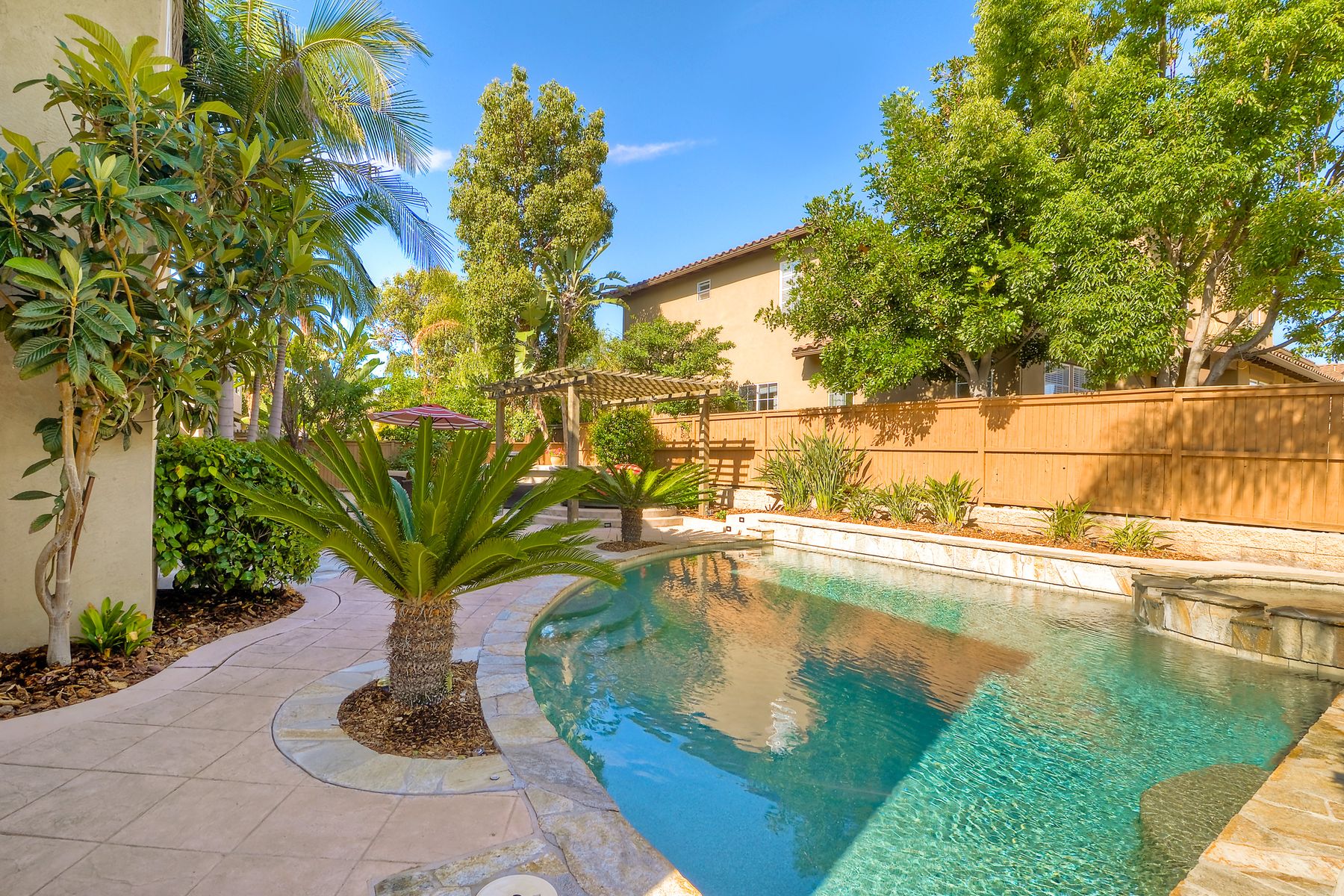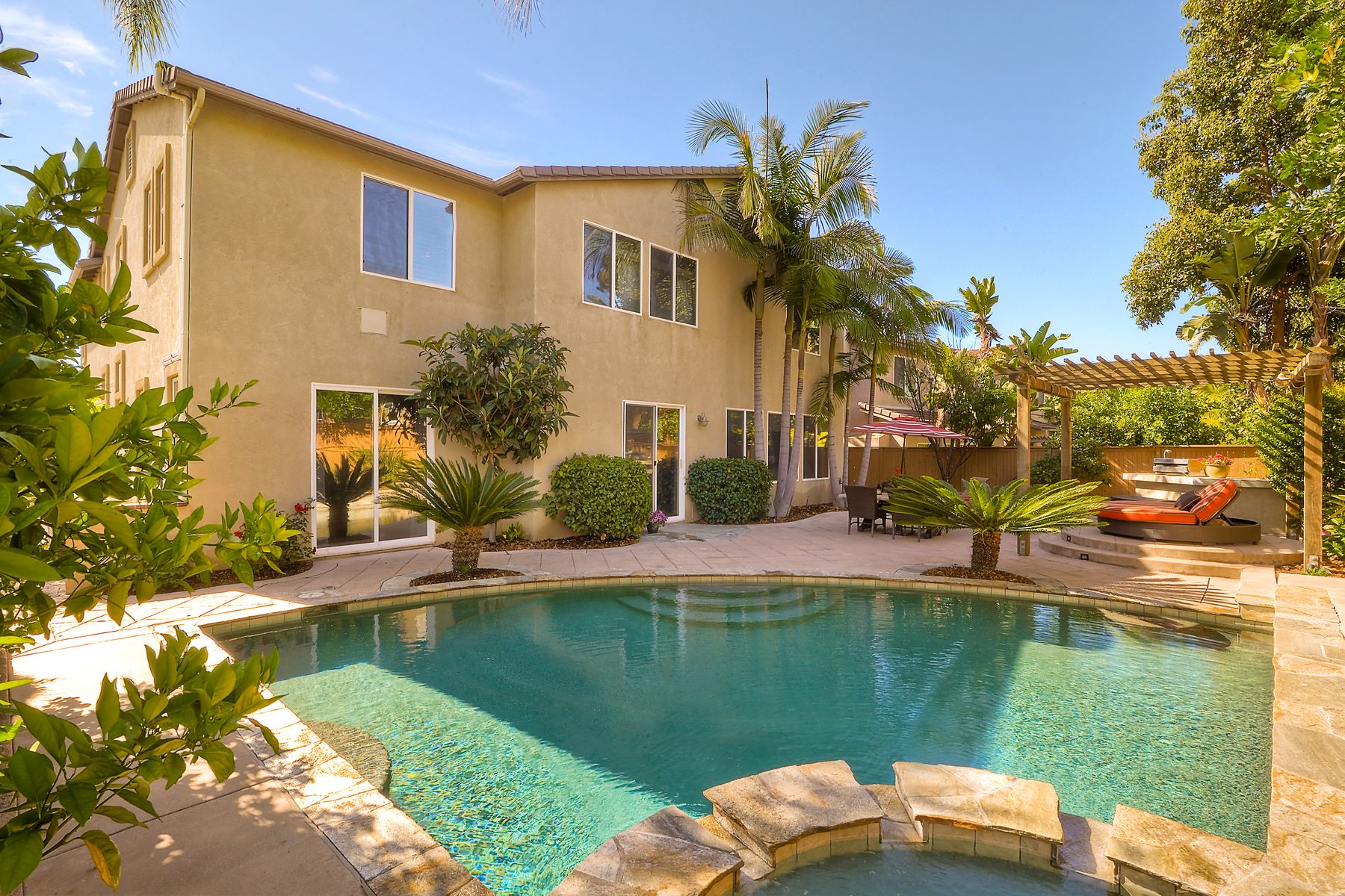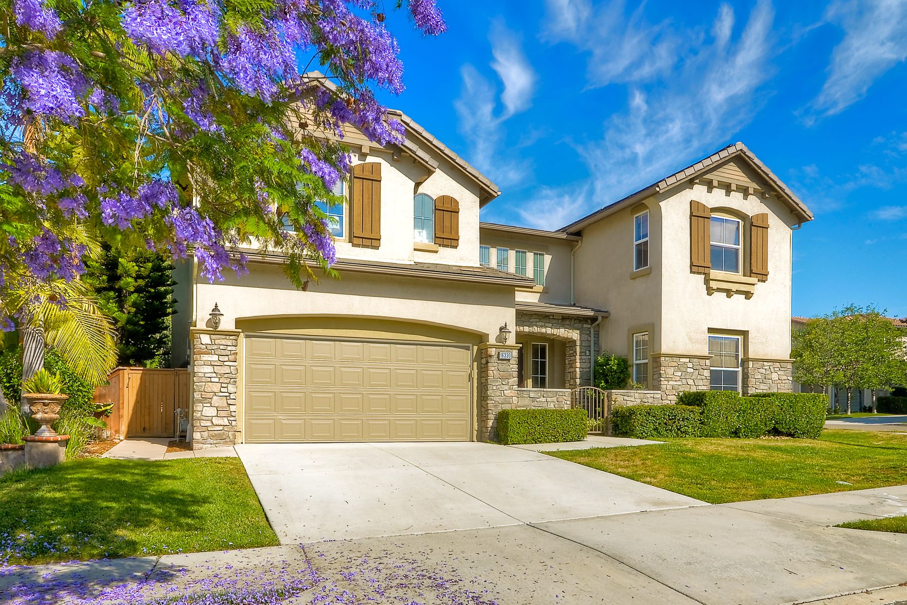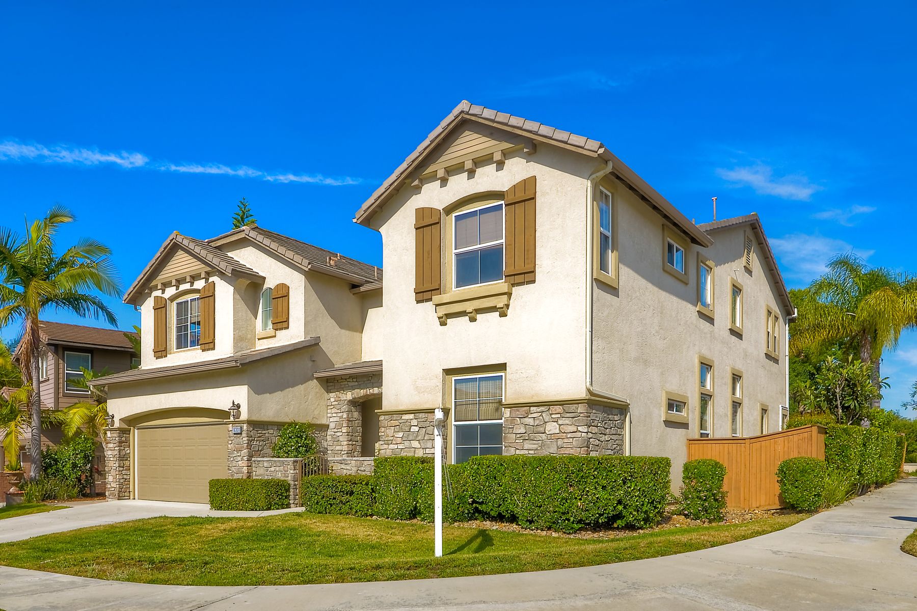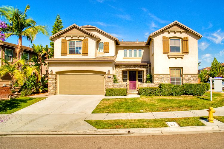 If you need space, this home has it in spades! Highly sought after Providence community home that sits on a large corner lot on a quiet street. Beautiful tile and wood flooring on the first floor. 5 bedrooms---one of which is located on the first floor with an attached en suite!! This home is loaded with storage space, including a 3 car tandem garage!!! Gorgeous salt water pool and spa make this an entertainer's dream home! Shay Realtors is proud to present this highly upgraded, well cared for 5 bedroom, 4.5 bathroom home that sits on a beautiful corner lot in the heart of 4S Ranch. You can see the attention to detail in this home from the stone tile flooring, sweeping spiral staircase, soaring ceilings, custom built-ins, as well as dual zoned air conditioning. The open layout kitchen that boasts granite counter tops, a large walk-in pantry as well as stainless steel appliances and flows nicely into the light and bright family room with a fireplace. Upstairs you will find four large bedrooms including a spacious Master Bedroom retreat, and a large laundry room. Outside, tropical landscaping with large palm trees and bird of paradise boarder a sparkling salt water pool and spa, built-in barbecue with sink, exterior landscape lighting, as well a pergola. Stone and stucco front facade with a courtyard & three car tandem garage with epoxy flooring complete this home! Perfectly located close to Poway Unified schools and shopping.