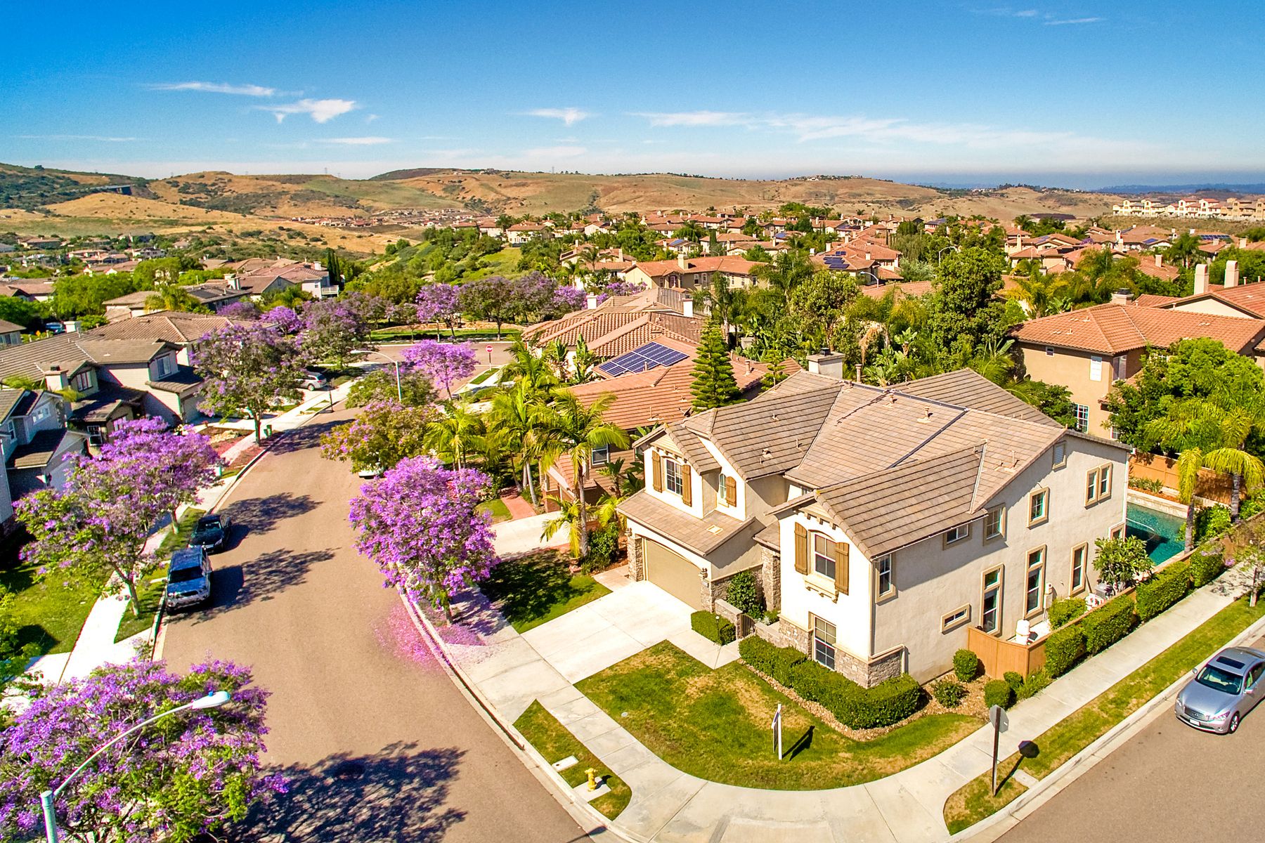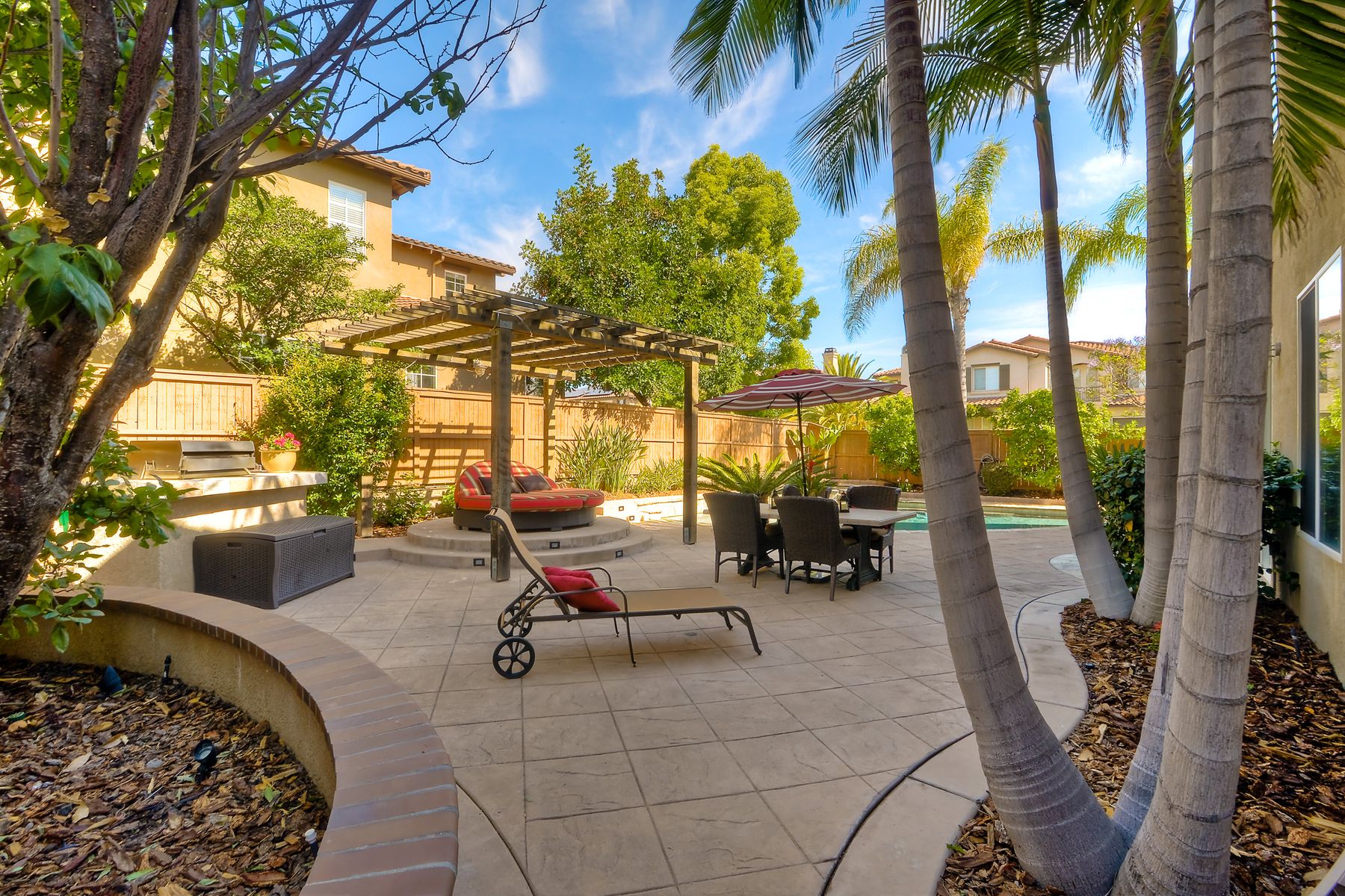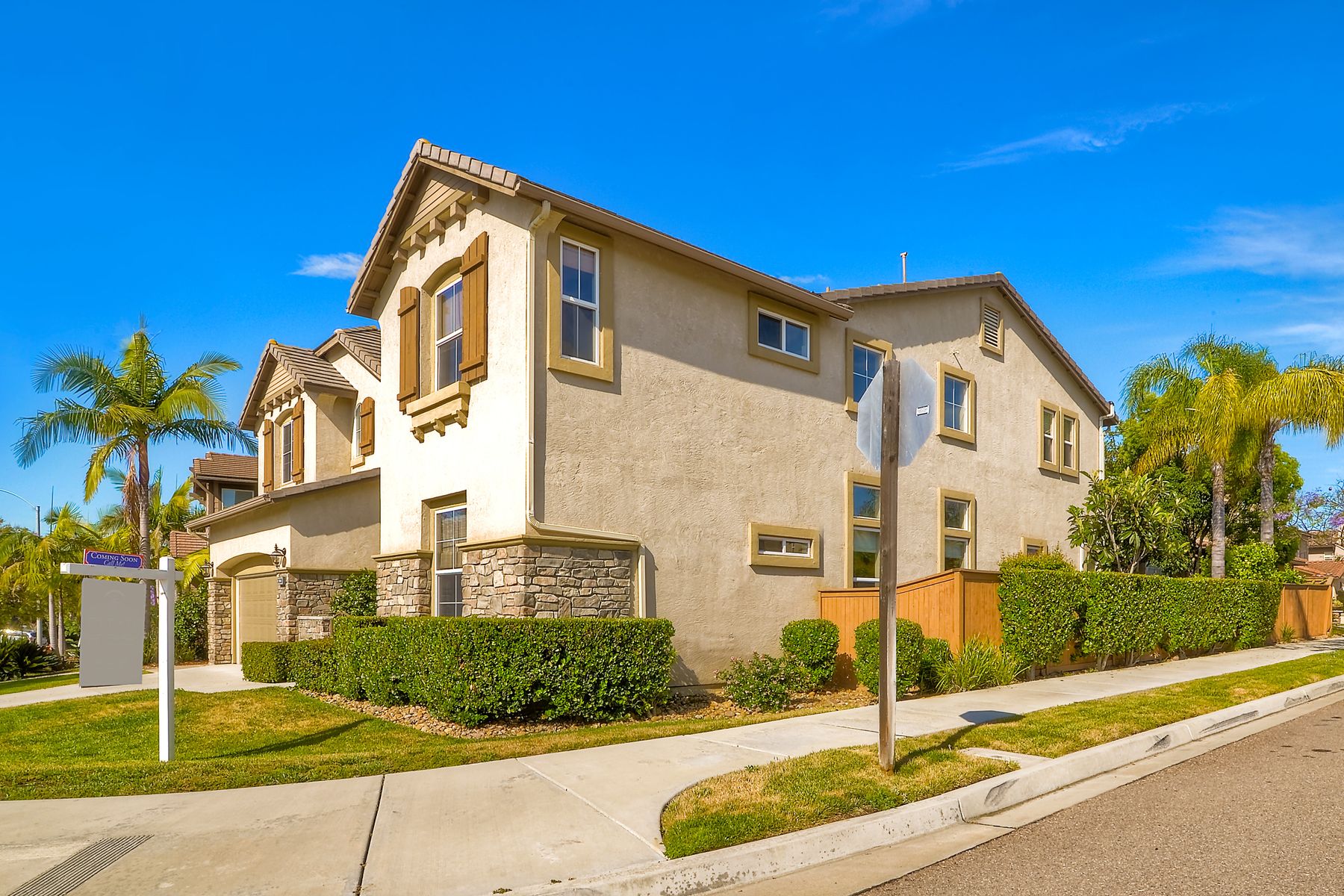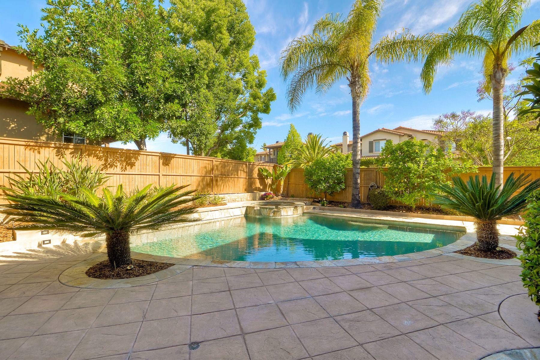 If you need space, this home has it in spades! Highly sought after Providence community home that sits on a large corner lot on a quiet street. Beautiful tile and wood flooring on the first floor. 5 bedrooms---one of which is located on the first floor with an attached en suite!! This home is loaded with storage space, including a 3 car tandem garage!!! Gorgeous salt water pool and spa make this an entertainer's dream home! Shay Realtors is proud to present this highly upgraded, well cared for 5 bedroom, 4.5 bathroom home that sits on a beautiful corner lot in the heart of 4S Ranch. You can see the attention to detail in this home from the stone tile flooring, sweeping spiral staircase, soaring ceilings, custom built-ins, as well as dual zoned air conditioning. The open layout kitchen that boasts granite counter tops, a large walk-in pantry as well as stainless steel appliances and flows nicely into the light and bright family room with a fireplace. Upstairs you will find four large bedrooms including a spacious Master Bedroom retreat, and a large laundry room. Outside, tropical landscaping with large palm trees and bird of paradise boarder a sparkling salt water pool and spa, built-in barbecue with sink, exterior landscape lighting, as well a pergola. Stone and stucco front facade with a courtyard & three car tandem garage with epoxy flooring complete this home! Perfectly located close to Poway Unified schools and shopping.