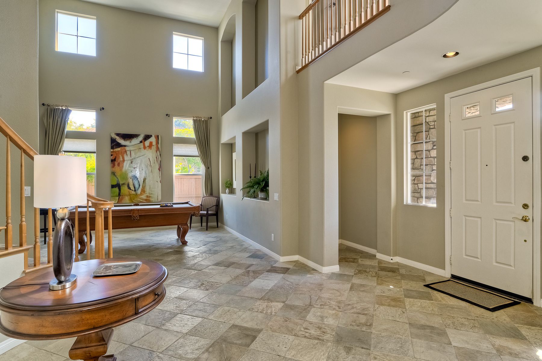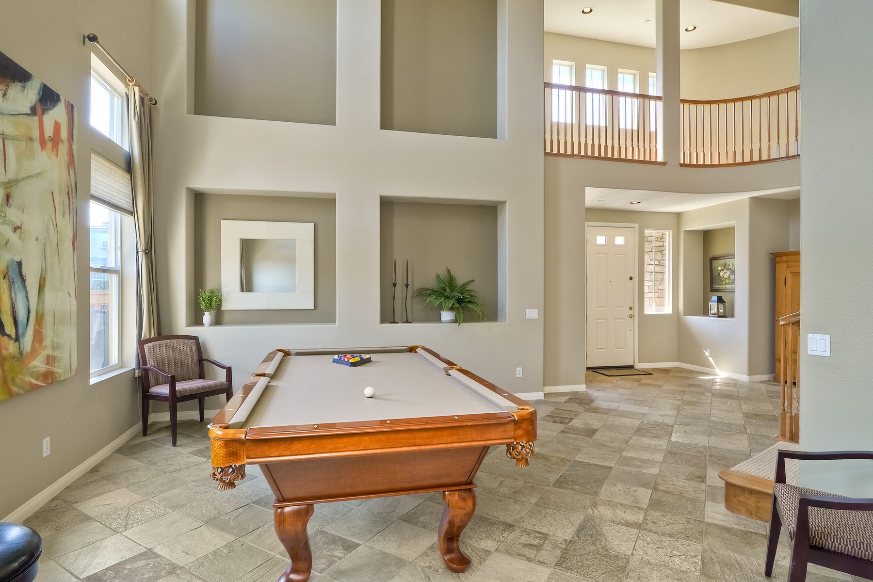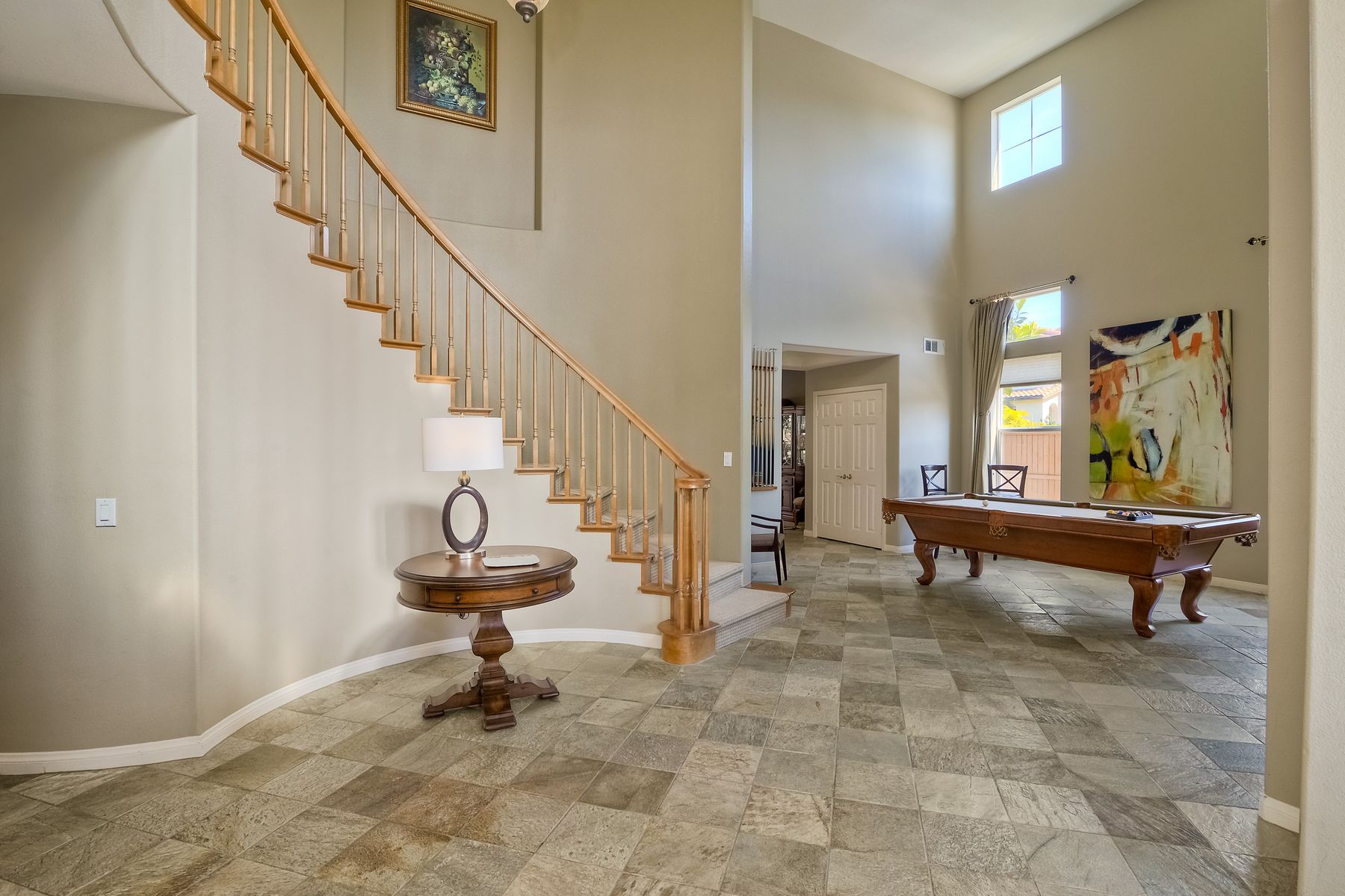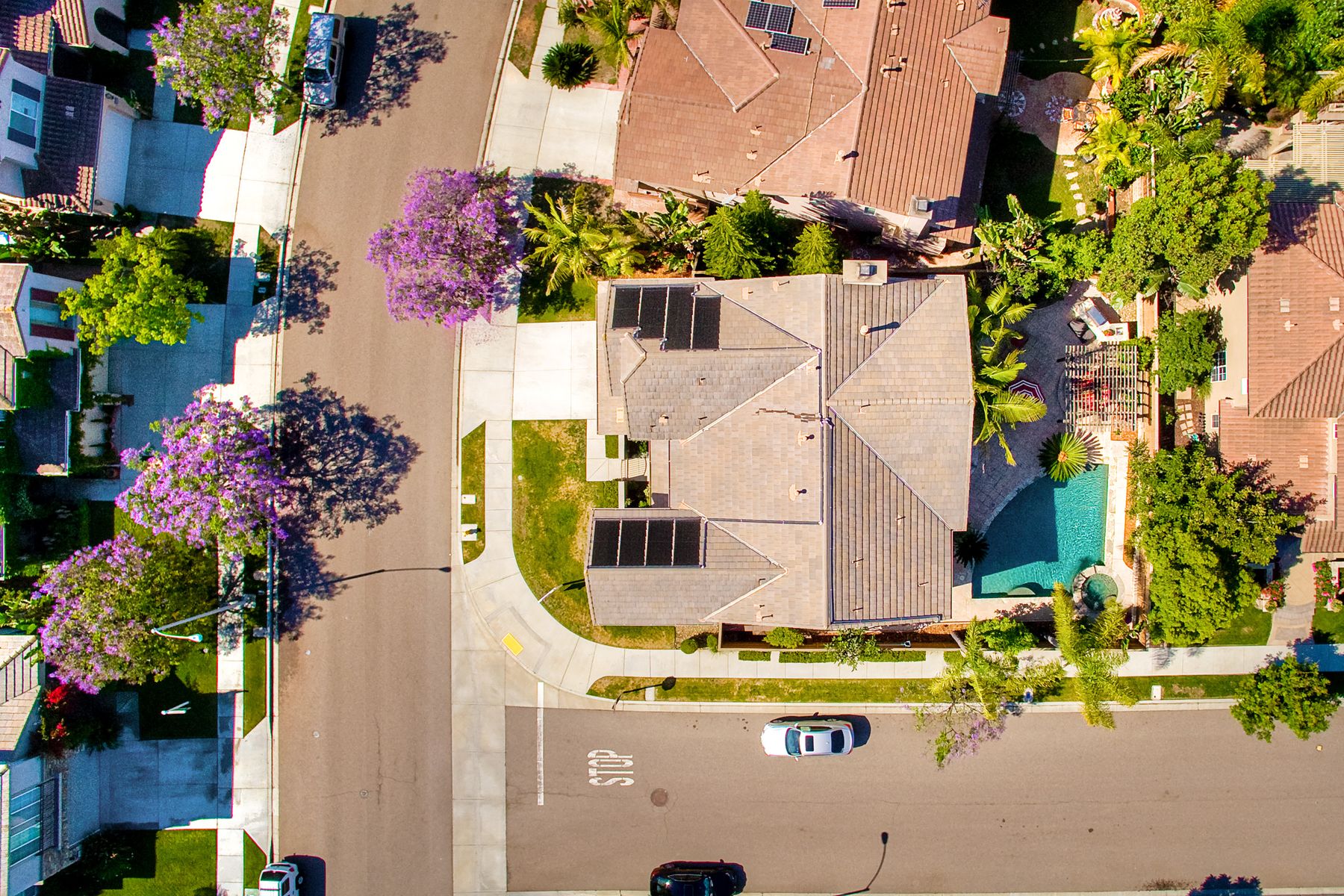 If you need space, this home has it in spades! Highly sought after Providence community home that sits on a large corner lot on a quiet street. Beautiful tile and wood flooring on the first floor. 5 bedrooms---one of which is located on the first floor with an attached en suite!! This home is loaded with storage space, including a 3 car tandem garage!!! Gorgeous salt water pool and spa make this an entertainer's dream home! Shay Realtors is proud to present this highly upgraded, well cared for 5 bedroom, 4.5 bathroom home that sits on a beautiful corner lot in the heart of 4S Ranch. You can see the attention to detail in this home from the stone tile flooring, sweeping spiral staircase, soaring ceilings, custom built-ins, as well as dual zoned air conditioning. The open layout kitchen that boasts granite counter tops, a large walk-in pantry as well as stainless steel appliances and flows nicely into the light and bright family room with a fireplace. Upstairs you will find four large bedrooms including a spacious Master Bedroom retreat, and a large laundry room. Outside, tropical landscaping with large palm trees and bird of paradise boarder a sparkling salt water pool and spa, built-in barbecue with sink, exterior landscape lighting, as well a pergola. Stone and stucco front facade with a courtyard & three car tandem garage with epoxy flooring complete this home! Perfectly located close to Poway Unified schools and shopping.