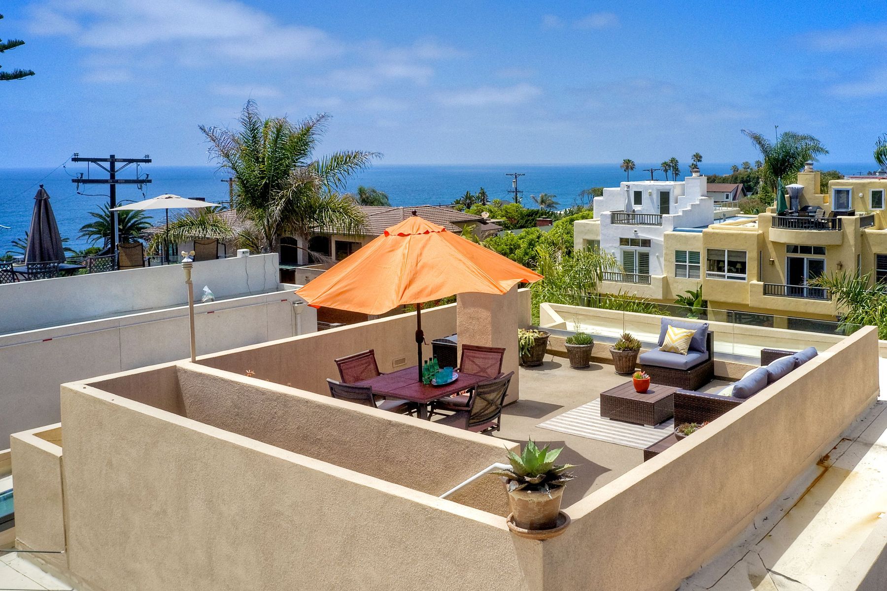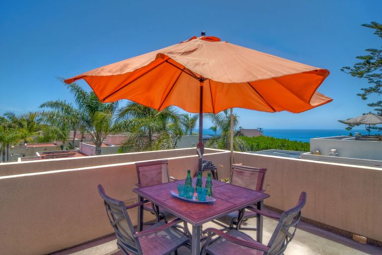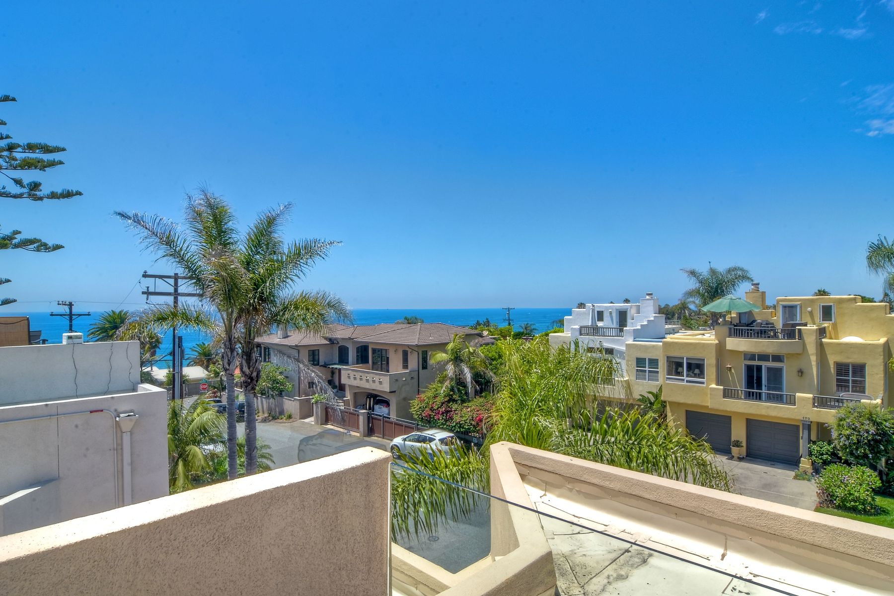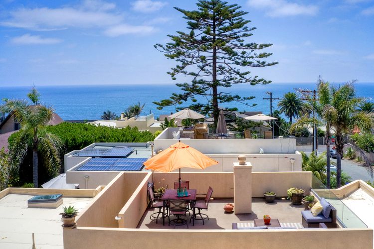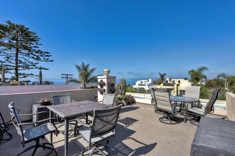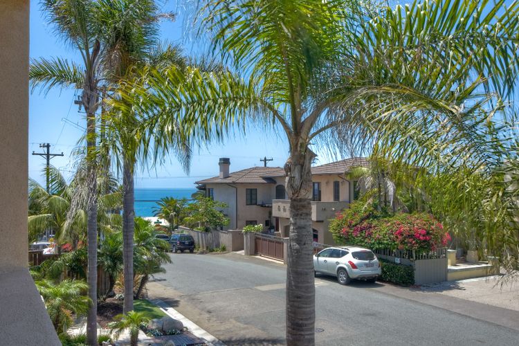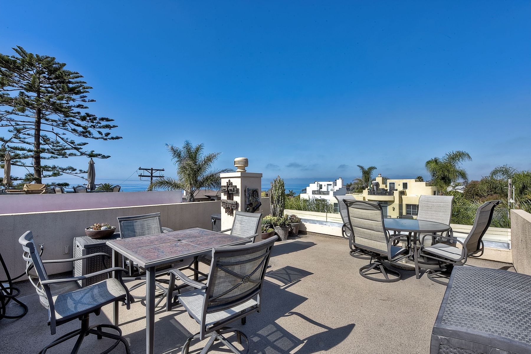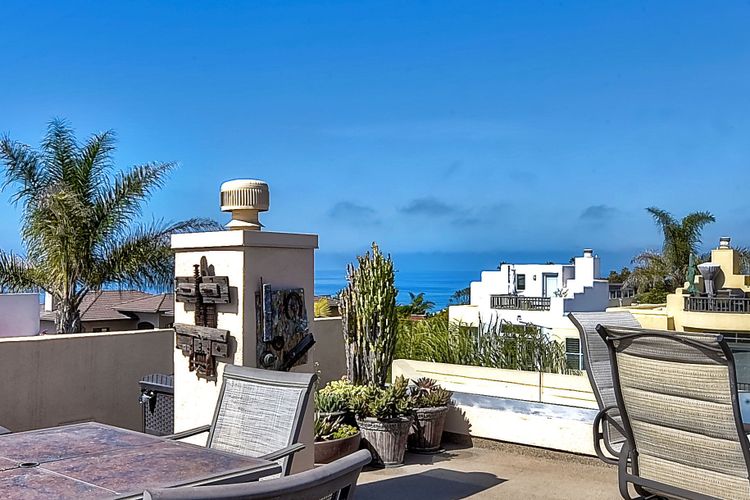 DINE ON YOUR OWN PRIVATE 360 DEGREE OCEAN VIEW ROOF DECK. ENJOY BEACH LIVING WEST OF 101 IN LEUCADIA WITH WALKING DISTANCE TO GRANDVIEW AND BEACONS BEACHES, DINING, ENTERTAINMENT, AND MORE. REVERSE FLOOR PLAN WITH JACK & JILL BEDROOMS DOWNSTAIRS, UPSTAIRS DINING AND LIVING AREA, MASTER BEDROOM ALONG WITH THREE DECKS (TWO W/OCEAN VIEWS) AND STAIRCASE TO ROOF TOP DECK. GATED COURTYARD ENTRANCE. PRIVATE PATIO YARD WITH HOT TUB. UPGRADES INCLUDING WOOD LOOK TILE FLOORS, NEWER ROOF, & TANKLESS WATER HEATER [Supplement]: Many upgrades which includes newer roof, new tankless water heater, heated towel holders in master bedroom, new flooring, and newly painted. Low HOA fee's, extra one car parking space adjacent to home. Only five homes in Ocean View Colony and none ever sold since new in 2000, all original owners.