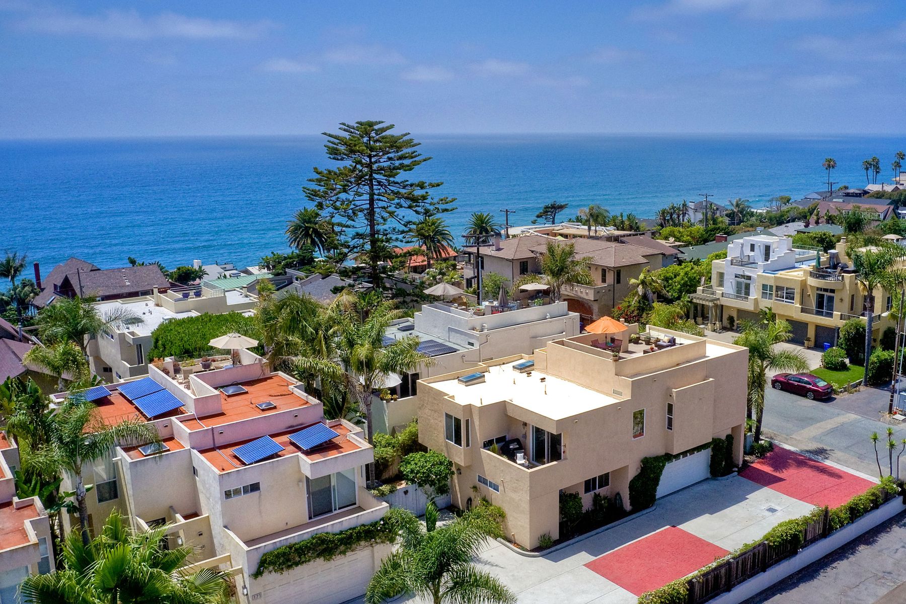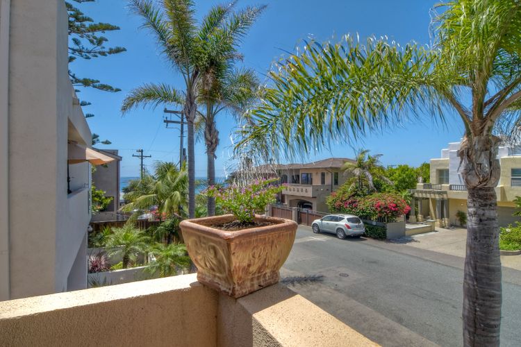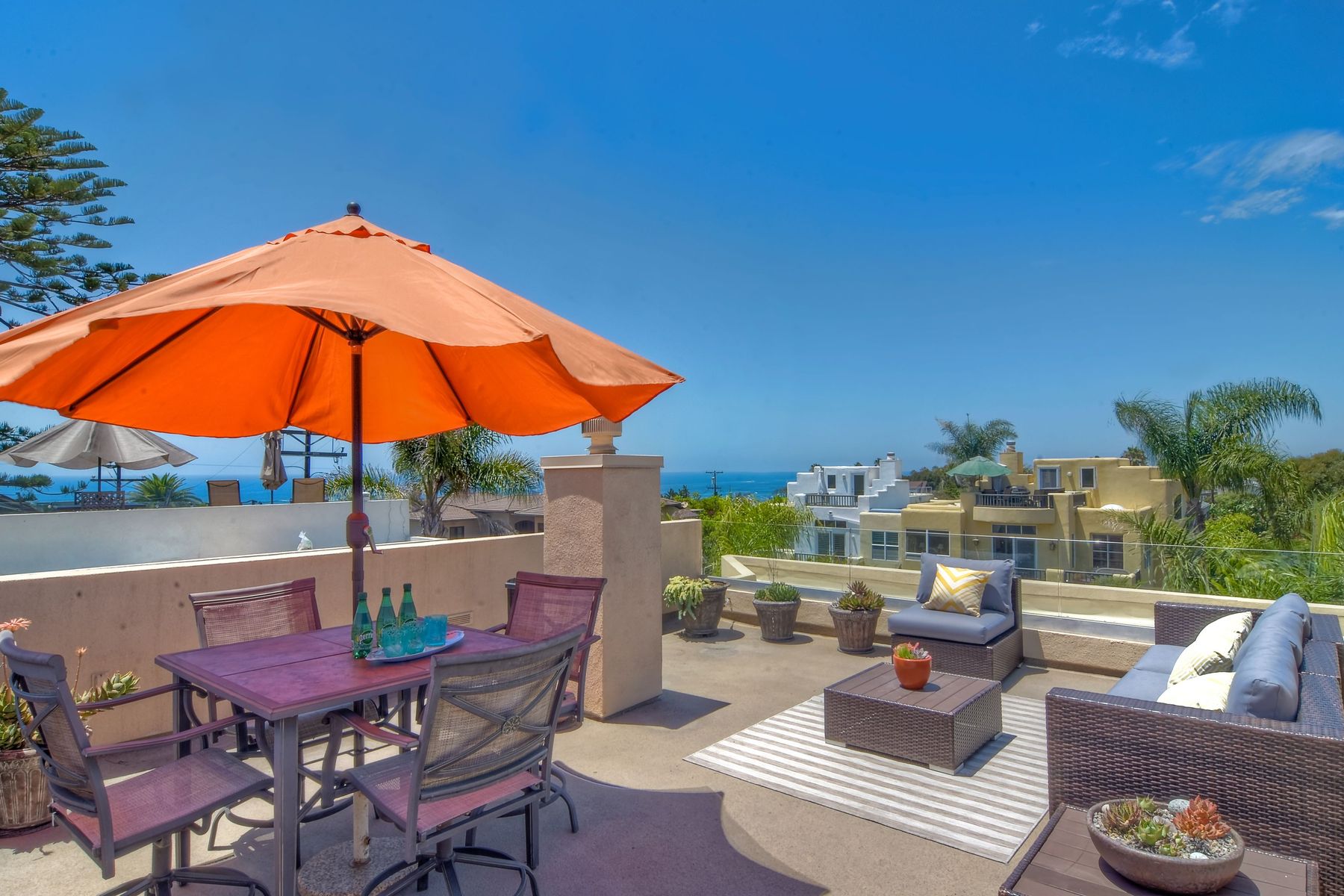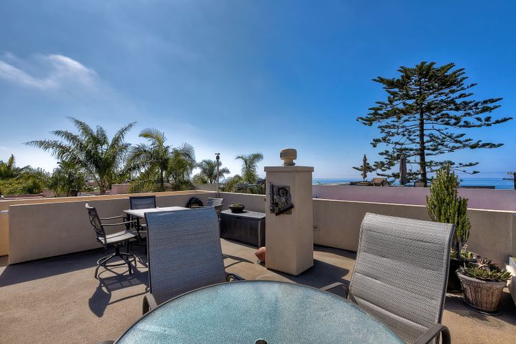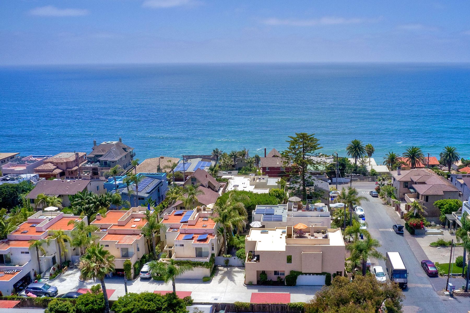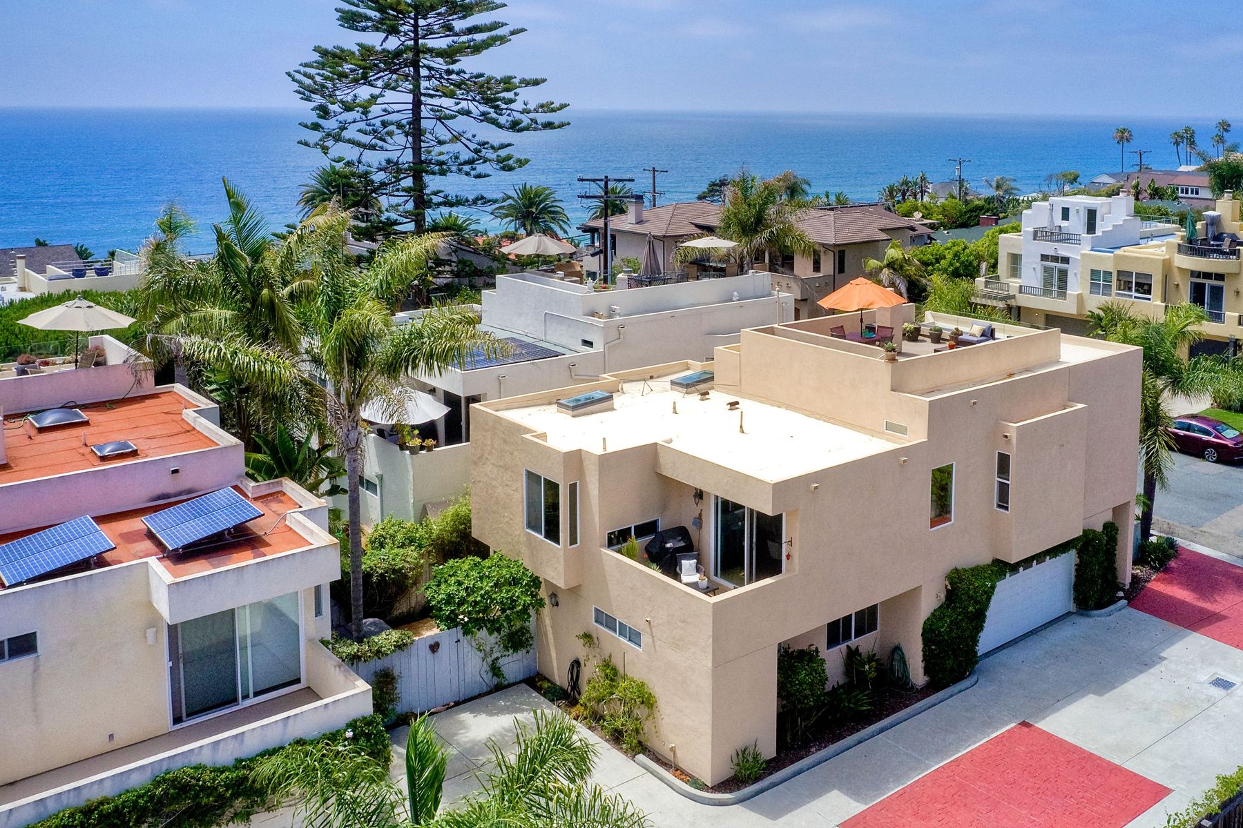 DINE ON YOUR OWN PRIVATE 360 DEGREE OCEAN VIEW ROOF DECK. ENJOY BEACH LIVING WEST OF 101 IN LEUCADIA WITH WALKING DISTANCE TO GRANDVIEW AND BEACONS BEACHES, DINING, ENTERTAINMENT, AND MORE. REVERSE FLOOR PLAN WITH JACK & JILL BEDROOMS DOWNSTAIRS, UPSTAIRS DINING AND LIVING AREA, MASTER BEDROOM ALONG WITH THREE DECKS (TWO W/OCEAN VIEWS) AND STAIRCASE TO ROOF TOP DECK. GATED COURTYARD ENTRANCE. PRIVATE PATIO YARD WITH HOT TUB. UPGRADES INCLUDING WOOD LOOK TILE FLOORS, NEWER ROOF, & TANKLESS WATER HEATER [Supplement]: Many upgrades which includes newer roof, new tankless water heater, heated towel holders in master bedroom, new flooring, and newly painted. Low HOA fee's, extra one car parking space adjacent to home. Only five homes in Ocean View Colony and none ever sold since new in 2000, all original owners.