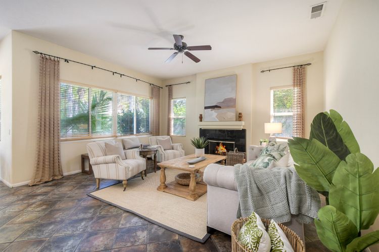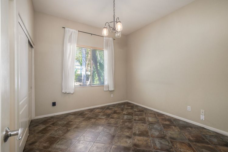 Beautiful neighborhood with a country feel. Elegant mediterranean styled home with a finished stucco wall surrounding the home for privacy. Tropical landscaping and spacious yard. Open chef's kitchen with center island and natral light. High ceilings open floor plan. Slate porcelain flooring throughout. Huge primary suite with walk in closet fit for a king and queen; brand new carpeting.Separate shower and huge tub with dual vanities & Separate make up station. The other 2 large bedrooms are separated by a jack and jill bathroom. Coastal breezes. No mello Roos and low HOA Dues. freeway access near by. Unique curb appeal with mature palms and fencing. 3 car garage woth Room for RV (if behind a fence) and multiple vehicles on the double wide concrete driveway. Solar for saving on energy!