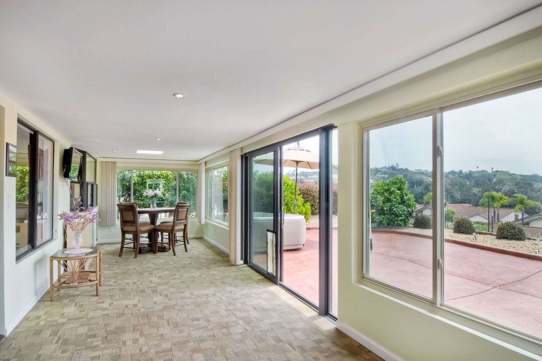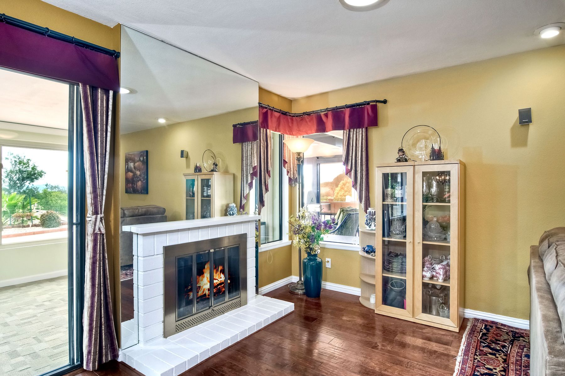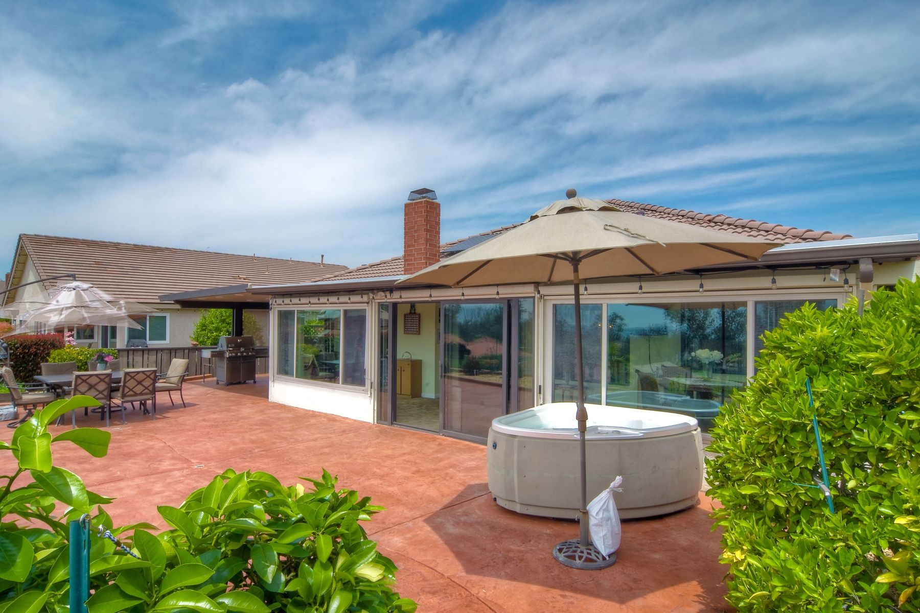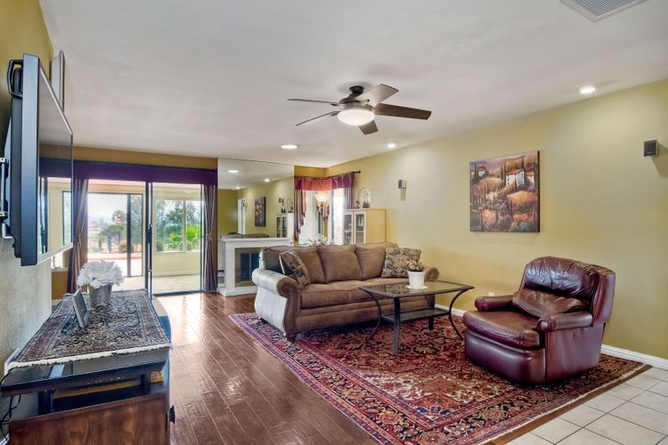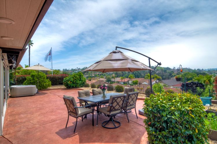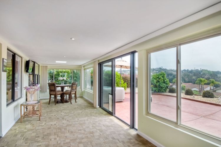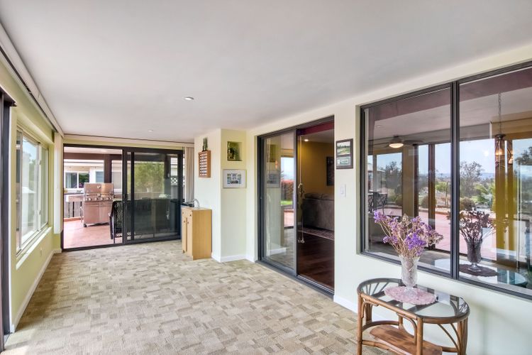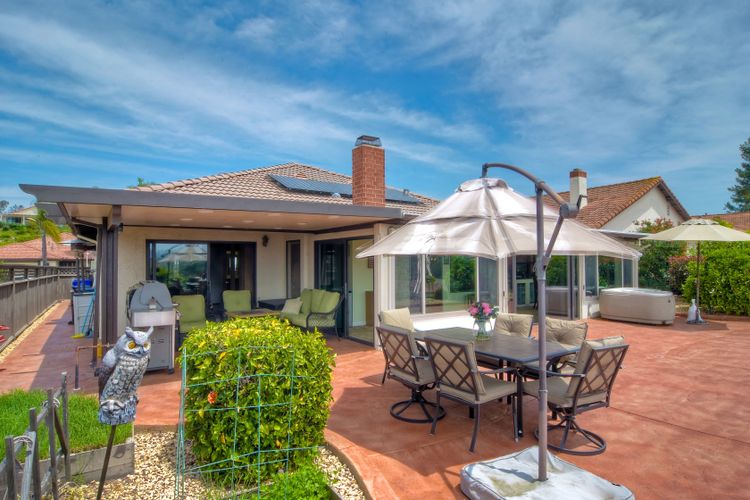 This lovely home in 55+ Oaks North Estates welcomes you with a perfectly cared for, low maintenance front yard. Fully owned Solar transfers to buyer. Walk through the tiled entry and your eye is drawn through the house to the expansive view. To your left is the spacious second bedroom with double windows, engineered wood flooring, decorative ceiling fan and a walk in closet. The adjacent full bath has a beautifully tiled walk in shower and soothing textured wall paper. See Supplement..... Moving into the living room/dining room area, the wood flooring combined with warm colors, a cozy fireplace on a mirrored wall, sliding glass door and multiple windows create an inviting area for everyday life or entertaining. The dining room flows into the updated kitchen with granite countertops, light wood cabinets, stainless steel appliances, recessed lights in the coffered ceiling, tile floors and a large garden window that brings the outside in. The attached family room includes a huge window, cooling fan and the easy to maintain wood flooring. The master suite offers a wonderful bathroom with custom tile work in the large walk in shower, rich wood cabinets, double vanity, heated tile floors on a timer, heated towel rack, walk in closet and extra storage. The spacious bedroom also has a cooling fan and a sliding glass door to the covered patio. Fully owned solar cover sellers electric bill. A light filled all seasons sun room runs almost the whole length of the house. Perfect for multiple functions with a skylight, neutral indoor/outdoor carpeting, multiple windows and two sliding glass doors - one to the backyard and one to the covered patio area. The backyard is well designed with a stamped concrete patio, citrus trees, covered conversation area, garden boxes, mature landscaping and of course - the view! Fully paid solar, no electric bill! Walk to Oaks North Executive Golf Course and Oaks North Community center with pool and many amenities. Close to parks, shopping, restaurants and easy freeway access.