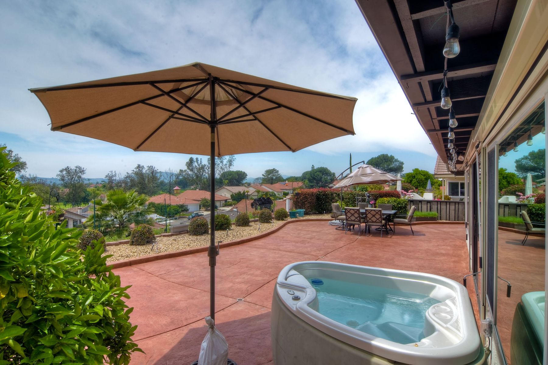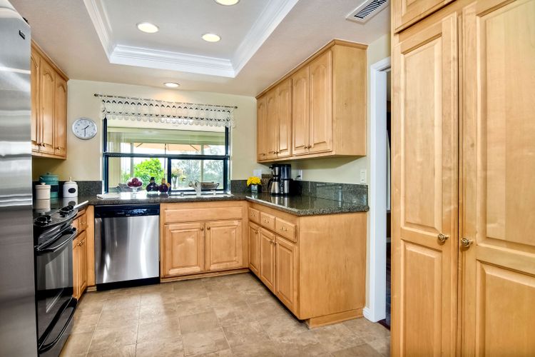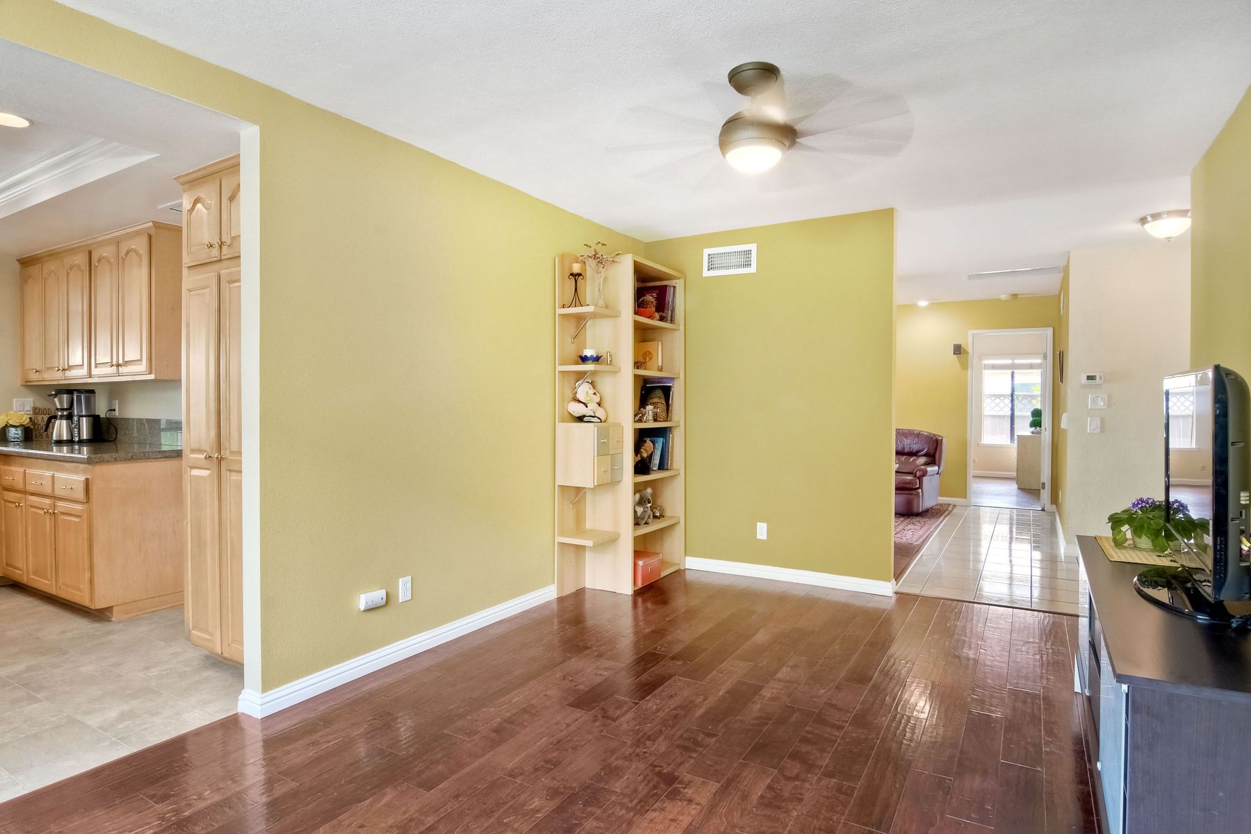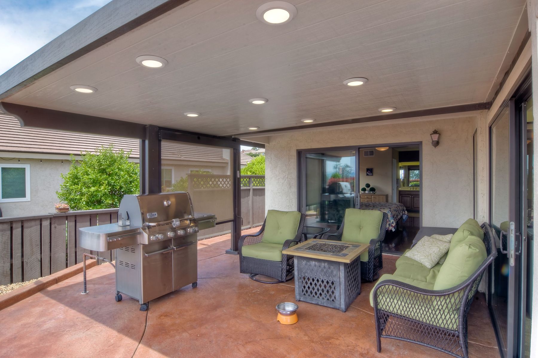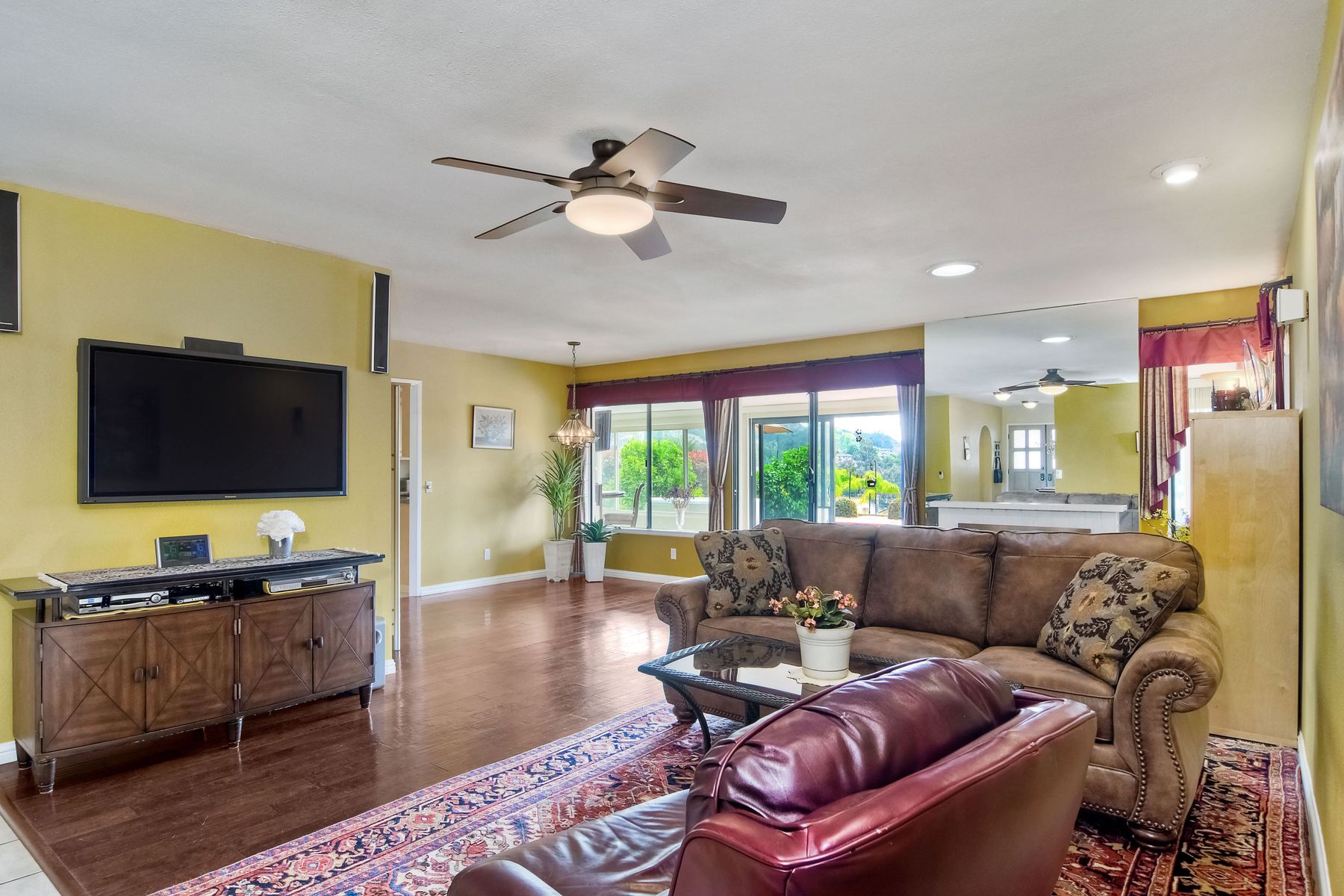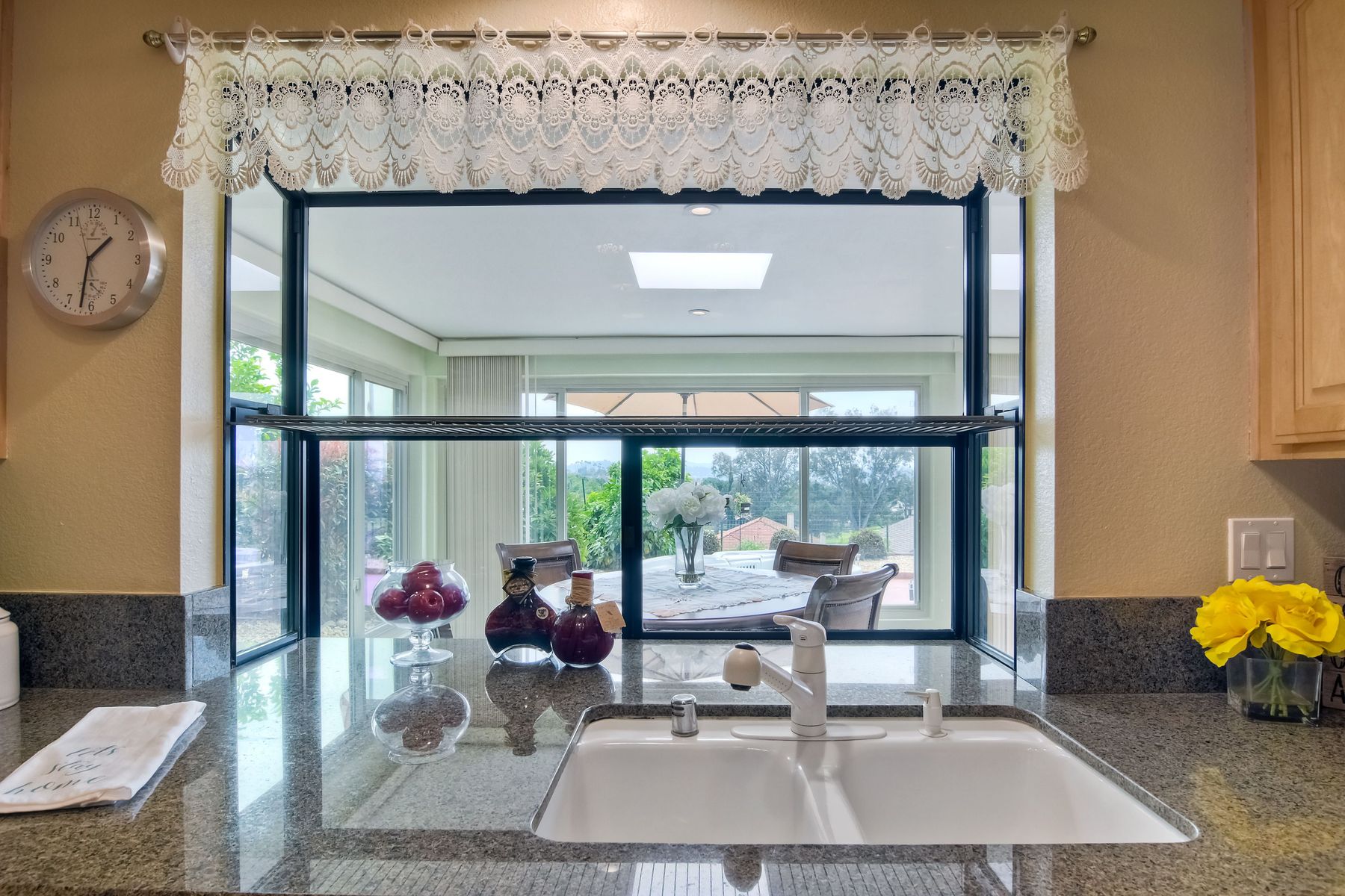 This lovely home in 55+ Oaks North Estates welcomes you with a perfectly cared for, low maintenance front yard. Fully owned Solar transfers to buyer. Walk through the tiled entry and your eye is drawn through the house to the expansive view. To your left is the spacious second bedroom with double windows, engineered wood flooring, decorative ceiling fan and a walk in closet. The adjacent full bath has a beautifully tiled walk in shower and soothing textured wall paper. See Supplement..... Moving into the living room/dining room area, the wood flooring combined with warm colors, a cozy fireplace on a mirrored wall, sliding glass door and multiple windows create an inviting area for everyday life or entertaining. The dining room flows into the updated kitchen with granite countertops, light wood cabinets, stainless steel appliances, recessed lights in the coffered ceiling, tile floors and a large garden window that brings the outside in. The attached family room includes a huge window, cooling fan and the easy to maintain wood flooring. The master suite offers a wonderful bathroom with custom tile work in the large walk in shower, rich wood cabinets, double vanity, heated tile floors on a timer, heated towel rack, walk in closet and extra storage. The spacious bedroom also has a cooling fan and a sliding glass door to the covered patio. Fully owned solar cover sellers electric bill. A light filled all seasons sun room runs almost the whole length of the house. Perfect for multiple functions with a skylight, neutral indoor/outdoor carpeting, multiple windows and two sliding glass doors - one to the backyard and one to the covered patio area. The backyard is well designed with a stamped concrete patio, citrus trees, covered conversation area, garden boxes, mature landscaping and of course - the view! Fully paid solar, no electric bill! Walk to Oaks North Executive Golf Course and Oaks North Community center with pool and many amenities. Close to parks, shopping, restaurants and easy freeway access.