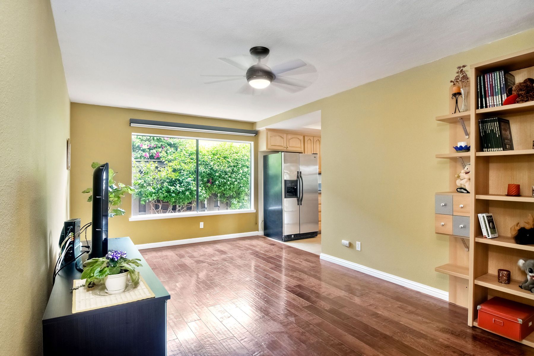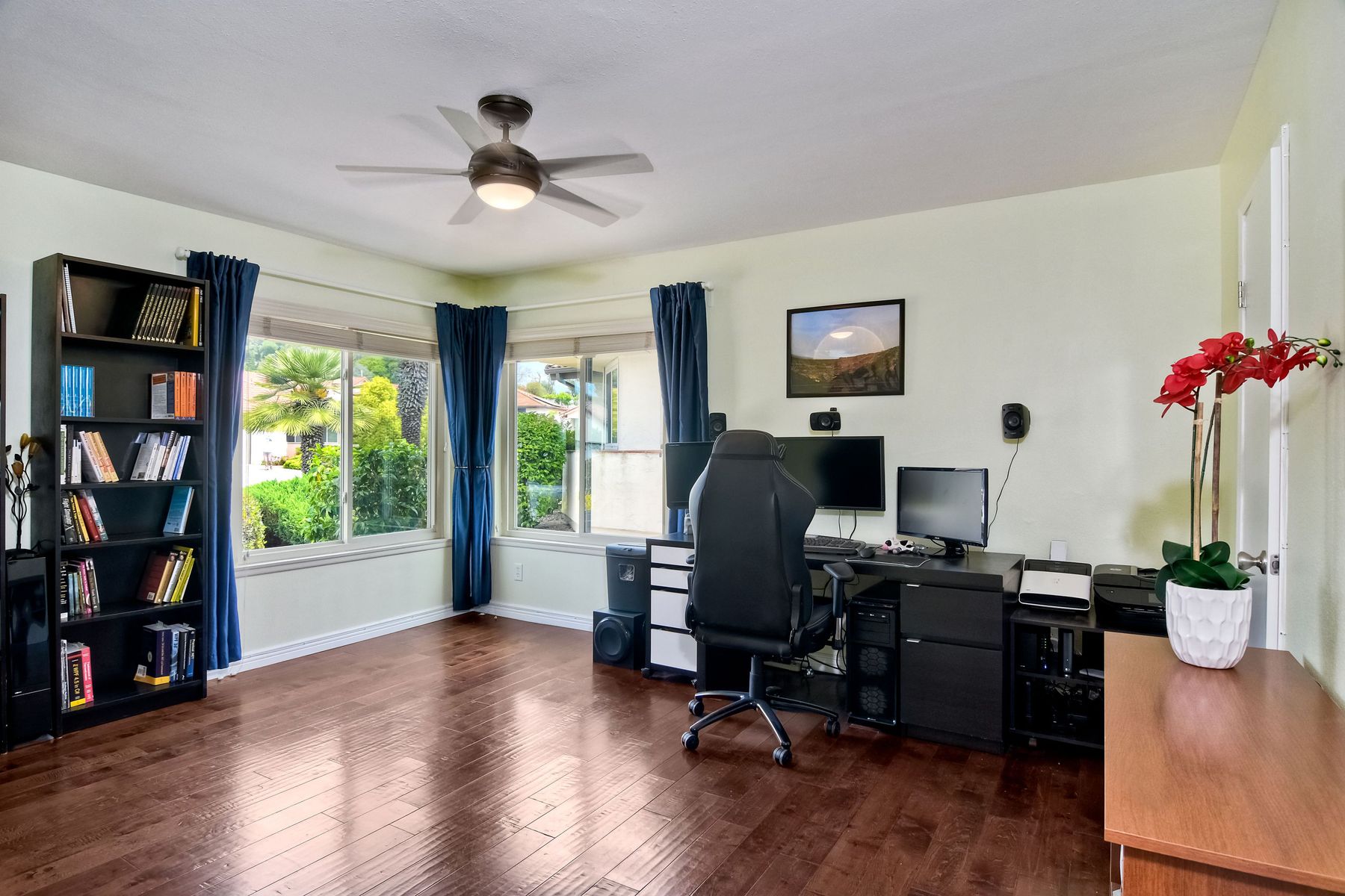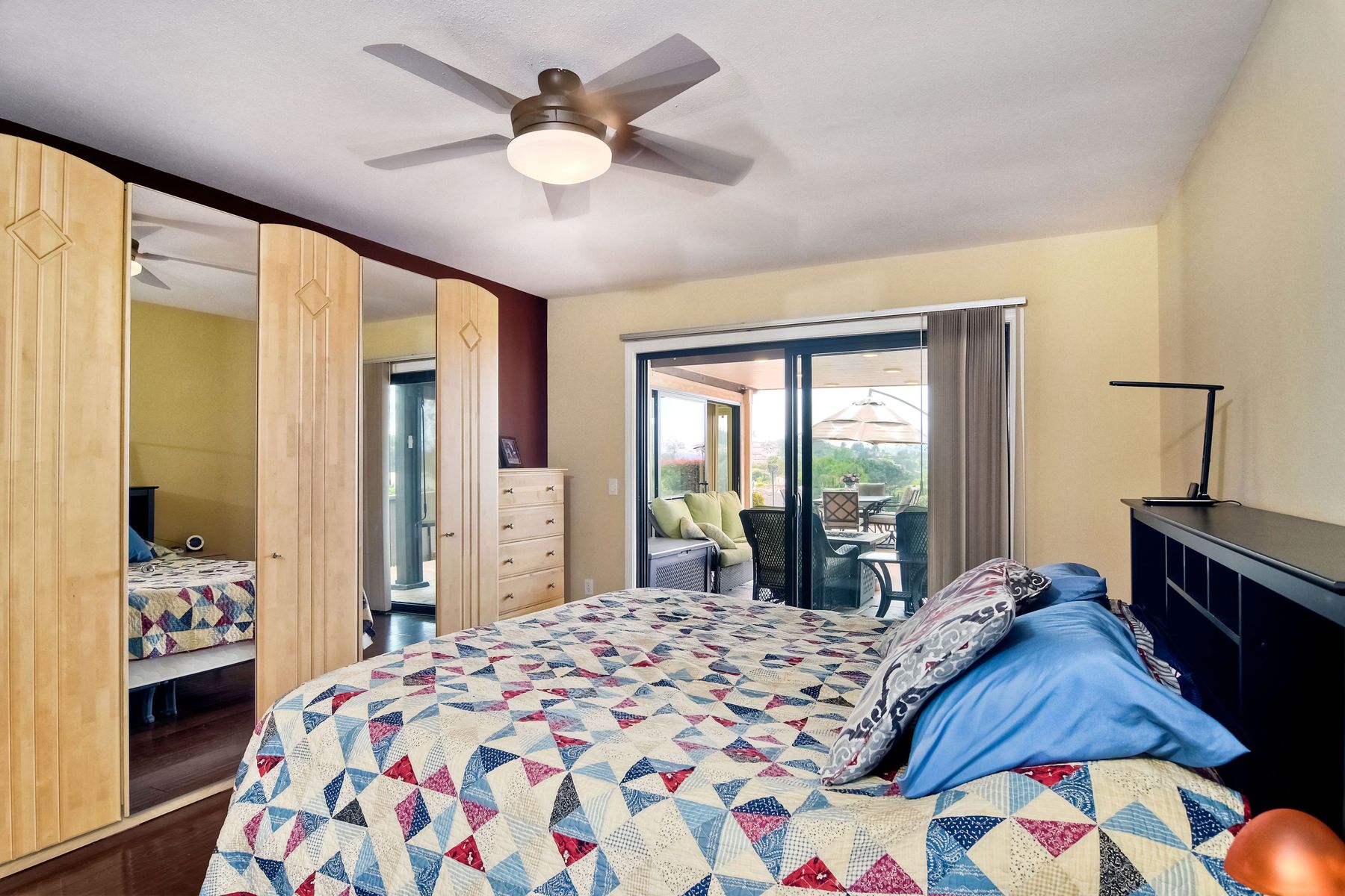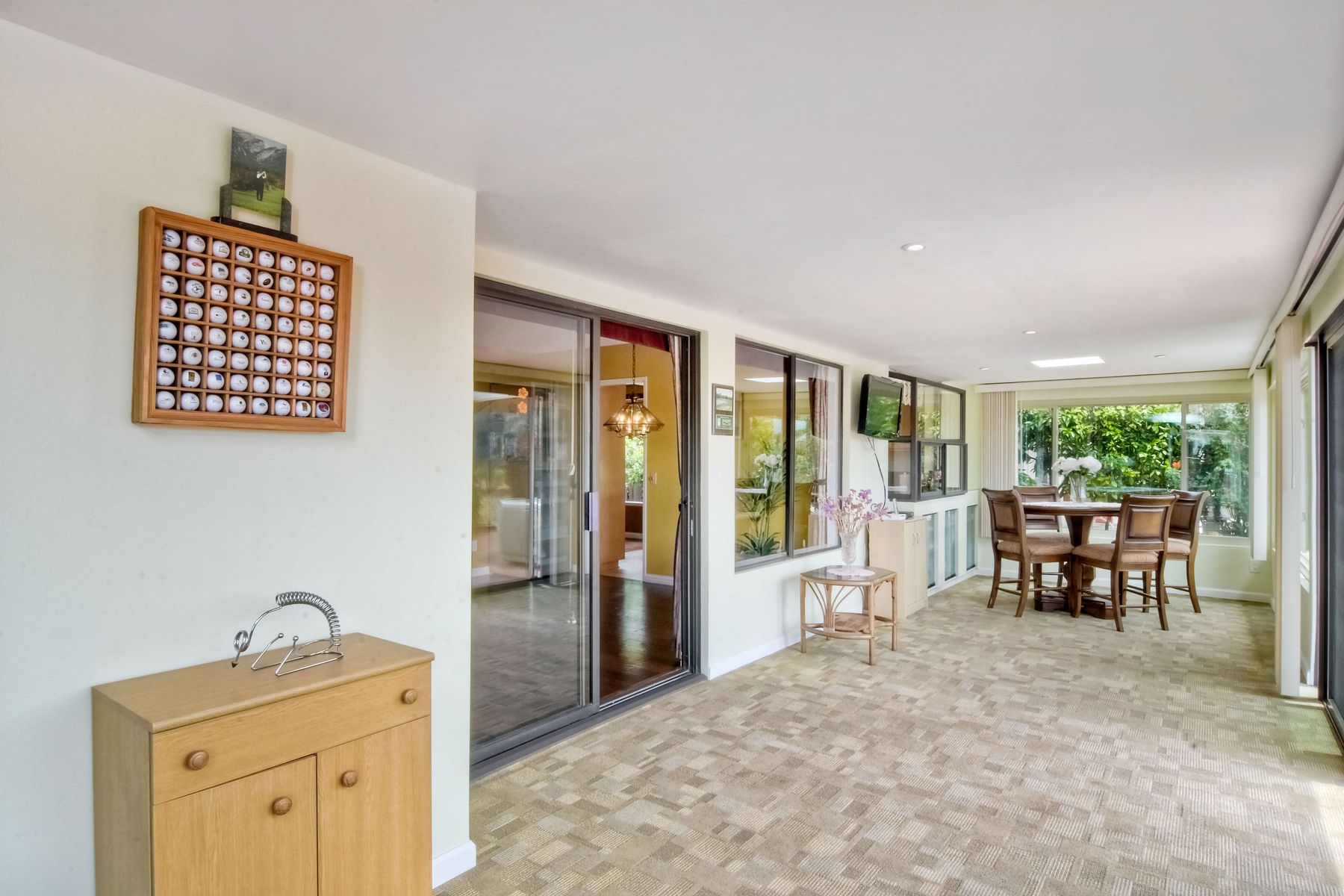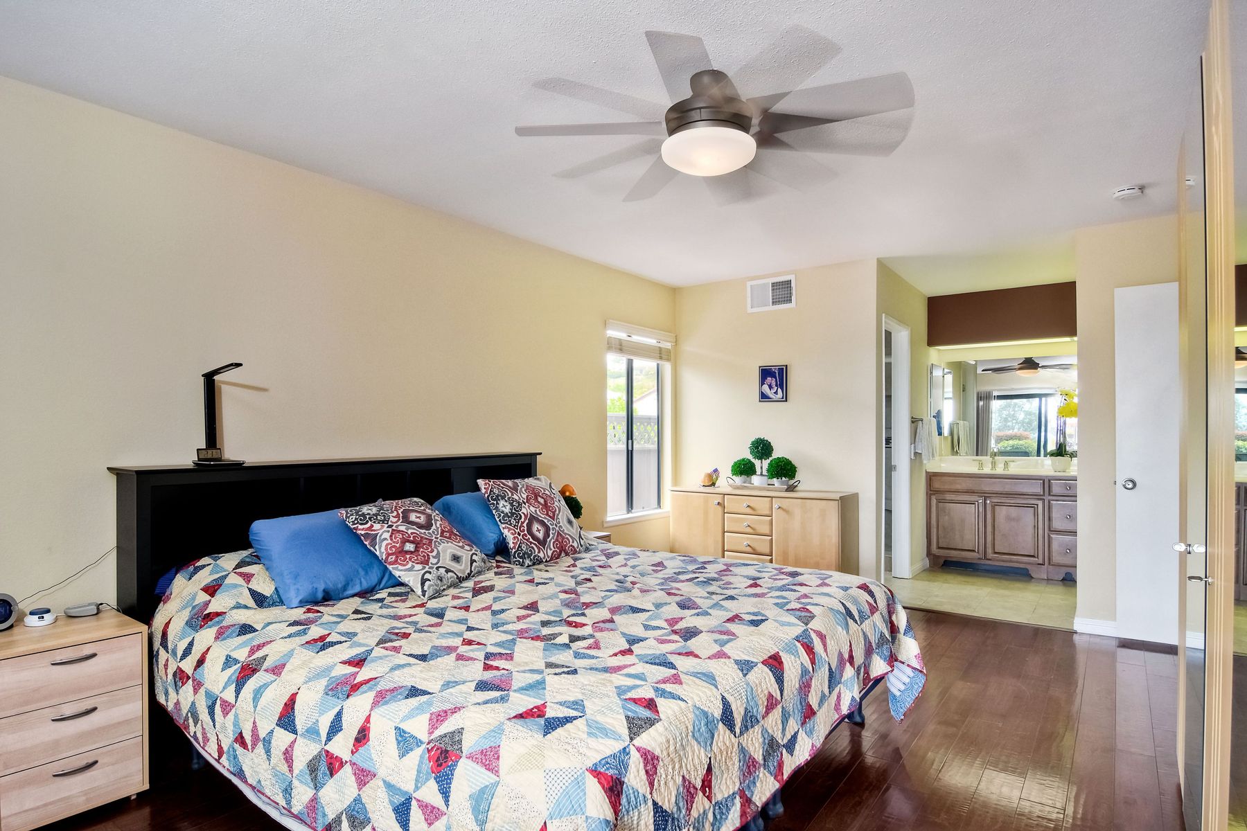 This lovely home in 55+ Oaks North Estates welcomes you with a perfectly cared for, low maintenance front yard. Fully owned Solar transfers to buyer. Walk through the tiled entry and your eye is drawn through the house to the expansive view. To your left is the spacious second bedroom with double windows, engineered wood flooring, decorative ceiling fan and a walk in closet. The adjacent full bath has a beautifully tiled walk in shower and soothing textured wall paper. See Supplement..... Moving into the living room/dining room area, the wood flooring combined with warm colors, a cozy fireplace on a mirrored wall, sliding glass door and multiple windows create an inviting area for everyday life or entertaining. The dining room flows into the updated kitchen with granite countertops, light wood cabinets, stainless steel appliances, recessed lights in the coffered ceiling, tile floors and a large garden window that brings the outside in. The attached family room includes a huge window, cooling fan and the easy to maintain wood flooring. The master suite offers a wonderful bathroom with custom tile work in the large walk in shower, rich wood cabinets, double vanity, heated tile floors on a timer, heated towel rack, walk in closet and extra storage. The spacious bedroom also has a cooling fan and a sliding glass door to the covered patio. Fully owned solar cover sellers electric bill. A light filled all seasons sun room runs almost the whole length of the house. Perfect for multiple functions with a skylight, neutral indoor/outdoor carpeting, multiple windows and two sliding glass doors - one to the backyard and one to the covered patio area. The backyard is well designed with a stamped concrete patio, citrus trees, covered conversation area, garden boxes, mature landscaping and of course - the view! Fully paid solar, no electric bill! Walk to Oaks North Executive Golf Course and Oaks North Community center with pool and many amenities. Close to parks, shopping, restaurants and easy freeway access.