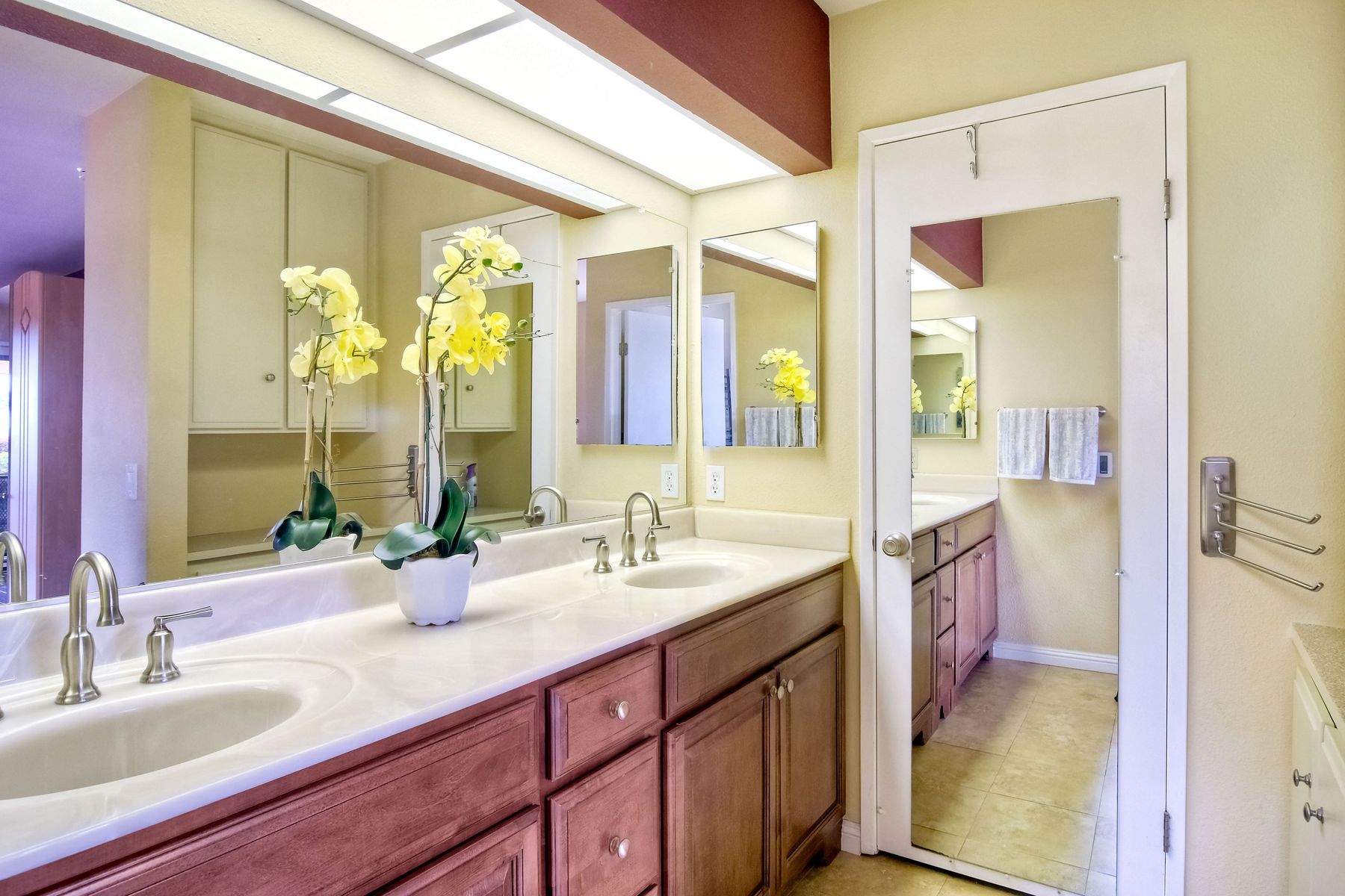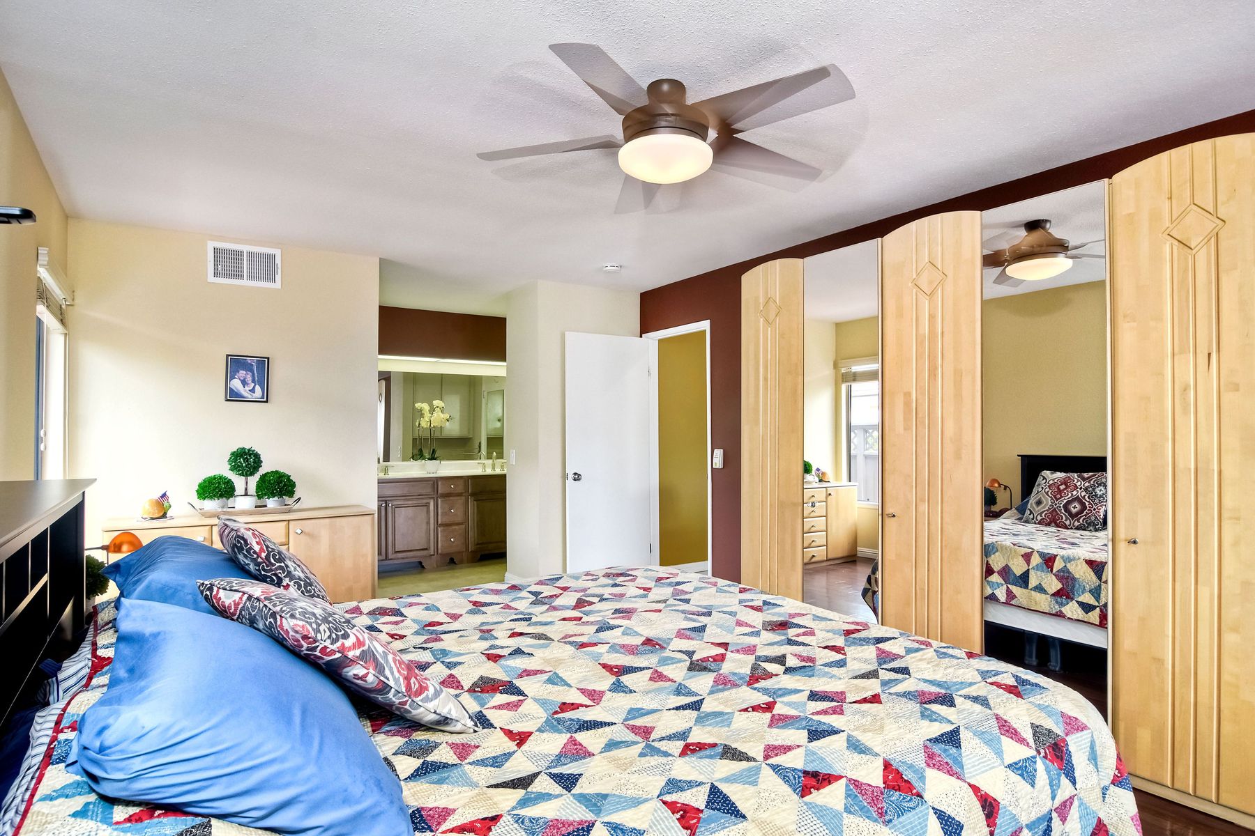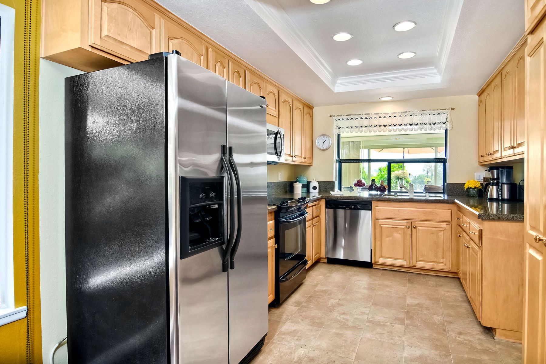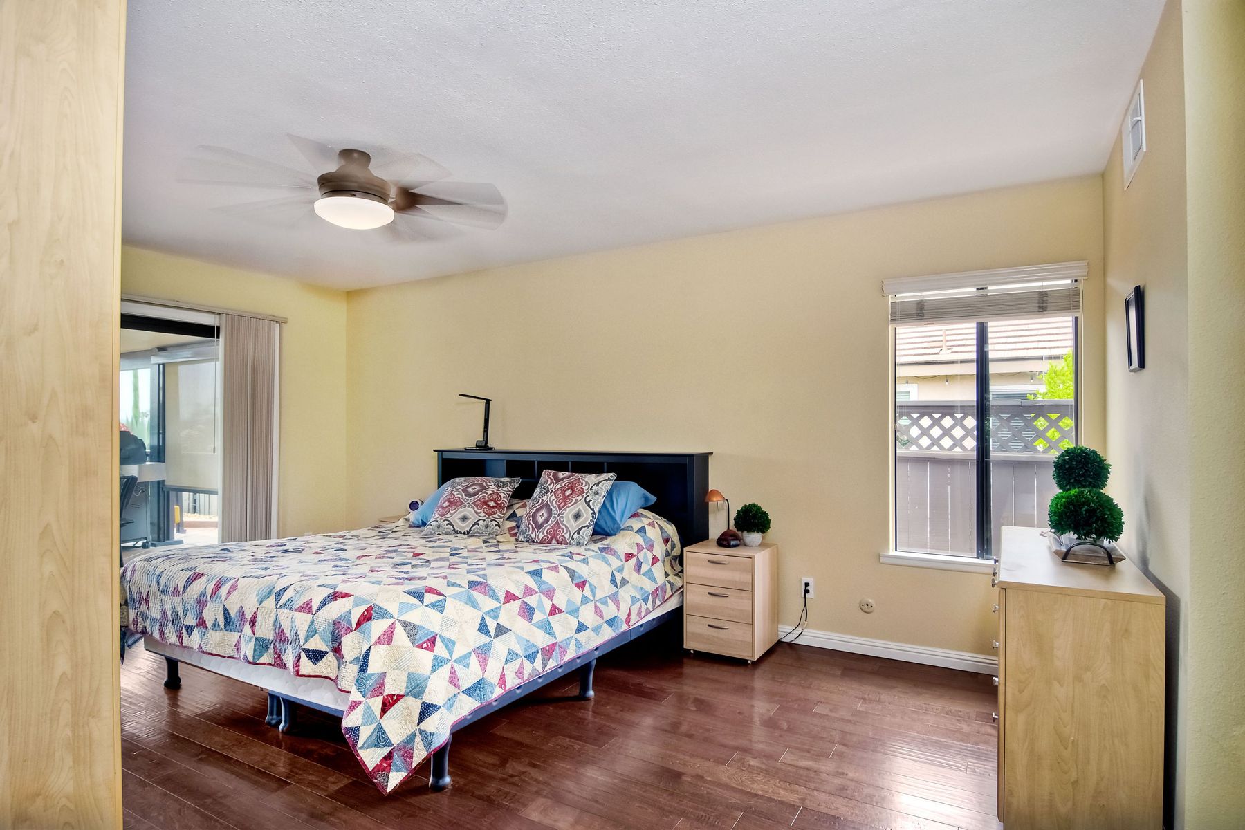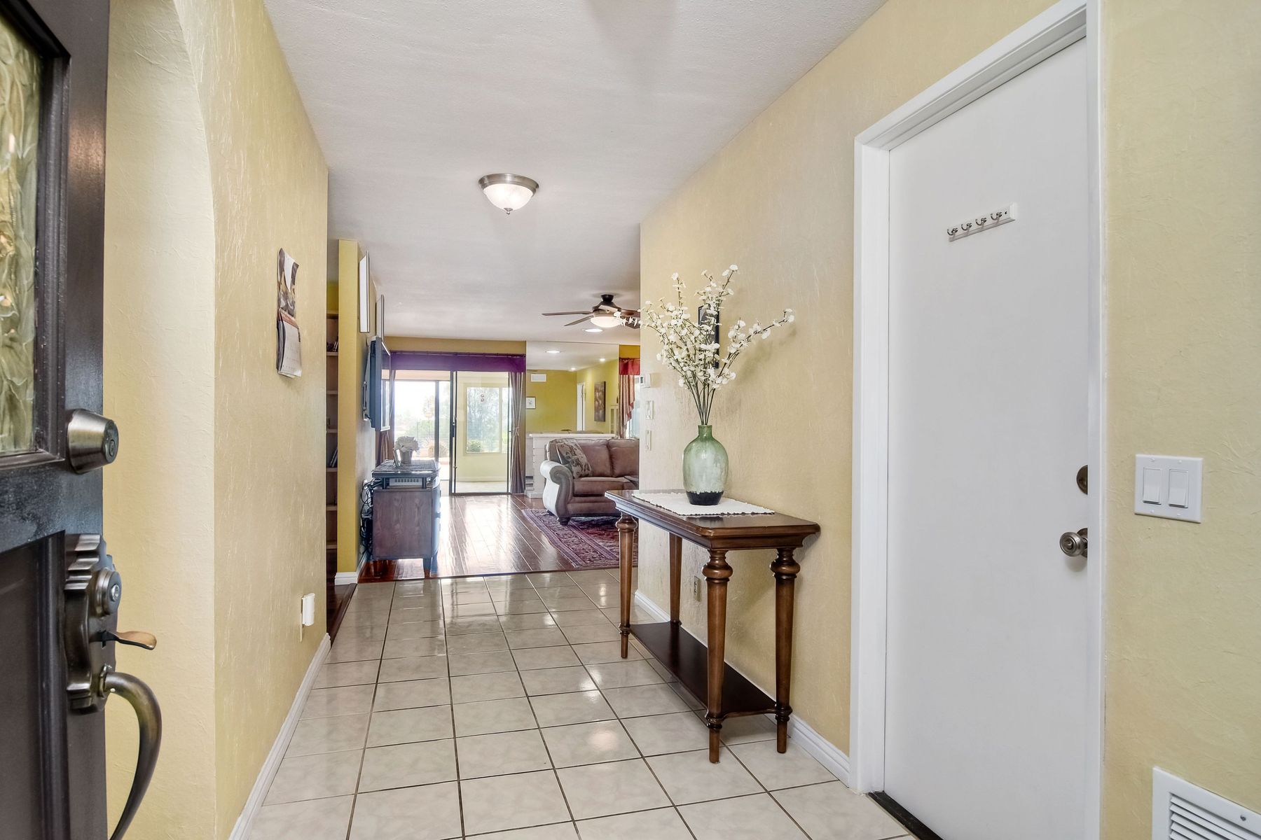 This lovely home in 55+ Oaks North Estates welcomes you with a perfectly cared for, low maintenance front yard. Fully owned Solar transfers to buyer. Walk through the tiled entry and your eye is drawn through the house to the expansive view. To your left is the spacious second bedroom with double windows, engineered wood flooring, decorative ceiling fan and a walk in closet. The adjacent full bath has a beautifully tiled walk in shower and soothing textured wall paper. See Supplement..... Moving into the living room/dining room area, the wood flooring combined with warm colors, a cozy fireplace on a mirrored wall, sliding glass door and multiple windows create an inviting area for everyday life or entertaining. The dining room flows into the updated kitchen with granite countertops, light wood cabinets, stainless steel appliances, recessed lights in the coffered ceiling, tile floors and a large garden window that brings the outside in. The attached family room includes a huge window, cooling fan and the easy to maintain wood flooring. The master suite offers a wonderful bathroom with custom tile work in the large walk in shower, rich wood cabinets, double vanity, heated tile floors on a timer, heated towel rack, walk in closet and extra storage. The spacious bedroom also has a cooling fan and a sliding glass door to the covered patio. Fully owned solar cover sellers electric bill. A light filled all seasons sun room runs almost the whole length of the house. Perfect for multiple functions with a skylight, neutral indoor/outdoor carpeting, multiple windows and two sliding glass doors - one to the backyard and one to the covered patio area. The backyard is well designed with a stamped concrete patio, citrus trees, covered conversation area, garden boxes, mature landscaping and of course - the view! Fully paid solar, no electric bill! Walk to Oaks North Executive Golf Course and Oaks North Community center with pool and many amenities. Close to parks, shopping, restaurants and easy freeway access.