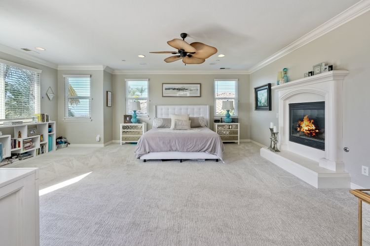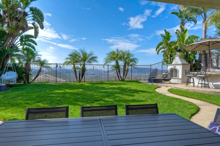 Improved Price!!!NEVER ENDING PANORAMIC VIEWS!. Wake up each morning to beautiful sunrises overlooking the rolling hills of San Marcos and the Pacific Ocean!! This amazing 4 bedroom 4.5 bath home, high atop San Marcos has incredible unobstructed views with no houses behind. Coveted King Palms and Birds of Paradise adorn the entire lot providing a very tropical feel. Enjoy the stars while you cozy up to the outdoor fireplace (3 inside) or have a beverage while grilling at the built in BBQ bar. This pool sized lot is already equipped for an above ground spa. Owned solar panels allow for AC use all summer long without the worry of expensive electricity bills. The interior boasts 3915 spacious square feet with a large kitchen, oversized island and breakfast nook… all open to the family room. Freshly painted cabinets, modern full tile back modern splash and natural Quartzite countertops, along with high-end stainless appliances are a chef’s dream come true. A graceful dedicated dining room, just off the grand turret entry (adorned with vaulted ceilings and a spiral staircase) is great for entertaining. Along with a guest suite downstairs (2nd master), the second level has 2 additional en-suite bedrooms AND a spacious master suite w/ retreat. The oversized balcony (access from master) is perfect for your morning coffee, tea or just reading your favorite book. The master bath boasts dual sink/vanities and dual water-closets, along with a large soaking tub, oversized shower w/dual shower heads and a large walk-in closet. This is a rare opportunity to own a SMART home in Varadero… a gated community with 24-hour armed security, community pool and access to Lake San Marcos amenities. The list of upgrades is by far too large to list in the space provided. No need for upgrades...they have already done it for you!! See upgrade supplement in documents tab.