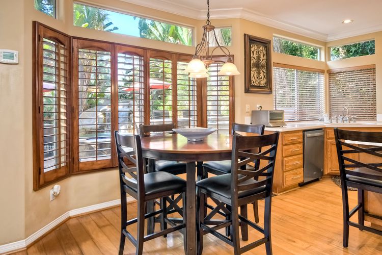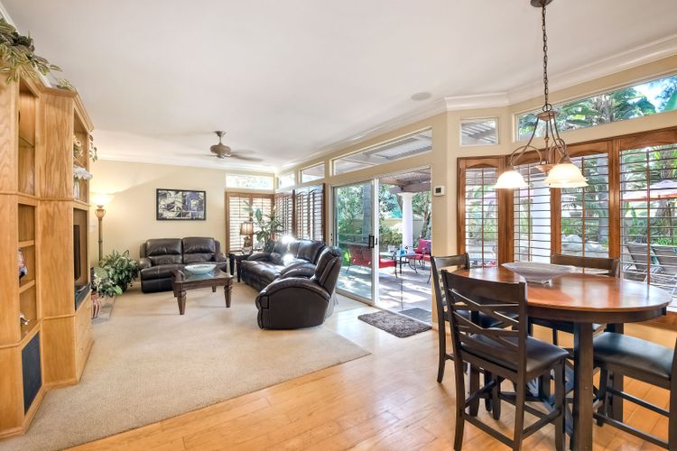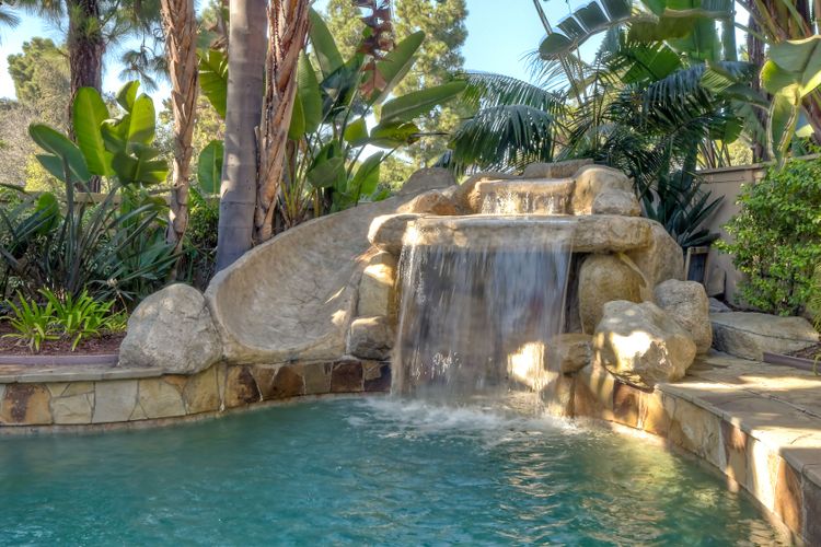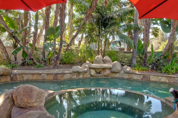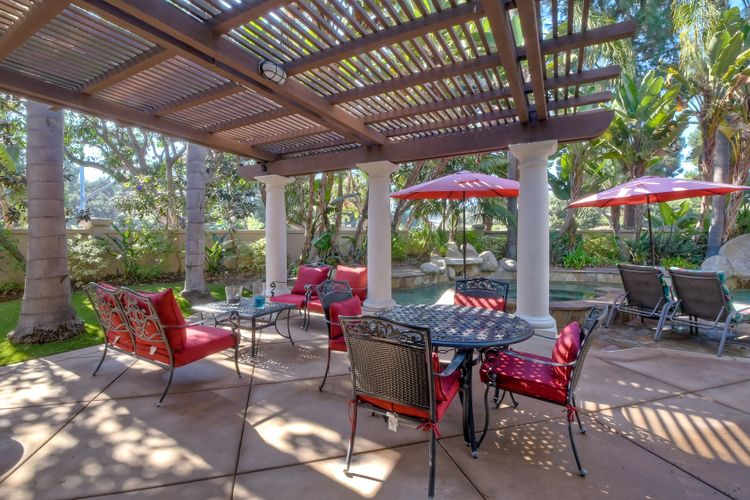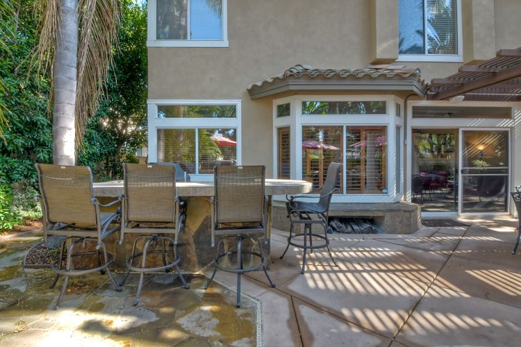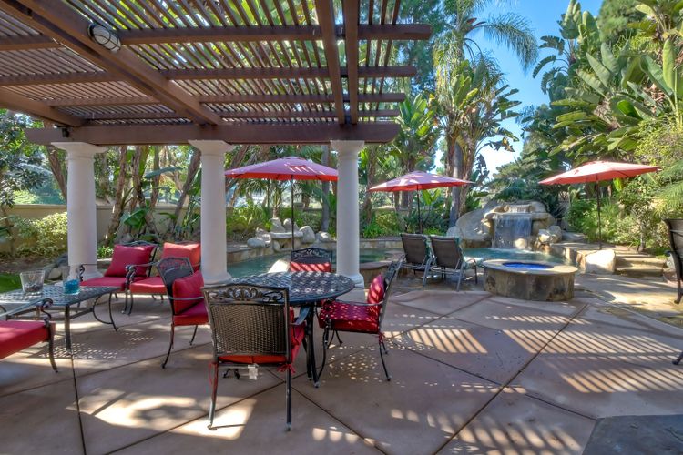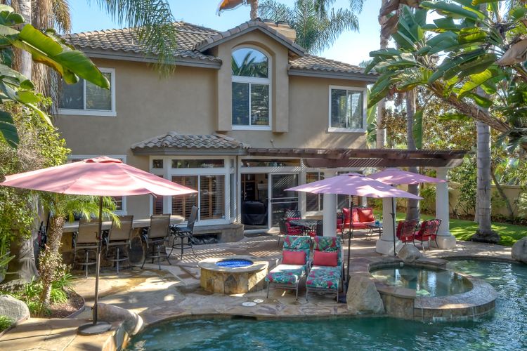 Gorgeous Aviara home in Avocet with spectacular tropical backyard. Saltwater pool/spa, gas barbeque, firepit, waterfalls, covered patio, lush landscaping and owned solar for the pool/spa! Central air. 3 car garage. 3 fireplaces. Soaring ceilings and walls of windows. Low HOF.
