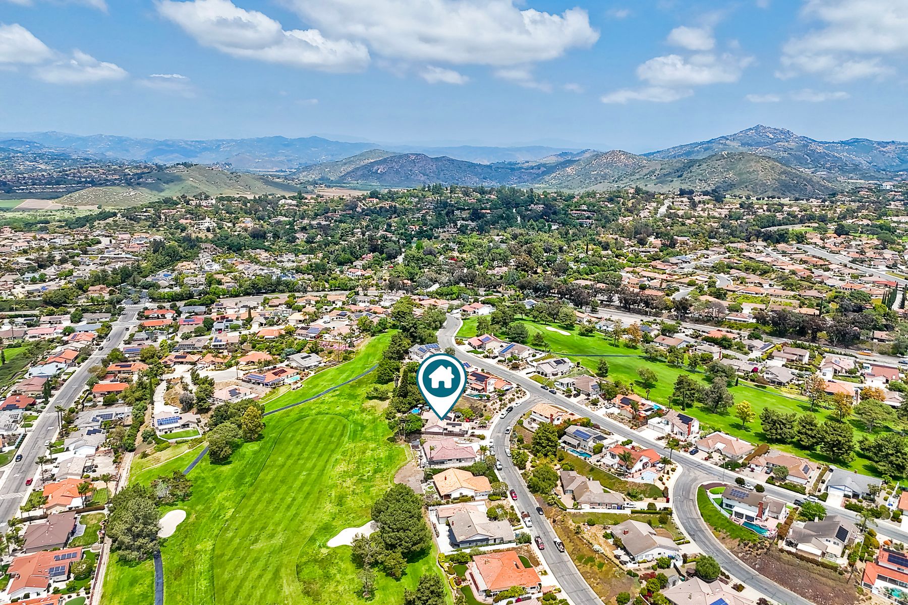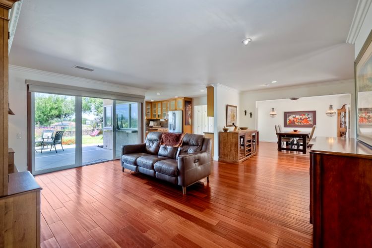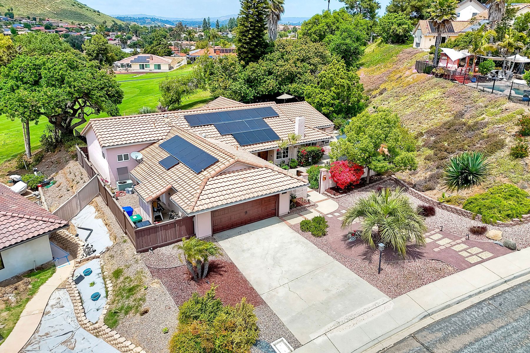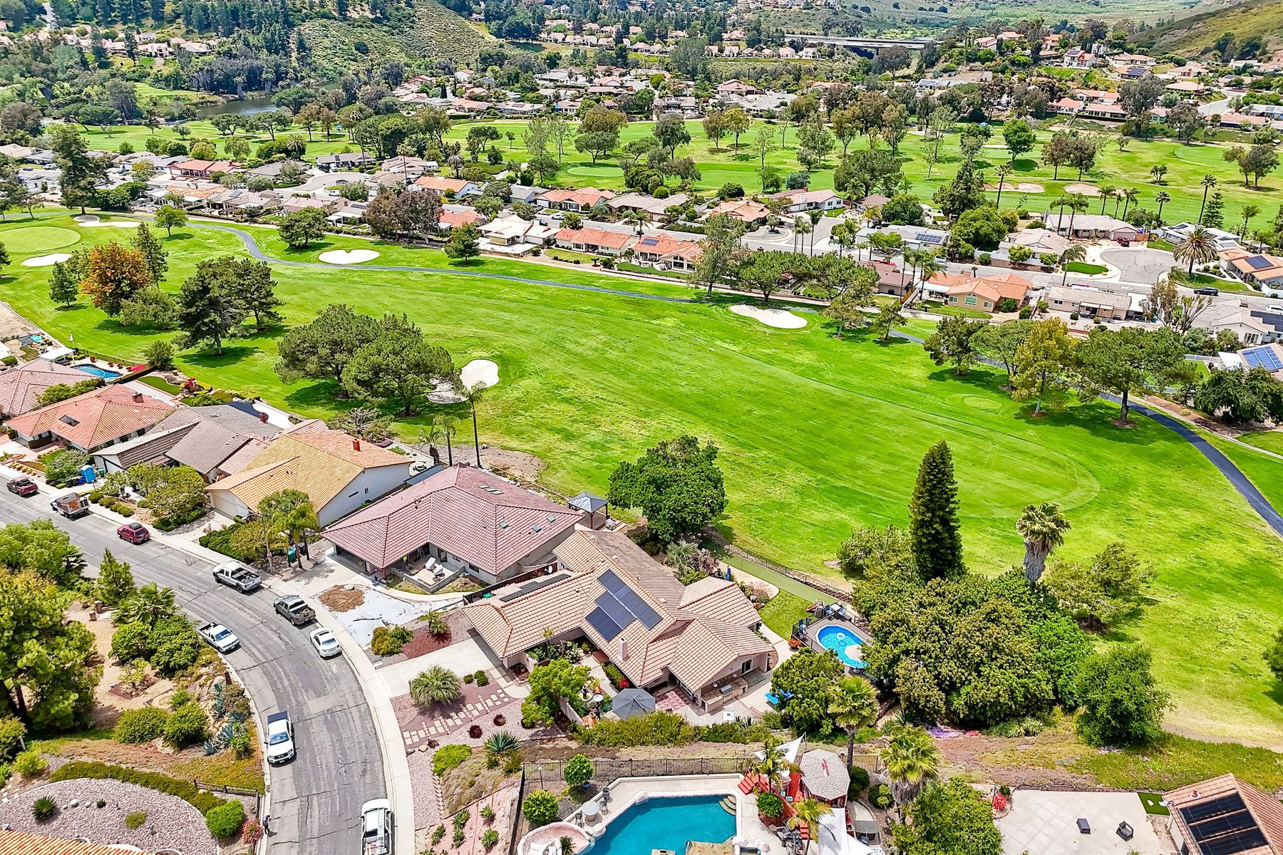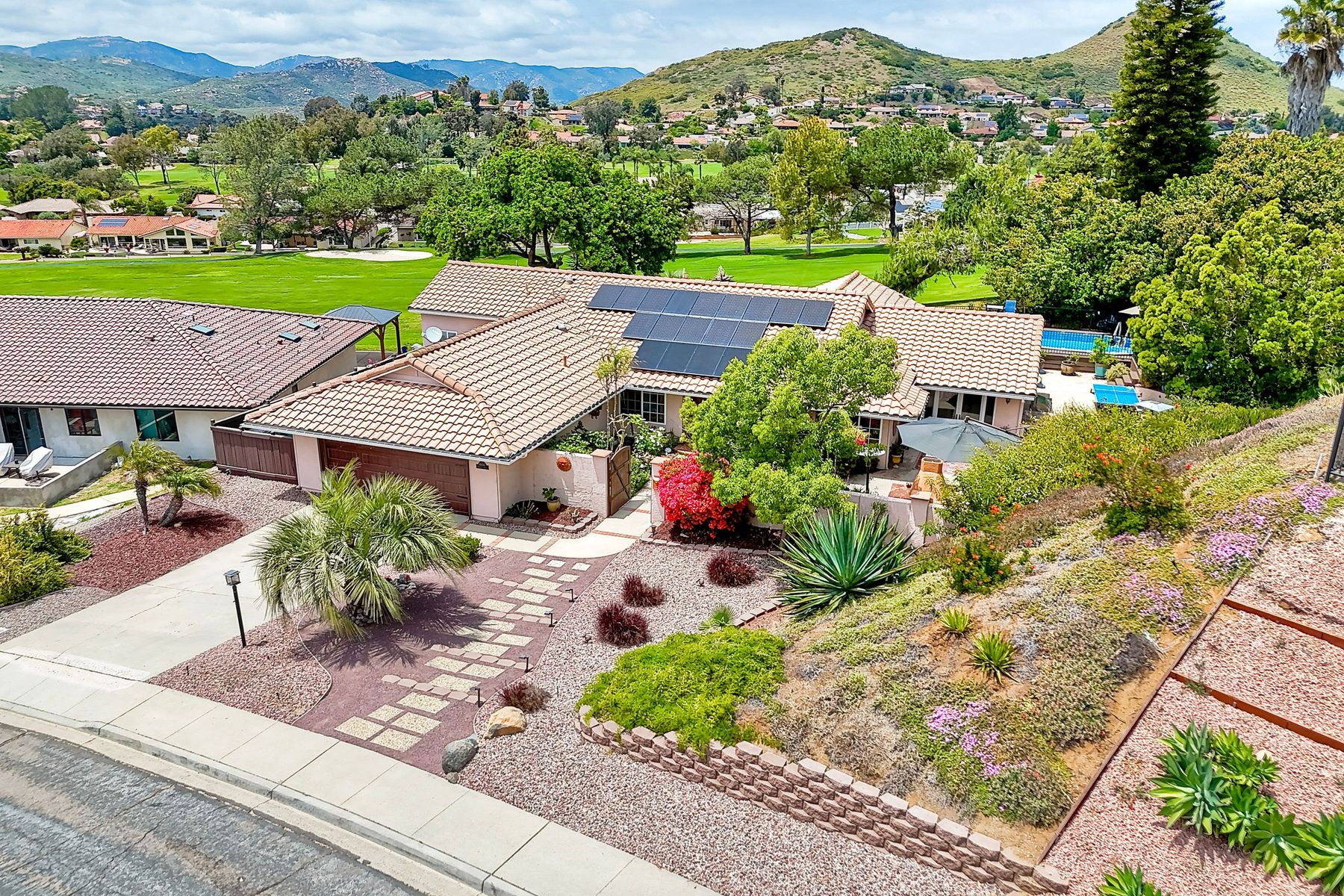 This spectacular 15th Fairway home sits on an elevated .41-acre lot with awesome views! Gorgeous 4-bedroom home w/Brazilian wood flooring throughout. Enter through knotty alder wood double doors, into open living room, dining room and family room. The kitchen overlooks the lush landscaping & golf course views. The front patio has a wood burning or gas logs fireplace, water fountain, custom kitchen BBQ area plus 2 additional patios including a saltwater pool with custom built Timber Tech Composite decking & separate spa! Newly painted throughout the interior, knotty alder wood interior doors, old world texturing on ceilings and walls & separate laundry room. The primary bedroom enjoys a customized oversized shower & large, picturesque view window overlooking the course & distant mountains. Seller owned solar system. Mature drought resistant landscaping and Electrostatic whole house air cleaner. Located in the Highly Rated Poway Unified School District. No Monthly HOA & No Mello Roos.