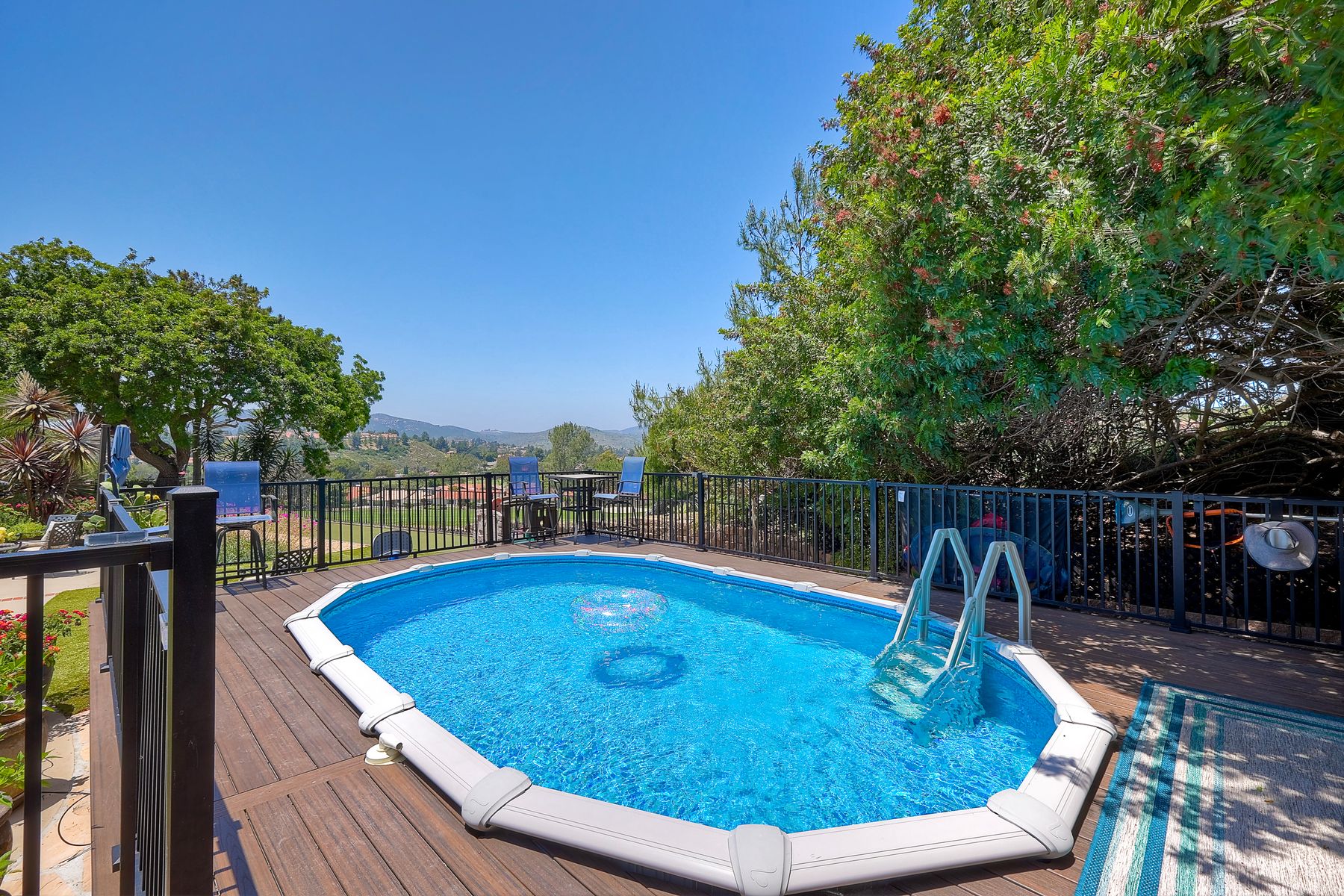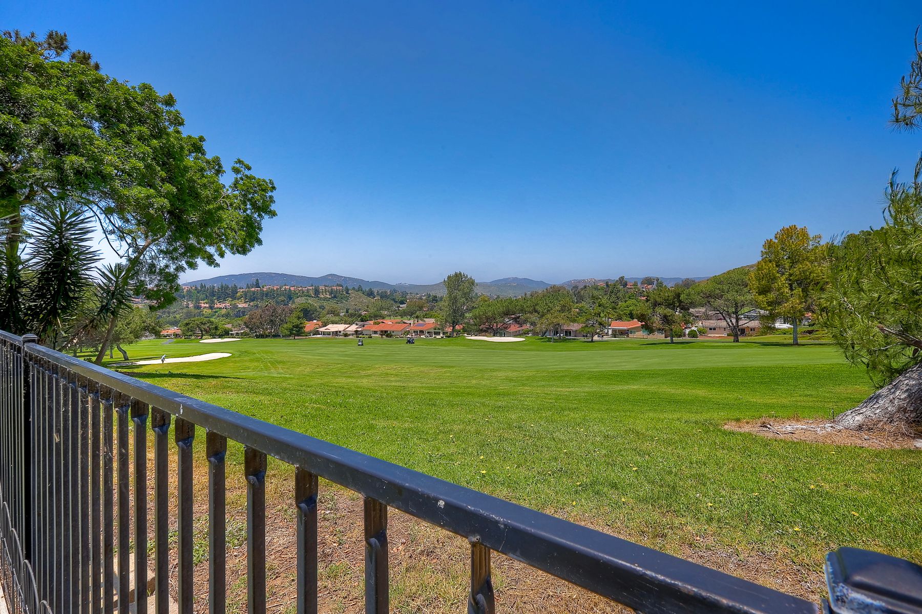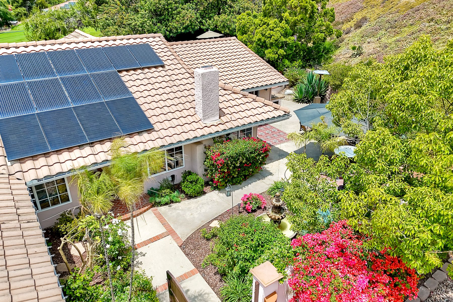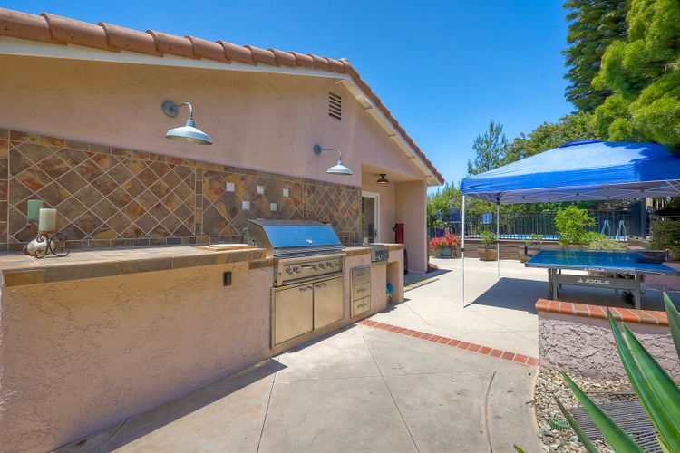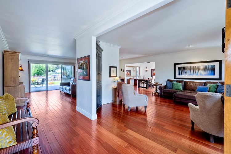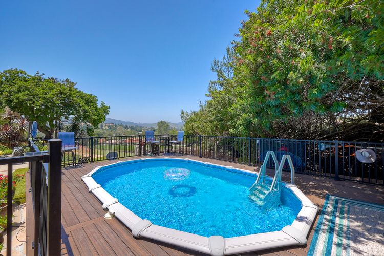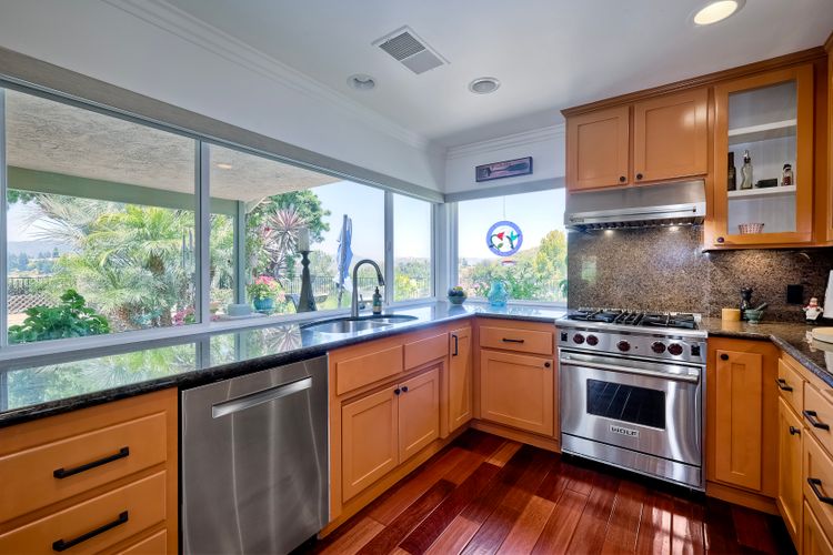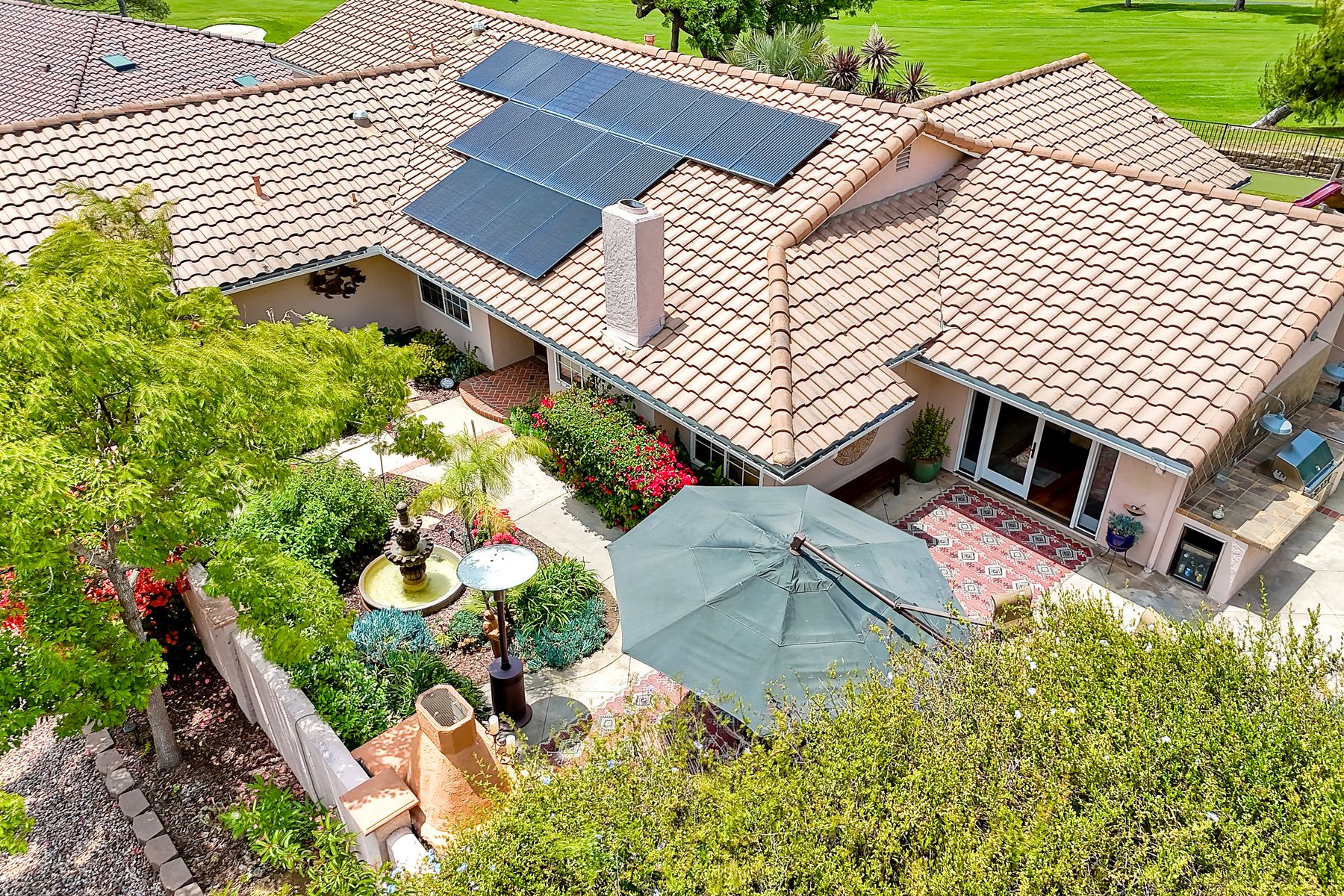 This spectacular 15th Fairway home sits on an elevated .41-acre lot with awesome views! Gorgeous 4-bedroom home w/Brazilian wood flooring throughout. Enter through knotty alder wood double doors, into open living room, dining room and family room. The kitchen overlooks the lush landscaping & golf course views. The front patio has a wood burning or gas logs fireplace, water fountain, custom kitchen BBQ area plus 2 additional patios including a saltwater pool with custom built Timber Tech Composite decking & separate spa! Newly painted throughout the interior, knotty alder wood interior doors, old world texturing on ceilings and walls & separate laundry room. The primary bedroom enjoys a customized oversized shower & large, picturesque view window overlooking the course & distant mountains. Seller owned solar system. Mature drought resistant landscaping and Electrostatic whole house air cleaner. Located in the Highly Rated Poway Unified School District. No Monthly HOA & No Mello Roos.
