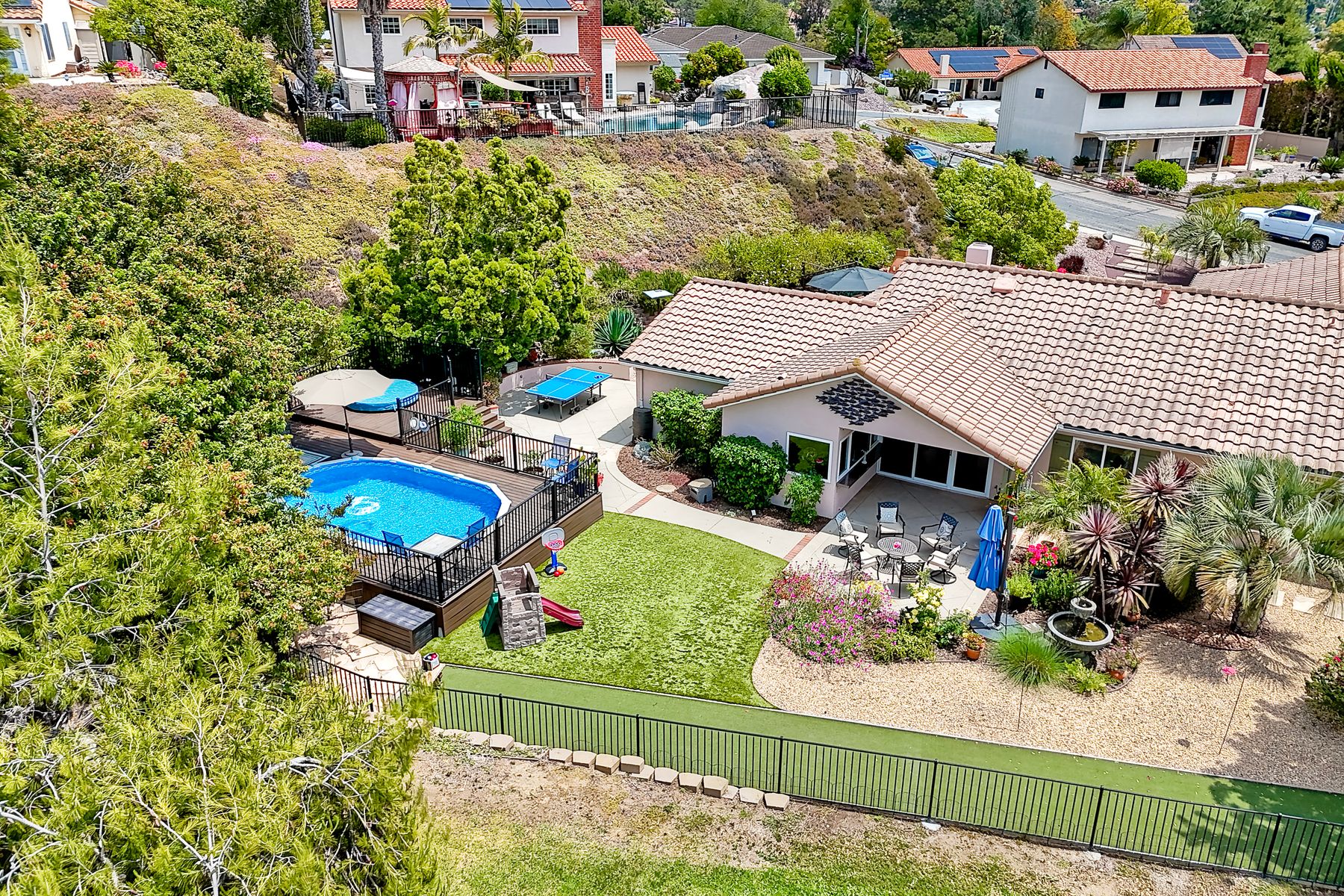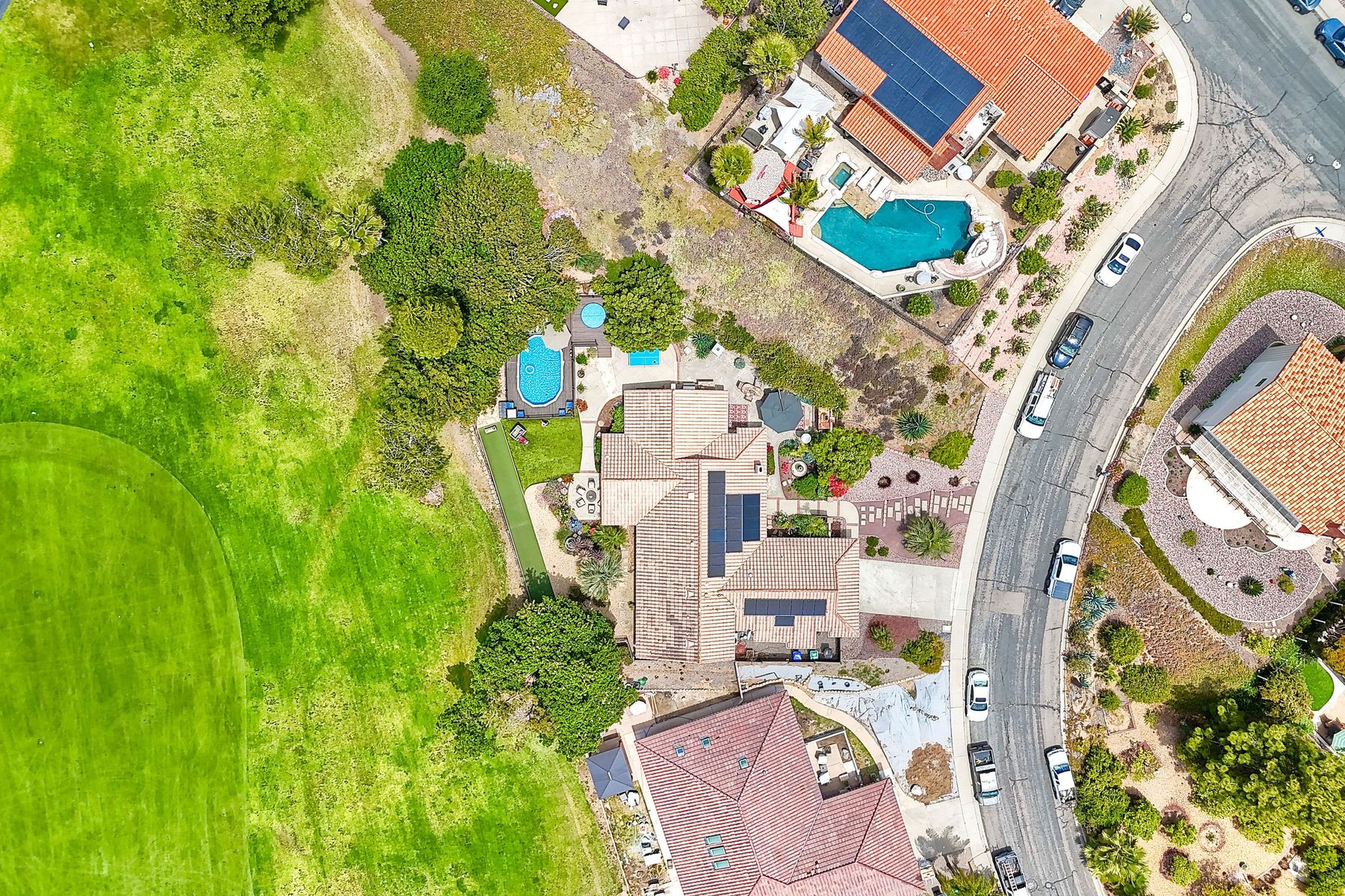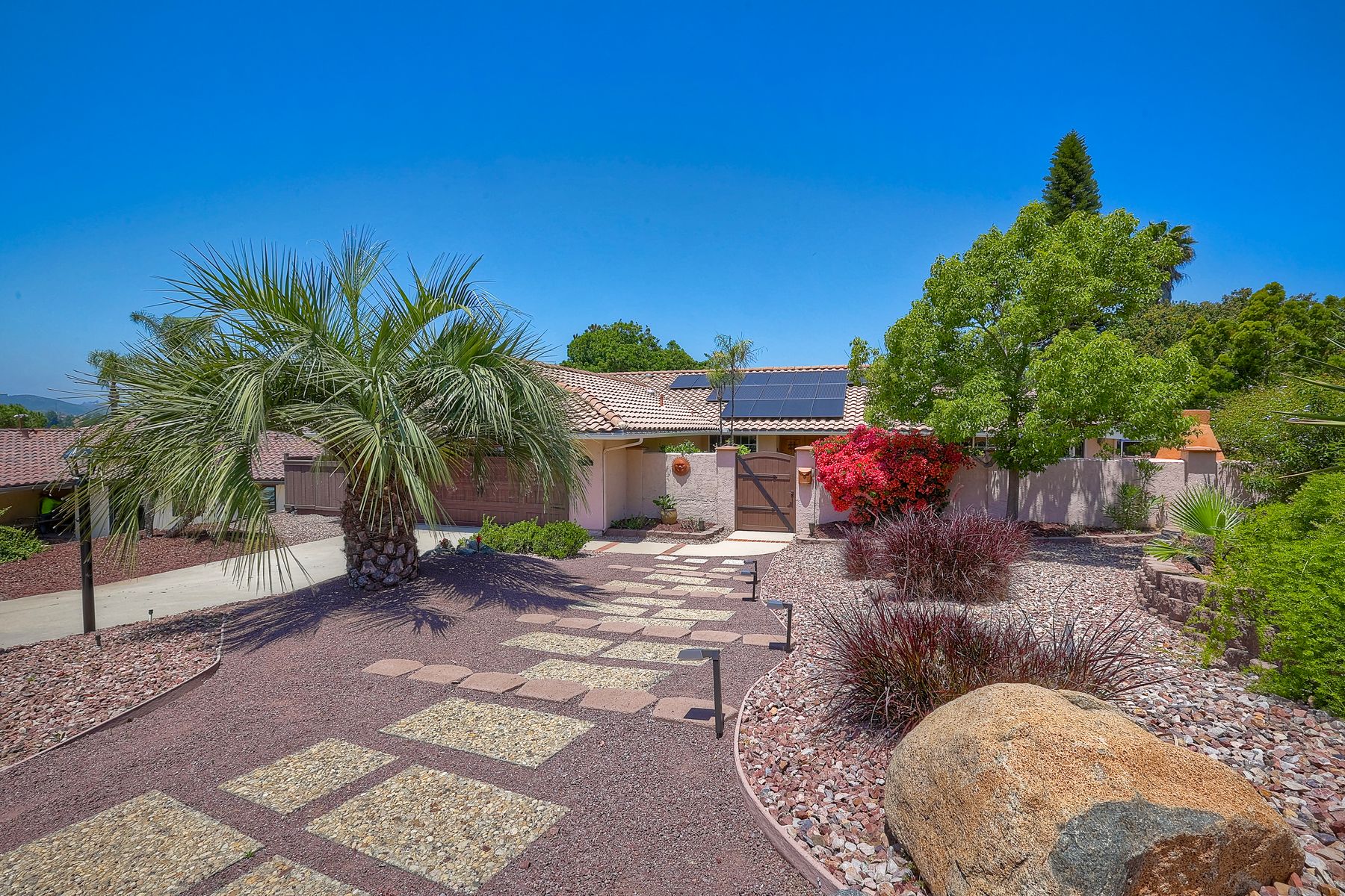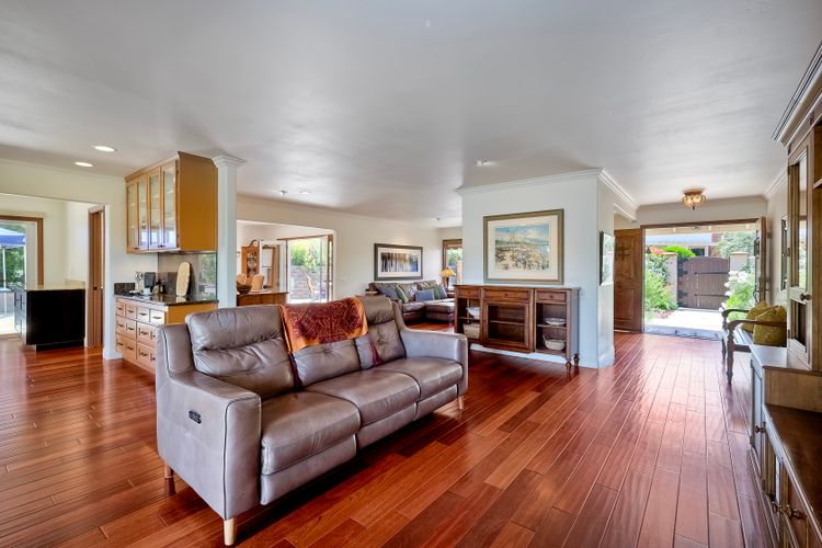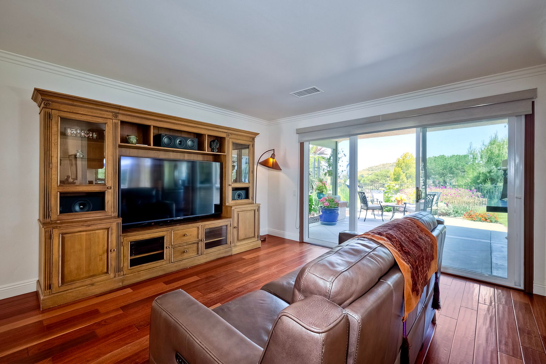 This spectacular 15th Fairway home sits on an elevated .41-acre lot with awesome views! Gorgeous 4-bedroom home w/Brazilian wood flooring throughout. Enter through knotty alder wood double doors, into open living room, dining room and family room. The kitchen overlooks the lush landscaping & golf course views. The front patio has a wood burning or gas logs fireplace, water fountain, custom kitchen BBQ area plus 2 additional patios including a saltwater pool with custom built Timber Tech Composite decking & separate spa! Newly painted throughout the interior, knotty alder wood interior doors, old world texturing on ceilings and walls & separate laundry room. The primary bedroom enjoys a customized oversized shower & large, picturesque view window overlooking the course & distant mountains. Seller owned solar system. Mature drought resistant landscaping and Electrostatic whole house air cleaner. Located in the Highly Rated Poway Unified School District. No Monthly HOA & No Mello Roos.